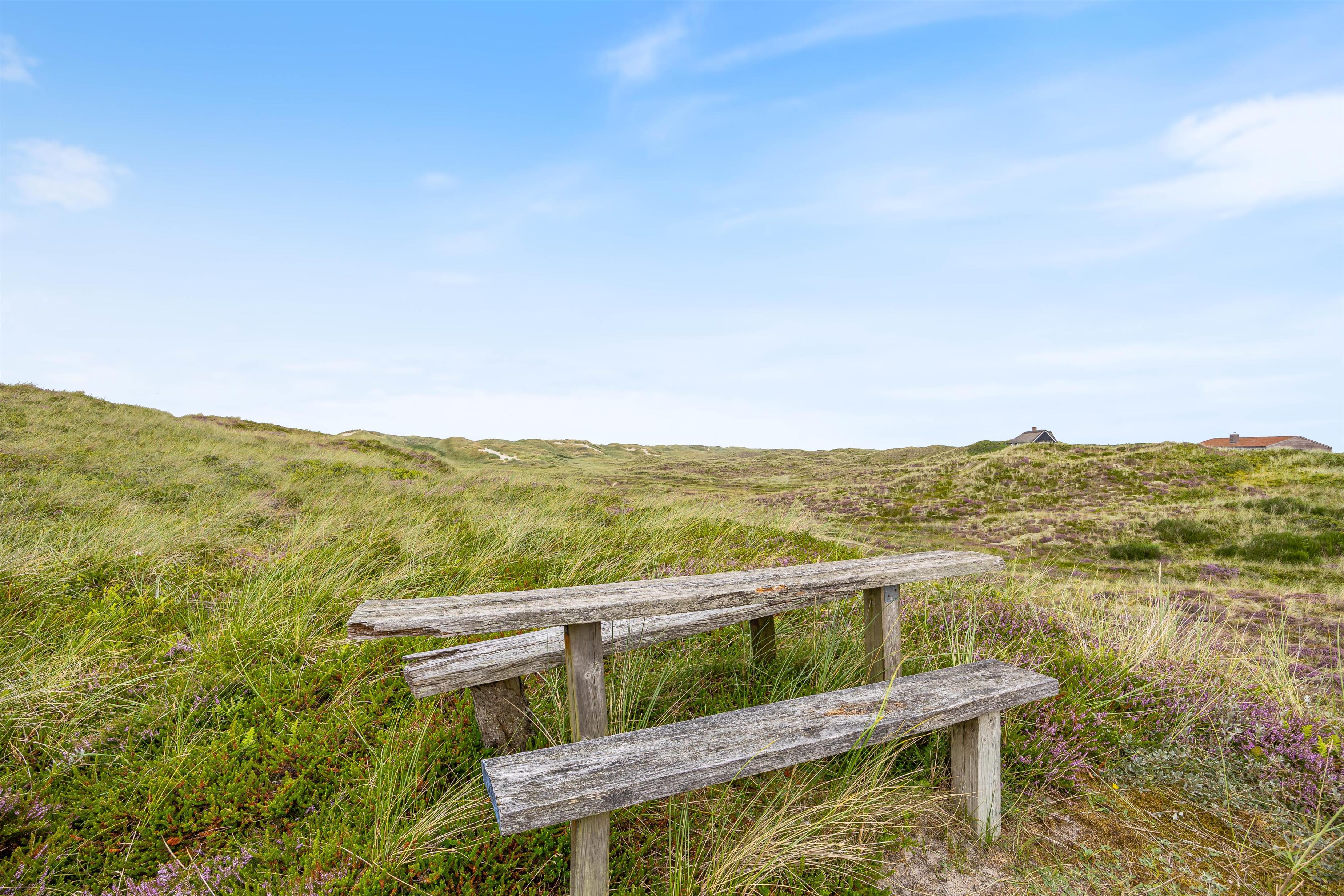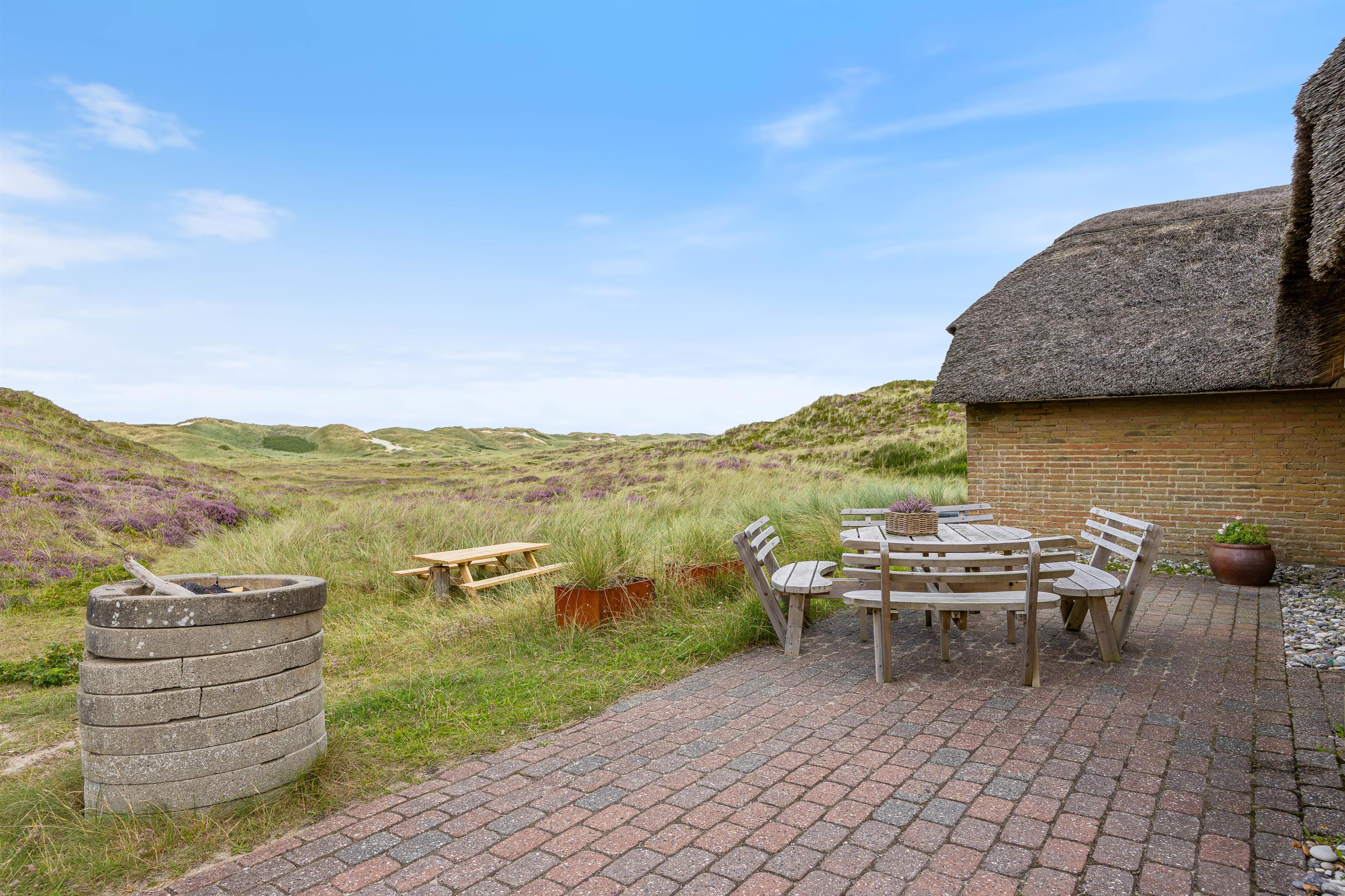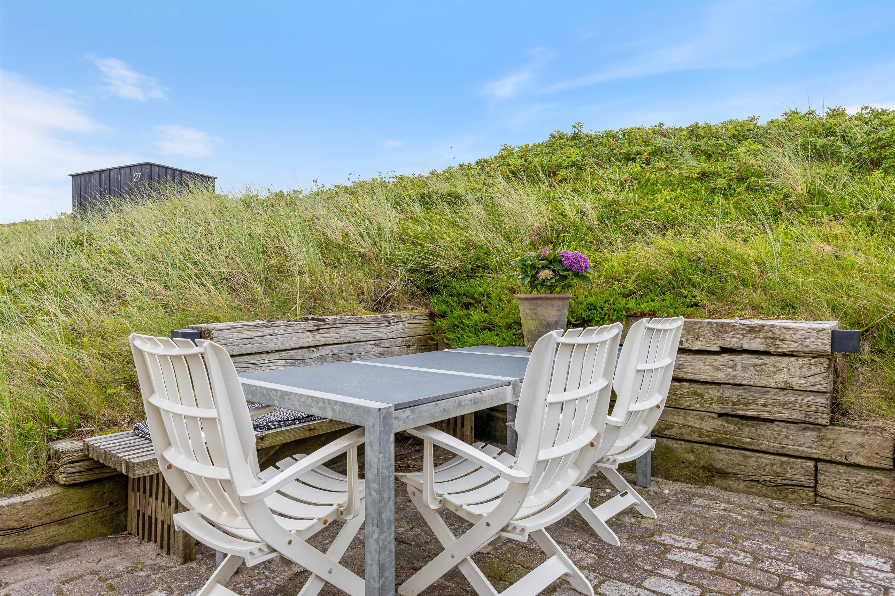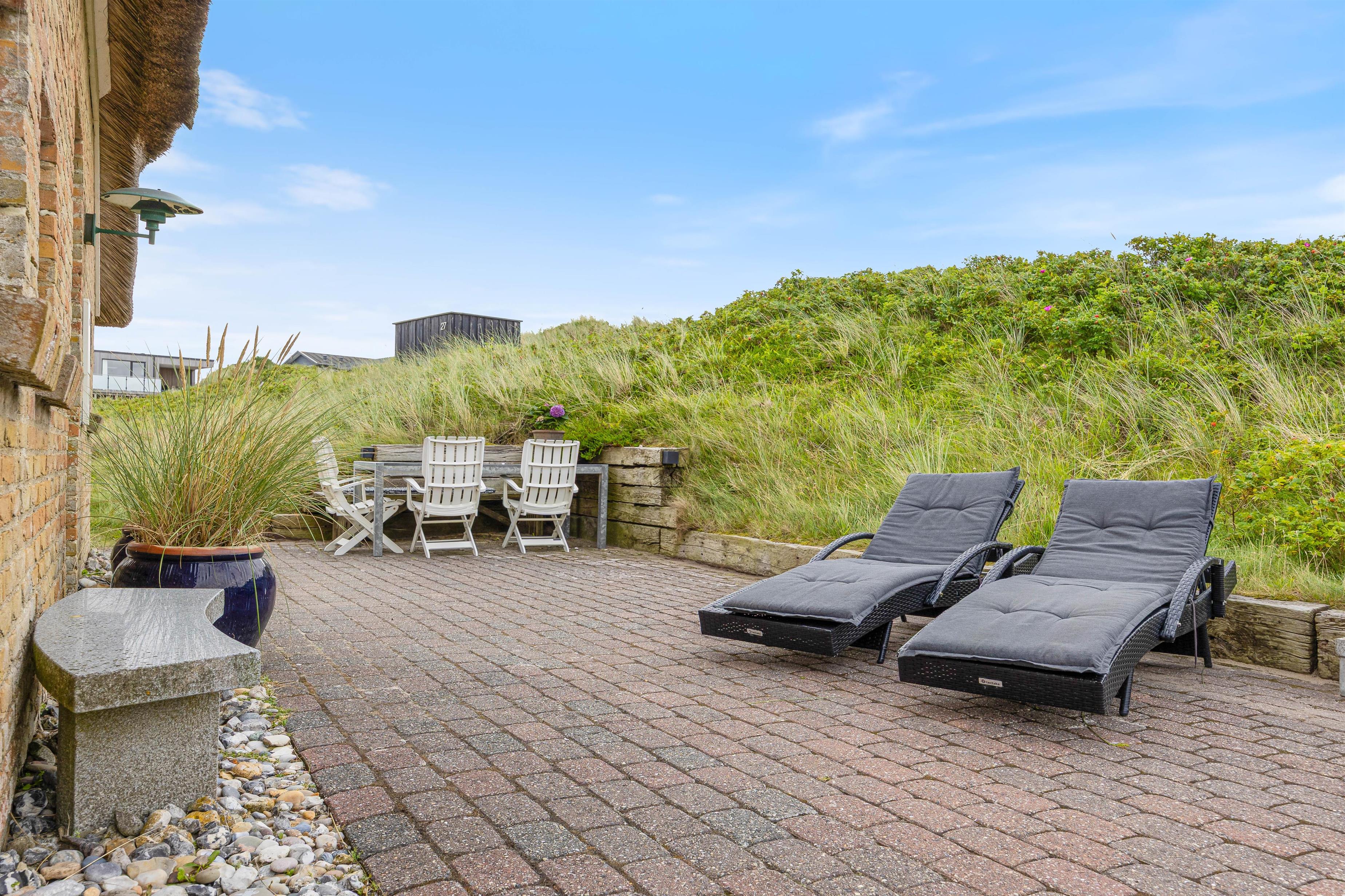 På de varmere sommerdage er det oplagt at benytte jer af det store og hyggelige udeområde, som indeholder alt fra havemøbler til solvogne og en grill. Her er der rig mulighed for at være udenfor og nyde sommeren. Blive solen for varm, kan i rykke ind på den overdækket og afskærmet terrasse. På de helt varme sommerdage kan det anbefales at pakke strandtasken og tage en tur til stranden, som blot ligger 230 meter væk.