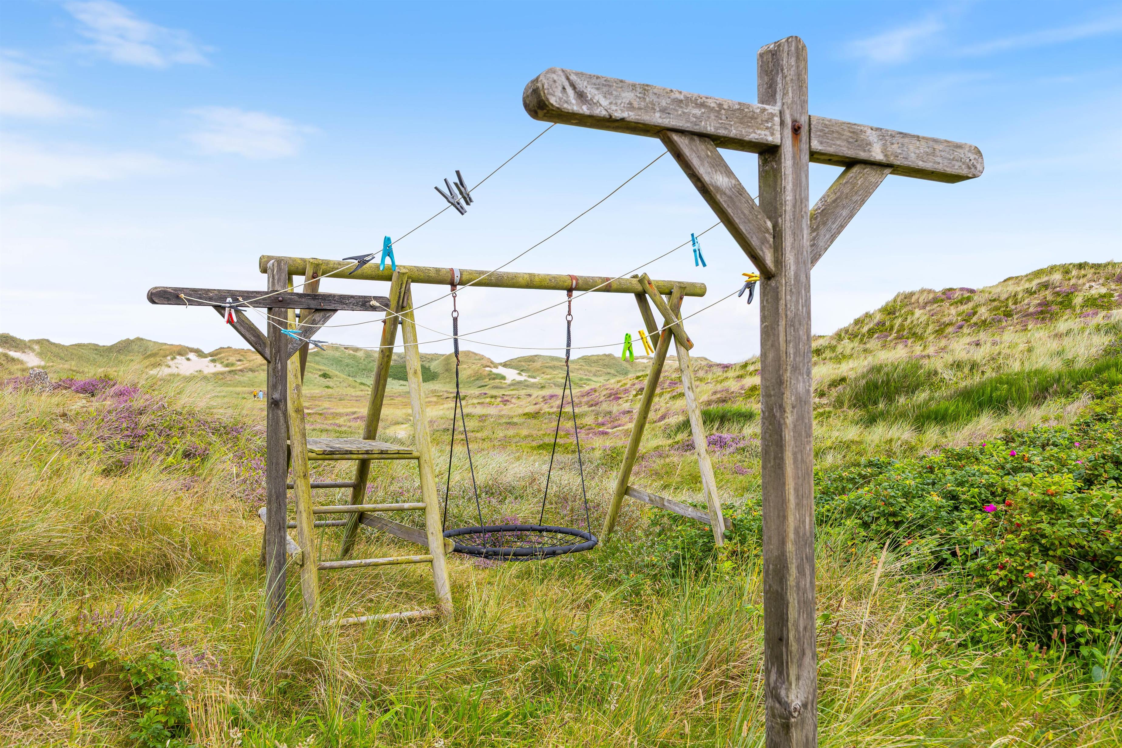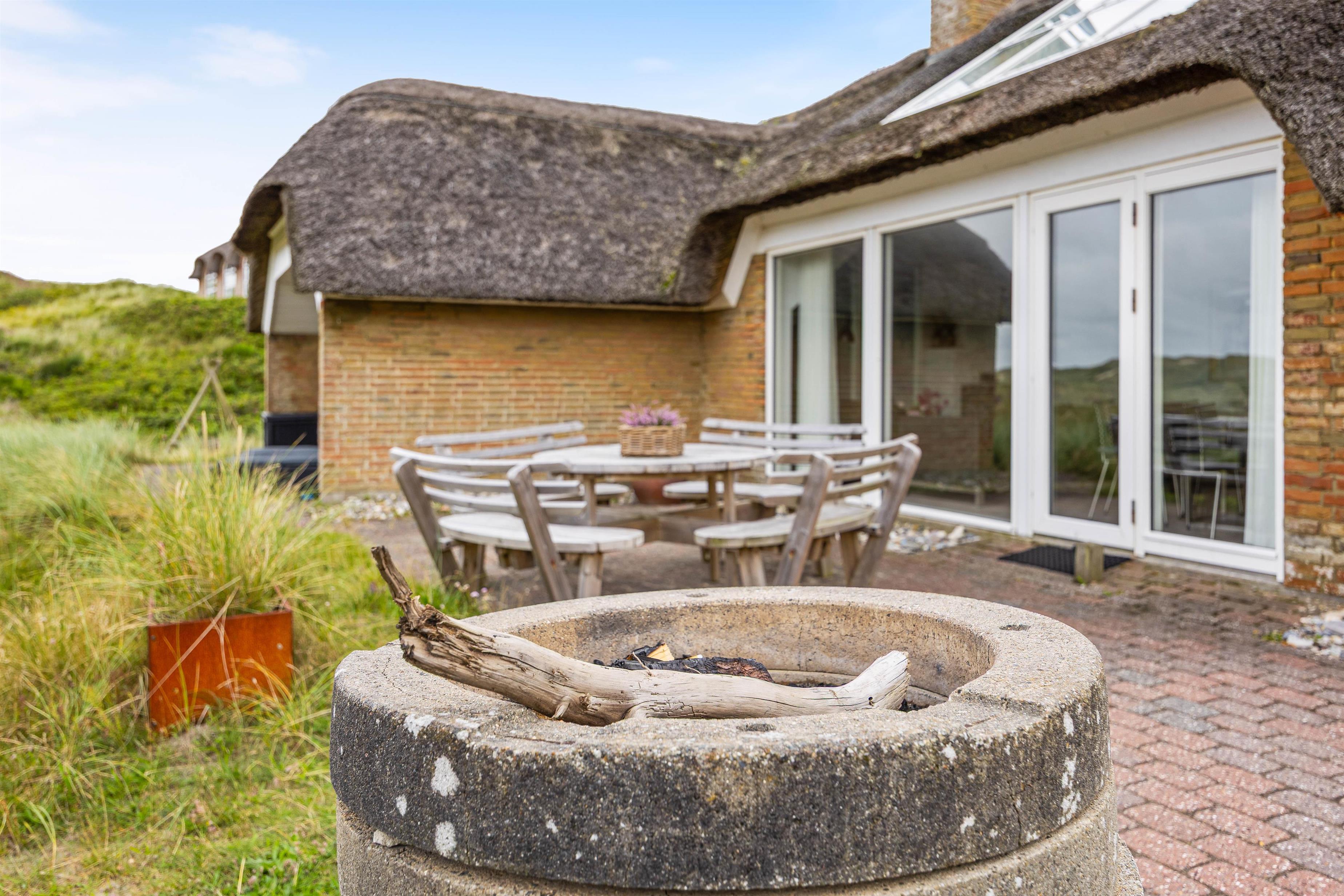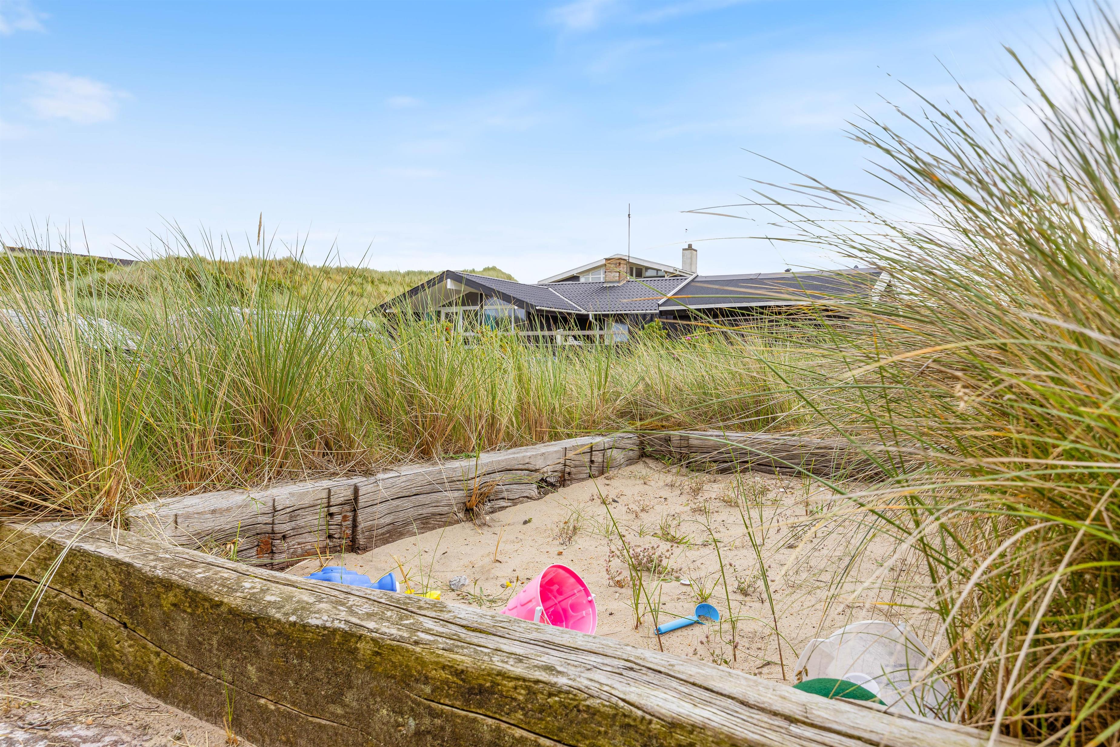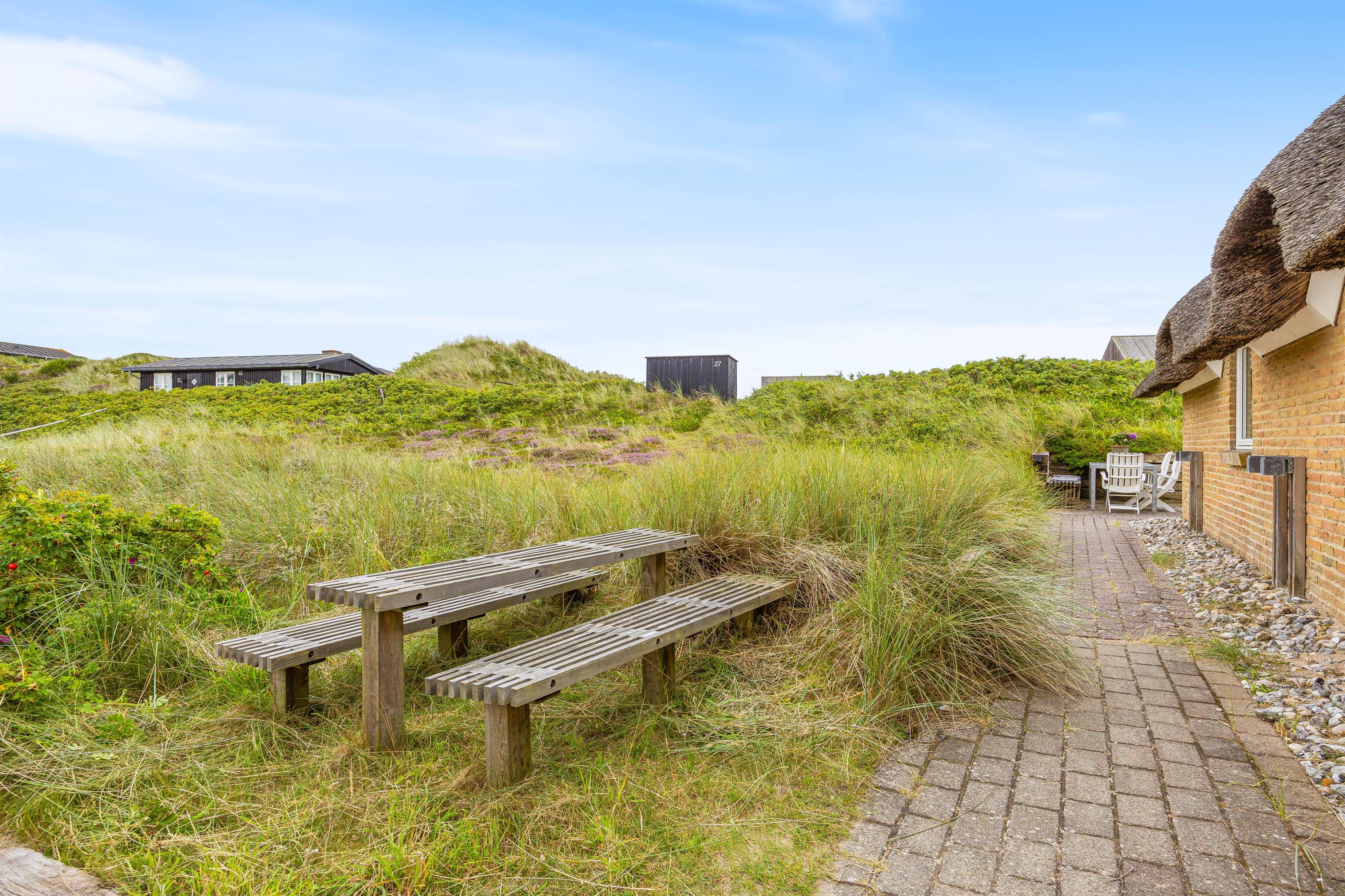 På de varmere sommerdage er det oplagt at benytte jer af det store og hyggelige udeområde, som indeholder alt fra havemøbler til solvogne og en grill. Her er der rig mulighed for at være udenfor og nyde sommeren. Blive solen for varm, kan i rykke ind på den overdækket og afskærmet terrasse. På de helt varme sommerdage kan det anbefales at pakke strandtasken og tage en tur til stranden, som blot ligger 230 meter væk.