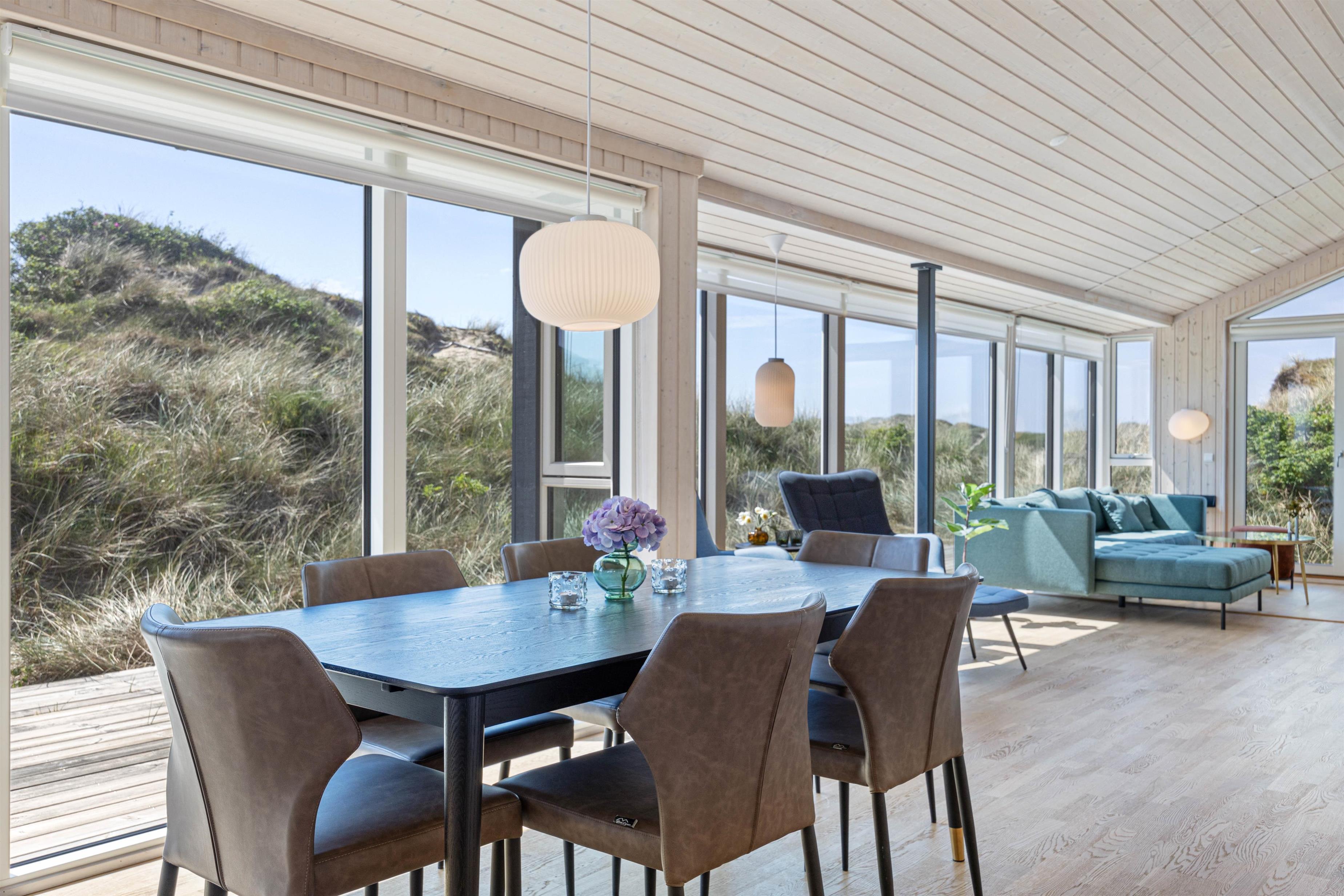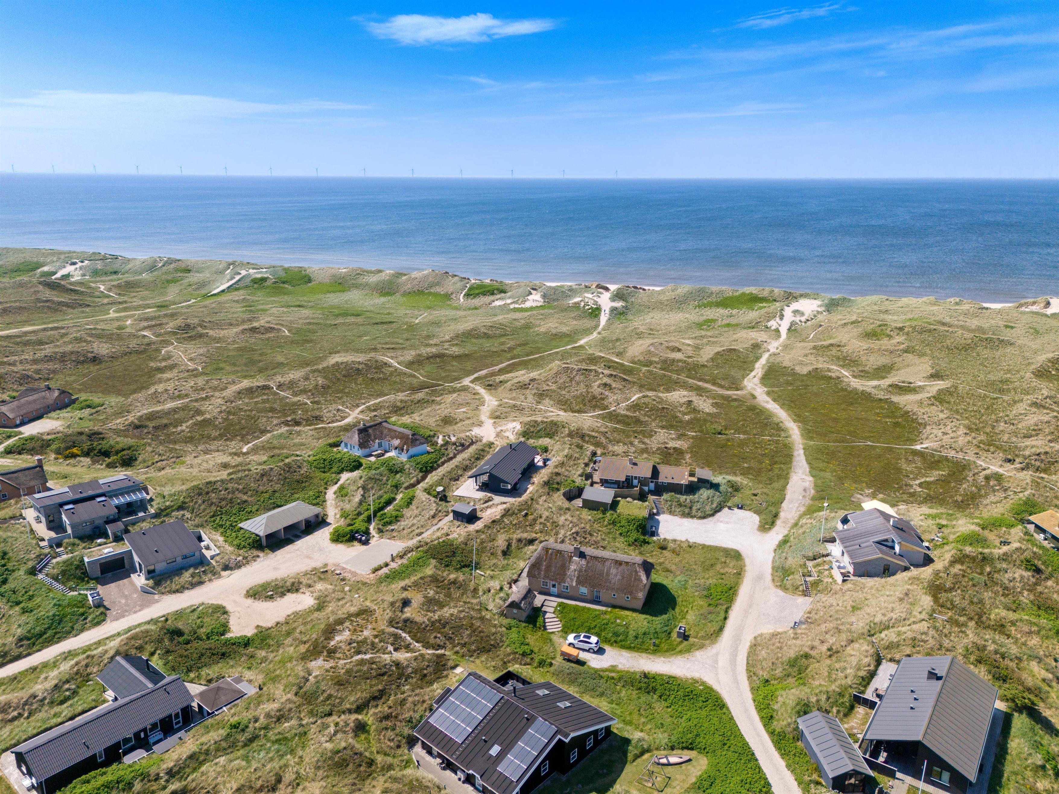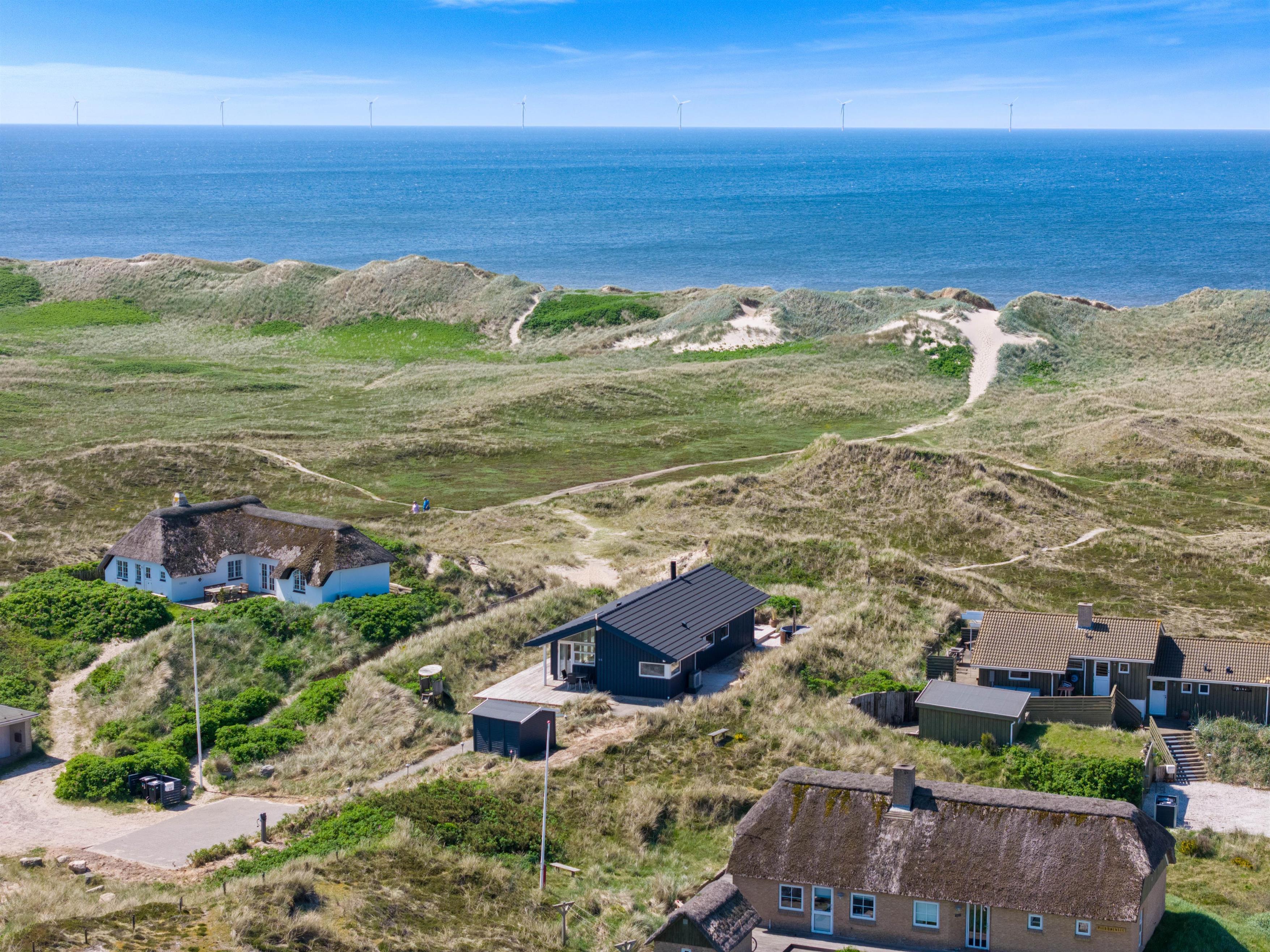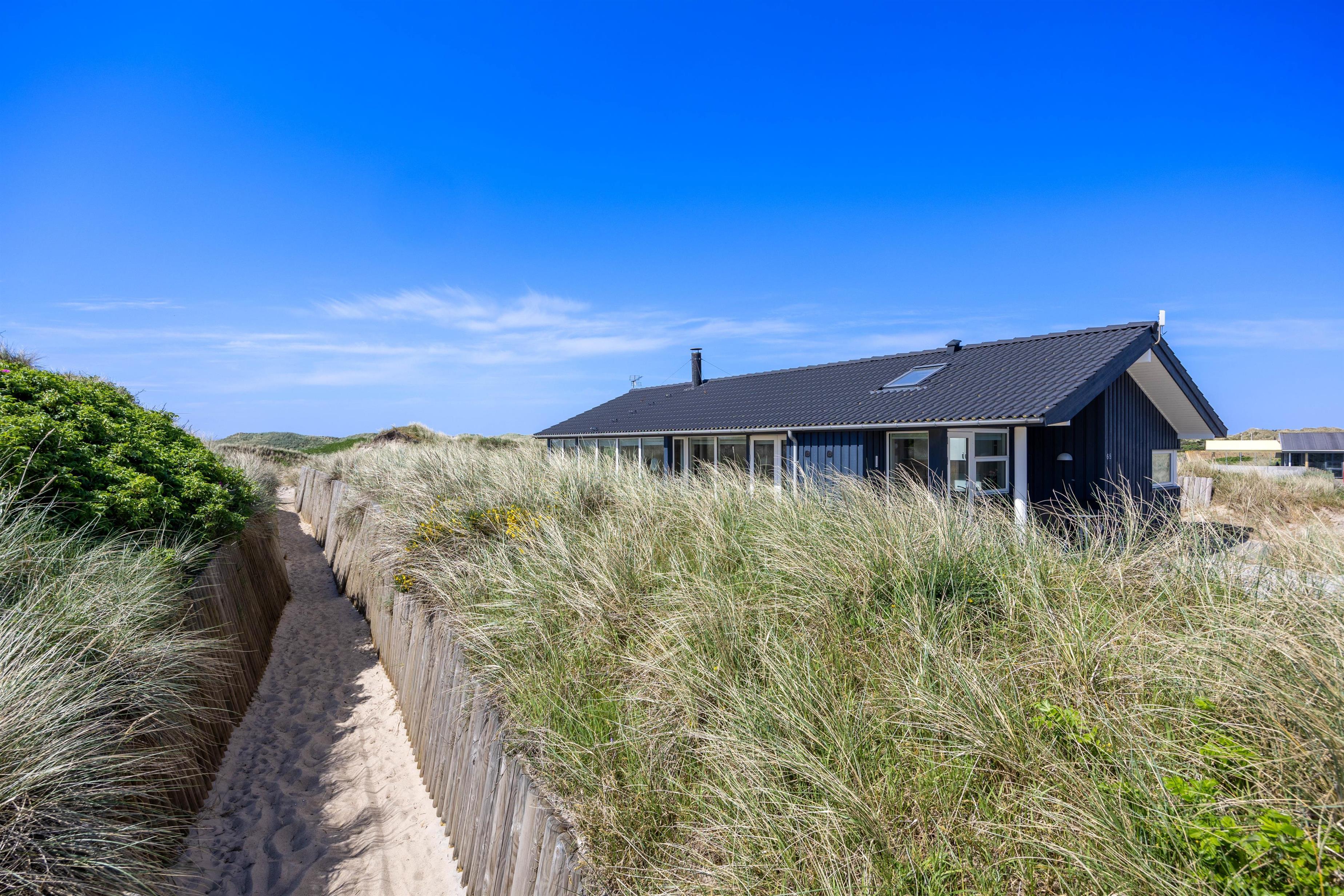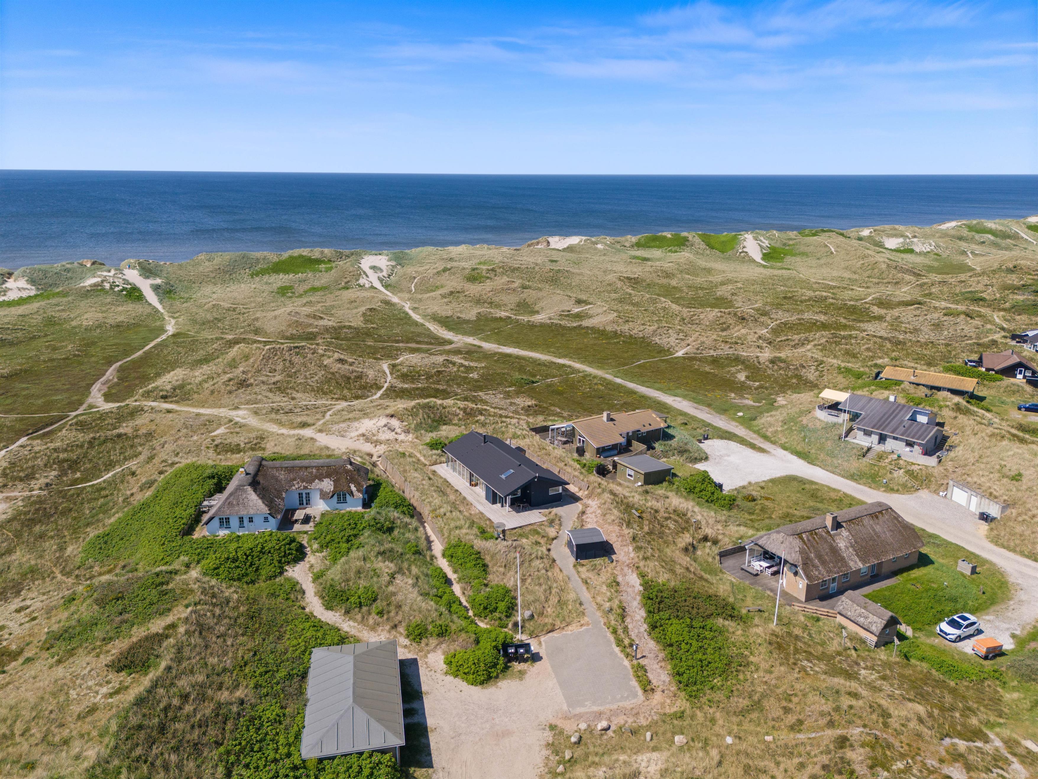 Sommerhuset ligger i et smukt, kuperet klitlandskab. Det imponerer med sin beliggenhed i 1. klitrække, hvor den gode beliggenhed gør, at I har en fantastisk panoramaudsigt. Der er kun en kort gåtur på ca. 200 meter til stranden, så det er også praktisk for familier med små børn, da sommerhuset hurtigt kan nås igen, hvis vejret skifter. På en smuk sommeraften kan I sidde på terrassen, som er udstyret med havemøbler og en grill, og nyde en lækker, kold drink.