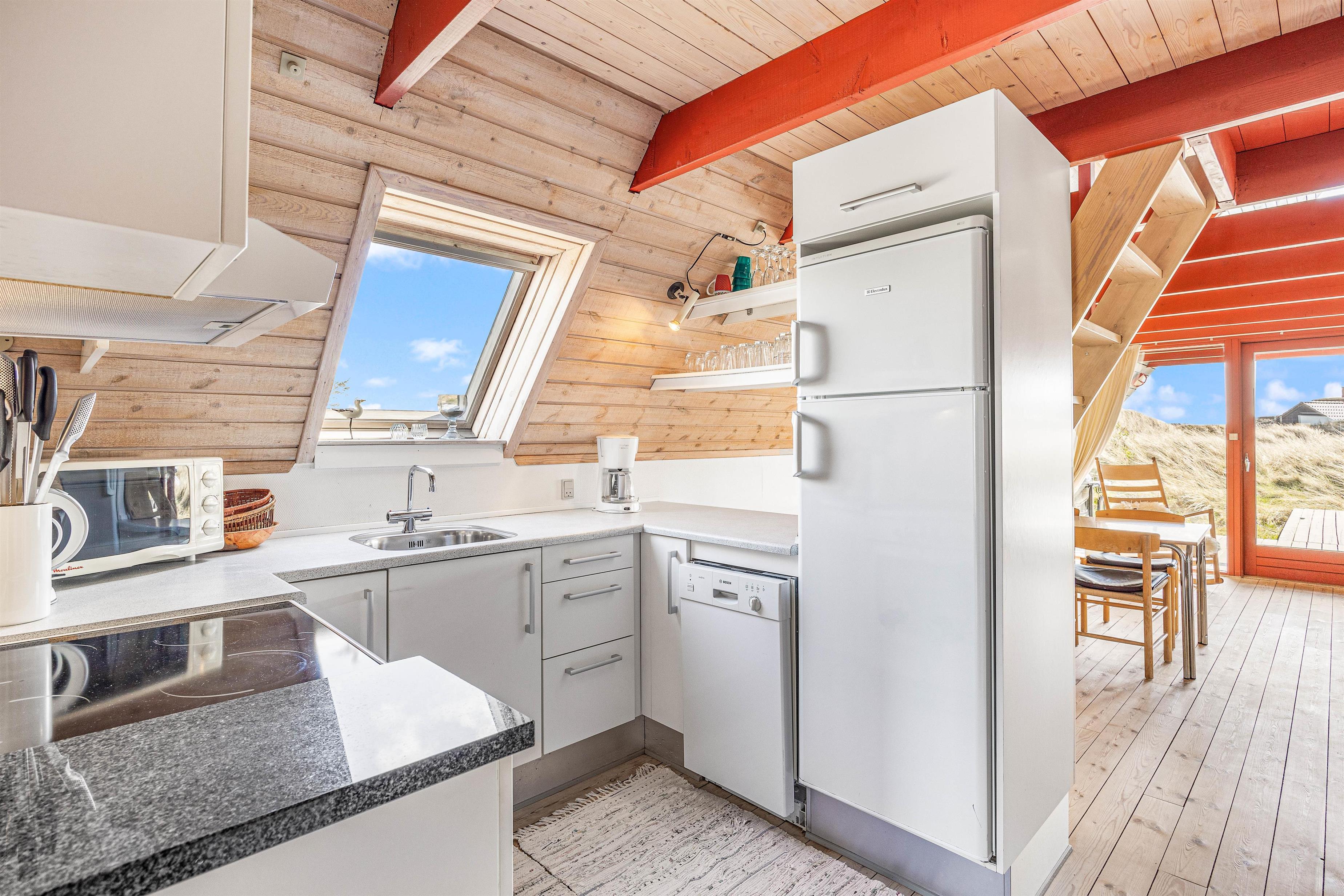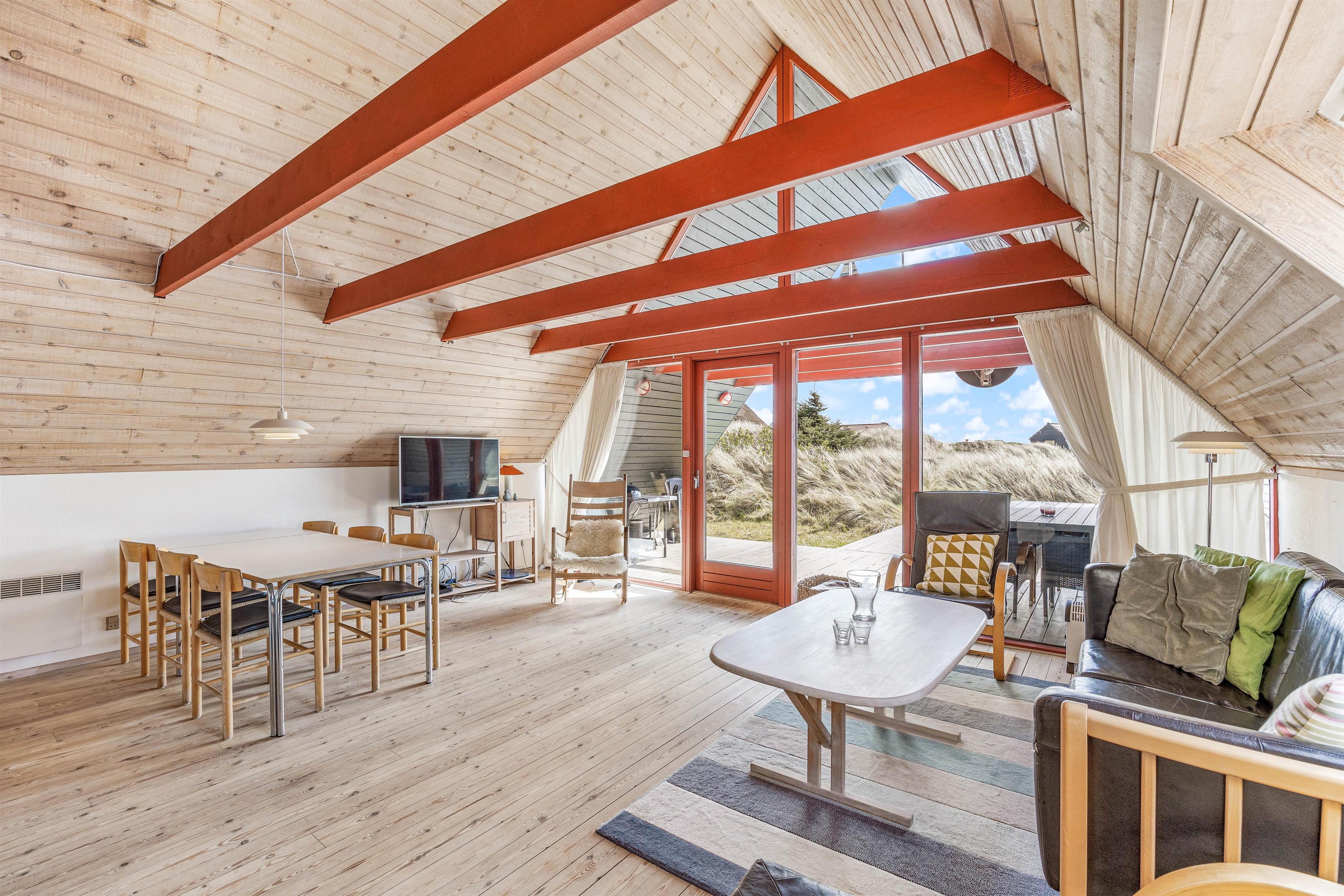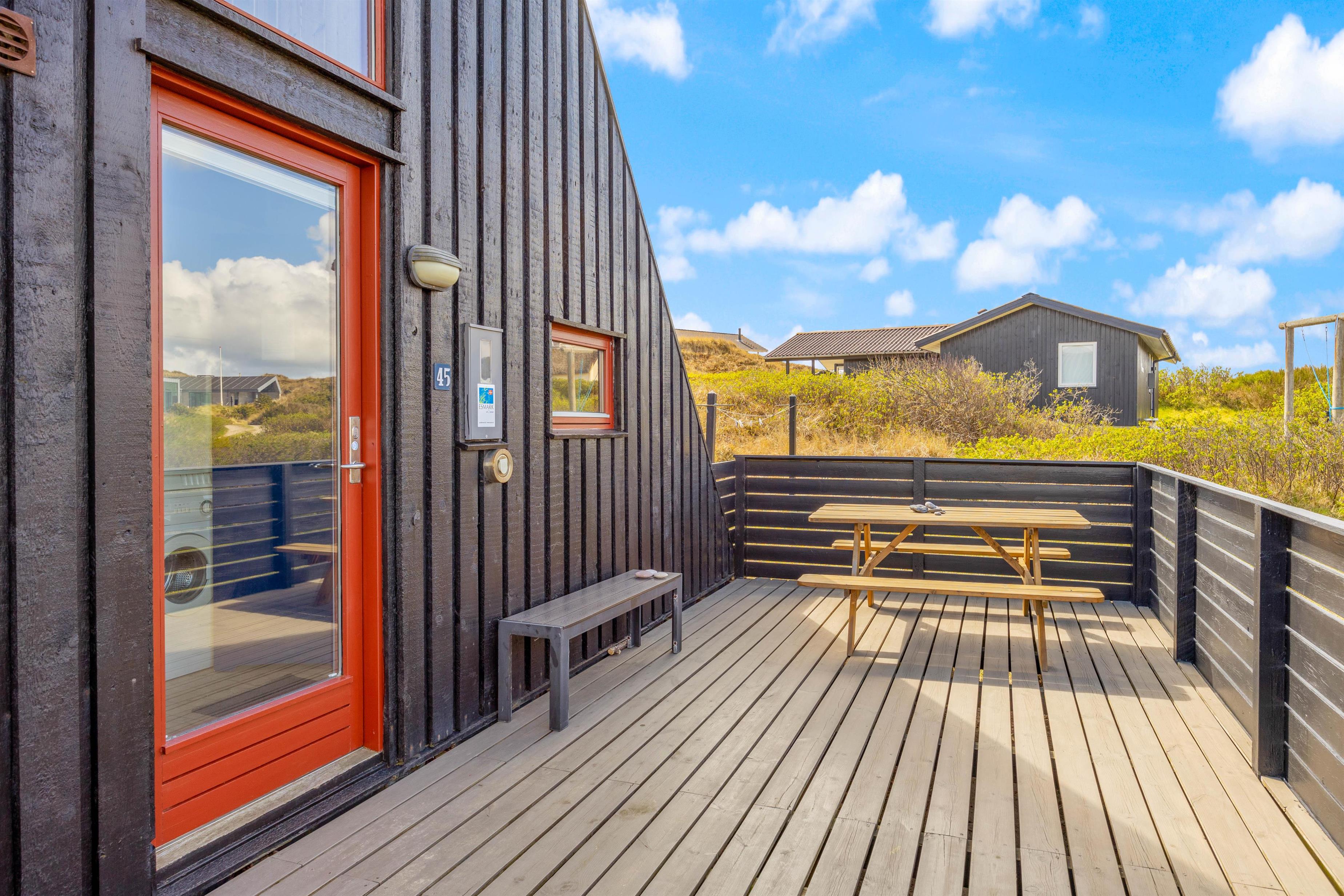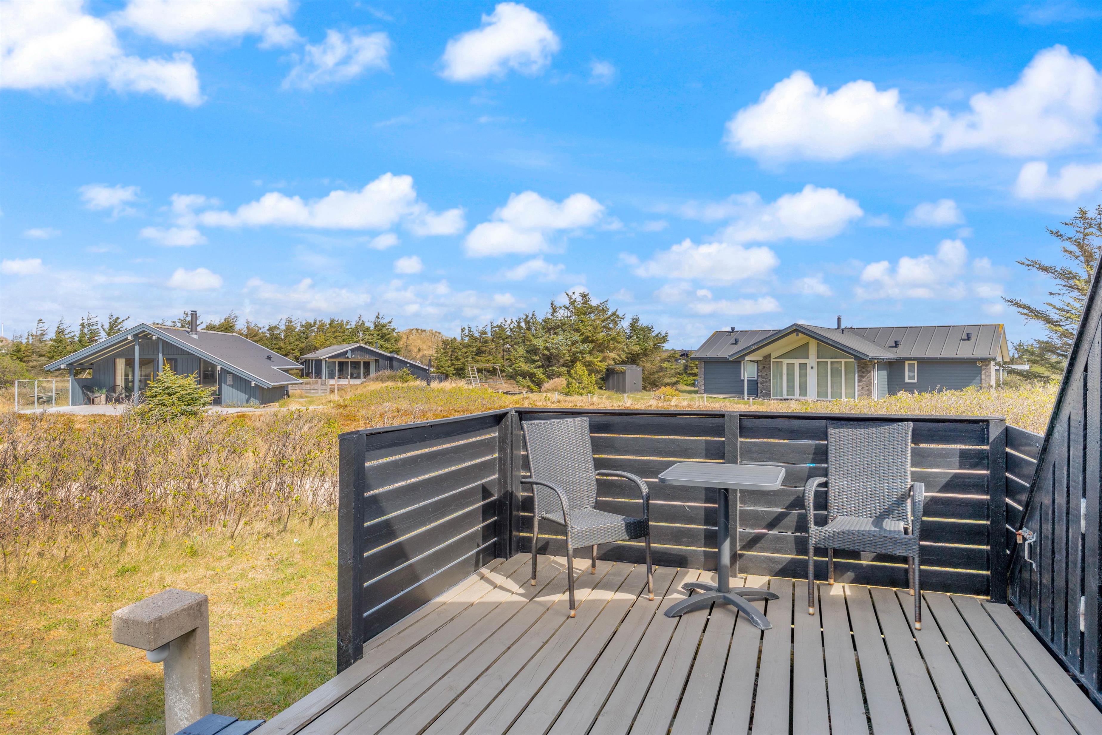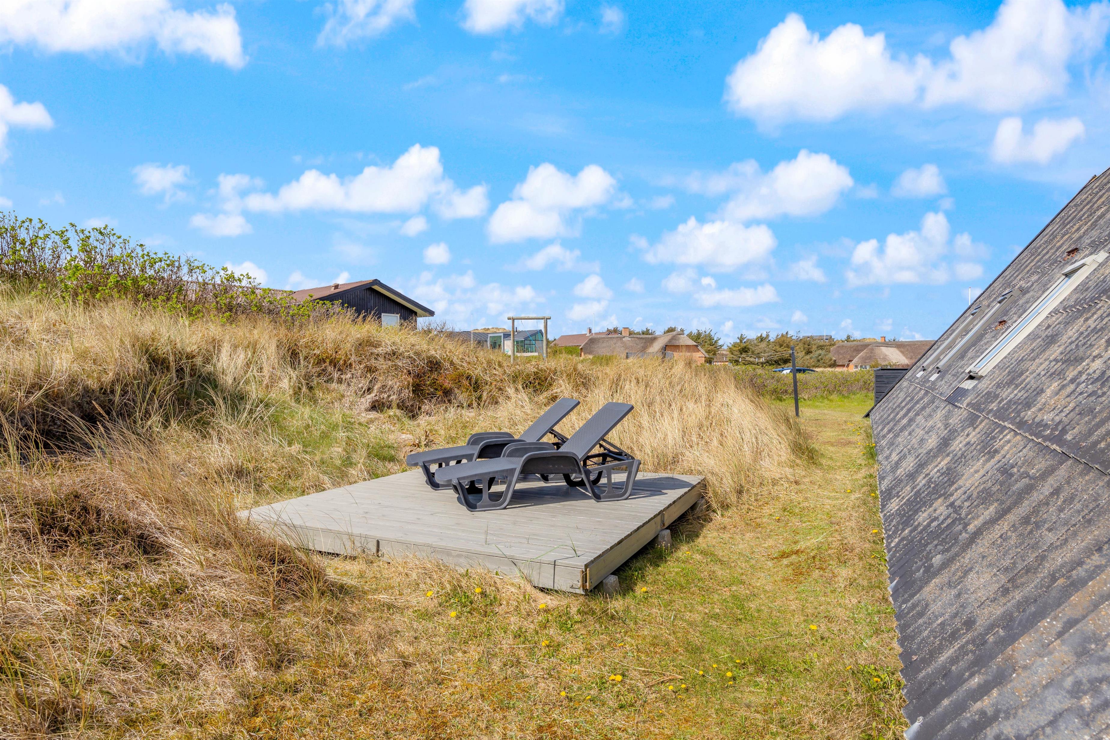Sommerhuset i Houvig ligger godt, i det kuperede klitlandskab. Og I vil uden tvivl kunne tilbringe mange timer udendørs med blot at betragte de smukke omgivelser. Naturgrunden er beklædt med marehalm og har intet mindre end 3 terrasser. Den første er en stor sydvendt og delvist overdækket terrasse, der er ideel til grillaftnerne. Derudover er der 2 mindre solterrasser, der ligger henholdsvis mod nord og vest.