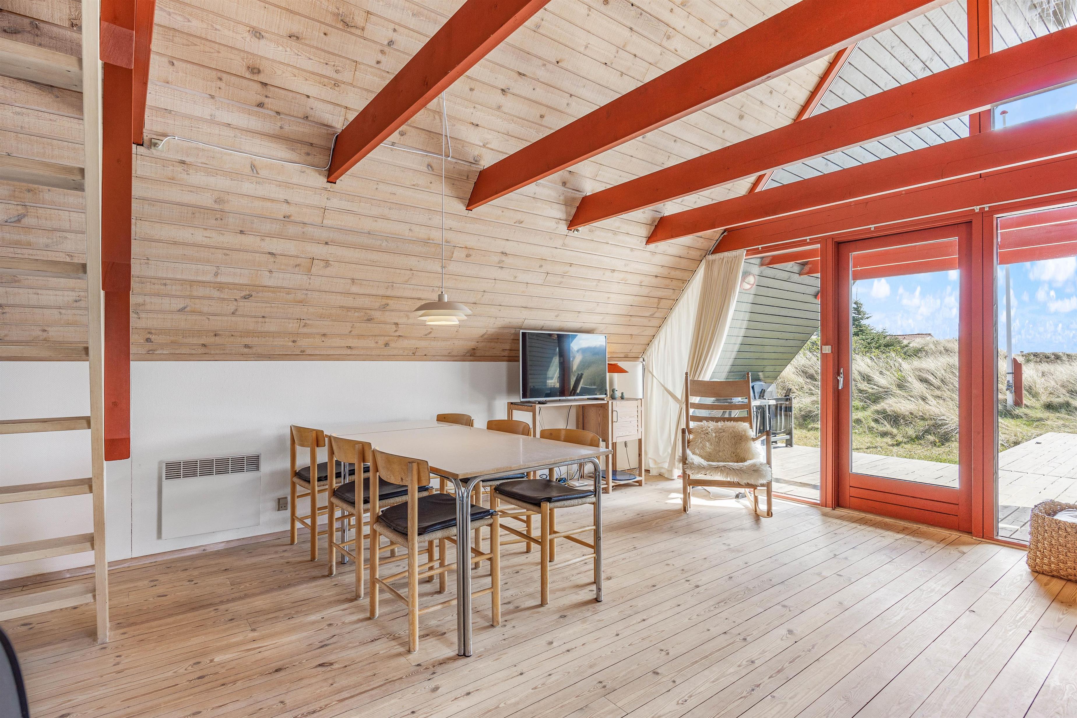 Der hersker en skøn ro over sommerhuset i Houvig, hvor den store rummelighed virker inviterende og lokkende på sine gæster. De hvide vægge og lofter kombineret med de store vinduespartier gør opholdsrummet lyst og imødekommende. Og sammen med brændeovnen, loftet til kip, de fritlagte bjælker og hemsen er sommerhusstemningen virkelig i top. Ja, hver og en af feriehusets 74 kvadratmeter oser ligefrem af feriehygge.