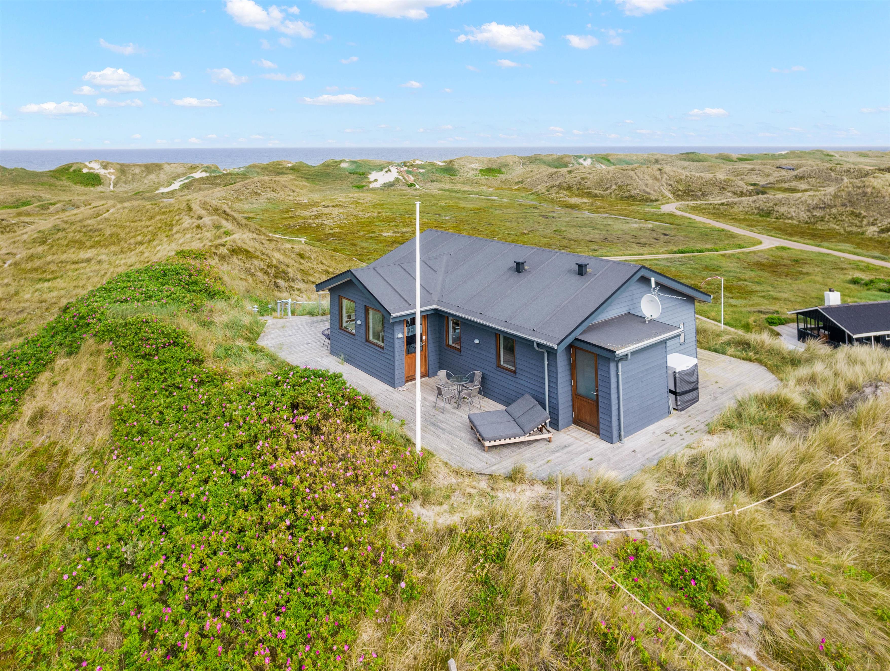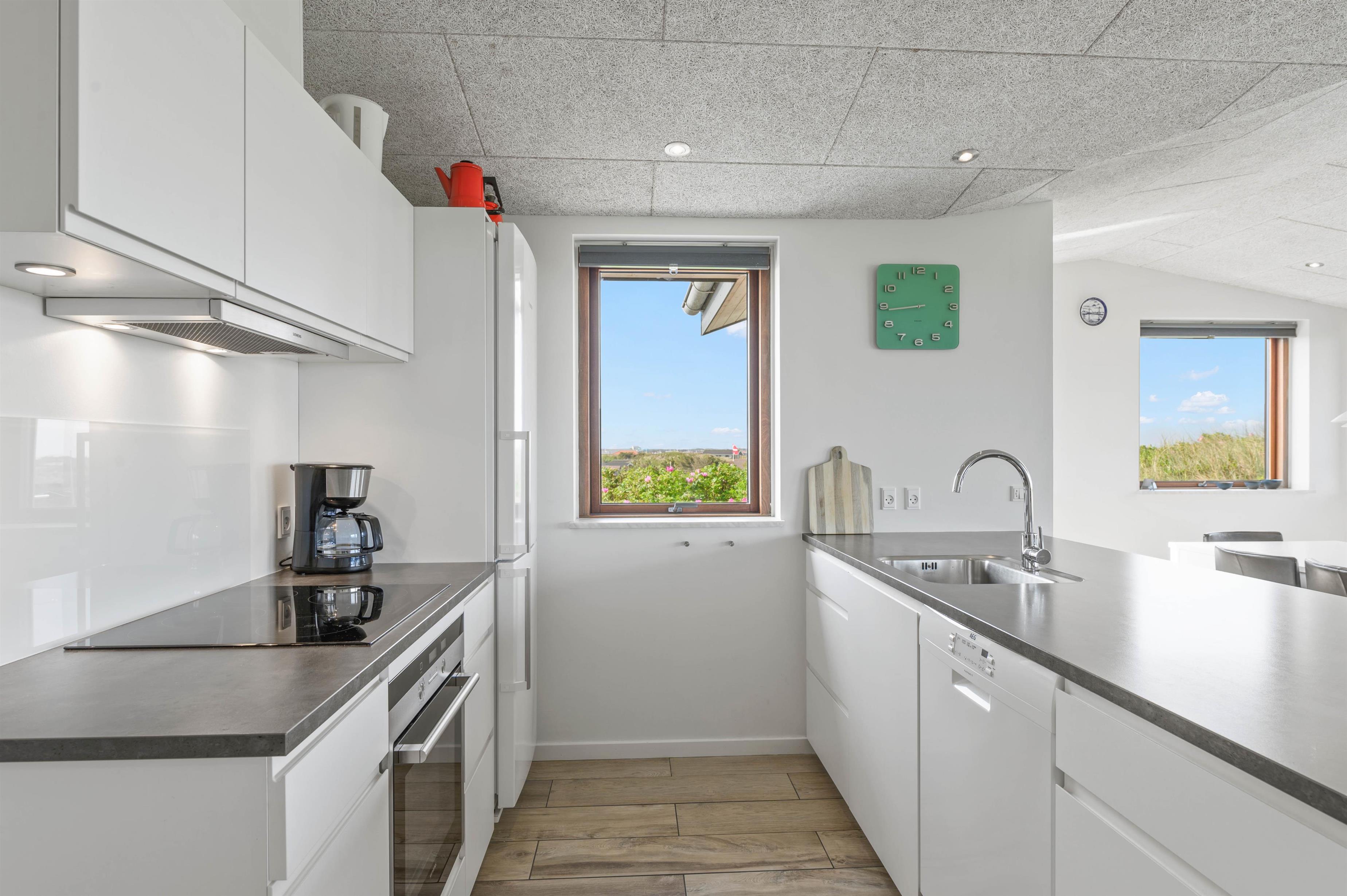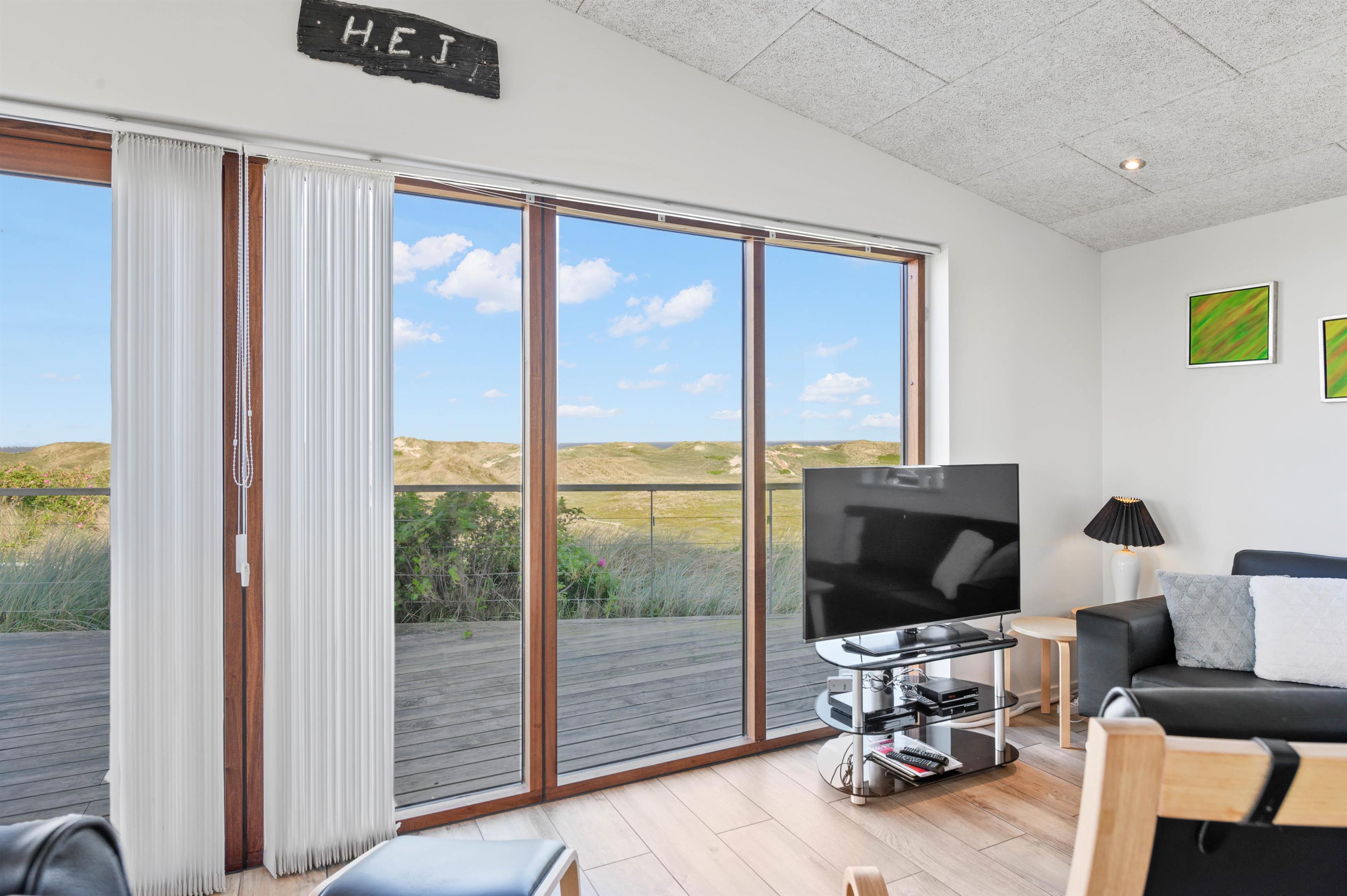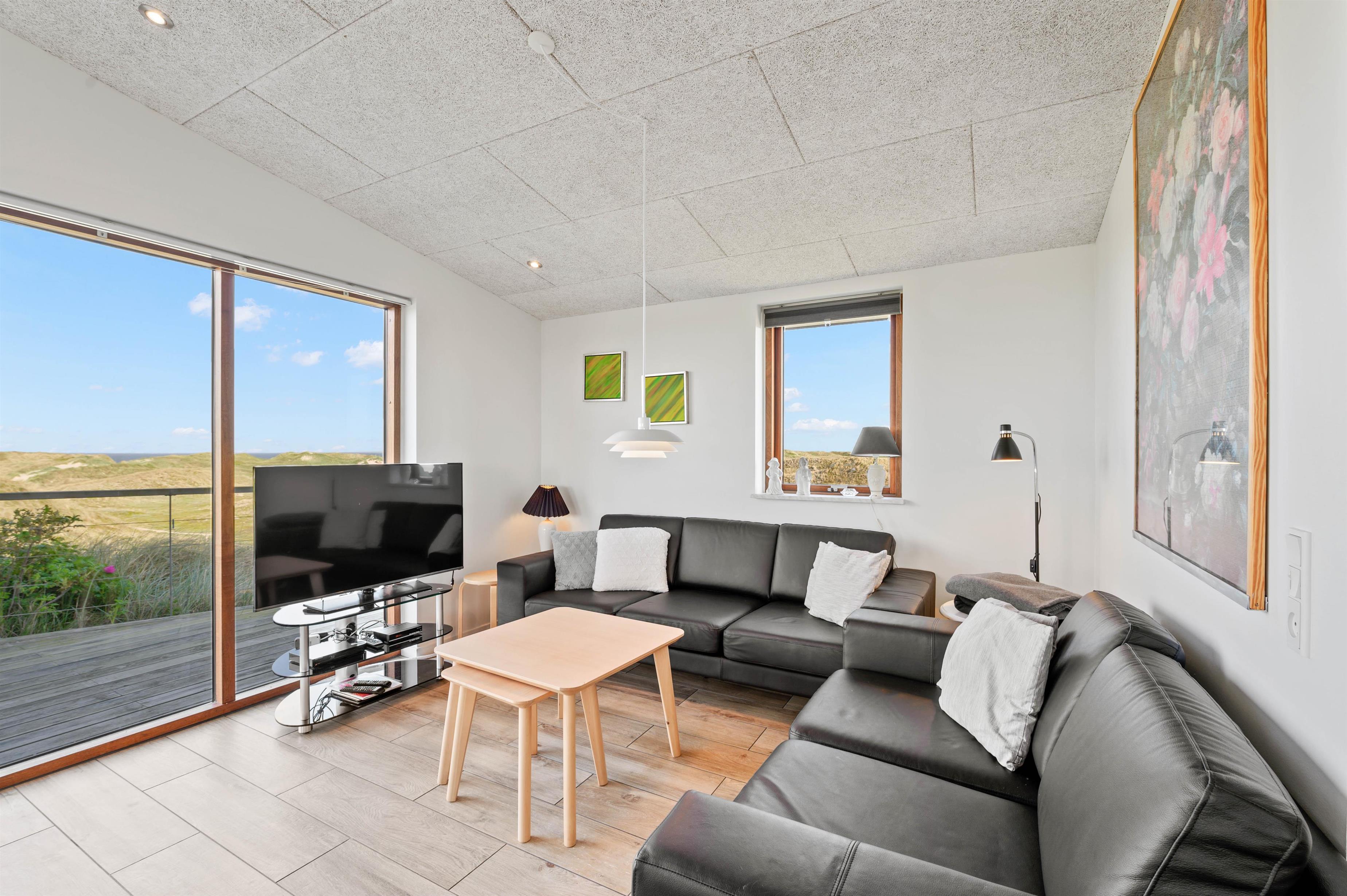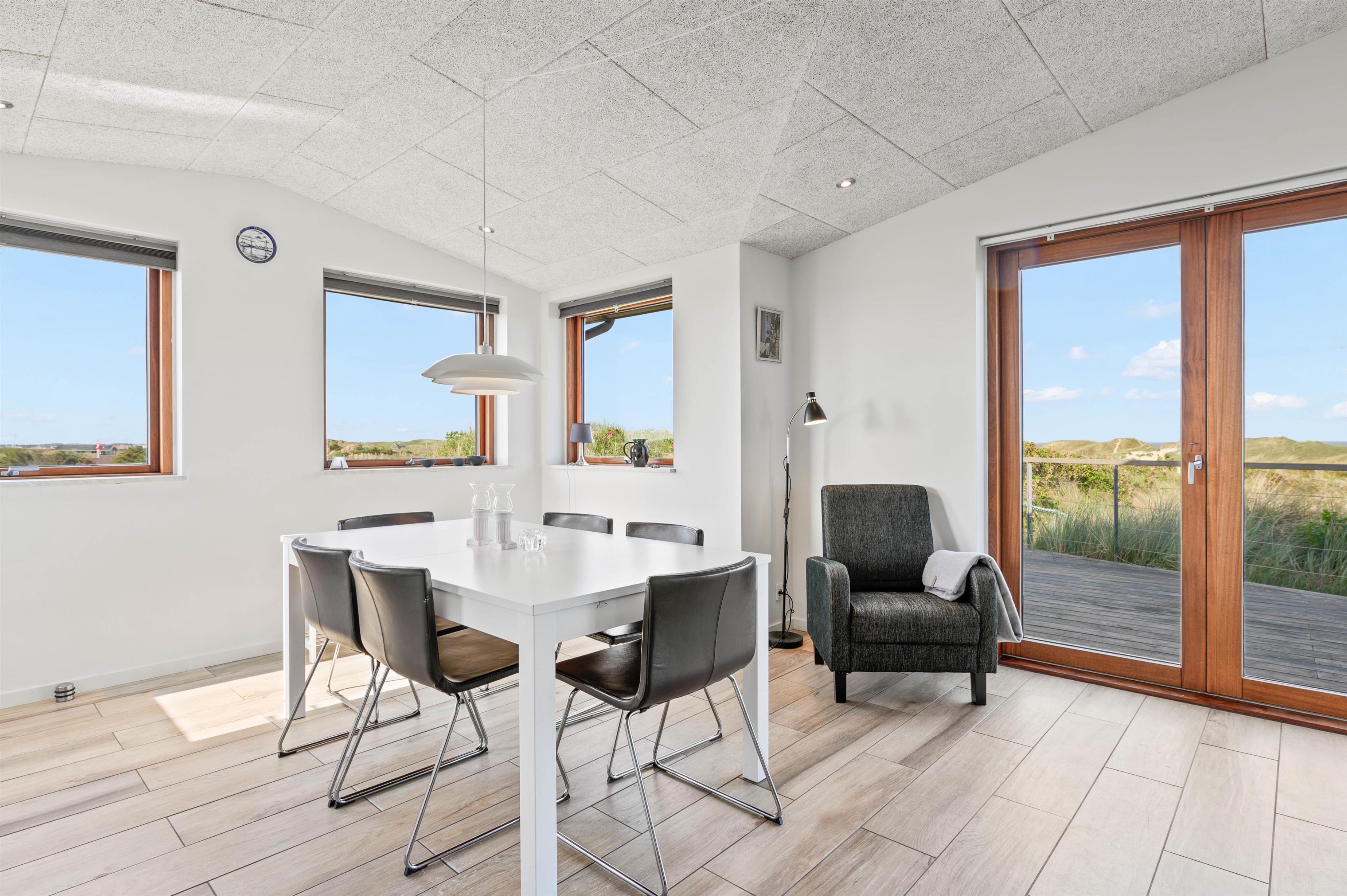 Hvad end I sidder i sofaen, står og laver mad i det funktionelle køkken, eller sidder og nyder maden ved spisebordet, har I hele tiden en betagende udsigt over Vesterhavet gennem stuens store panoramavinduer. Herfra er der udgang til husets store træterrasse hvor udsigten er intet mindre end fænomenal. Fordi at huset ligger så højt, kan I her i huset også nyde masser af privatliv, og ikke føle jer overvåget af nogen som helst.