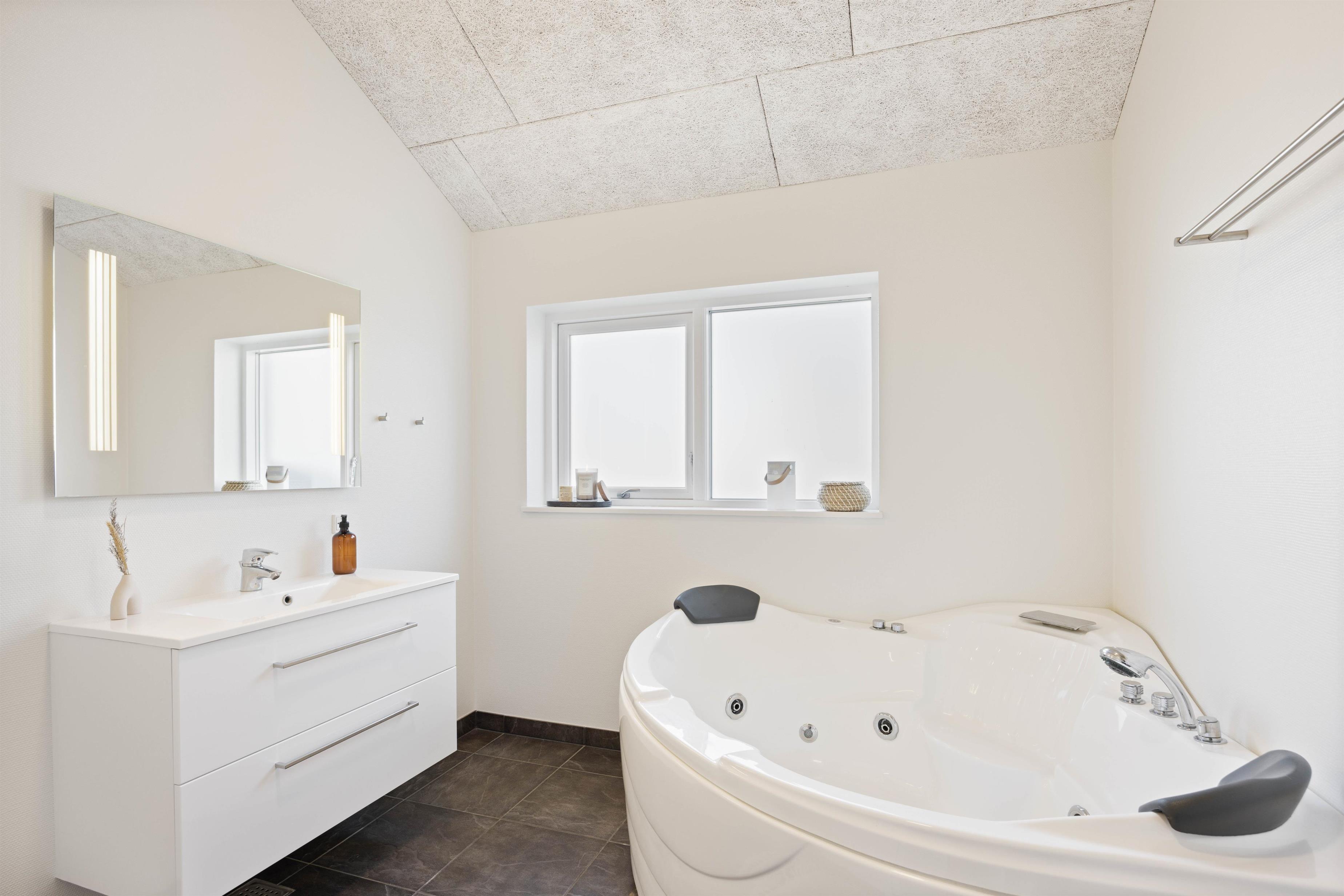 I feriehusets ene badeværelse, vil få enhver til at føle sig forkælet og afslappet. Badeværelset er stilfuldt indrettet og har en tømmespa og bruser, der giver mulighed for at slappe af og forkæle kroppen. Det er det perfekte sted at tilbringe en afslappende aften efter en god dag med aktiviteter eller for at forberede sig til en dag med sightseeing.
