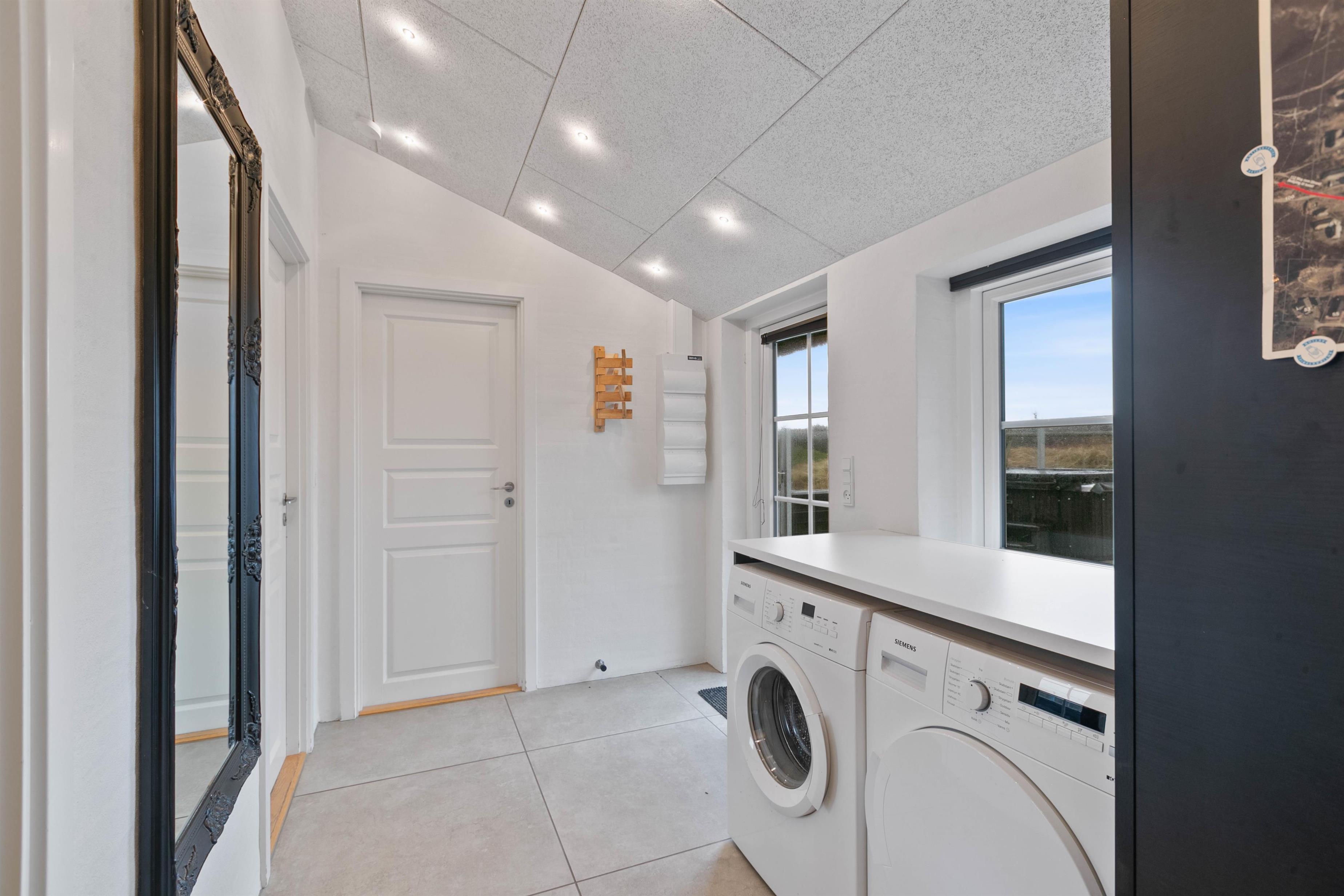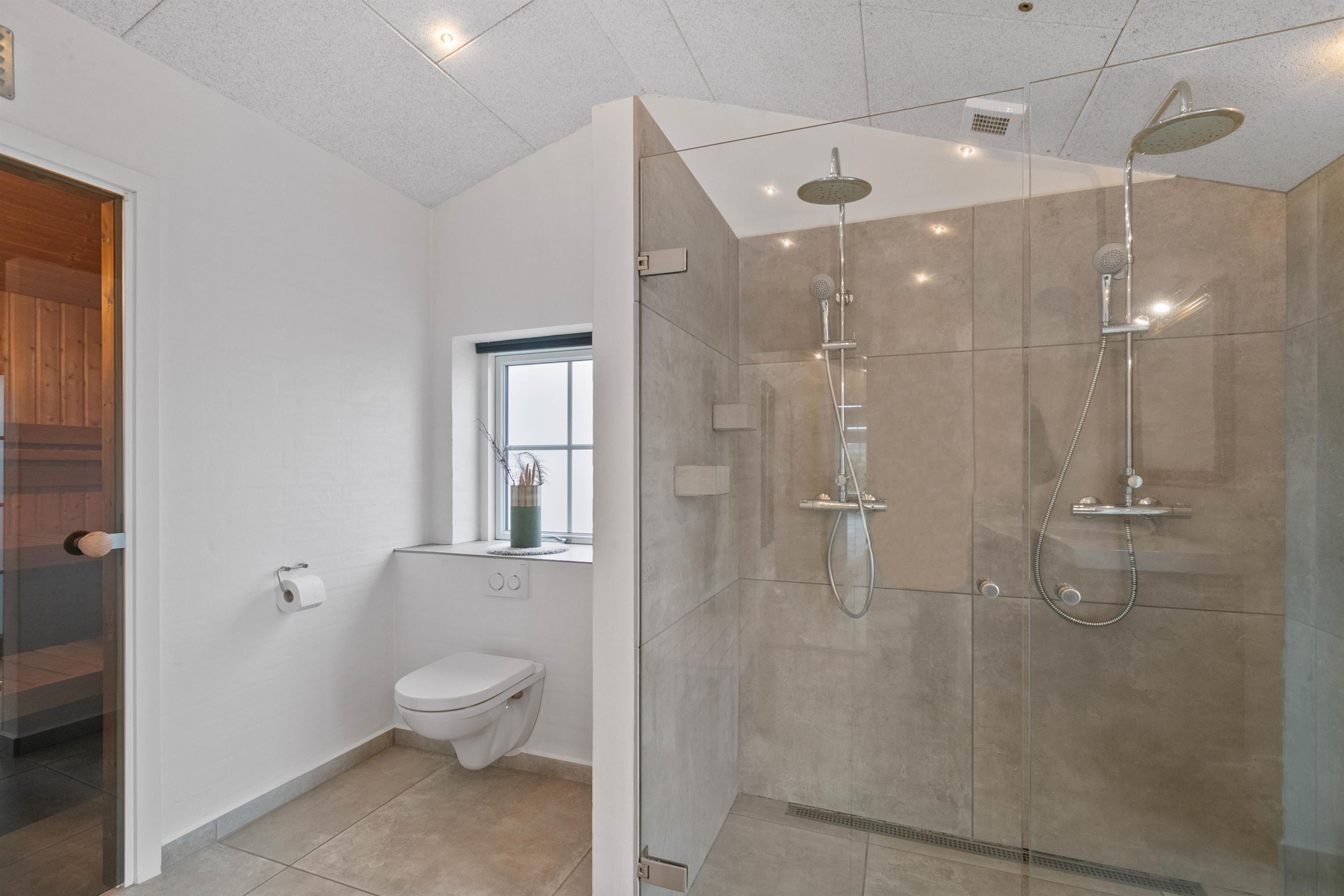 Et af de indendørs højdepunkter i sommerhuset er det store badeværelse. Her er der både gulvvarme, dobbeltbruser og adgang til en skøn sauna, hvor I kan nyde afslappende stunder i den dejlige varme. En tur i sauna er også perfekt efter en frisk gåtur langs stranden eller en dukkert i havet, så I kan få varmen igen.