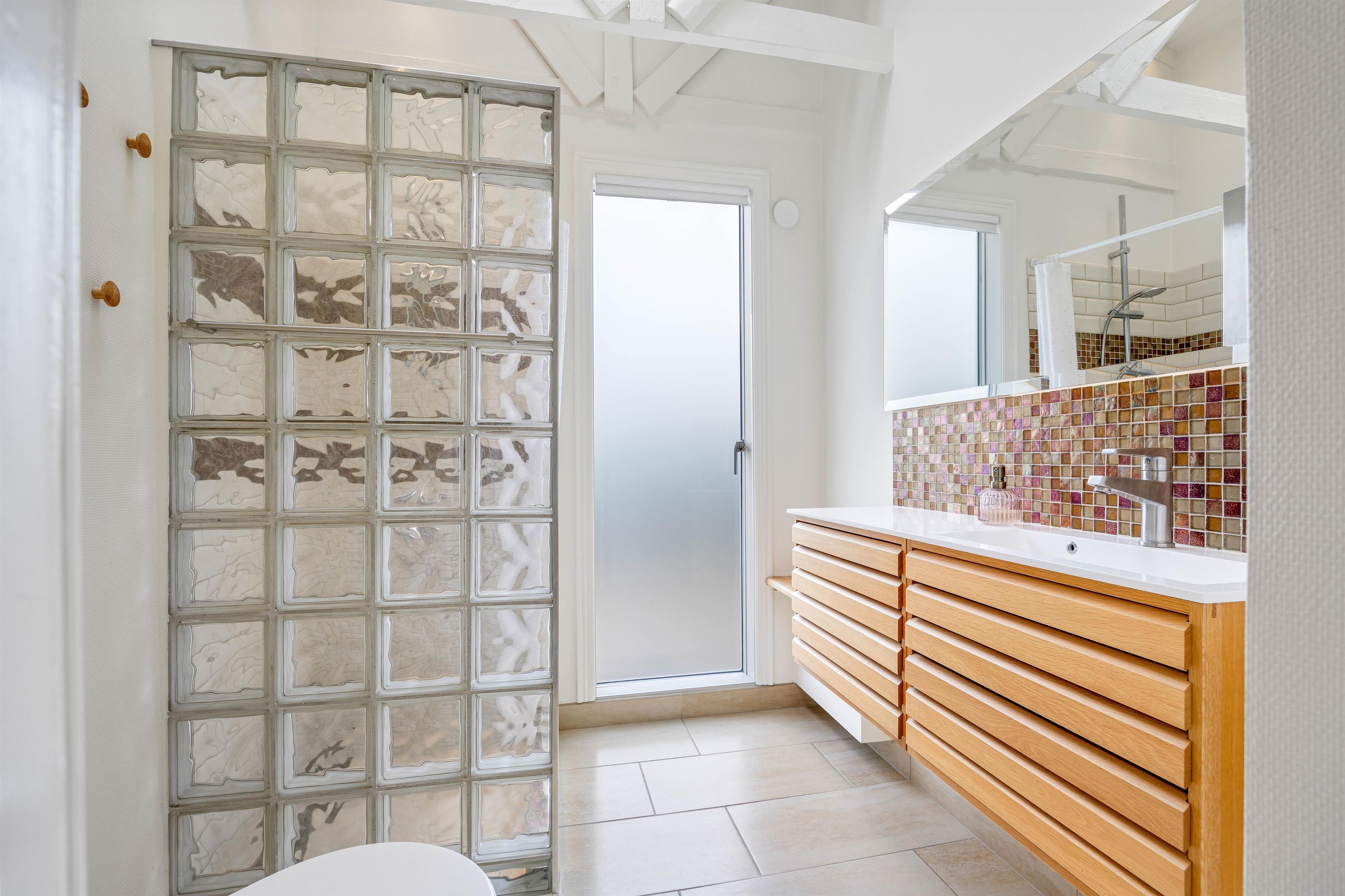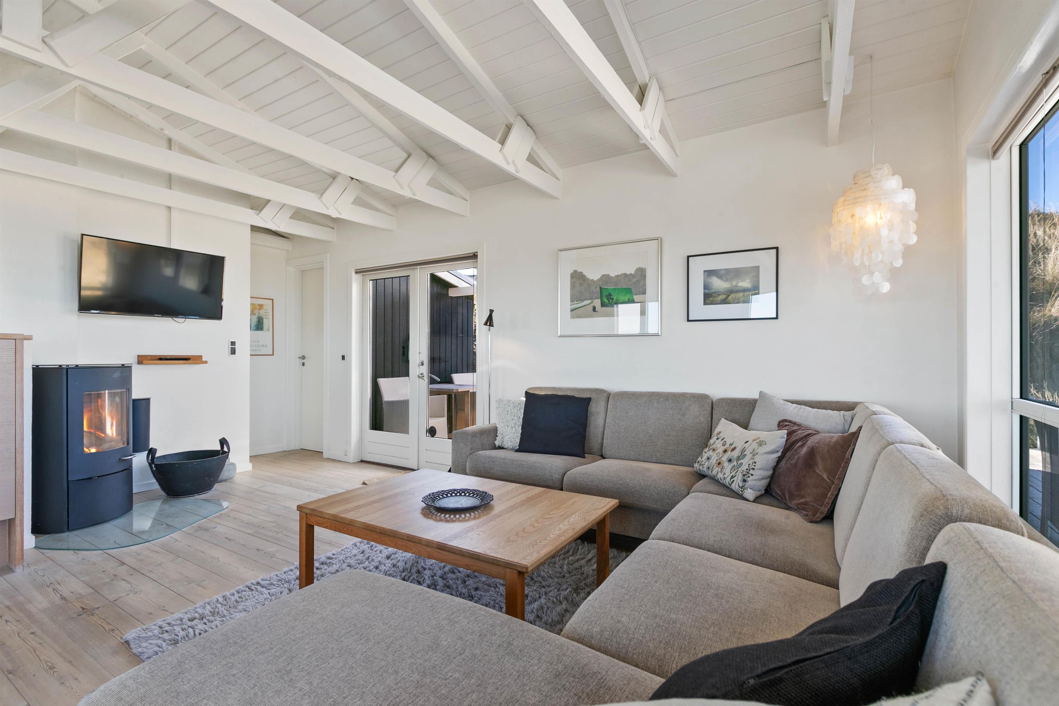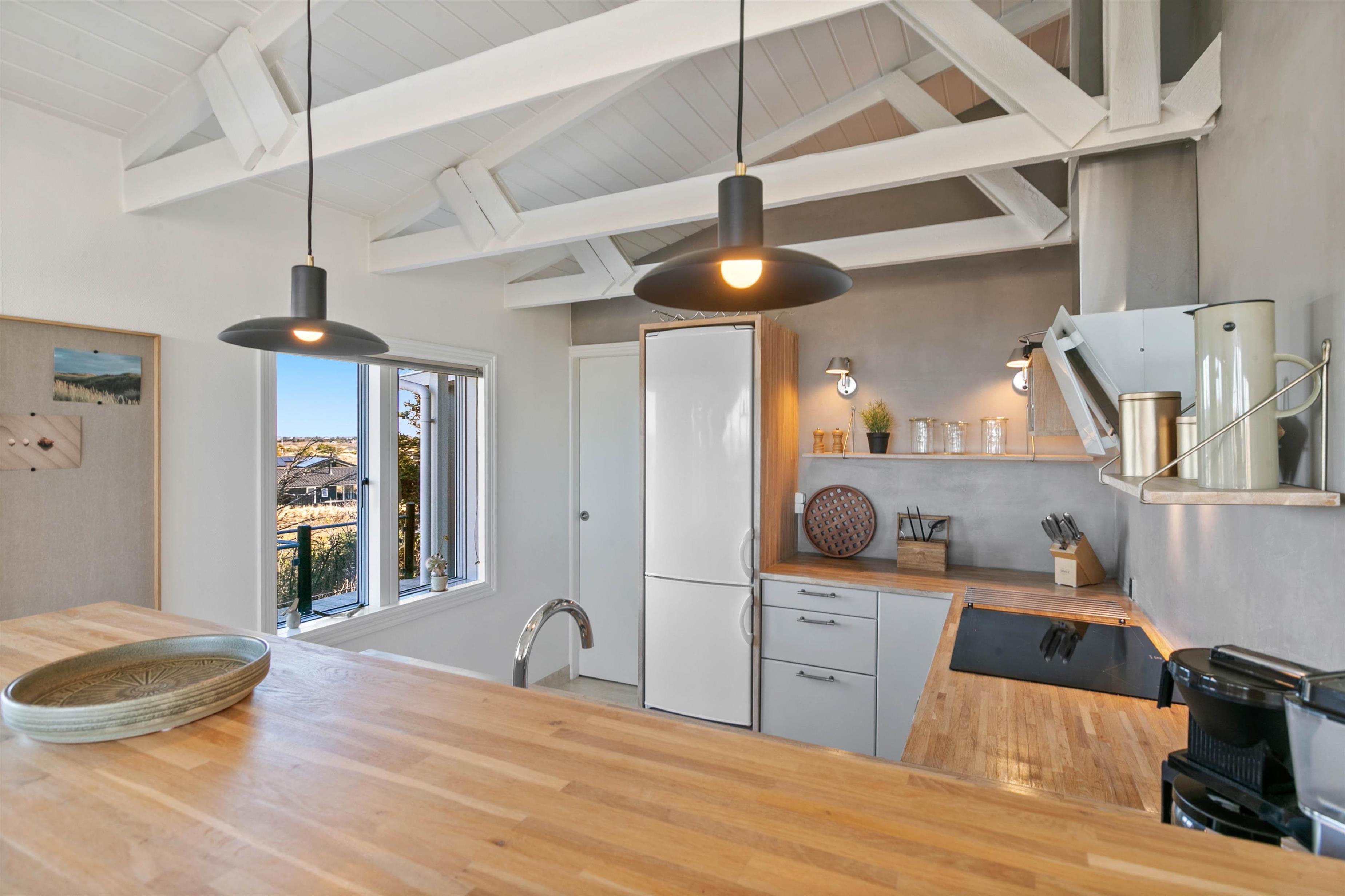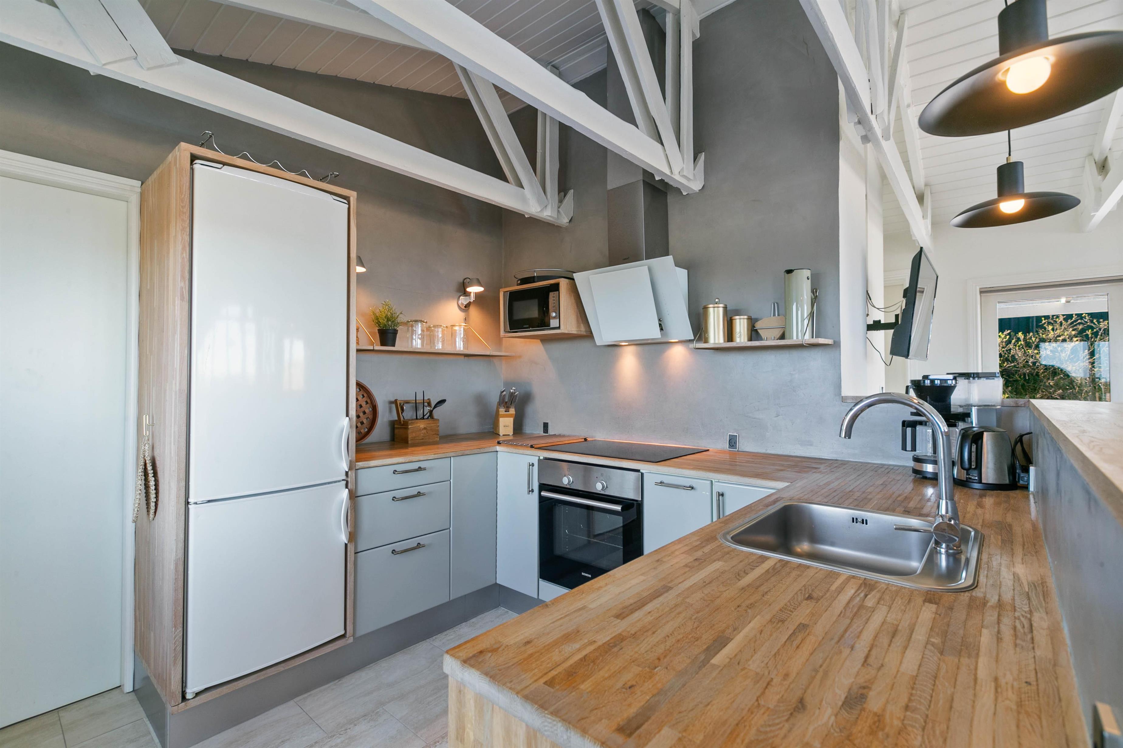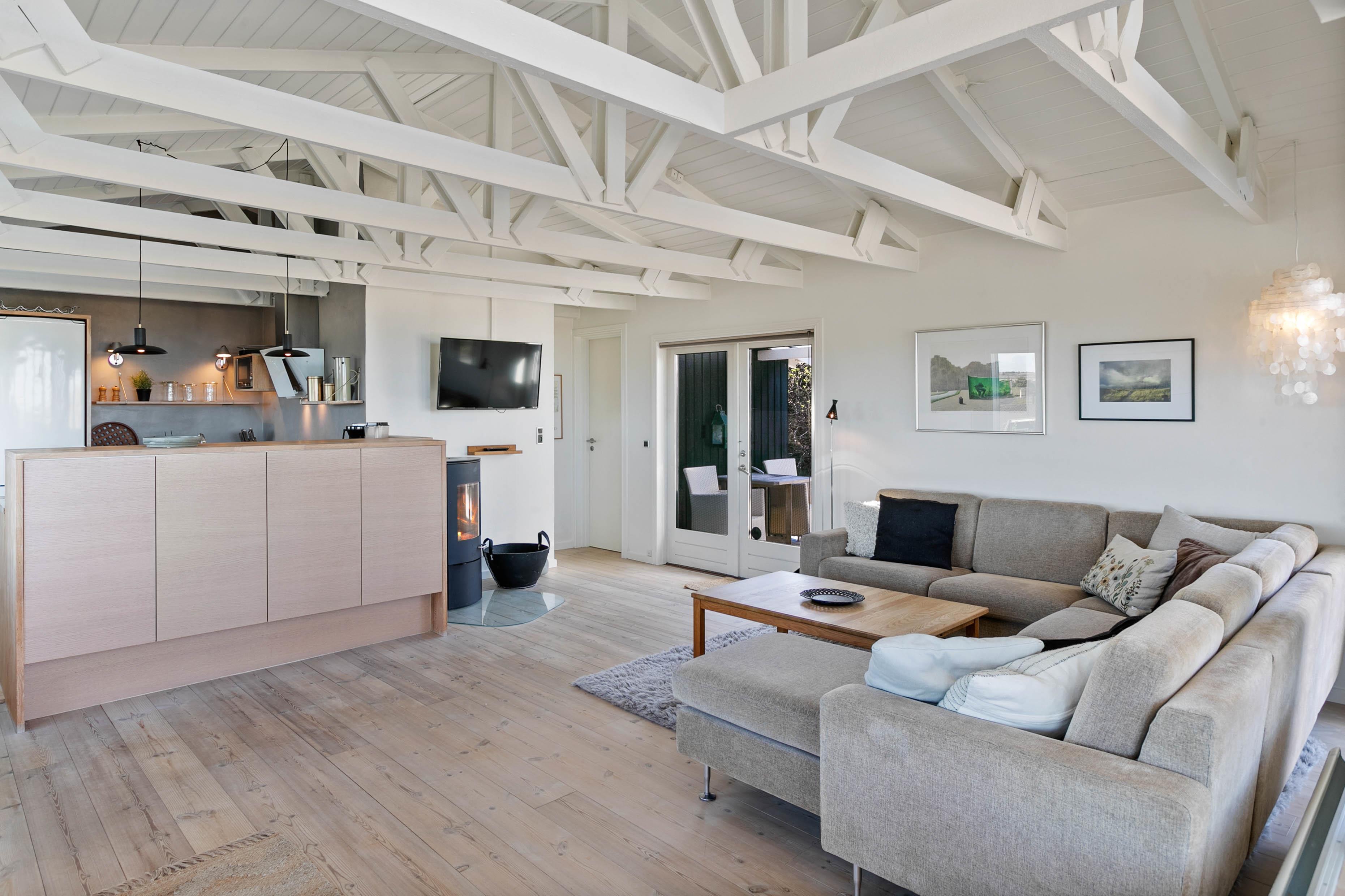 Den hyggelige brændeovn, som I finder i det lyse og åbne køkkenalrum, er med til at bidrage, til den helt rigtige sommerhusstemning. For eksra komfort, er der en behagelig gulvvarme i køkkenet.