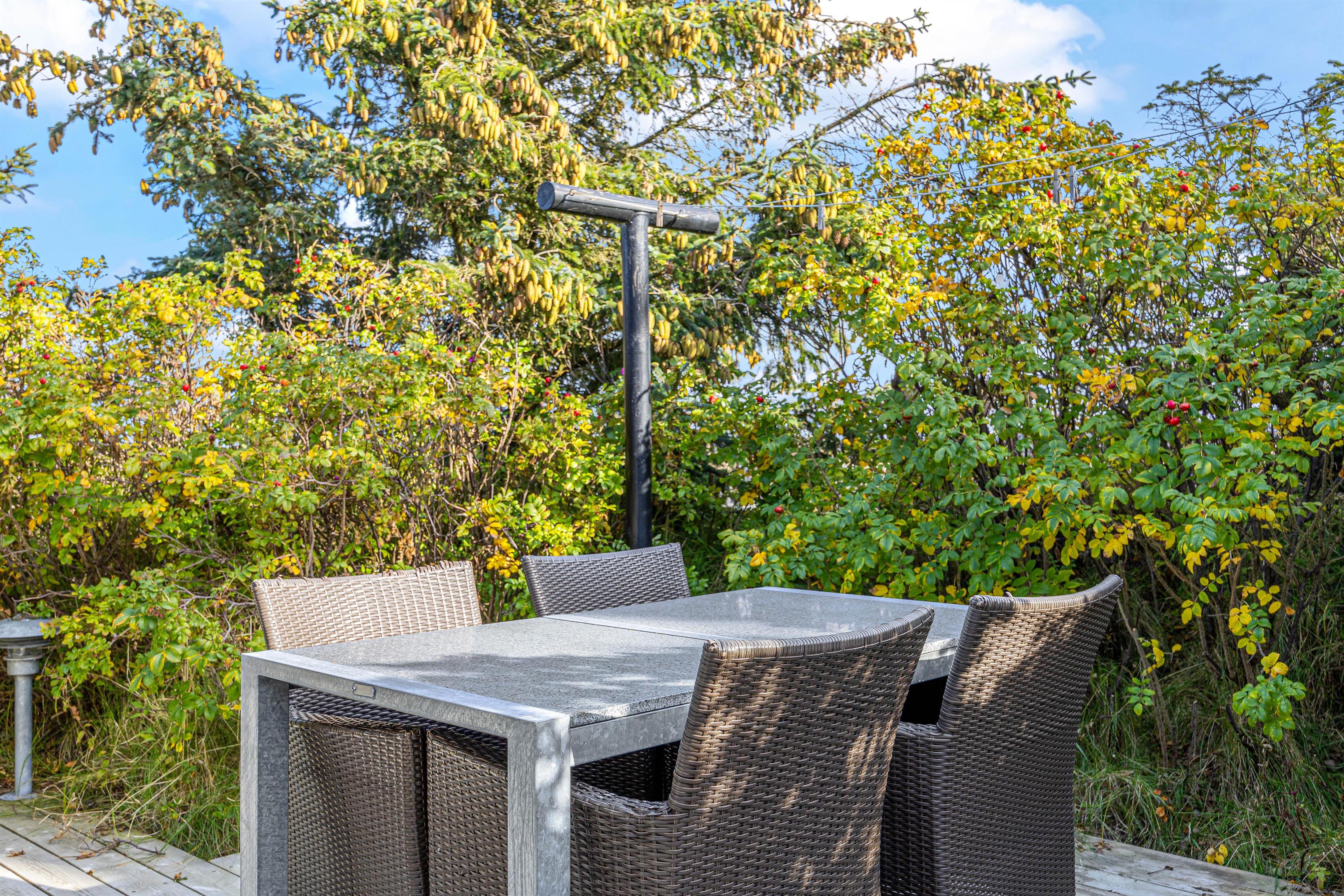 Lige så snart i træder ud af terrassedøren, bliver i mødt af en dejlig stor og rummelig terrasse. Her er der en masse forskellige siddemuligheder, da terrassen både er åben, afskærmet og overdækket. Her er der både havemøbler, solvogne og en kulgrill til jeres rådighed.