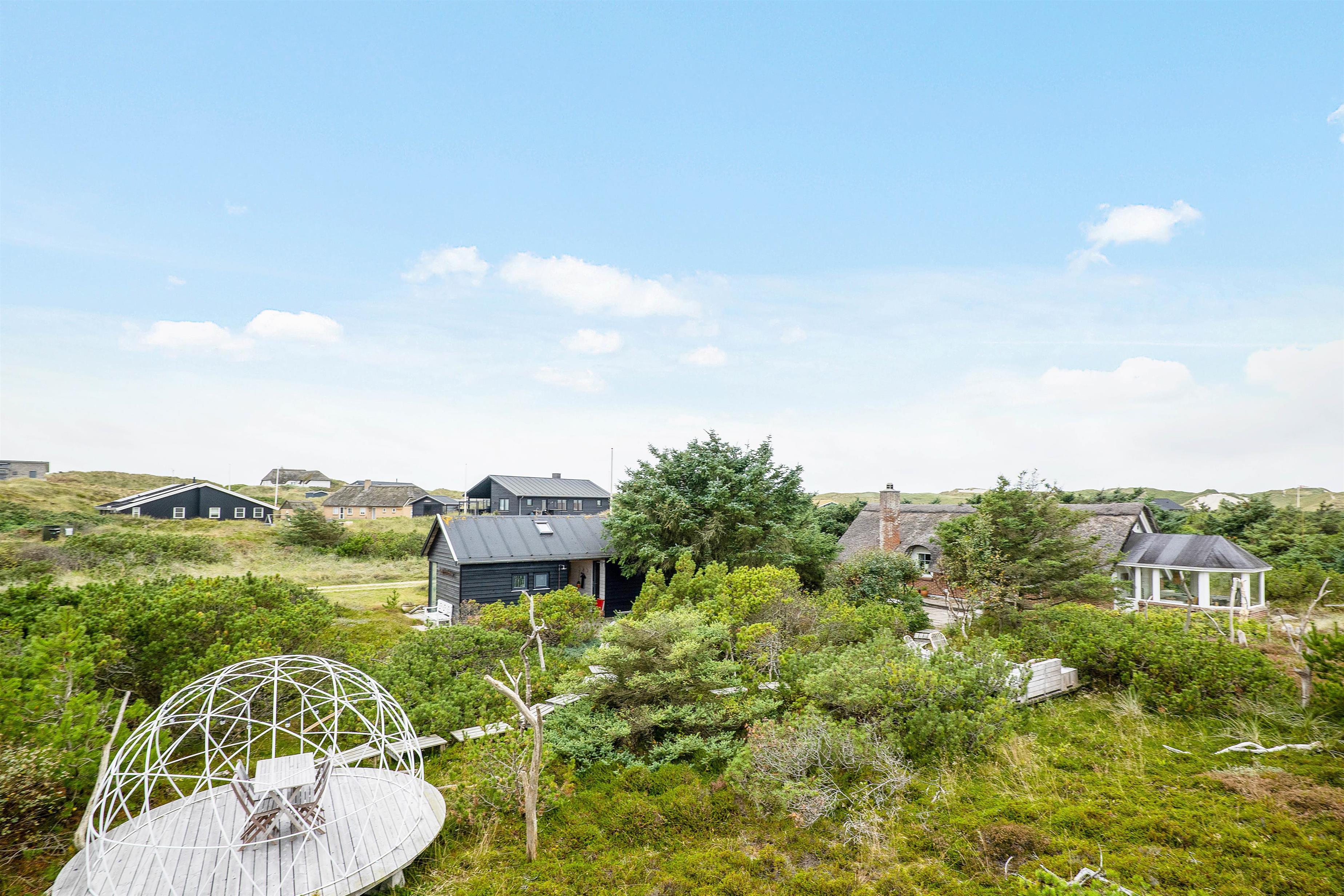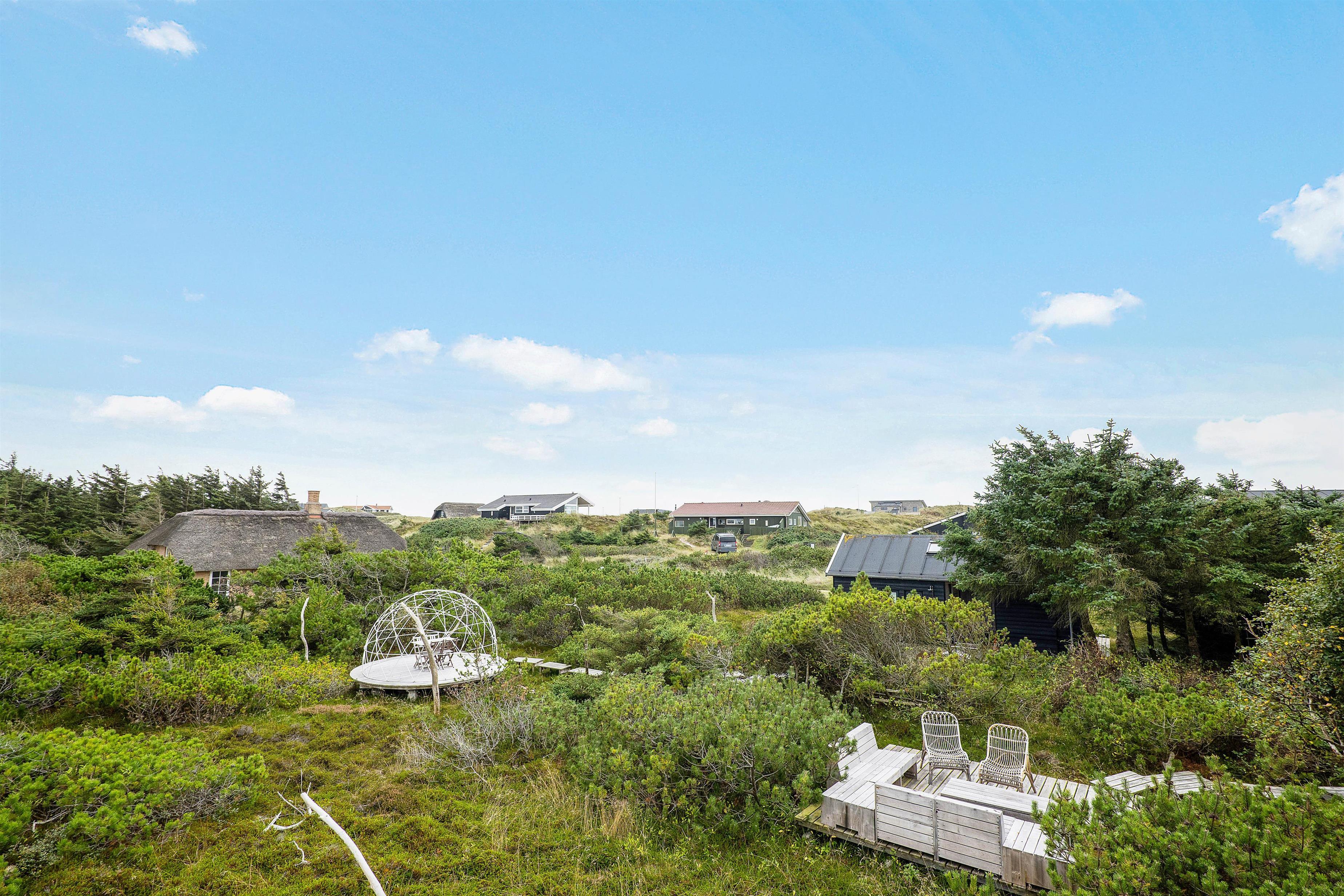 Sommerhusets mindre, men funktionelle køkken, er i åben forbindelse med den hyggelige stue og spisestue, hvor I også finder feriehusets brændeovn. Her kan I sidde og følge med i madlavningen og ferieplanlægningen. Efter en dejlig middag kan I sætte jer i stolene i udestuen – som husejer kalder for ”Agterstuen” – og her kan I nyde en drink eller en kop kaffe, mens I kigger ud i klitlandskabet og solnedgangen over den jyske hede. Udestuen er en lille kuppelformet stue i forlængelse af en træterrasse.
