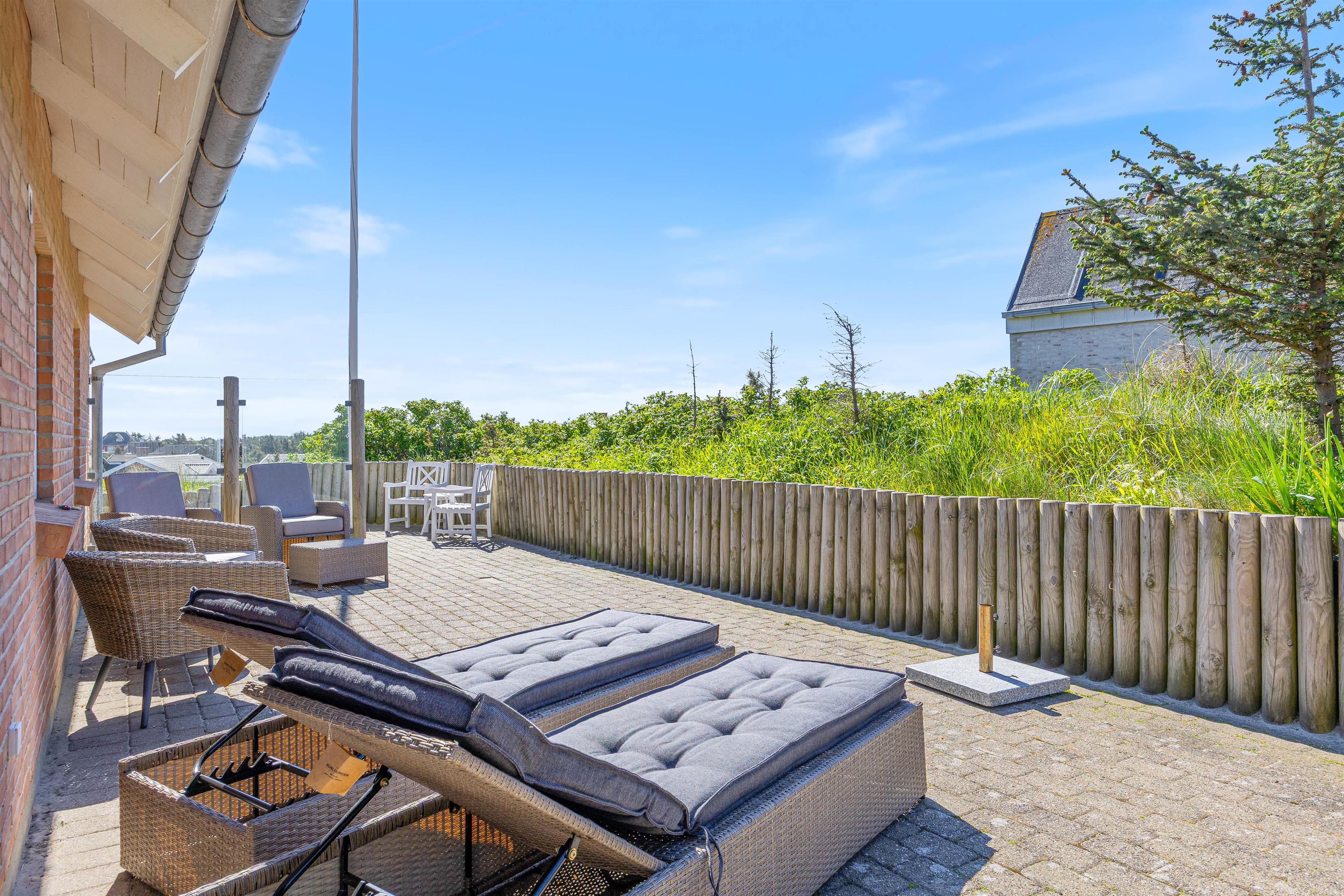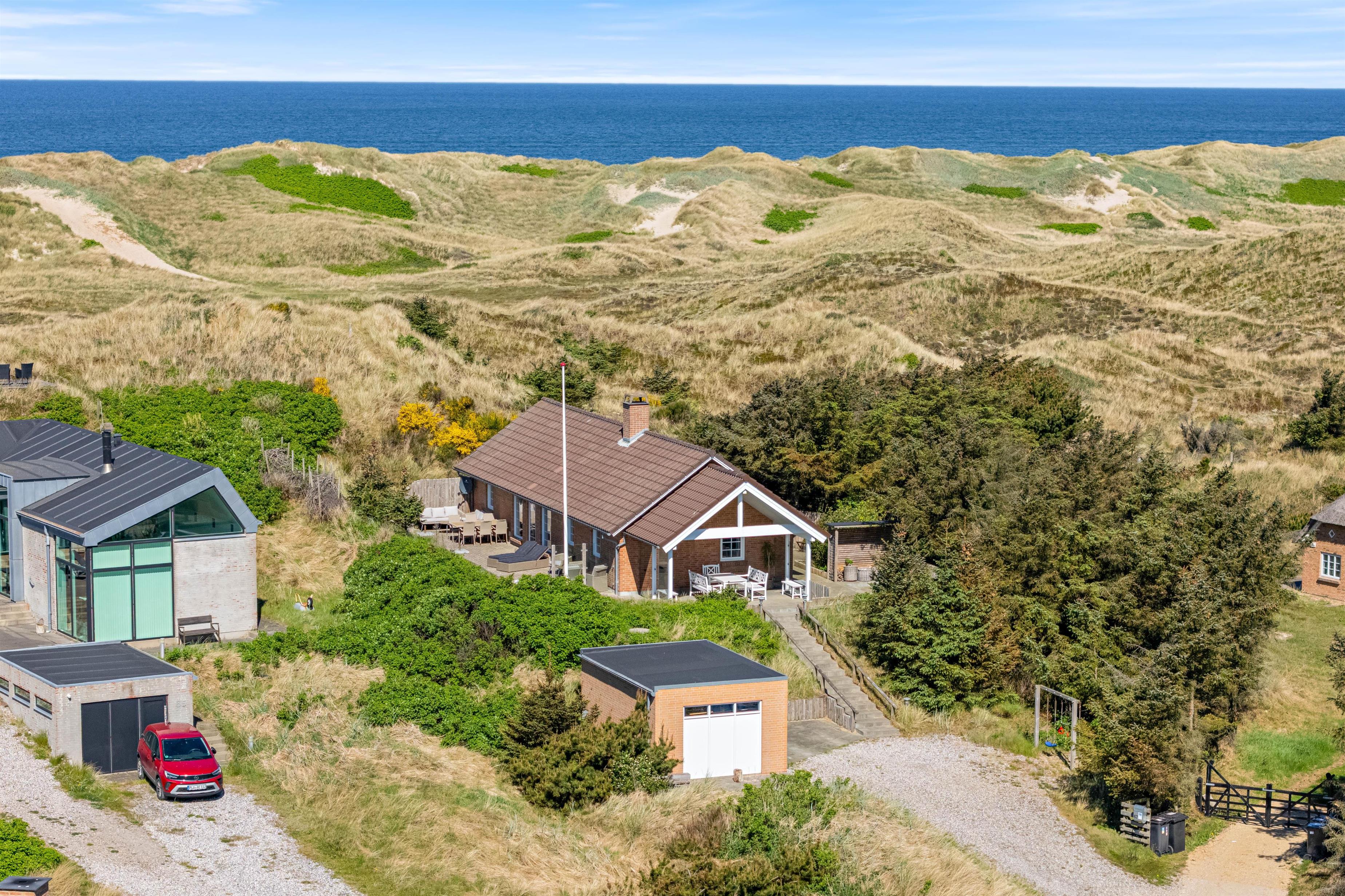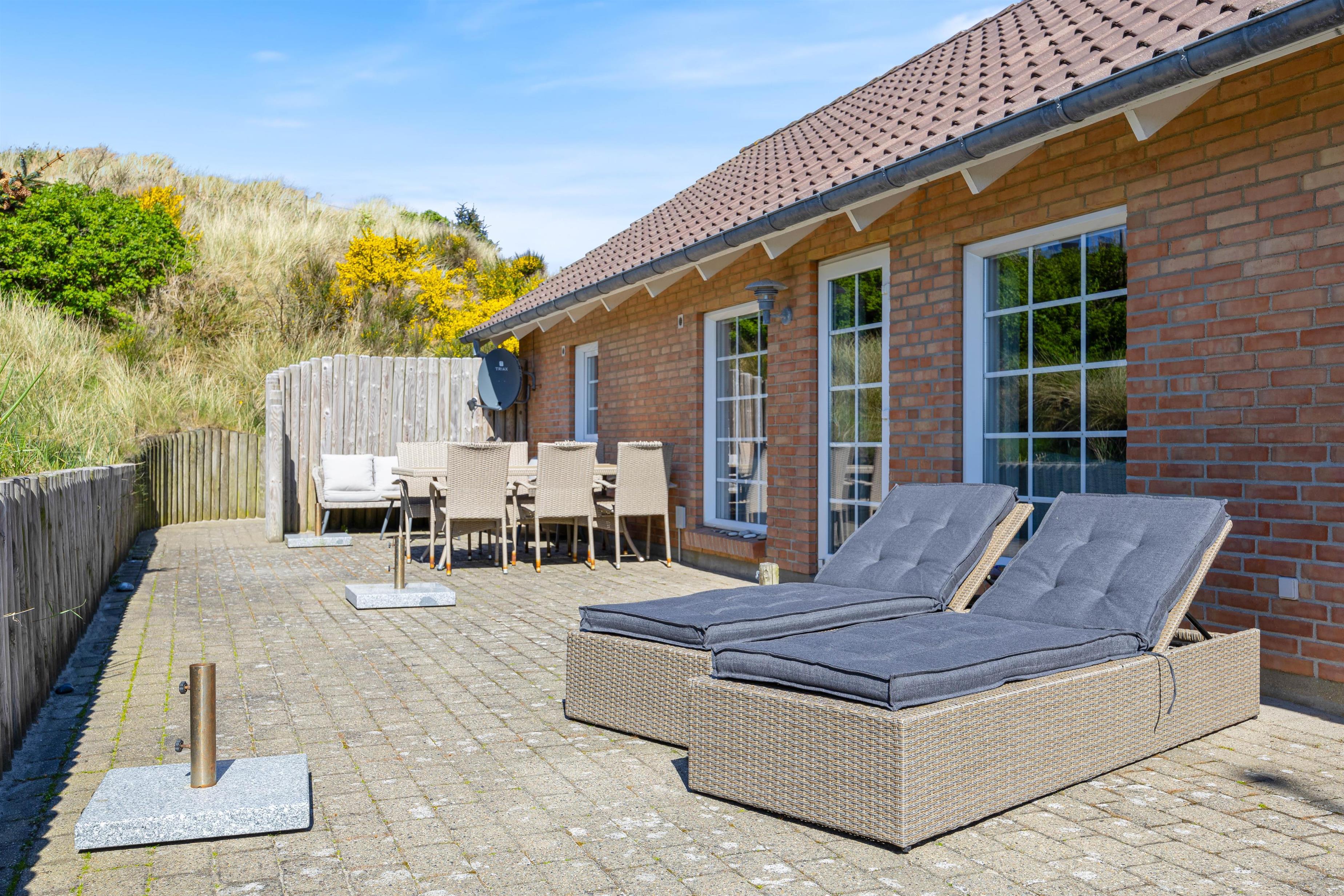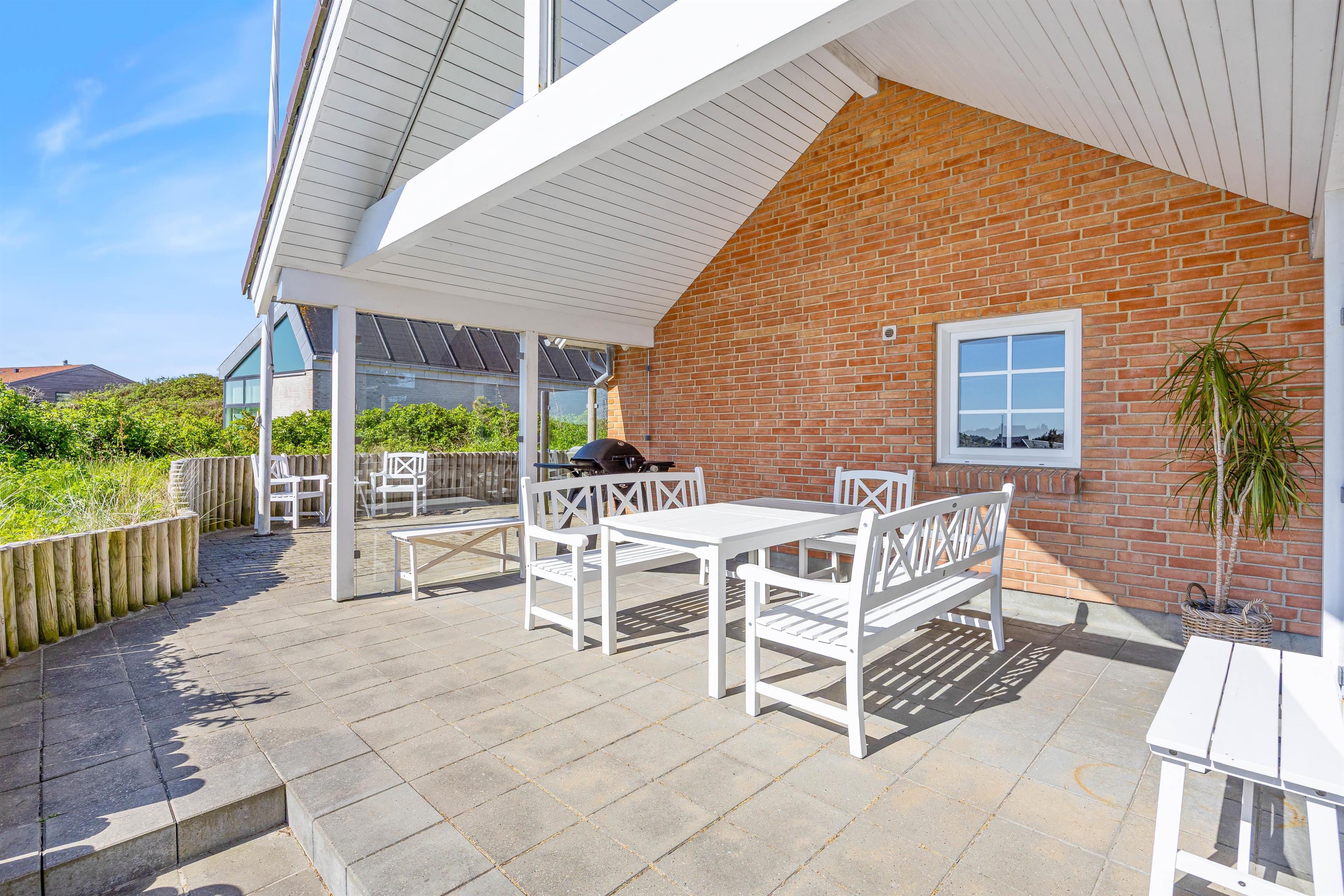 Noget helt unikt ved sommerhuset er den enestående beliggenhed. Det ligger i første klitrække og har flere terrasser, hvor I kan nyde den danske natur. I kan slappe af i solen på den afskærmede eller overdækkede terrasse, hvor havemøblerne står klar til et måltid tilberedt på grillen.