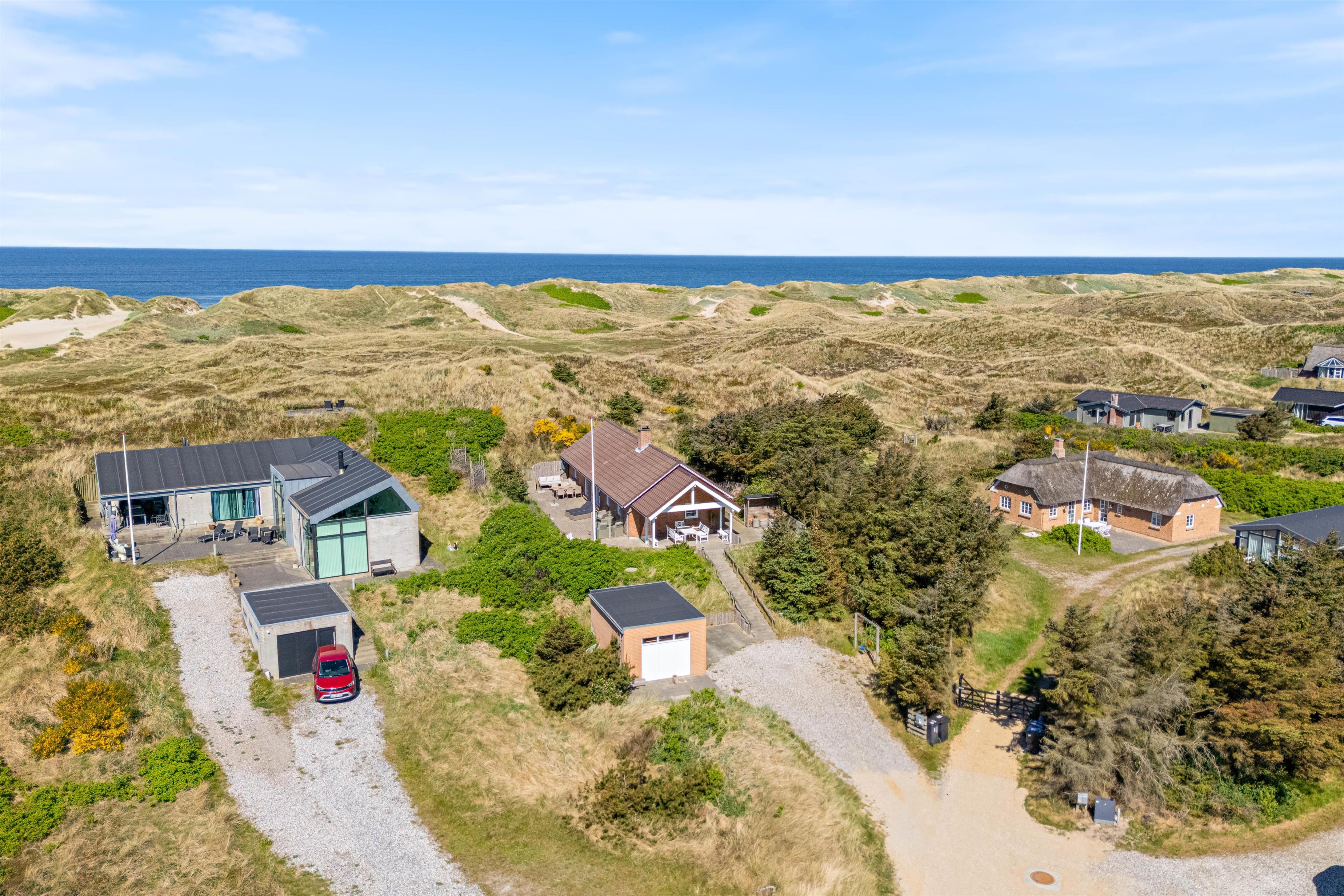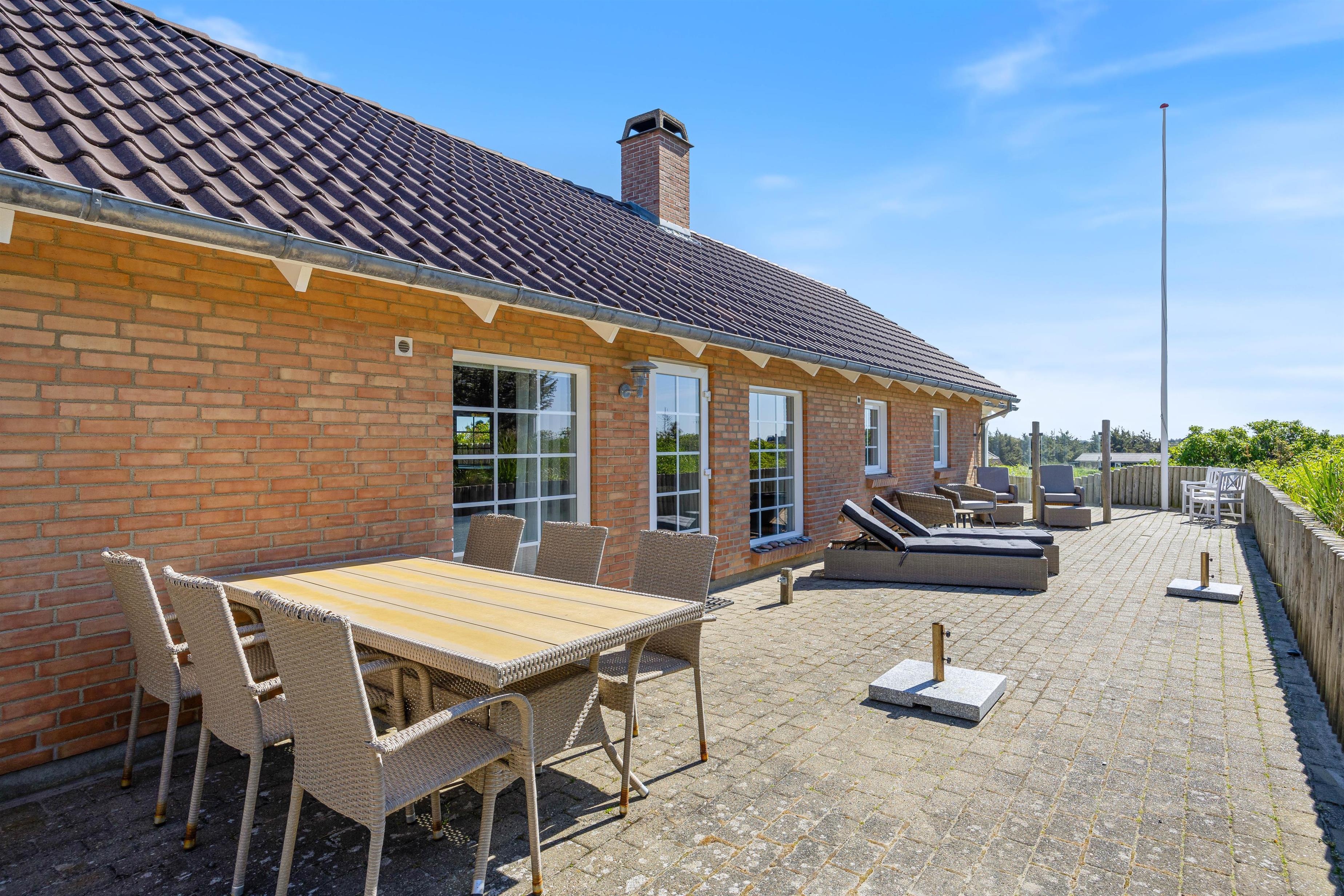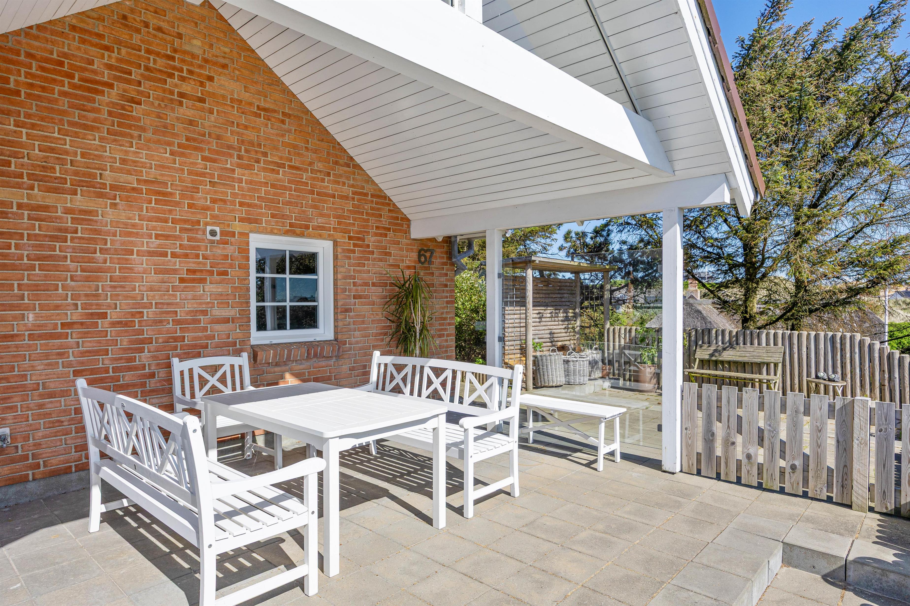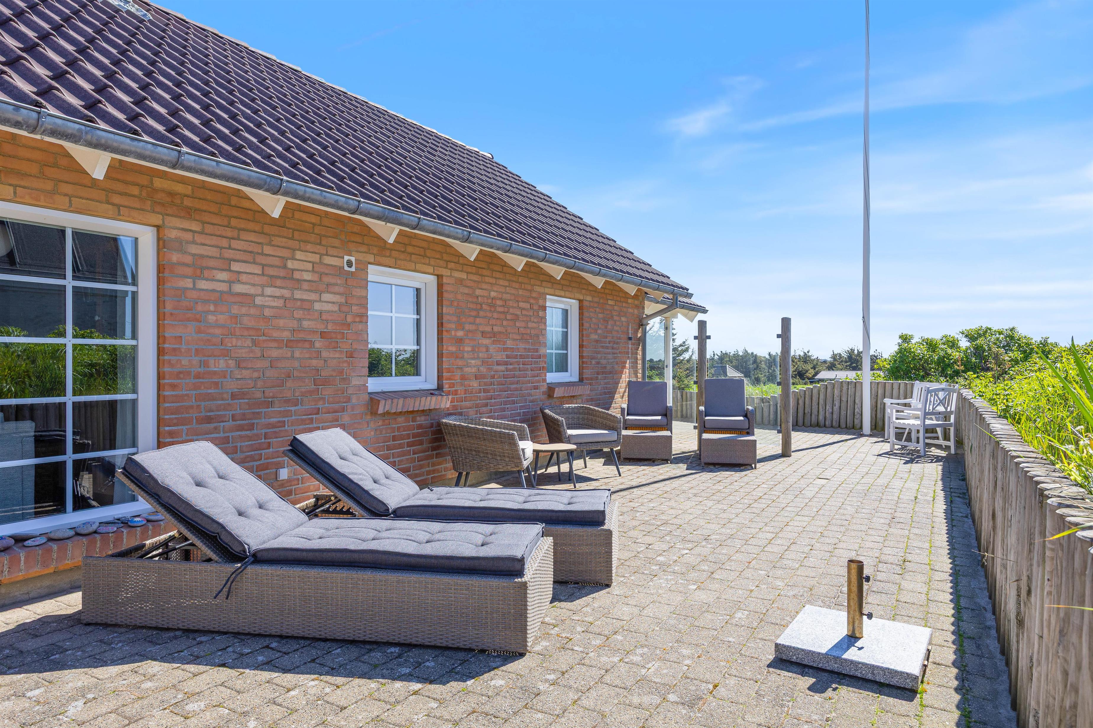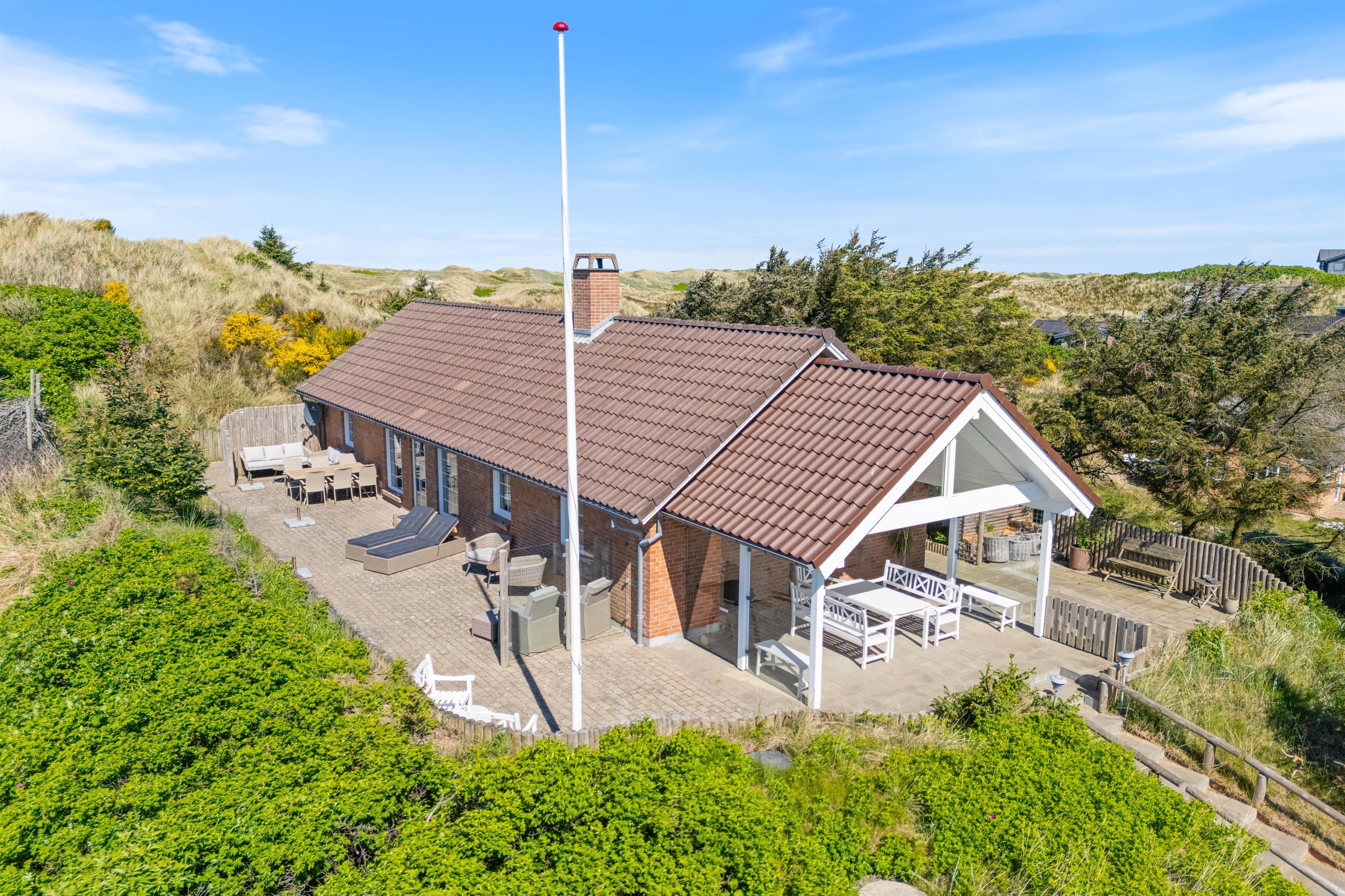 Noget helt unikt ved sommerhuset er den enestående beliggenhed. Det ligger i første klitrække og har flere terrasser, hvor I kan nyde den danske natur. I kan slappe af i solen på den afskærmede eller overdækkede terrasse, hvor havemøblerne står klar til et måltid tilberedt på grillen.