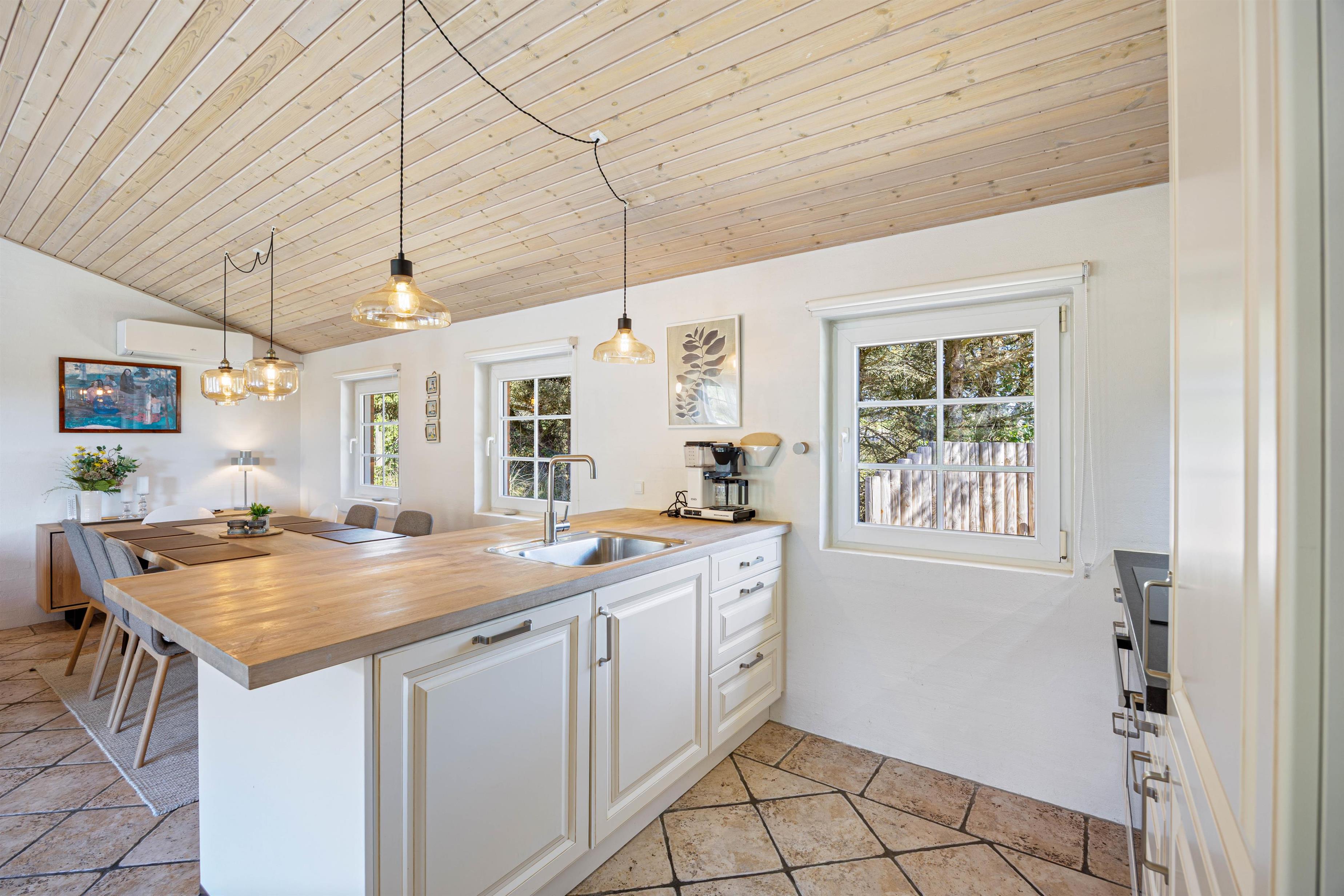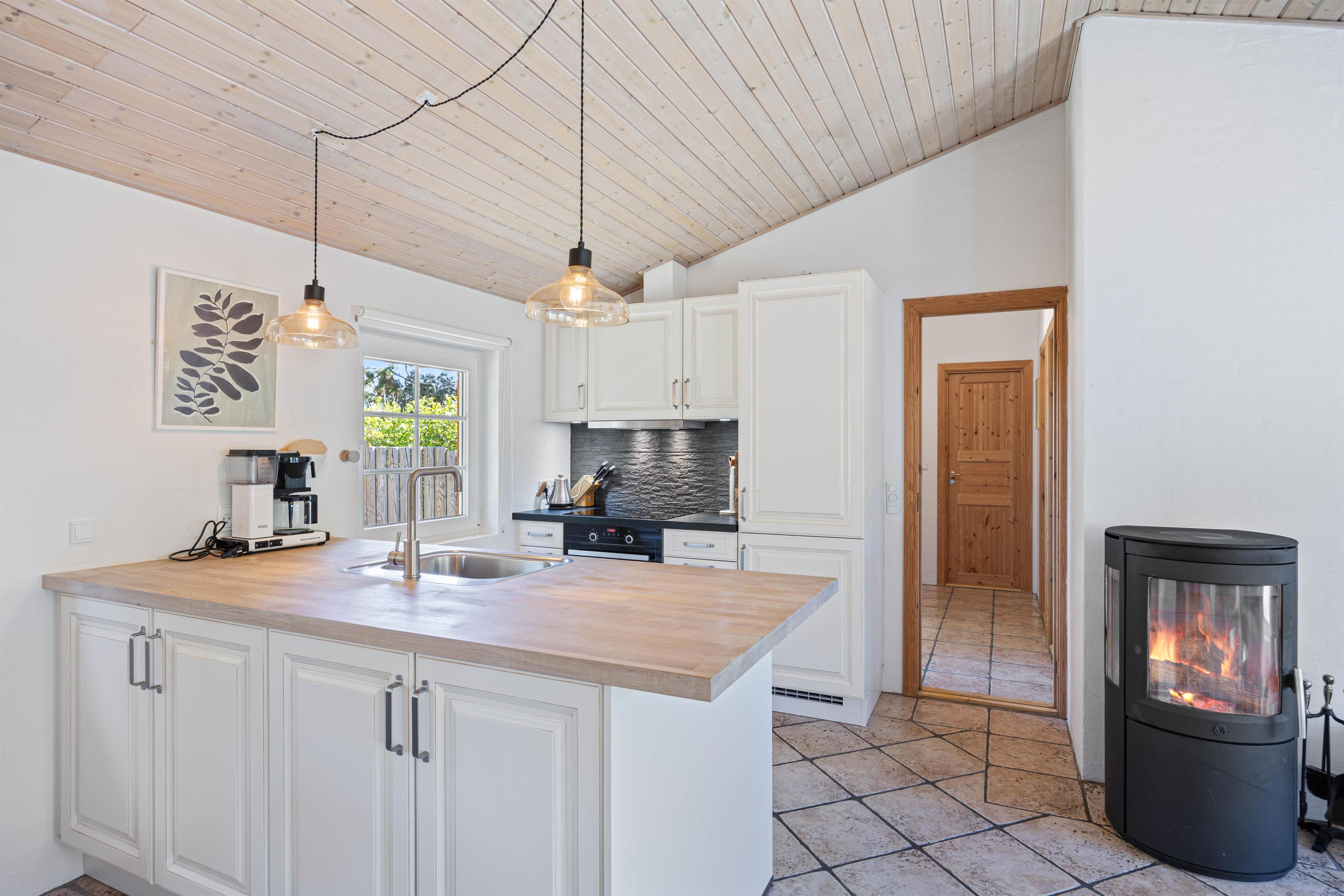 Alle jeres behov bliver imødekommet her på Troldedalen 67. Her er en vaskesøjle hvilket betyder, at I nemt kan holde jeres garderobe ren og undgå at overpakke. En luft-til-luft-varmepumpe og en hyggelig brændeovn sørger for, at I altid kan holde en behagelig temperatur – uanset vejret udenfor. Ligesom resten af sommerhuset er køkkenet veludstyret, blandt andet med opvaskemaskine og en separat fryser på 80 liter, hvilket gør oprydningen efter middagen nem og giver jer masser af opbevaringsplads til medbragte madvarer.