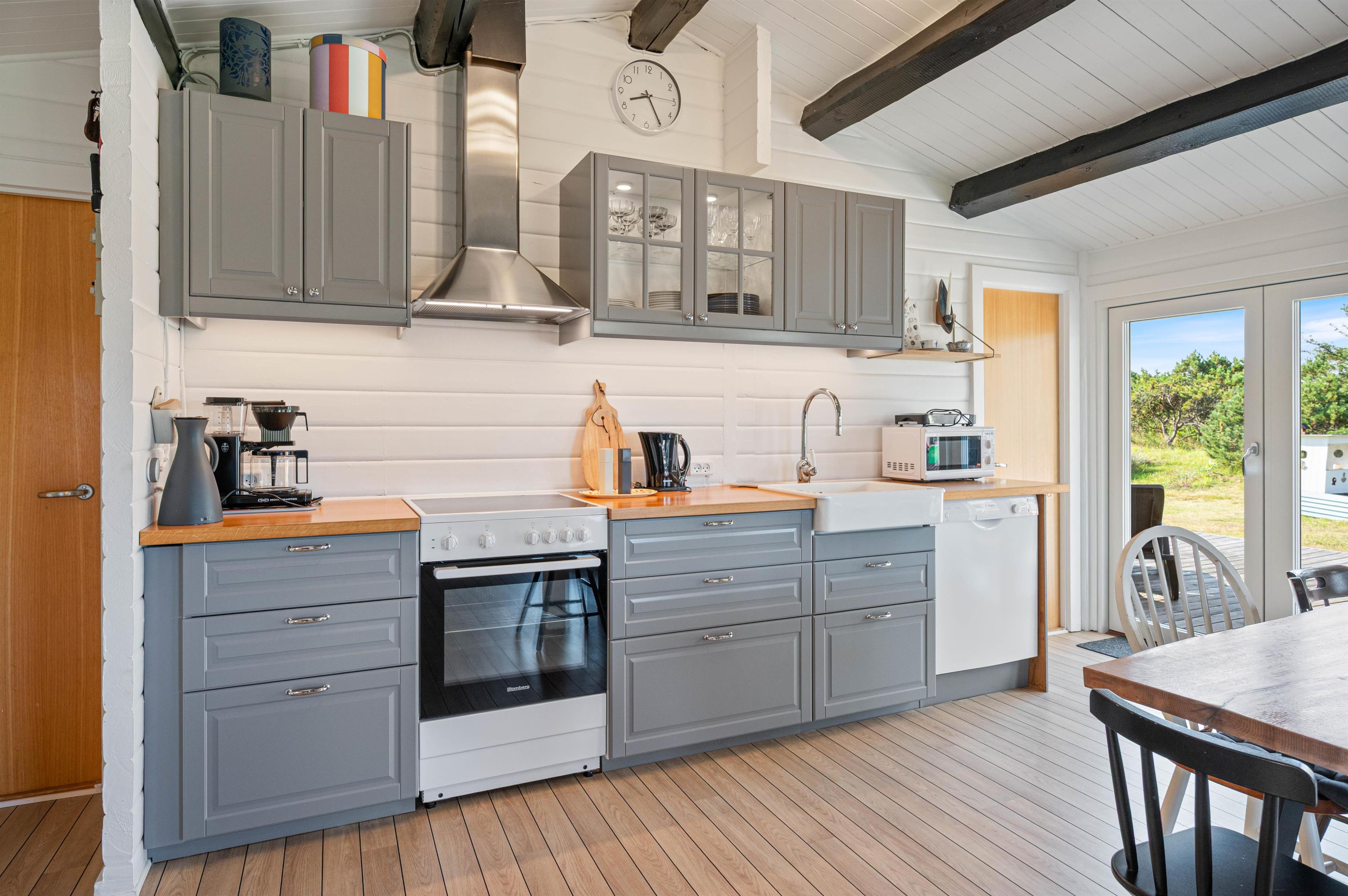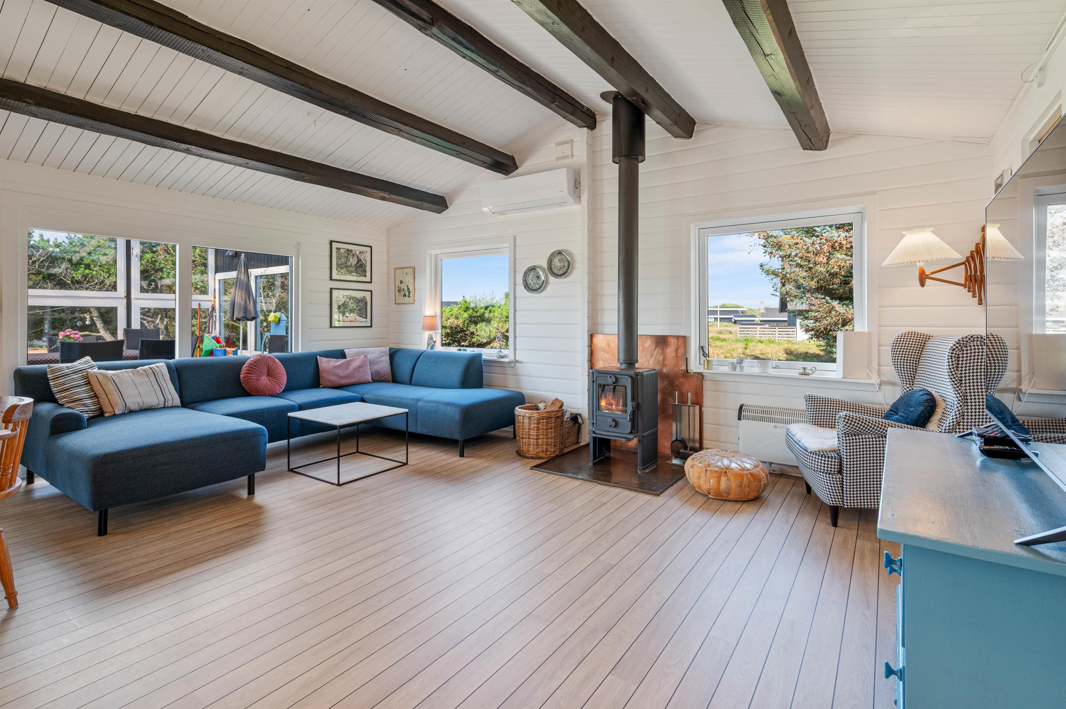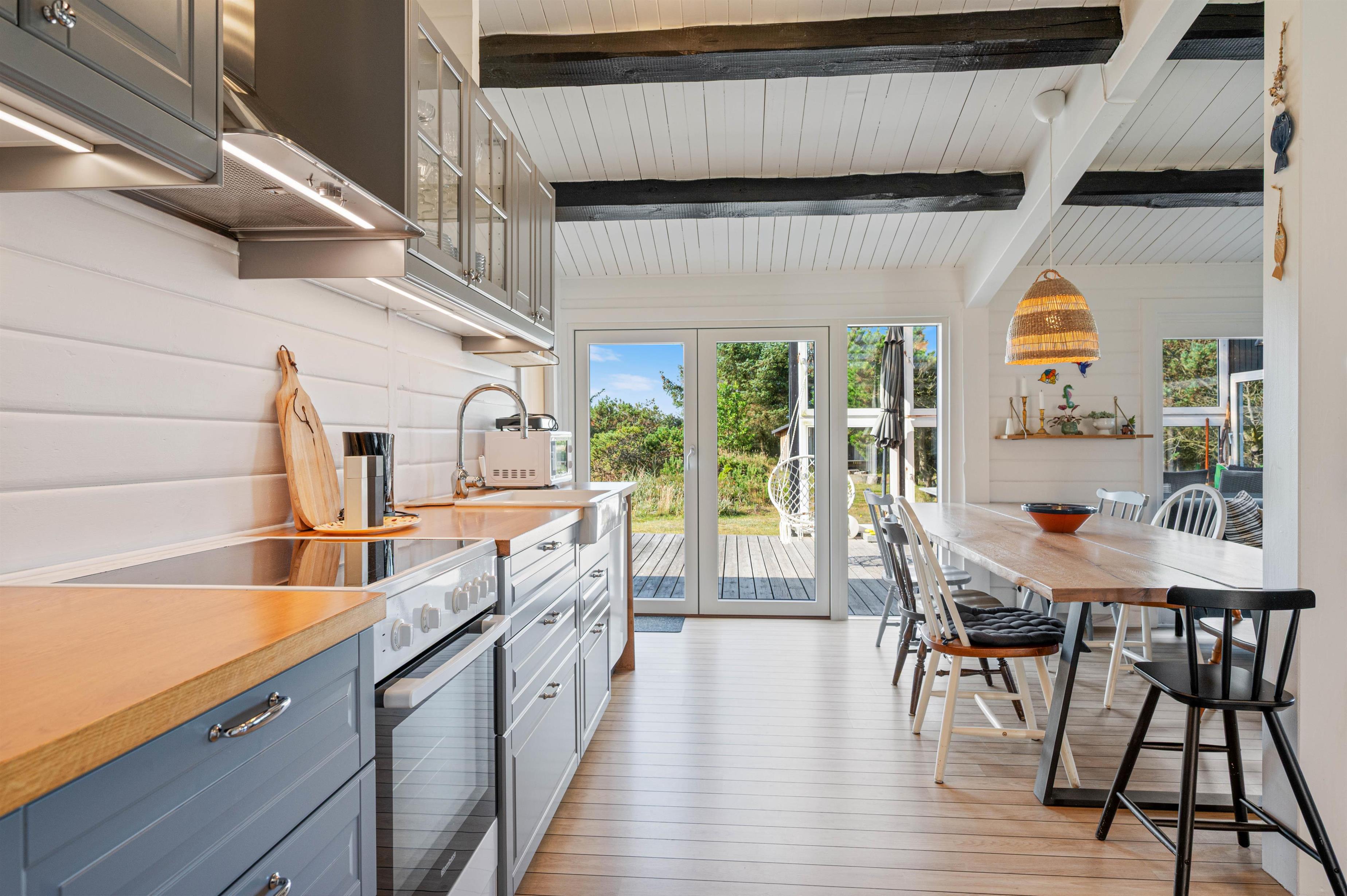 Det store køkkenalrum er husets naturlige midtpunkt. Her er der masser af plads til både aktivitet og afslapning. I stuen er der både fladskærm og DVD-afspiller til rådighed, mens køkkenet blandt andet er godt udstyret med opvaskemaskine, mikroovn og køleskab med 60 liters frysekapacitet.