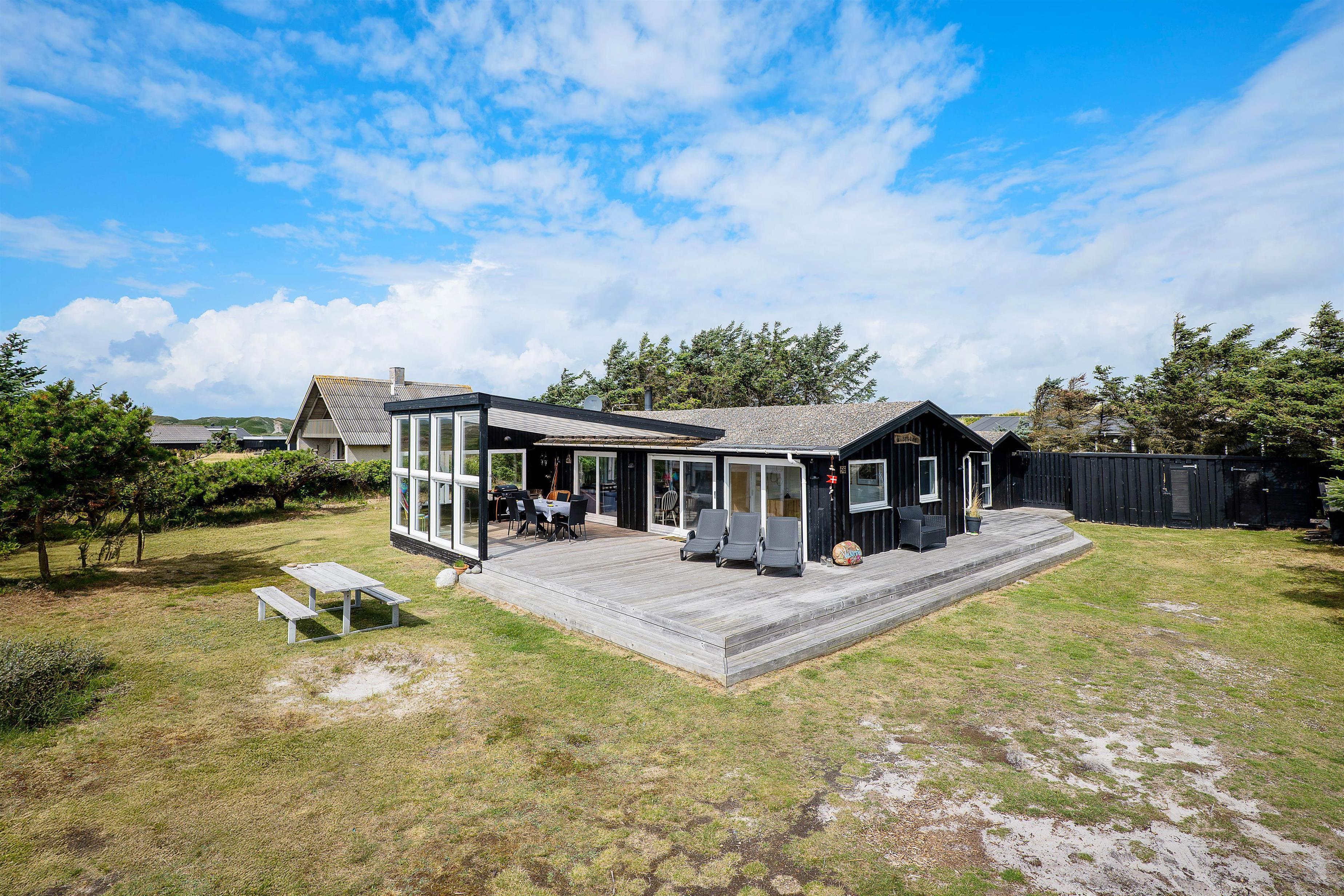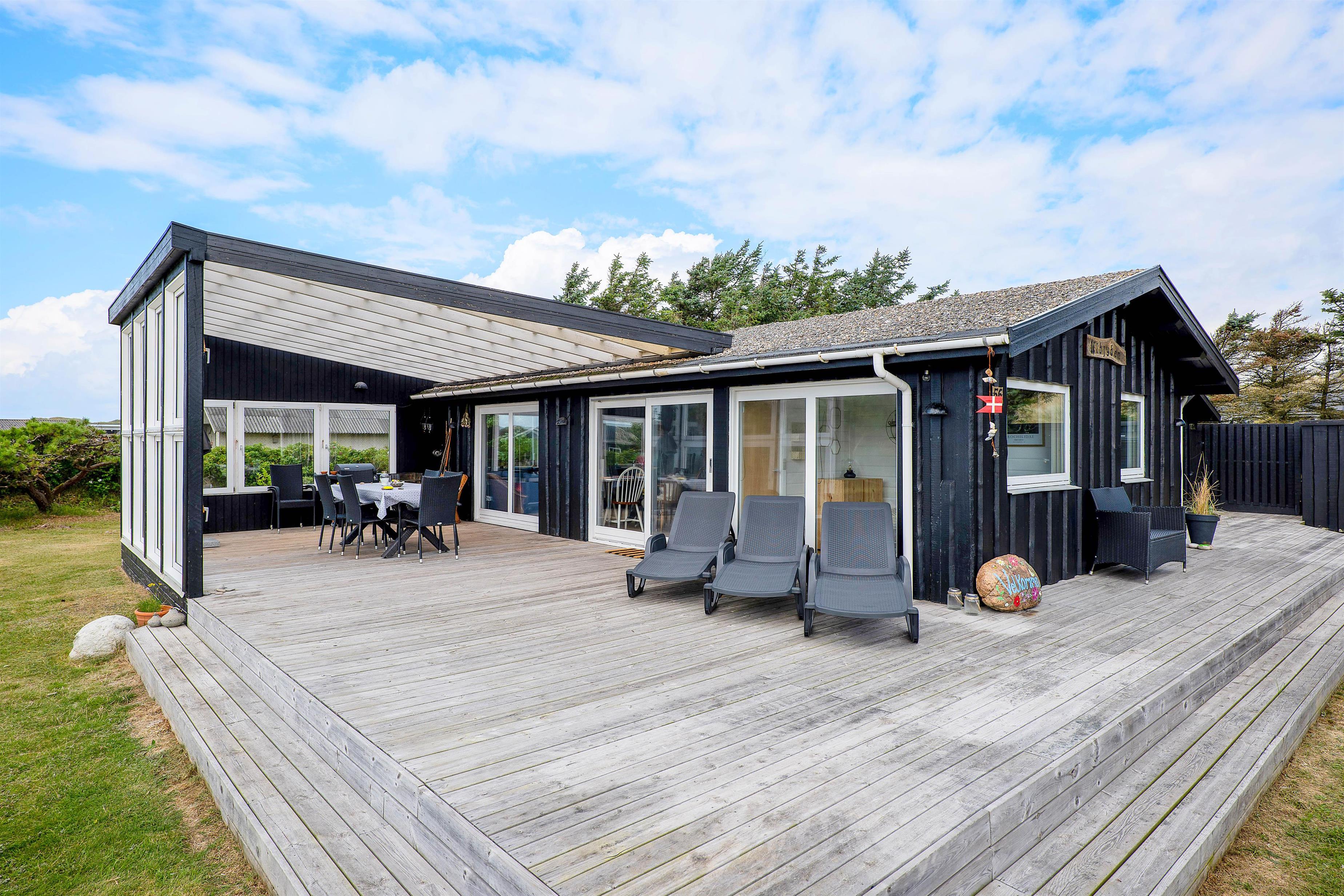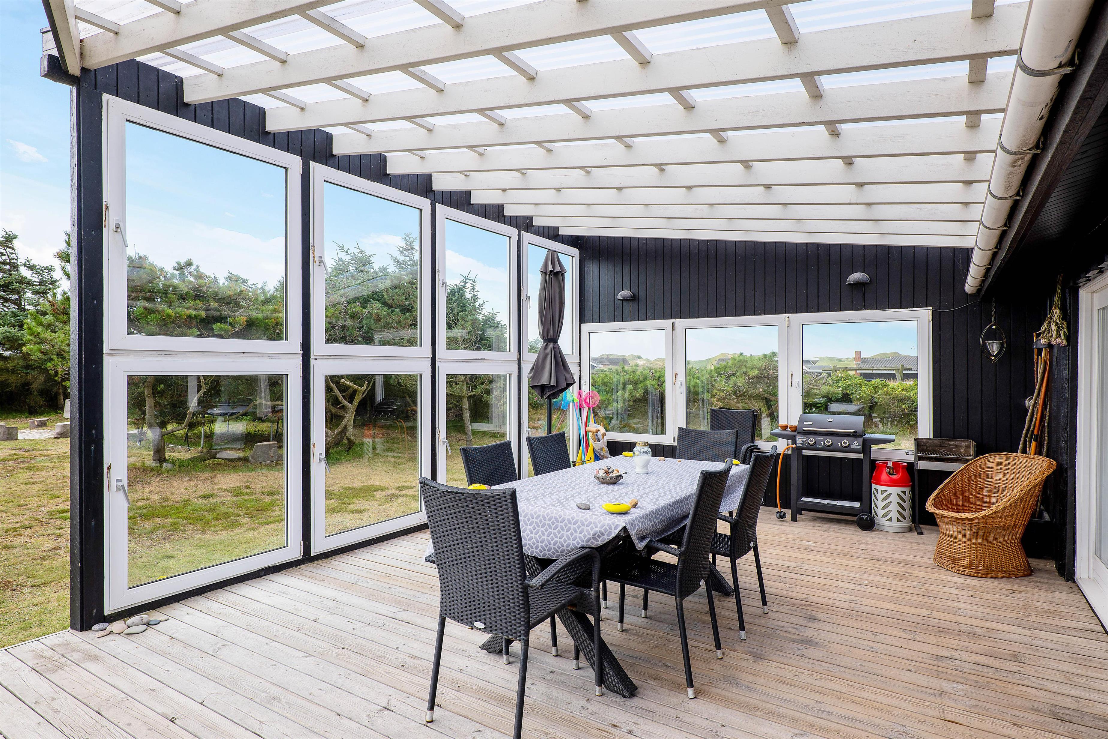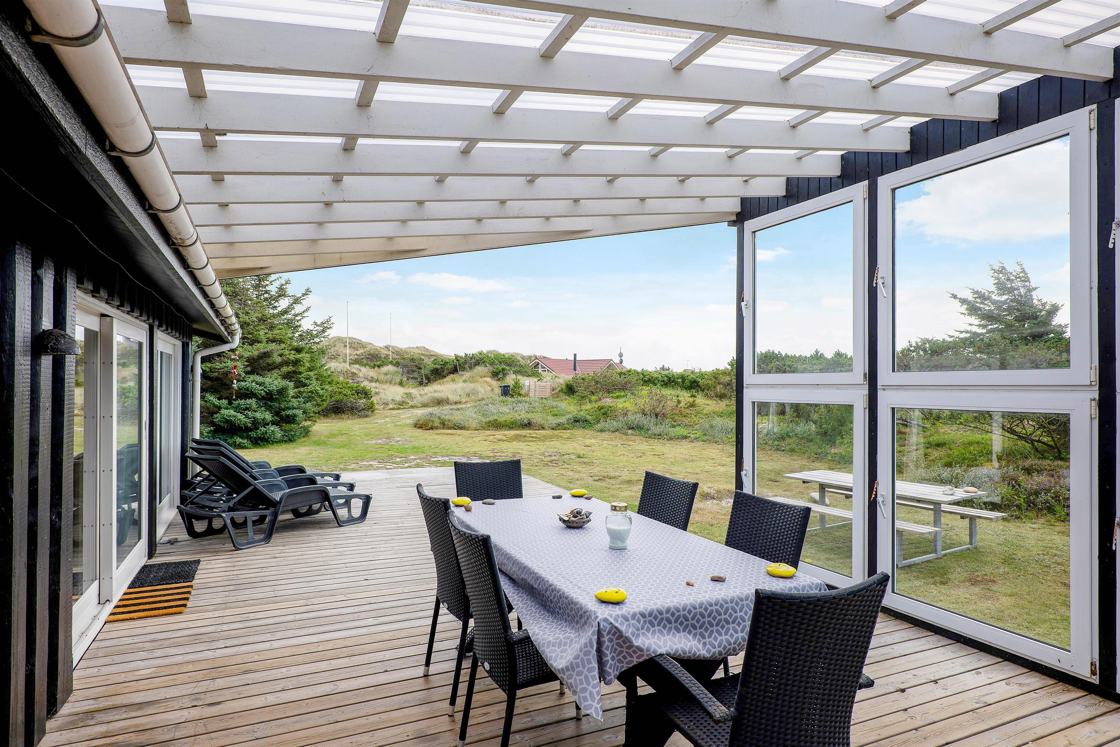 I kan også nyde jeres feriedage på den store terrasse, der bugter sig omkring hele huset. Her findes en masse kroge, I kan slå jer ned i – alt efter det danske vejrs luner. På regnvejrsdage kan I nyde lyden af den trommende regn på taget af den overdækkede del af terrassen, der ligger lige uden for stuen.