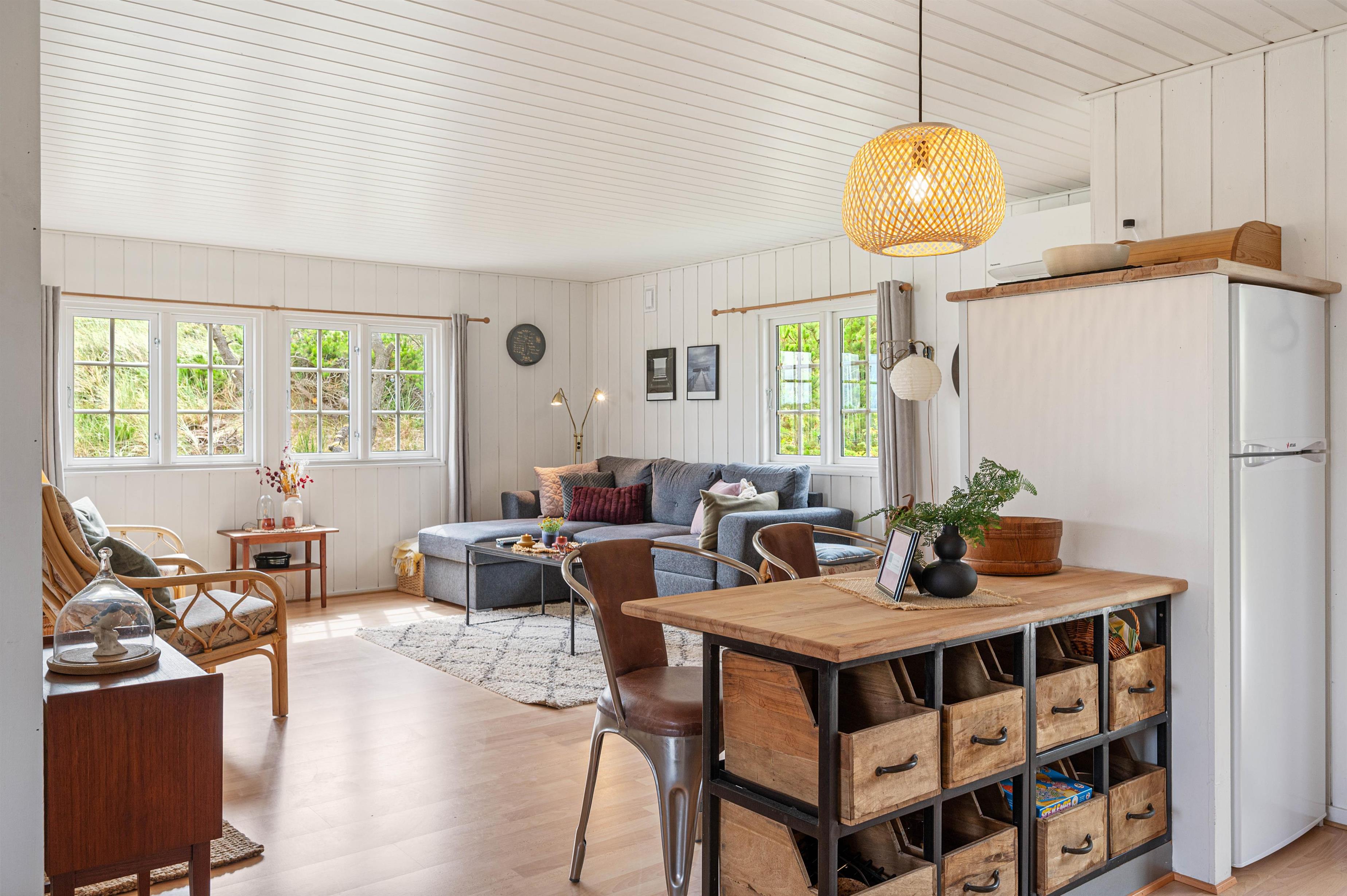 Fra entréen træder I ind i feriehusets hjerte – nemlig stuen, som ligger i åben forbindelse med køkkenalrummet. Her kan alle give en hånd med, når der skal kokkereres og dækkes op til dagens lækre feriemiddag. I stueafdelingen er der lagt i kakkelovnen til masser af kvalitetstid med filmhygge og afslapning på sofaen.