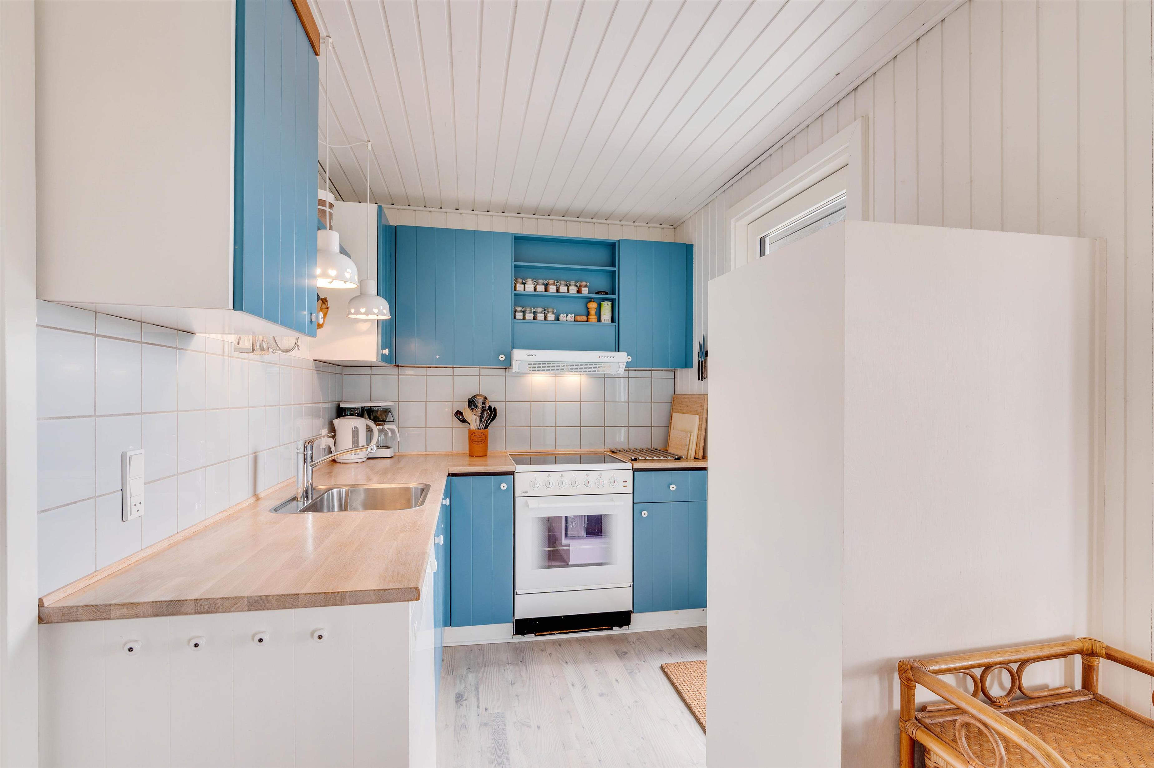 Det lille træsommerhus har en helt speciel ferieatmosfære over sig. Huset er indrettet med kærlighed, og indretningen bærer stort præg af den klassiske og charmerende sommerhusstil med lyse, afdæmpede farver og søde, personlige detaljer. Alle møblerne er nøje valgt, og den røde trød går igen i samtlige rum. Alle de hvidmalede facader giver rummene en dejlig fornemmelse, mens der sammentidig er skabt et fedt farvemodspil med de pæne blå skabsfronter i køkkenet og værelset, der er med til at give huset det personlige præg.