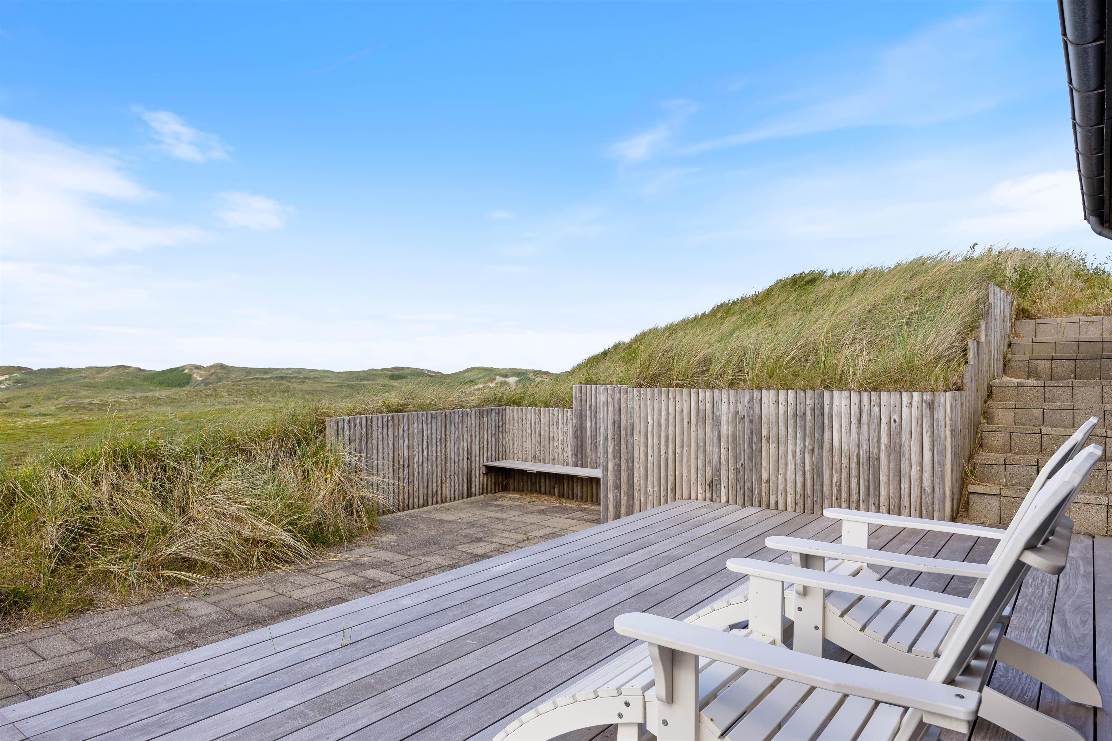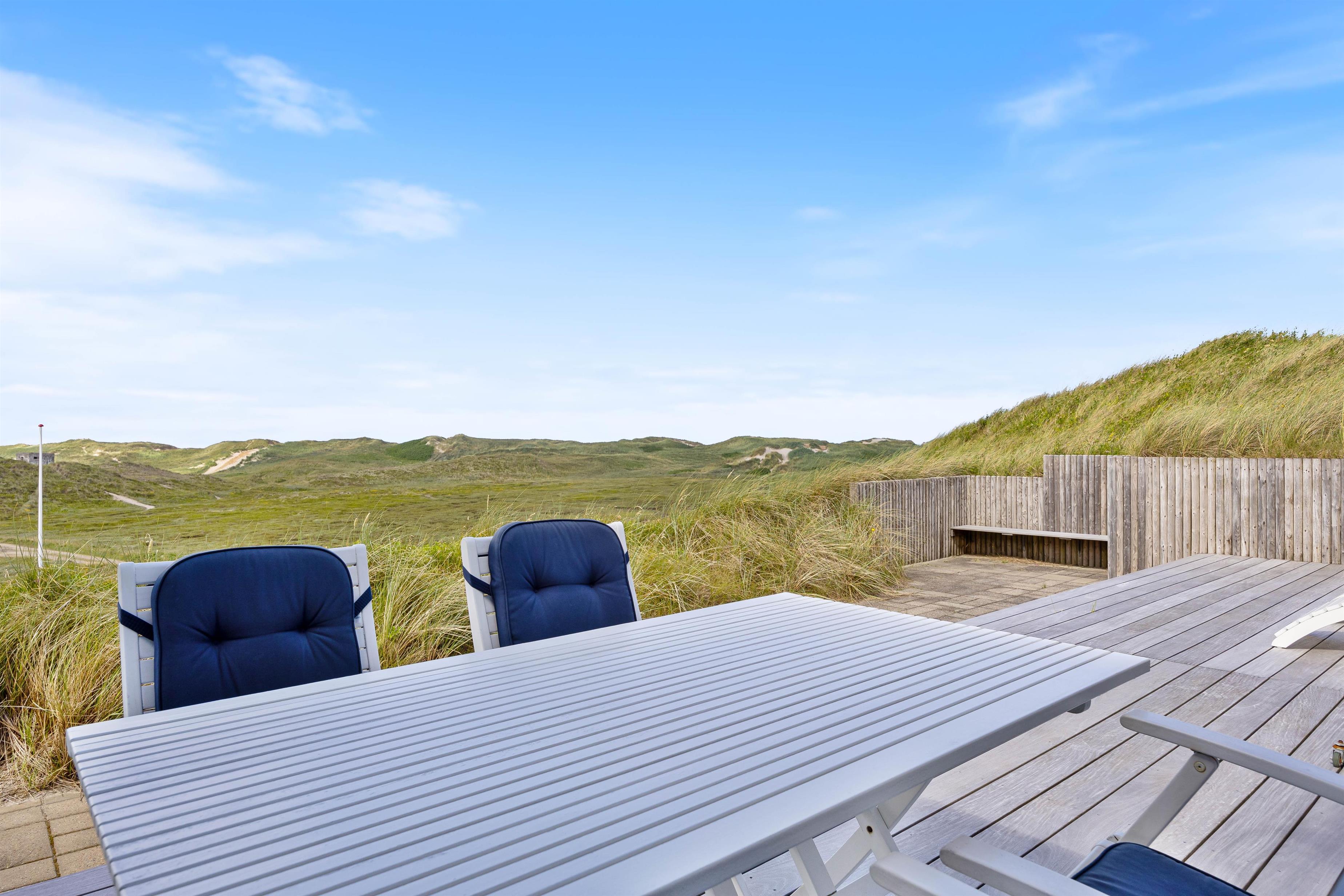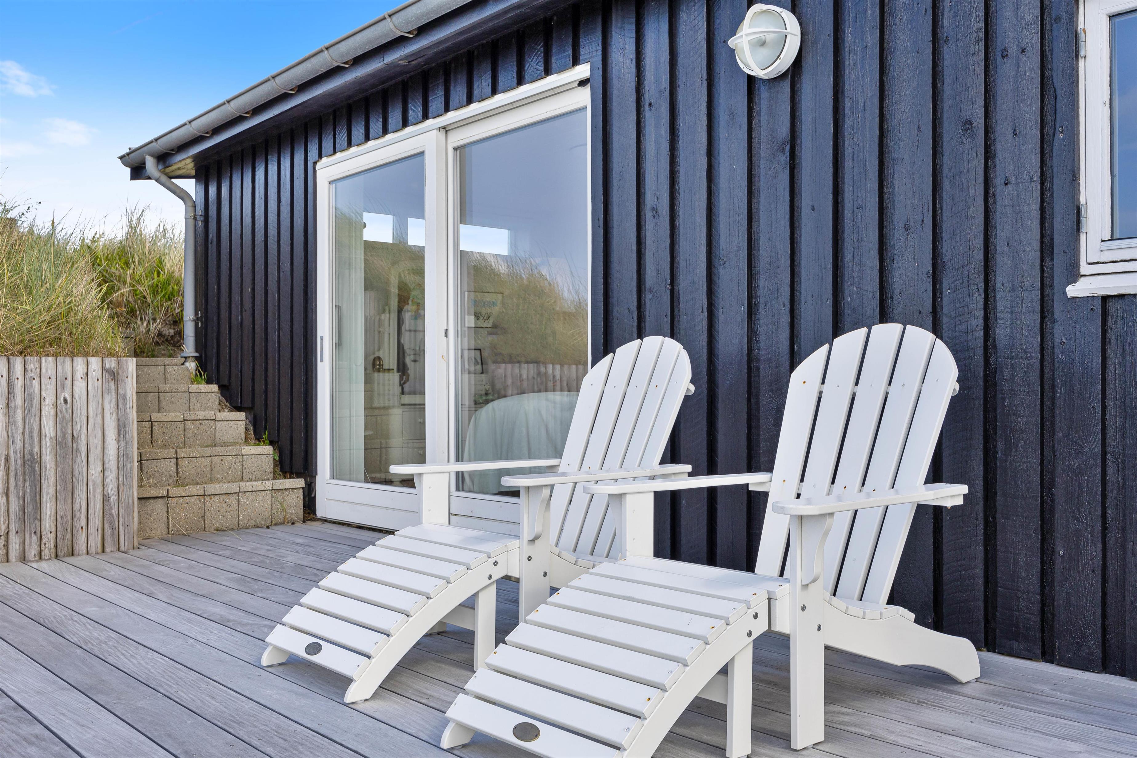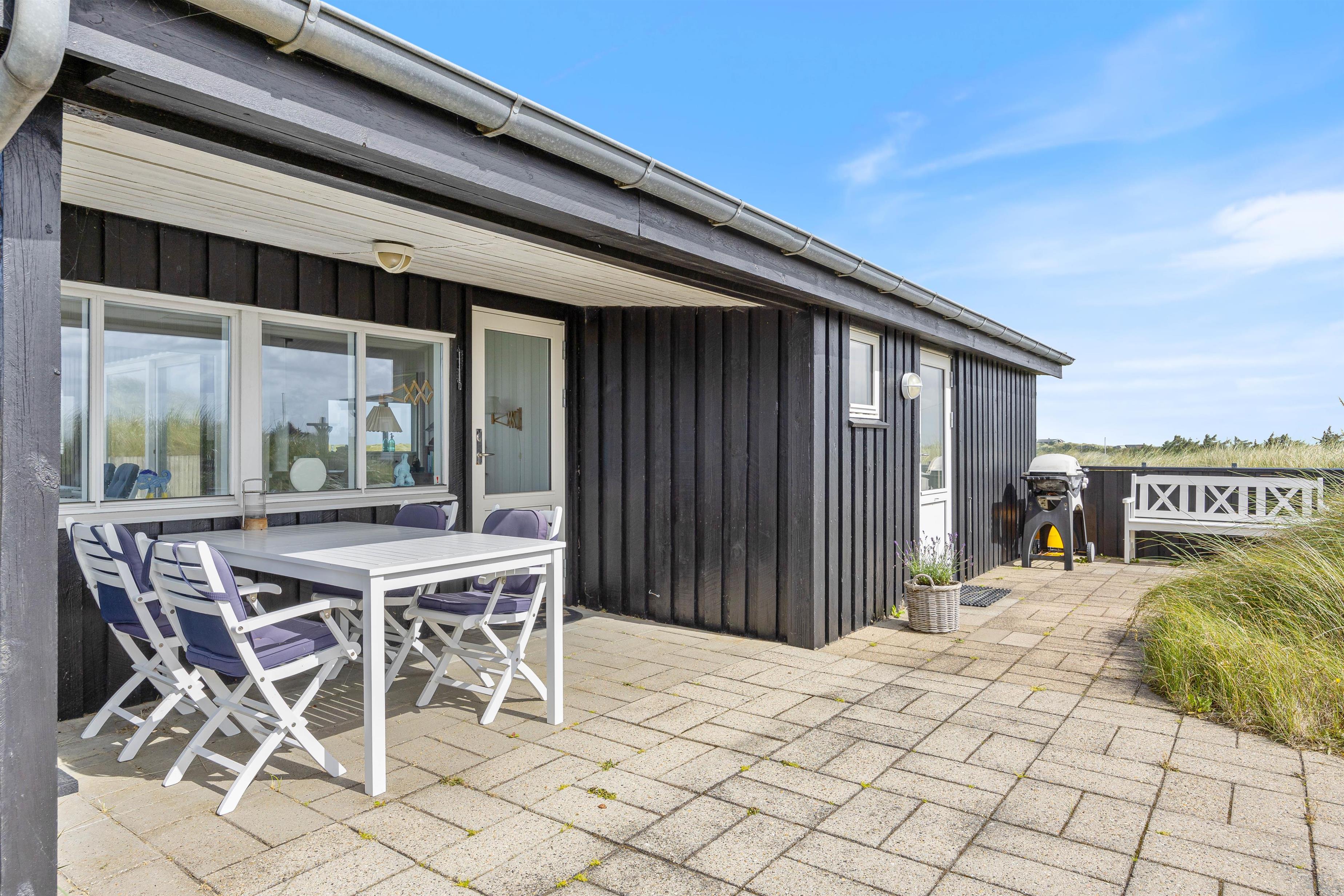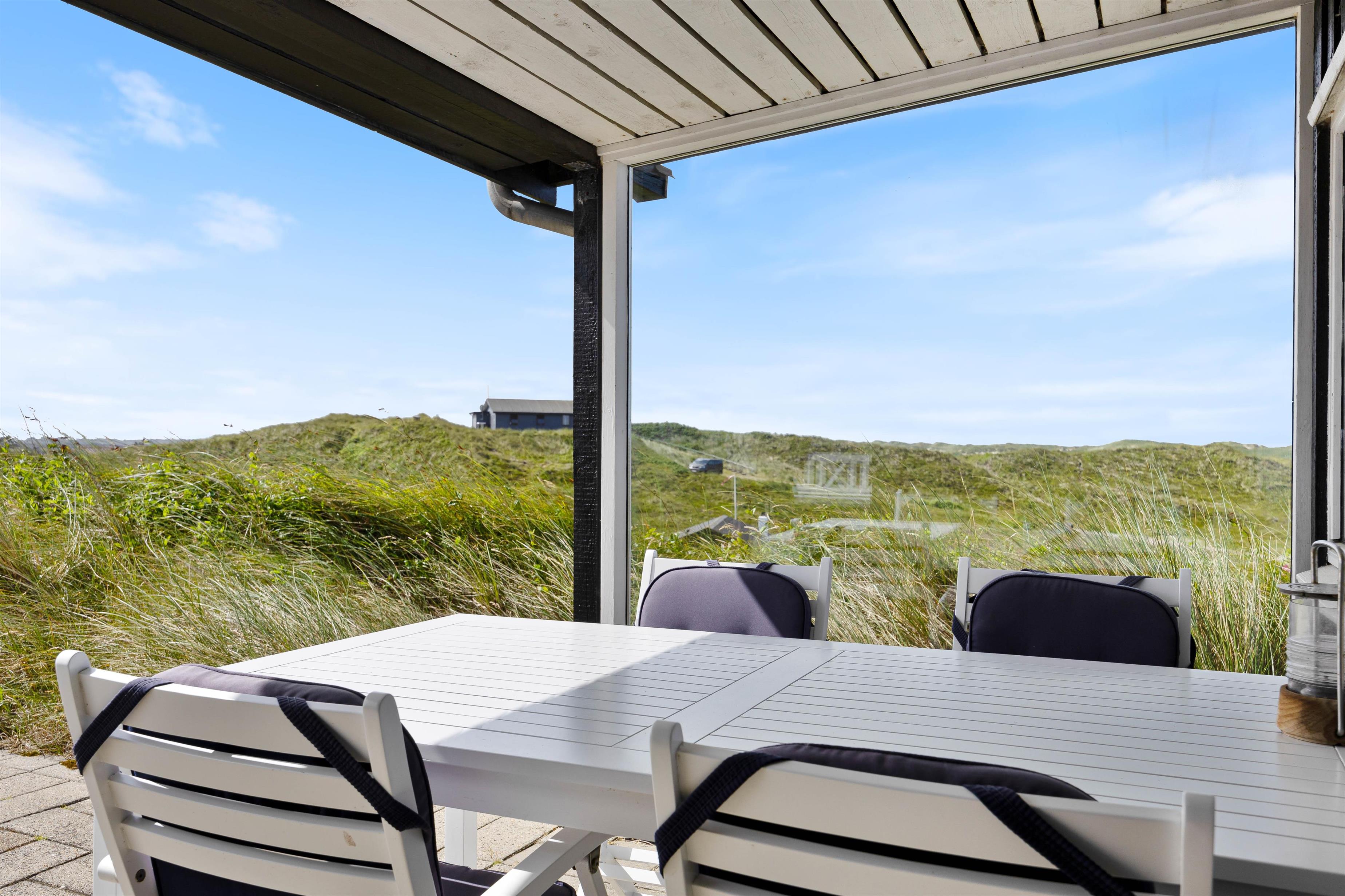 Sommerhuset kan prale af en skøn overdækket terrasse, hvor I kan sidde og slappe af uanset vejret. Beliggende på en klitgrund, tilbyder terrassen ro og privatliv i naturlige omgivelser. Blot 280 meter væk finder I det brusende Vesterhav, som indbyder til lange gåture og sjove stranddage. Hvem ville ikke sidde og nyde en god aften eller morgen, med lyden af det fantastiske Vesterhav i baggrunden?