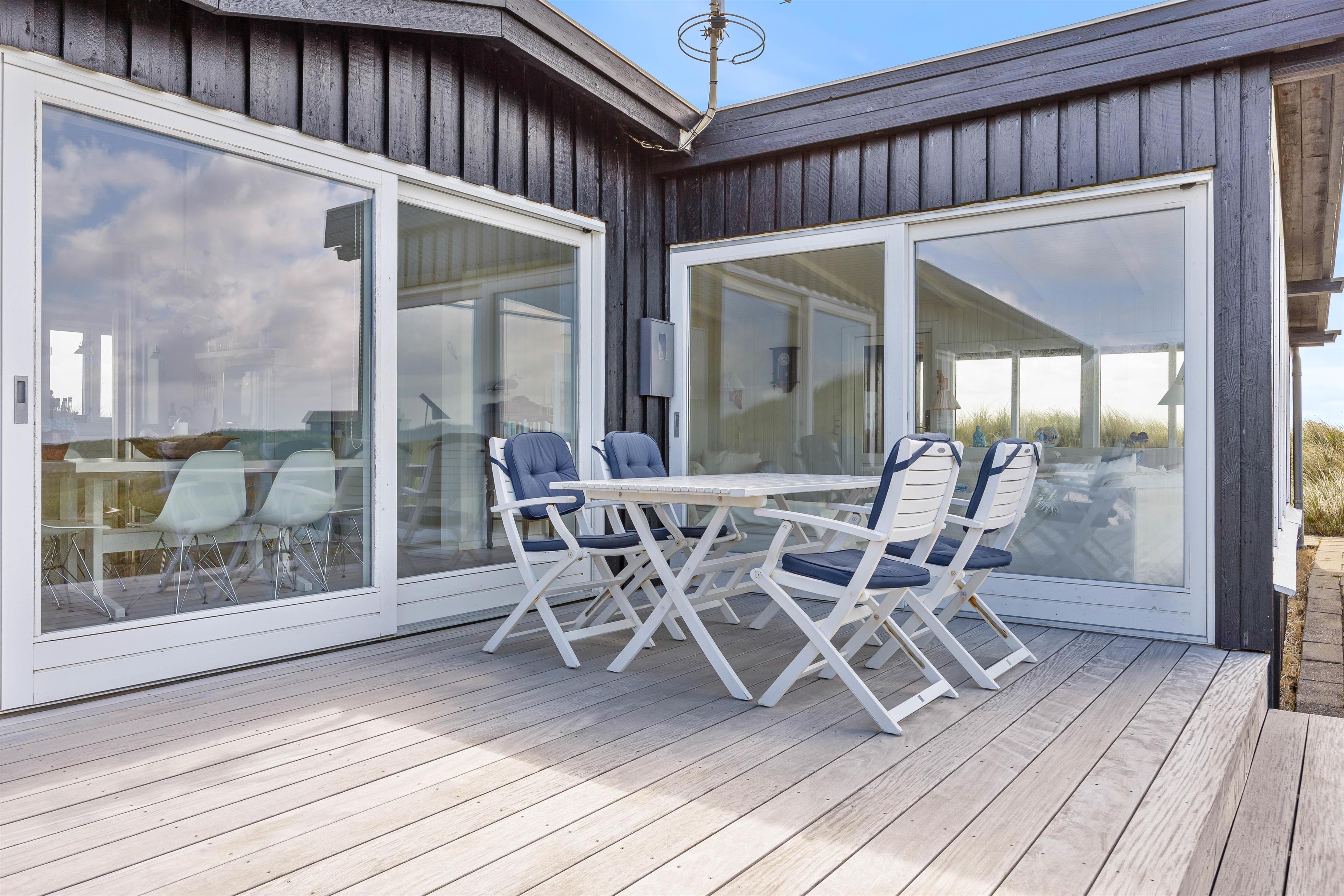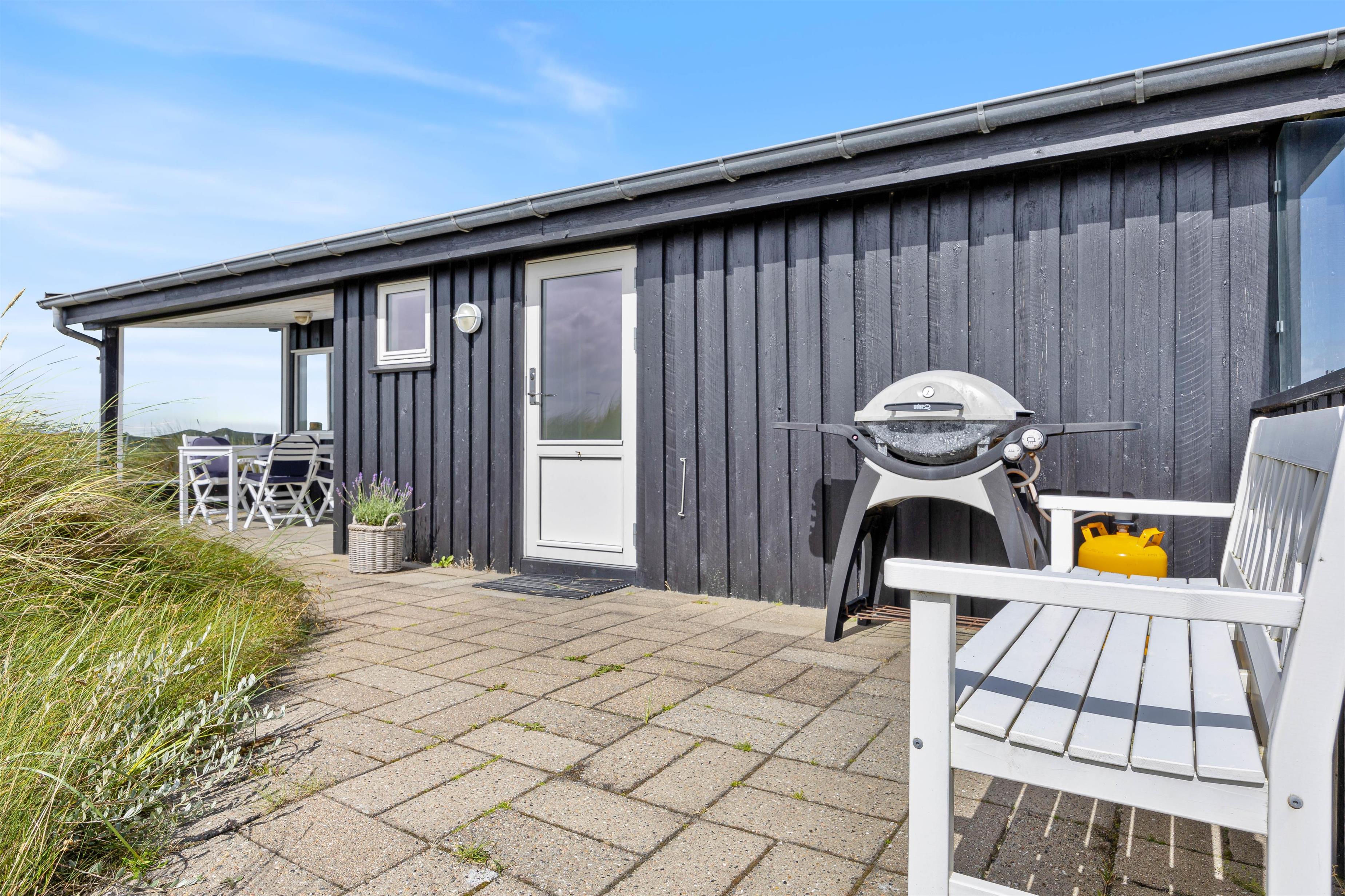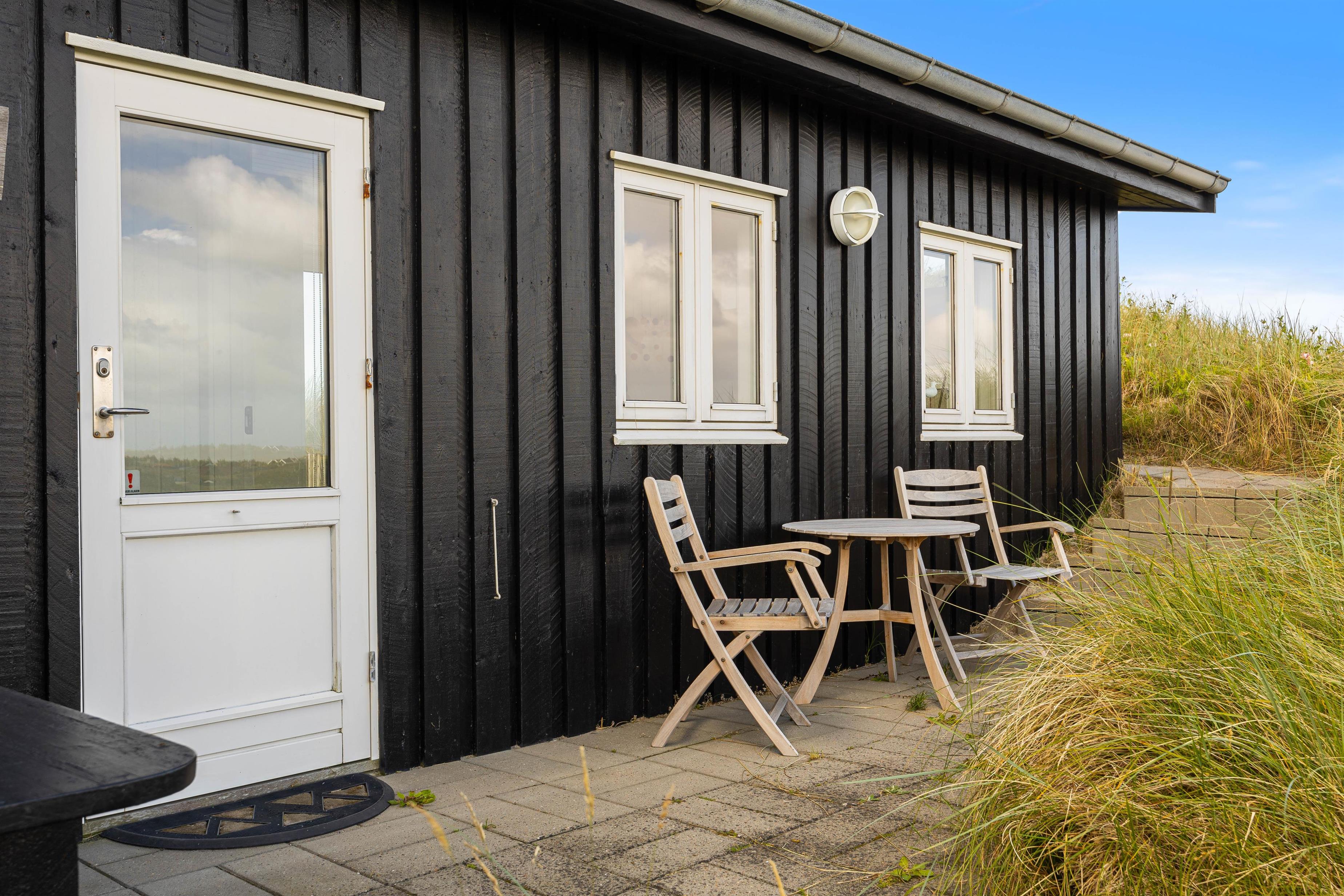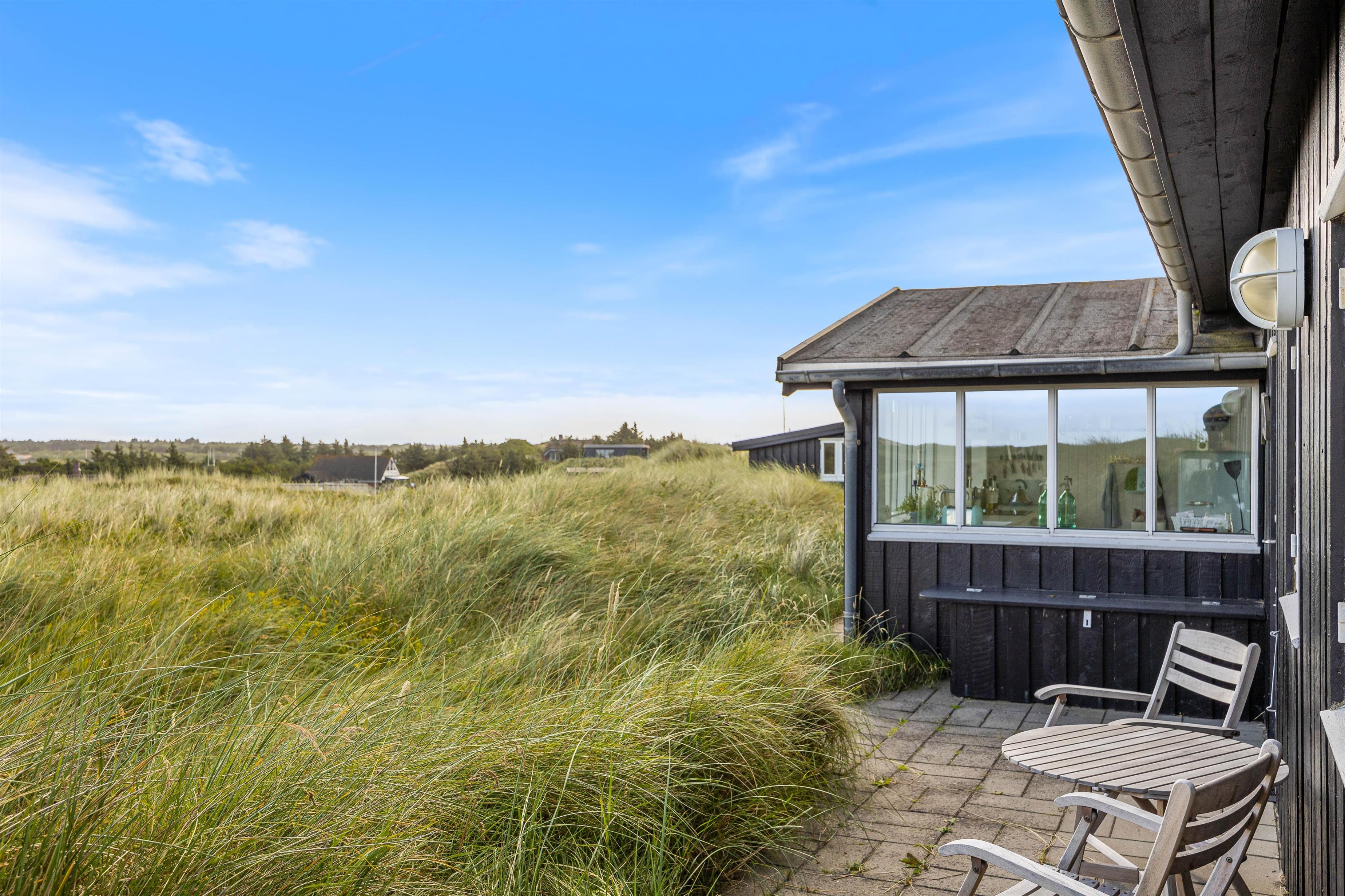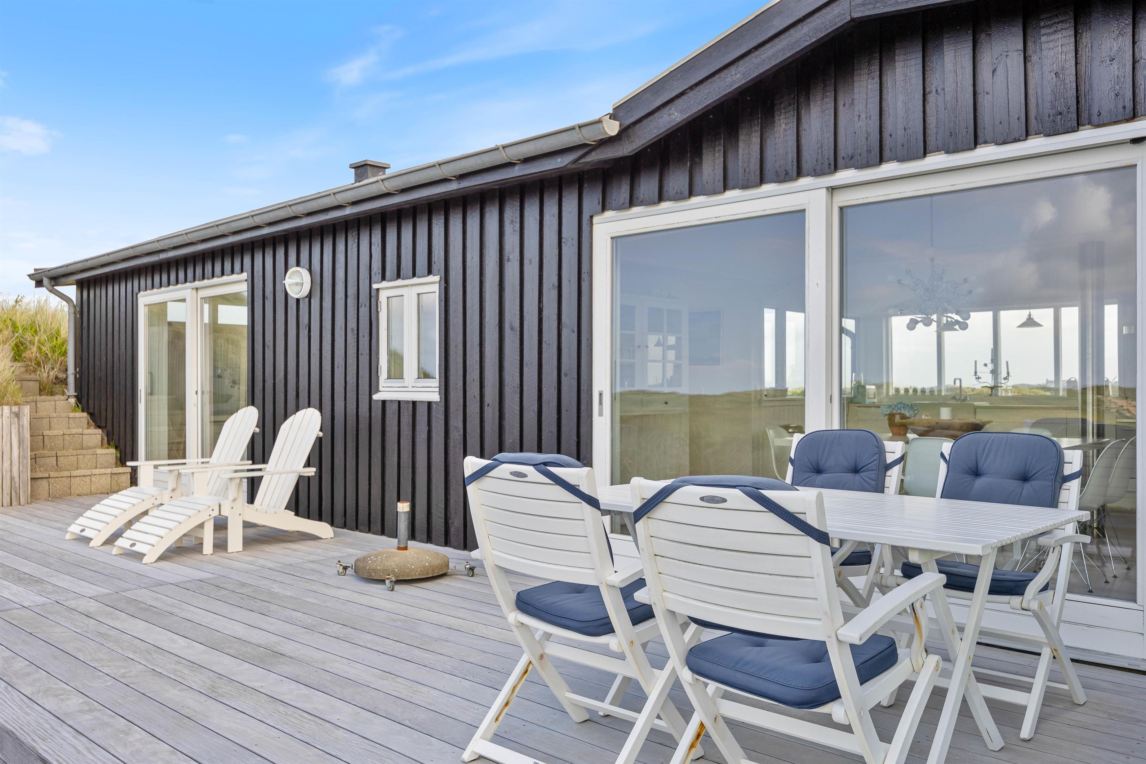 Sommerhuset kan prale af en skøn overdækket terrasse, hvor I kan sidde og slappe af uanset vejret. Beliggende på en klitgrund, tilbyder terrassen ro og privatliv i naturlige omgivelser. Blot 280 meter væk finder I det brusende Vesterhav, som indbyder til lange gåture og sjove stranddage. Hvem ville ikke sidde og nyde en god aften eller morgen, med lyden af det fantastiske Vesterhav i baggrunden?