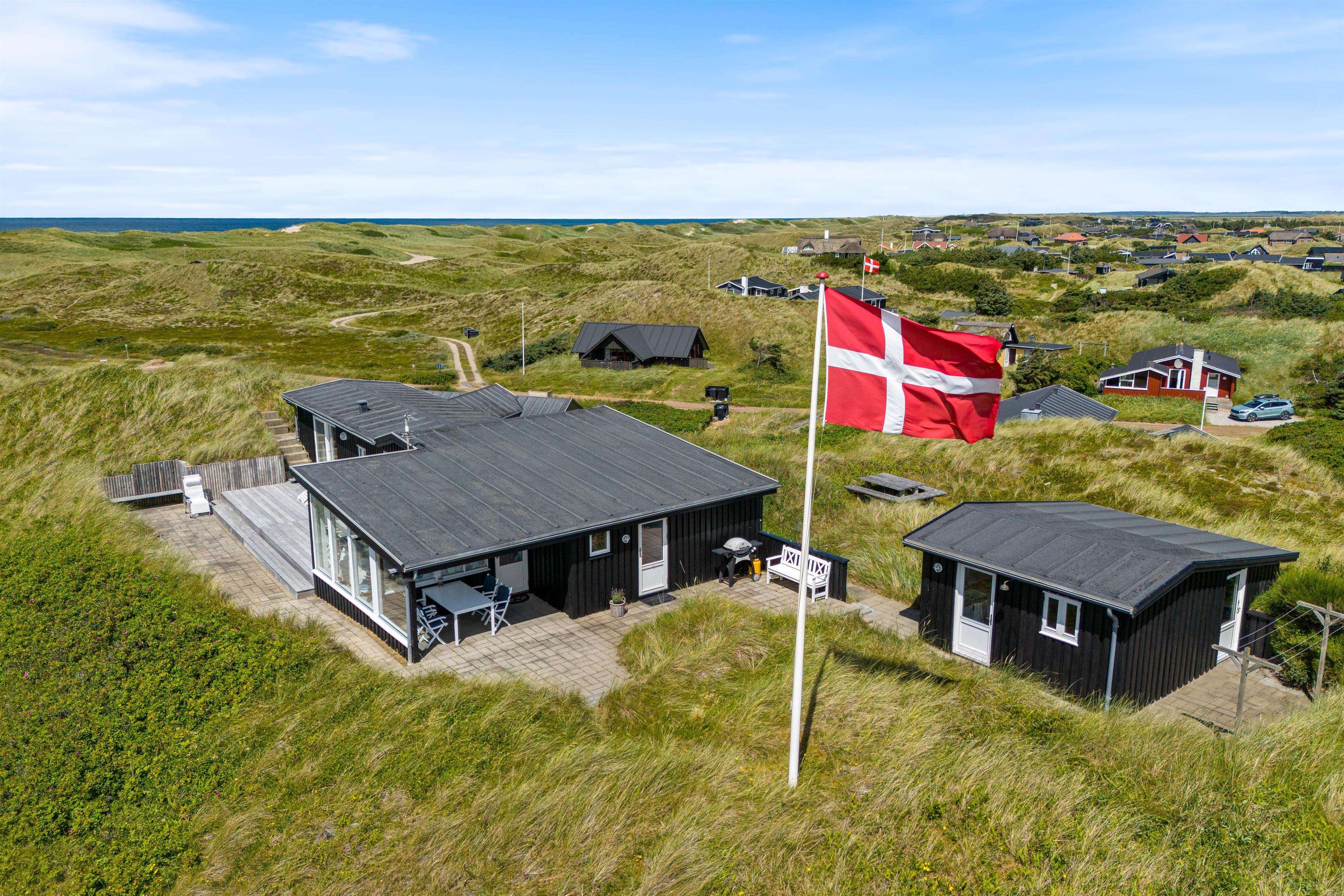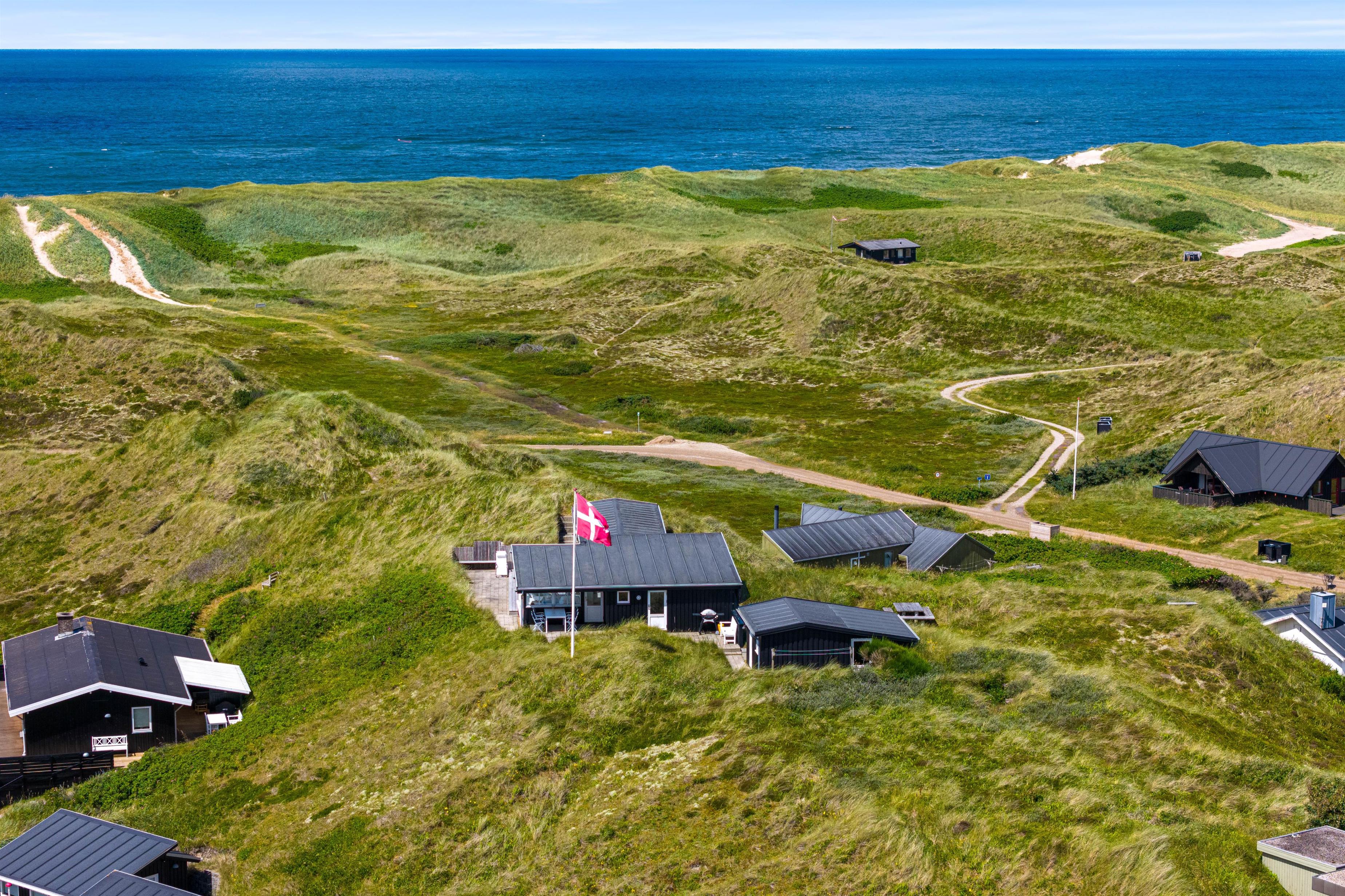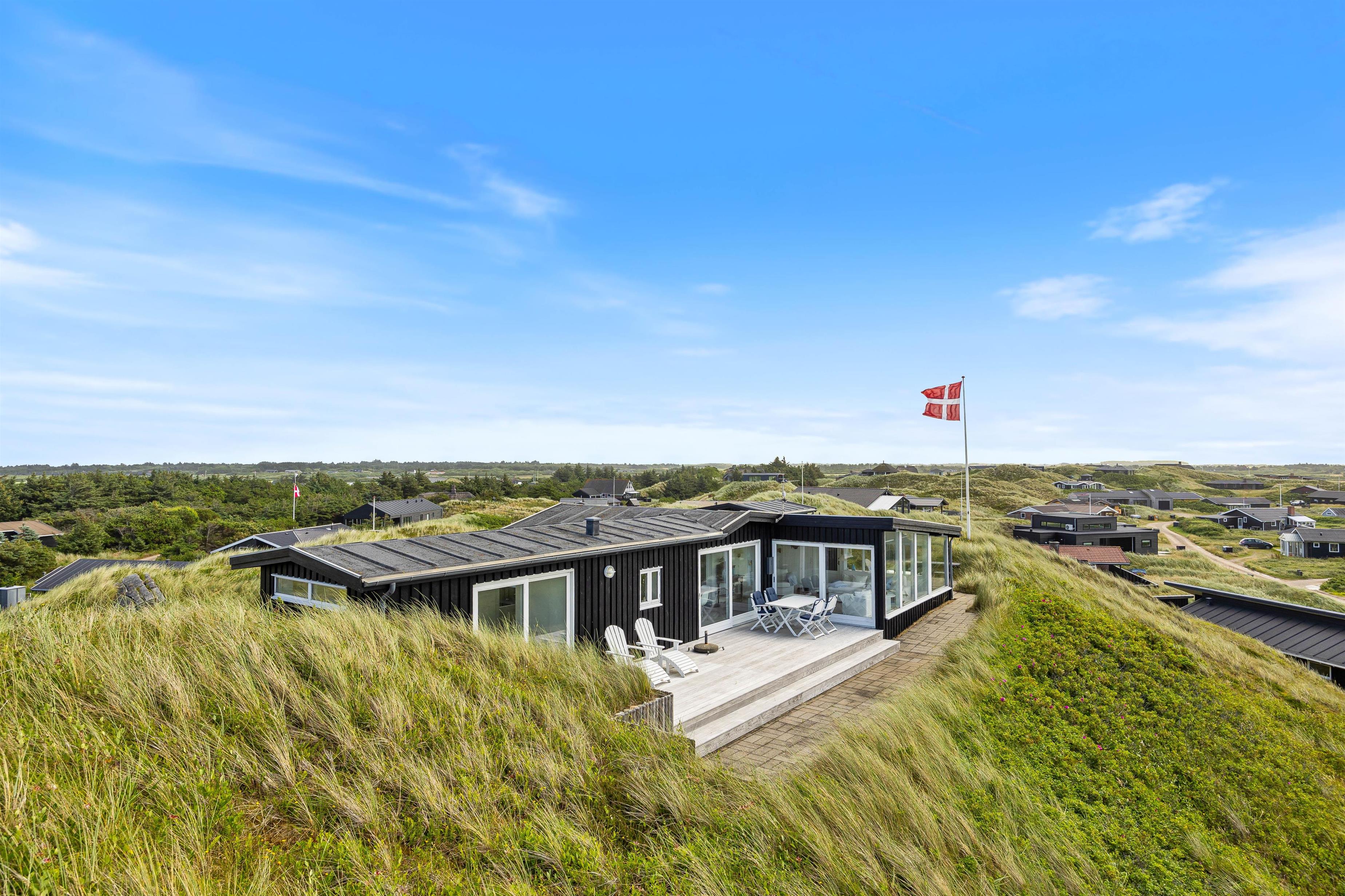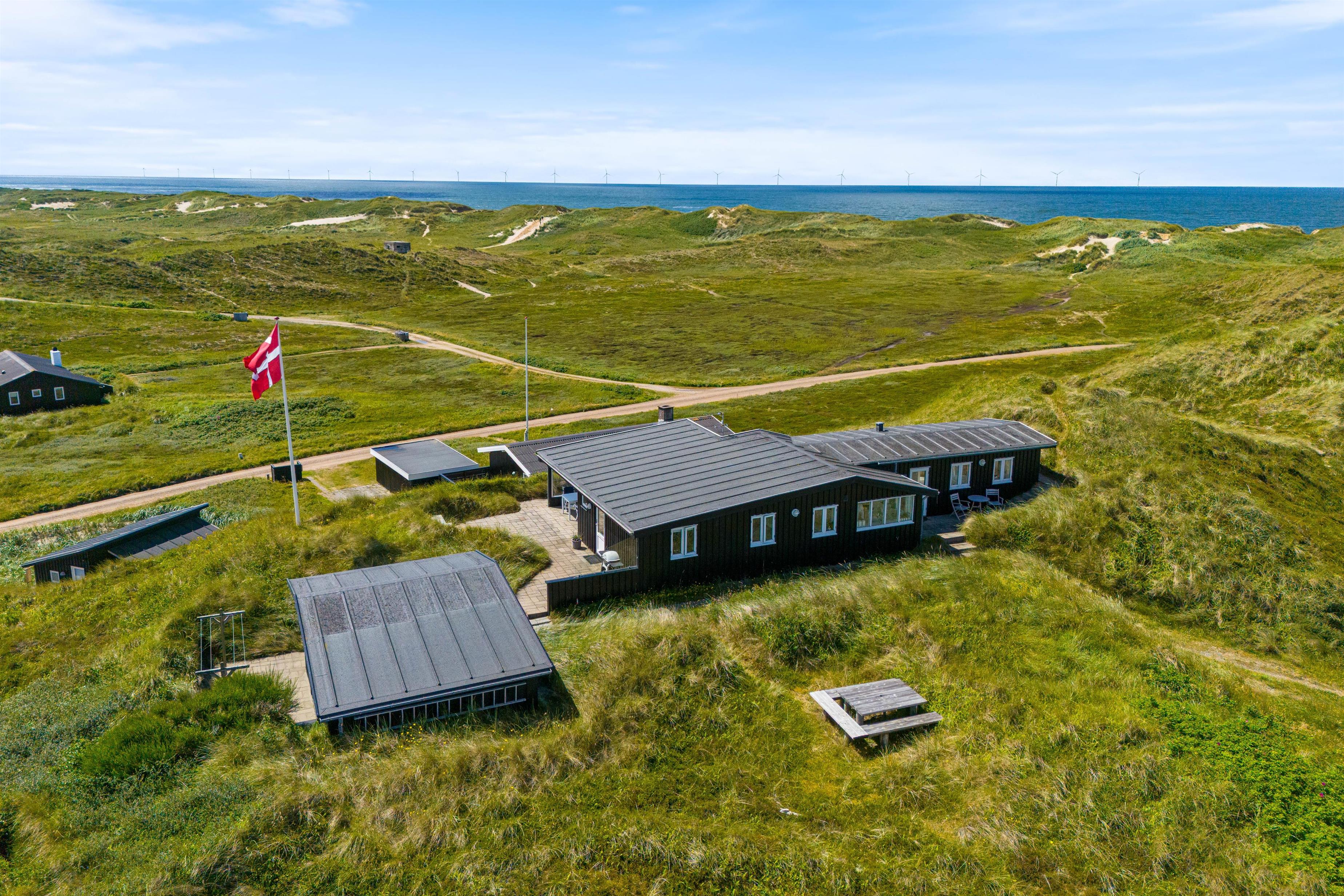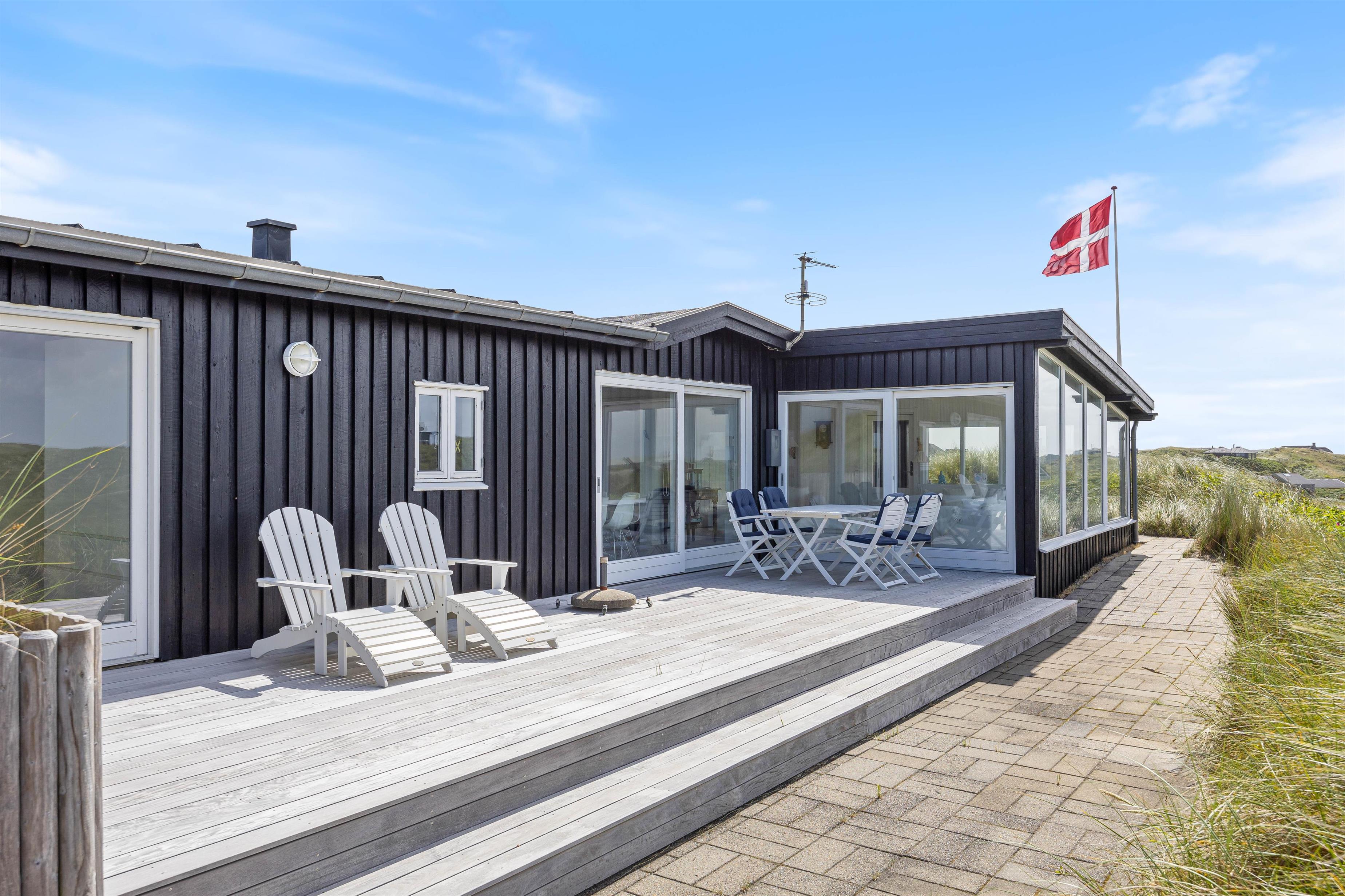 Sommerhuset kan prale af en skøn overdækket terrasse, hvor I kan sidde og slappe af uanset vejret. Beliggende på en klitgrund, tilbyder terrassen ro og privatliv i naturlige omgivelser. Blot 280 meter væk finder I det brusende Vesterhav, som indbyder til lange gåture og sjove stranddage. Hvem ville ikke sidde og nyde en god aften eller morgen, med lyden af det fantastiske Vesterhav i baggrunden?