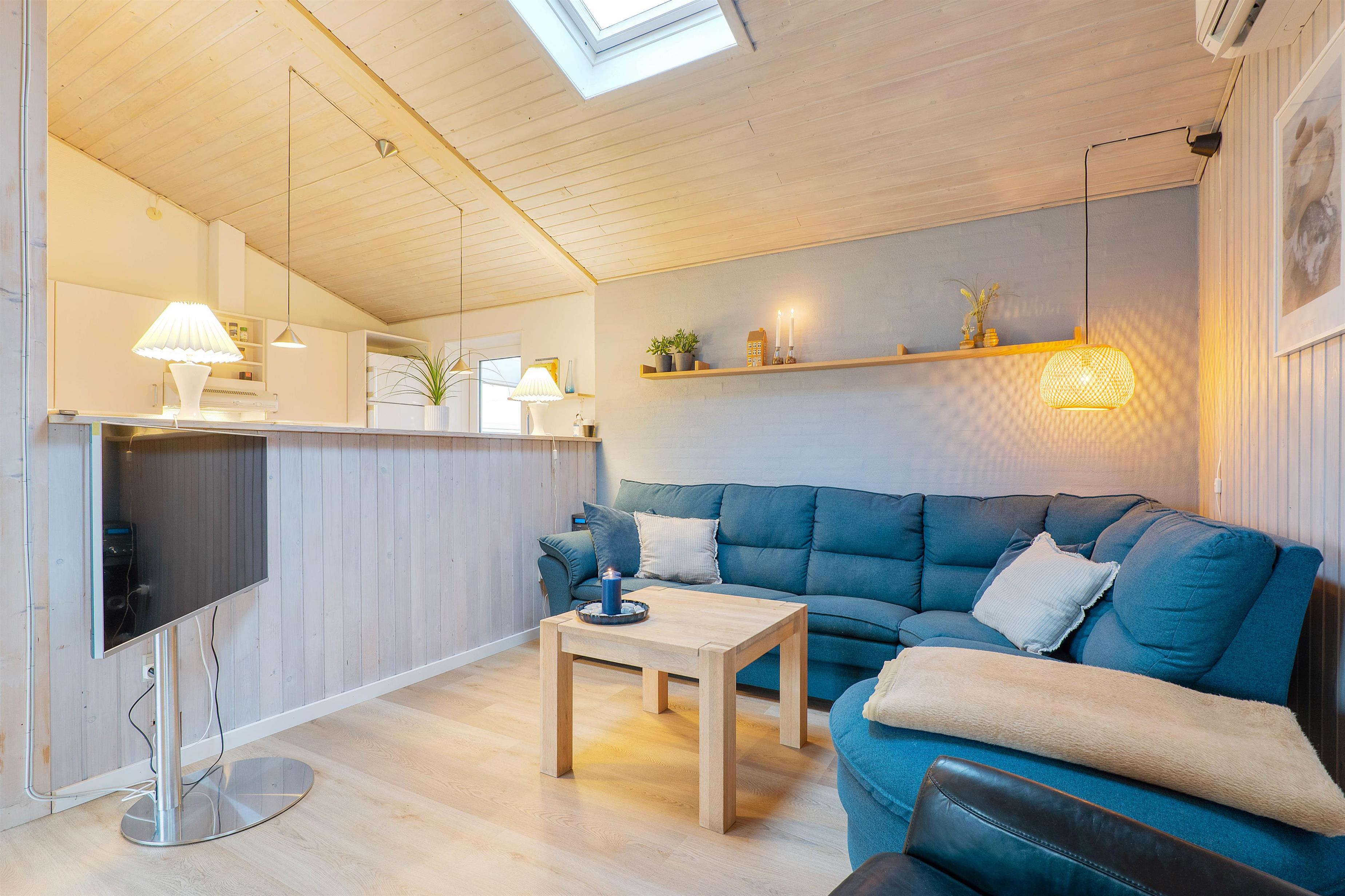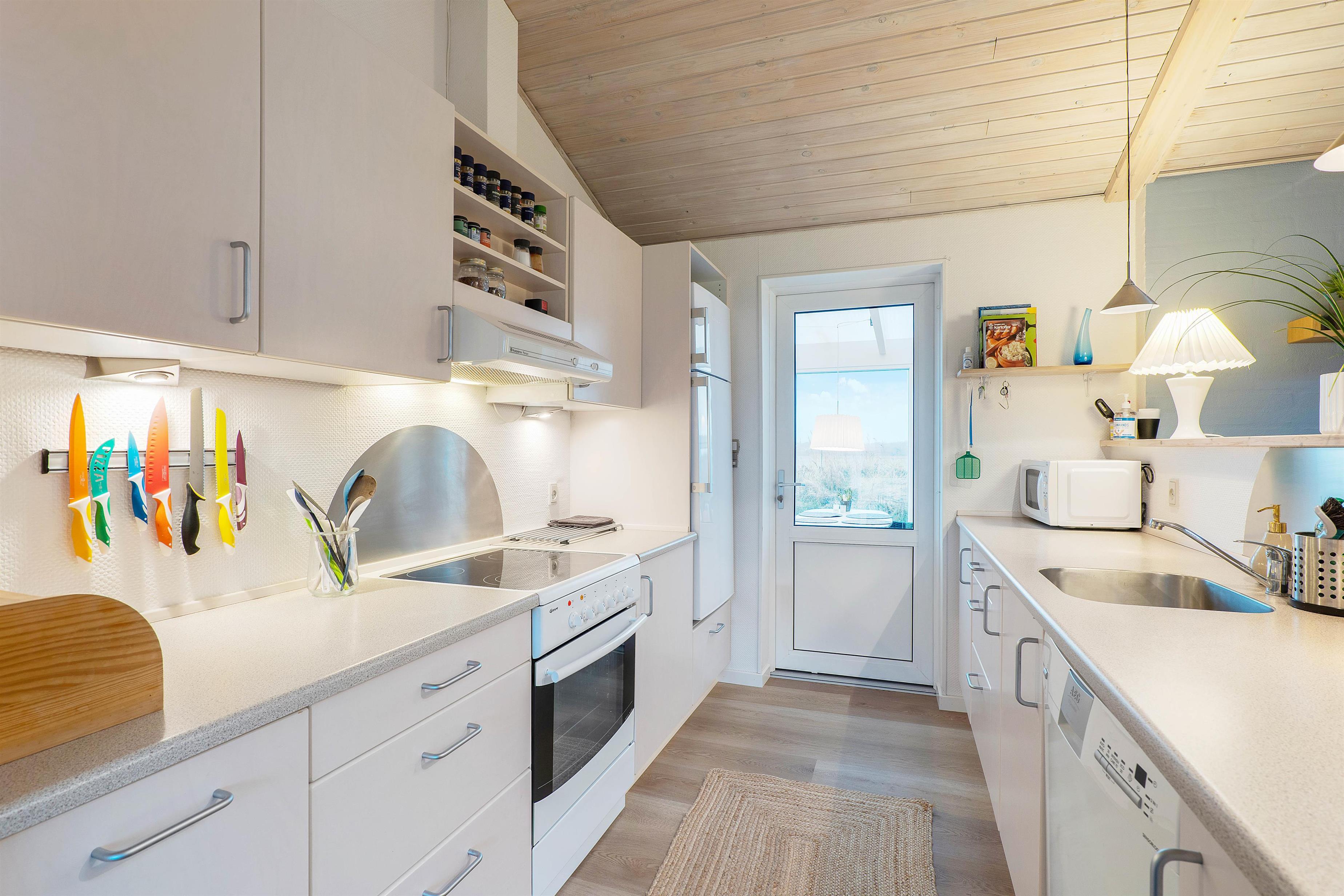 Stuen ligger i åben forbindelse med køkkenet, der fremstår nydeligt og stilrent. Køkkenet er veludstyret med blandt andet mikroovn, opvaskemaskine og køleskab med 50 liters fryser. I kan derfor med ro i sindet handle stort ind, mens I opholder jer i sommerhuset.
