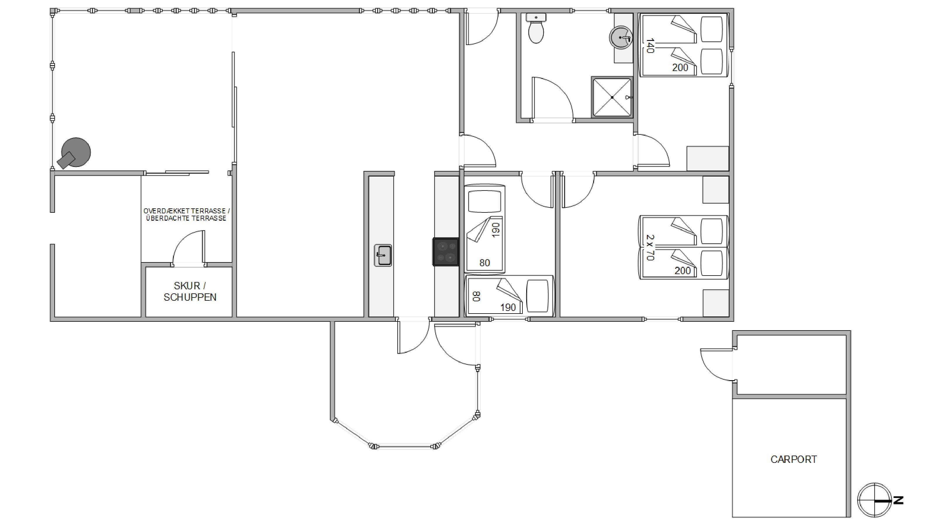 Med hele 3 værelser er der plads til alle familiens medlemmer på adressen i Houvig. I finder i alt 3 dejlige værelser i feriehuset, hvoraf 1 er indrettet med dobbeltseng. De resterende 2 værelser har henholdsvis 2 enkeltsengkøjeseng med 2 pladser. Derudover er sommerhuset udstyret med et fint og funktionelt badeværelse med bruseniche og flisegulv.