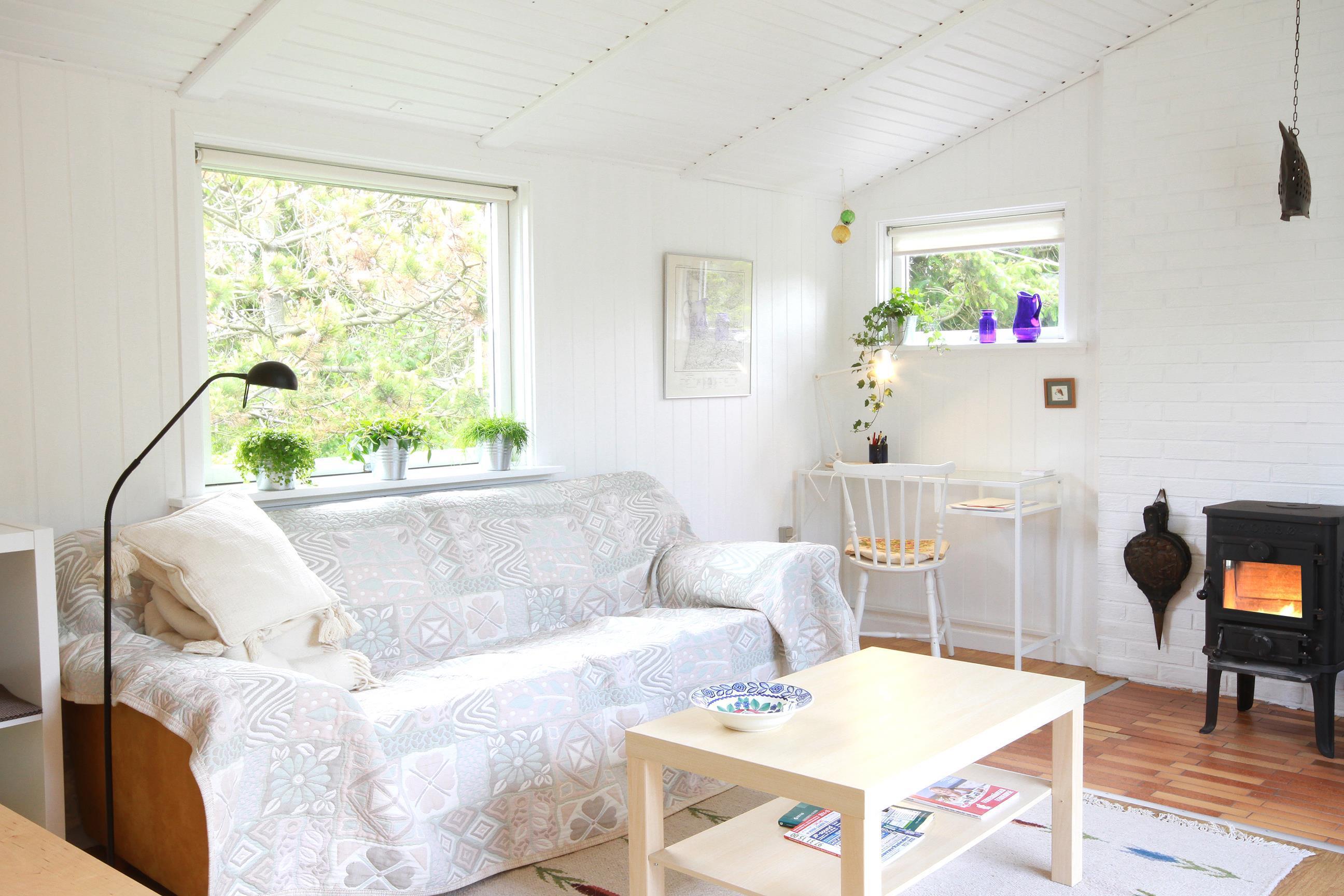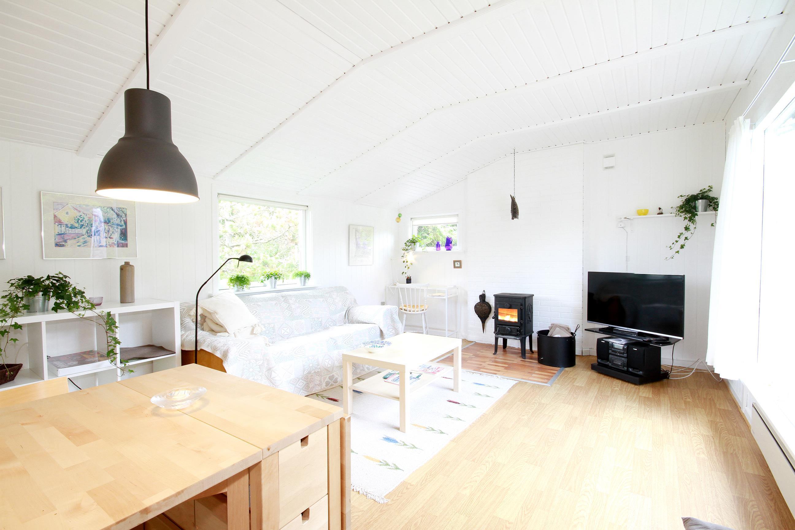 Når I træder ind i sommerhuset, vil I mærke det med det samme. Den idylliske sommerhusstemning, der springer en i øjnene, så snart man ser de panelbeklædte vægge, farverige tekstiler, lune brændeovn og loftet til kip. Feriehuset er ikke stort, men pladsen er praktisk udnyttet, så hver en krog og deltalje bliver optimalt anvendt.