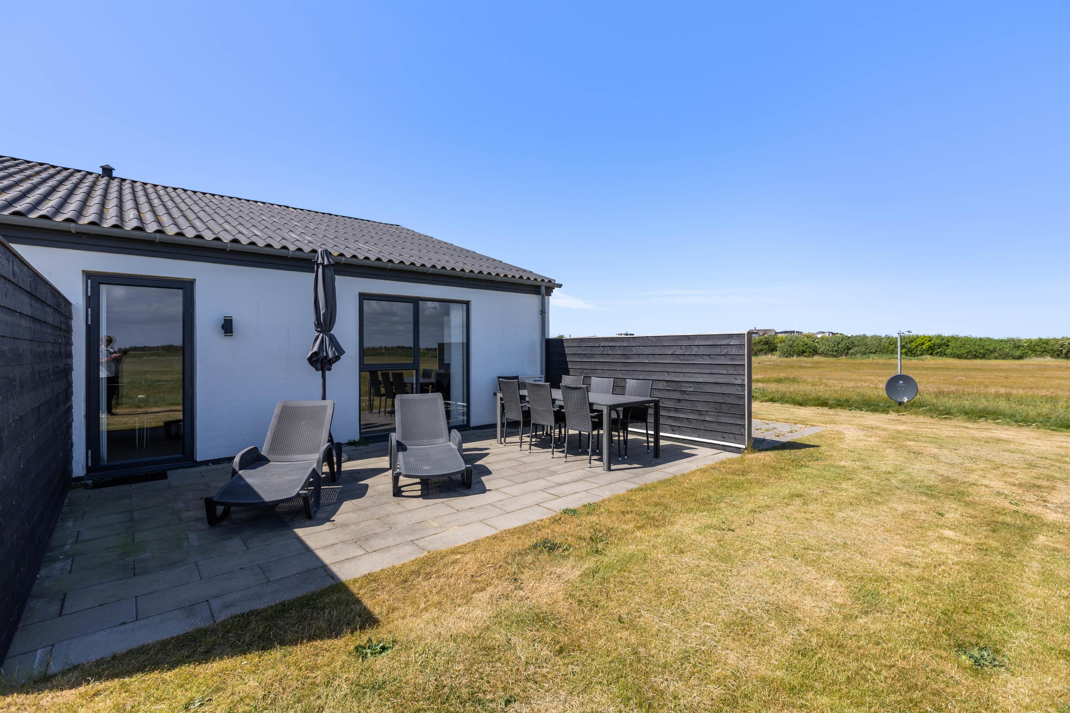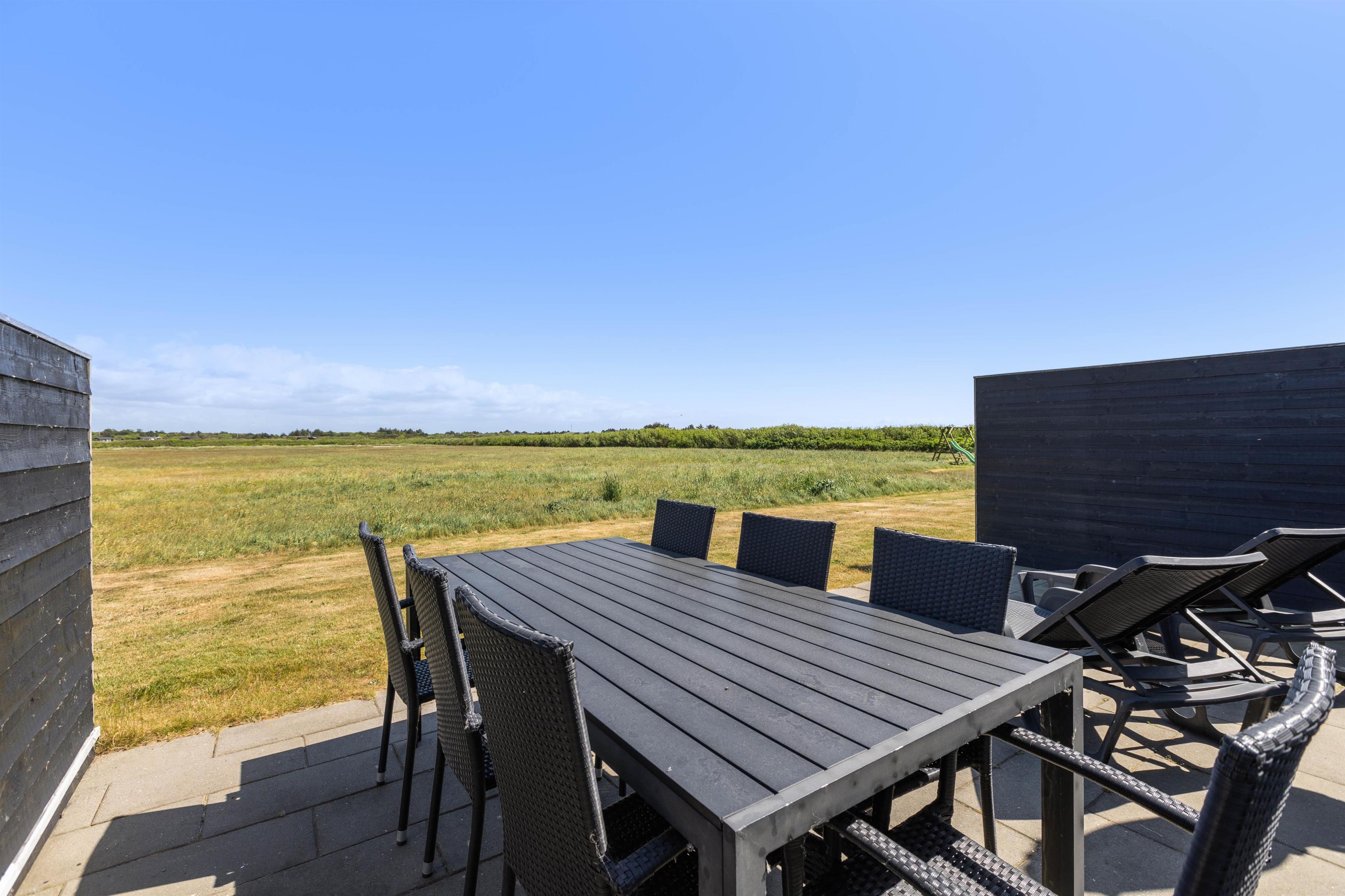 Fra det åbne opholdsrum kommer I ud på den østvendte terrasse, som er afskærmet på begge sider og møbleret med gode, solide havemøbler og liggestole, så I kan nyde de dejlige solskinsdage fuldt ud - allerede fra morgenstunden, hvor morgensolen dukker op i horisonten. Her finder I alt hvad I får brug for, for kunne nyde den friske luft og gode udsigt.