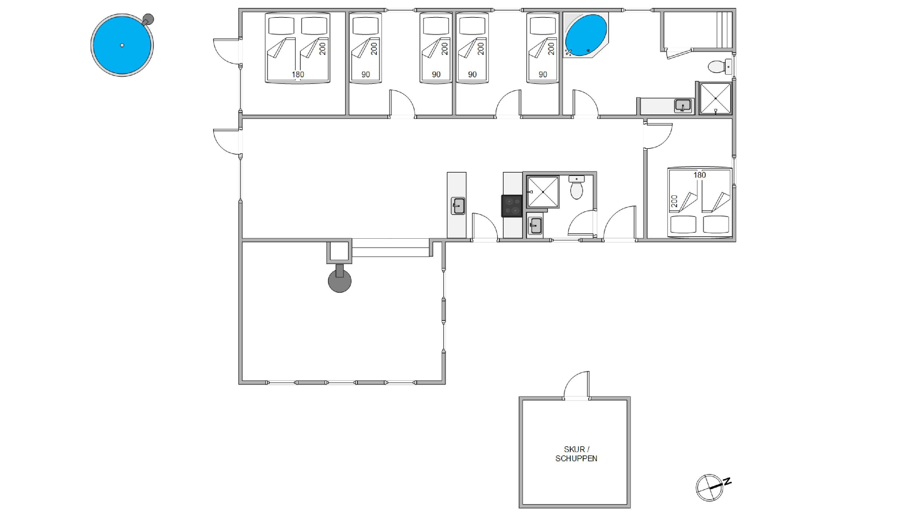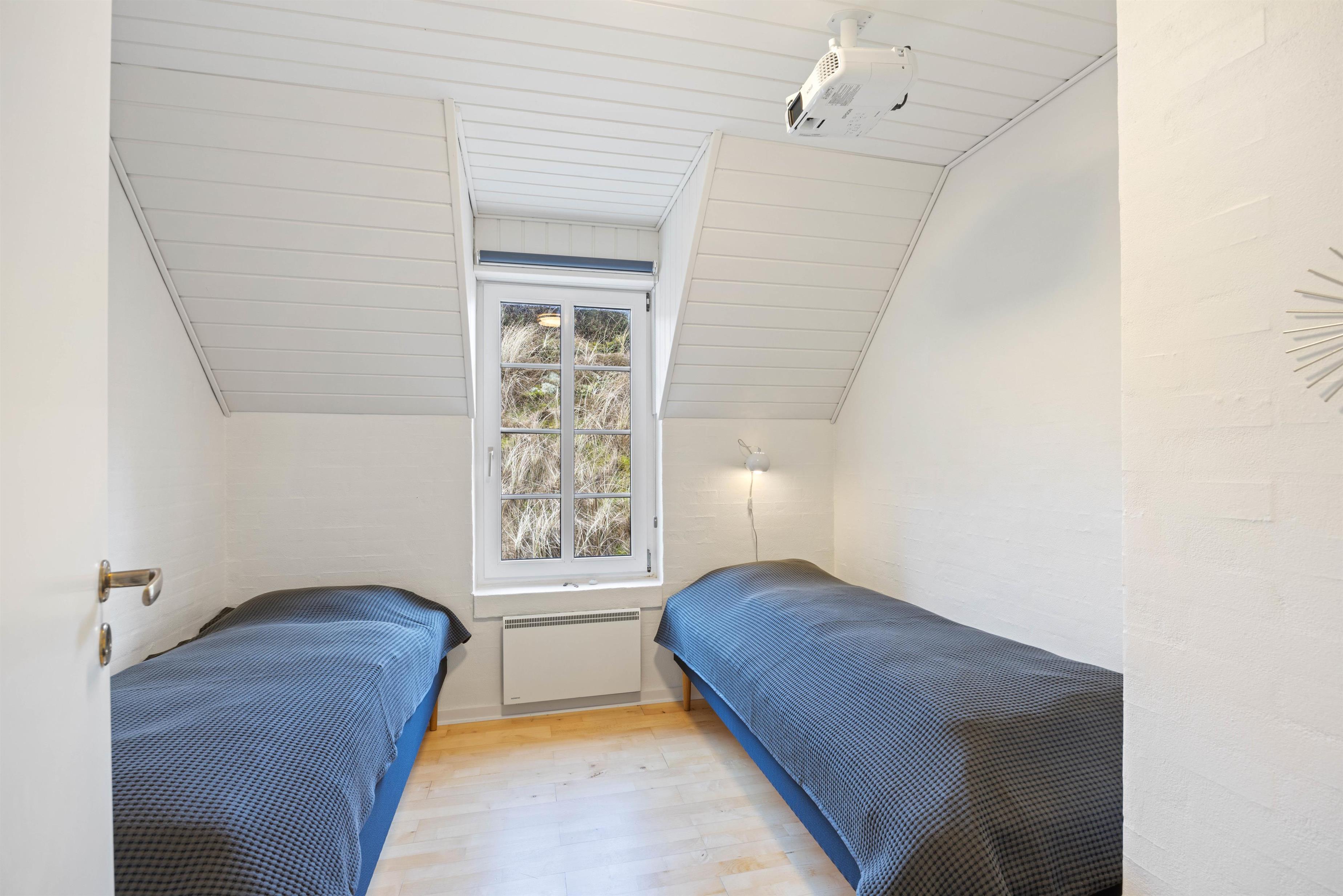 Alle soveværelser og de to badeværelser ligger i forlængelse af opholdsstuen. Der er i alt 4 soveværelser, hvoraf 2 af dem har en dobbeltseng hver, og de to andre soveværelser har 2 enkeltsenge hver. Da der er 2 badeværelser i feriehuset, er der ingen trængsel foran badeværelset om morgenen.