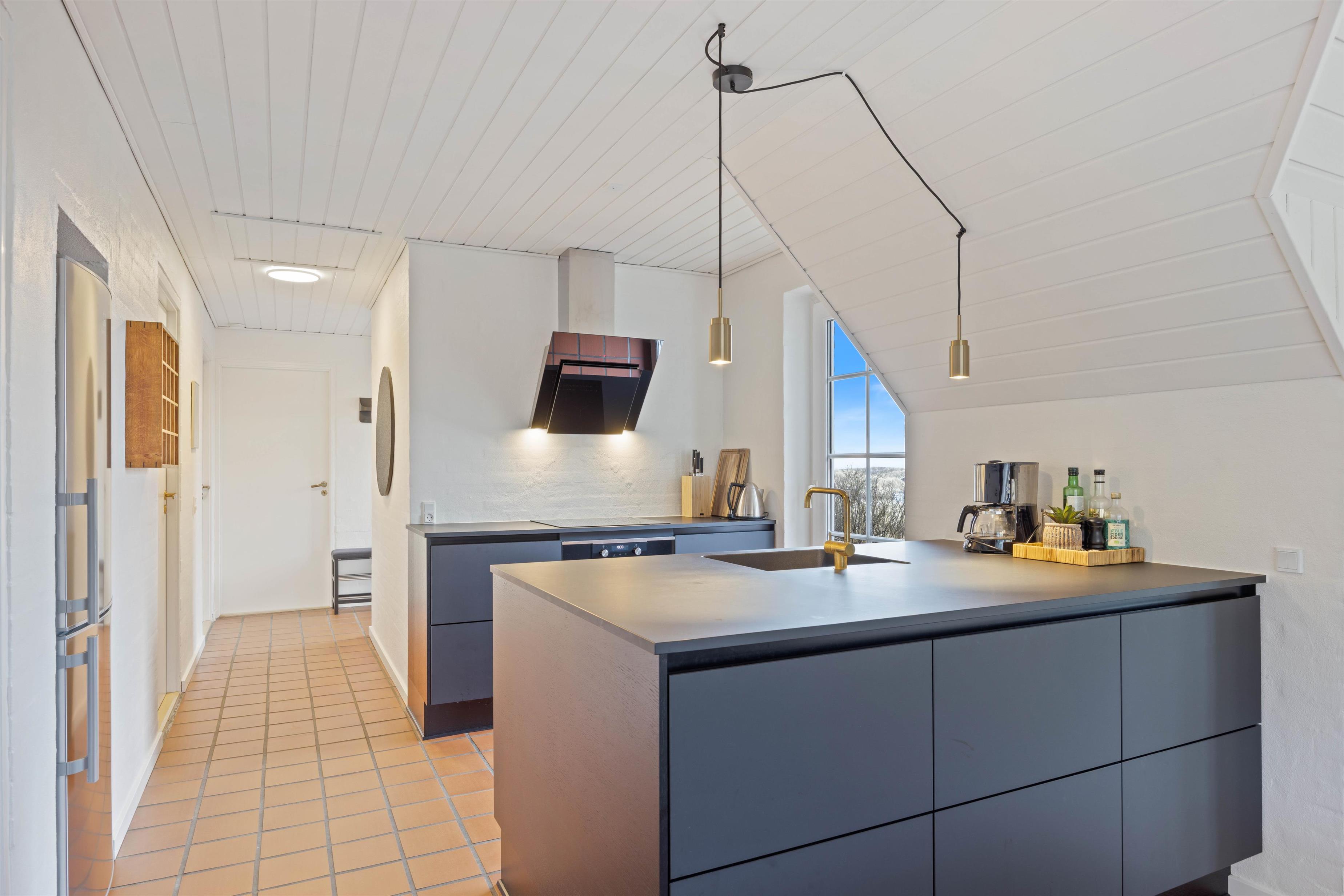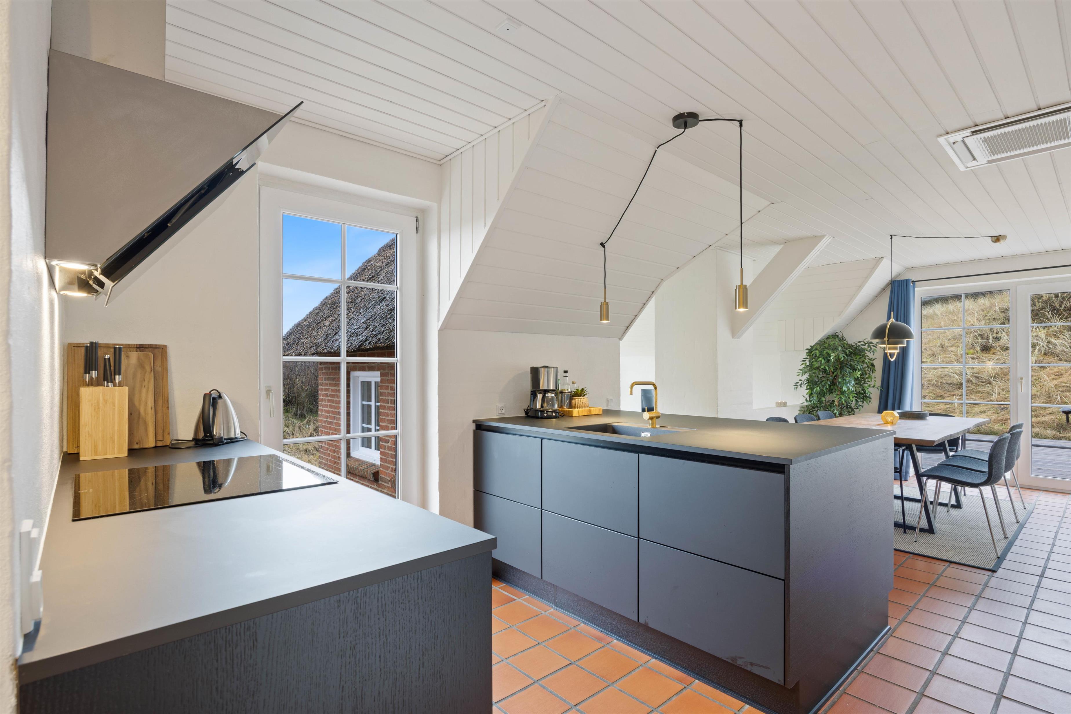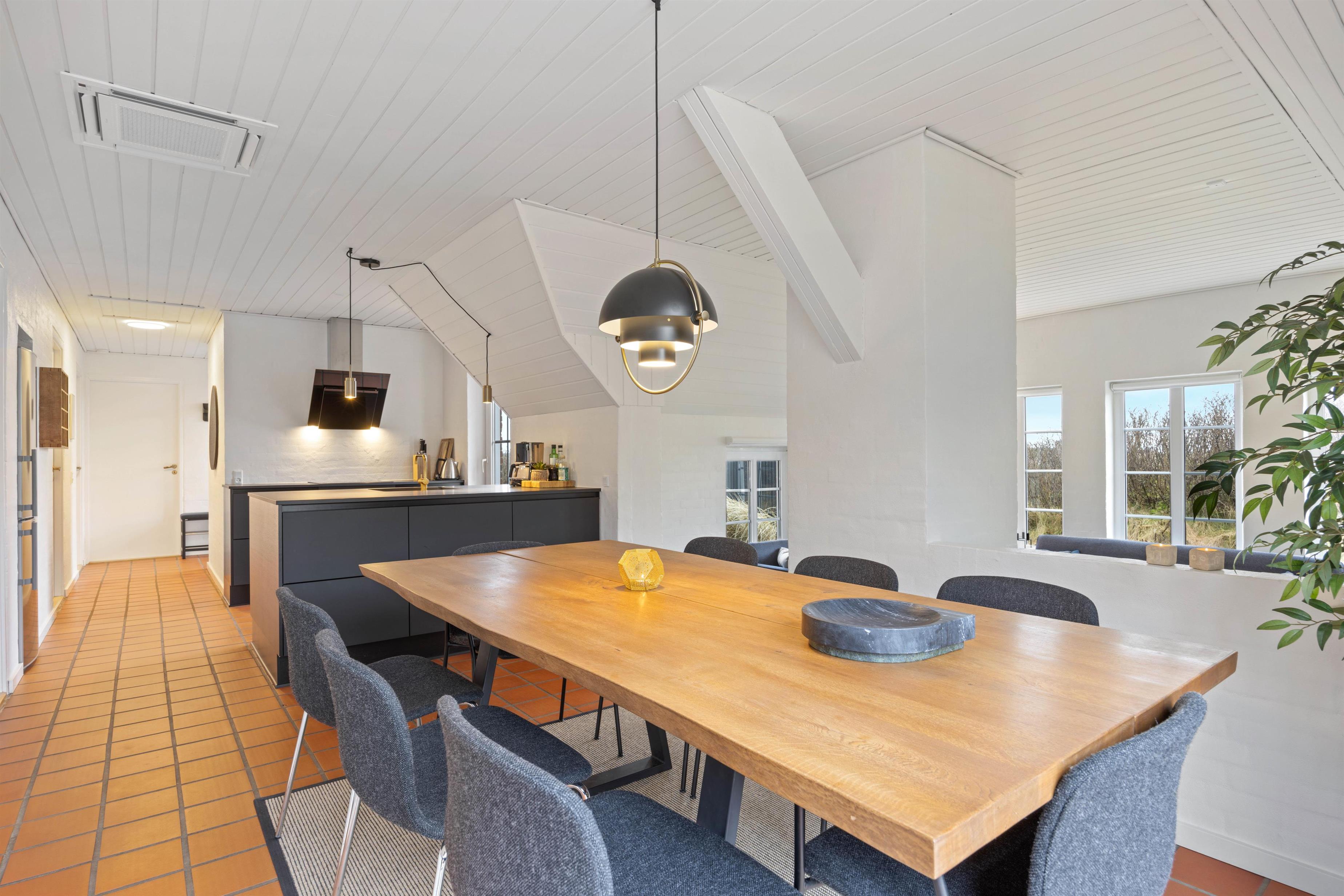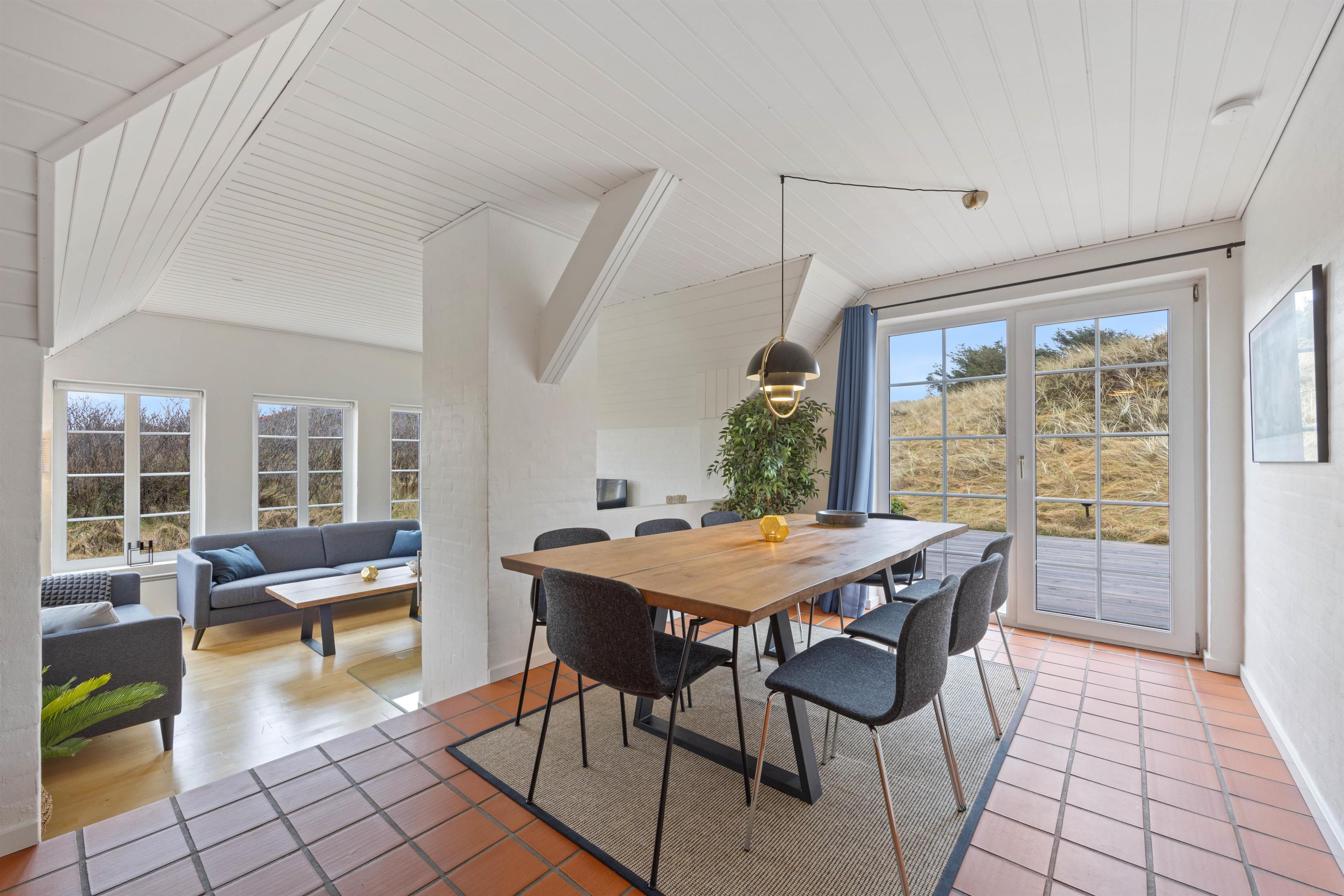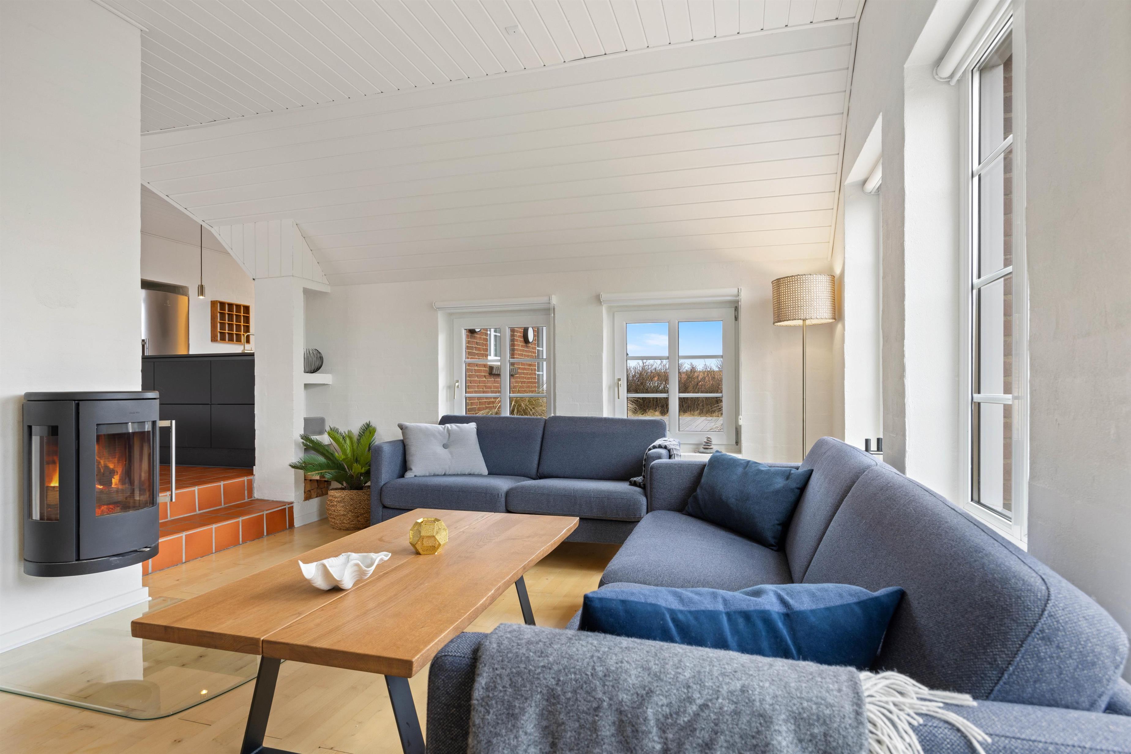De moderne møbler, og brændeovnen i stuen sørger for hyggelig feriehusstemning med den dejlige varme og knitrende ild. Ud over brændeovnen er der installeret en energibesparende varmepumpe i feriehuset, der også hjælper med at bevare et behageligt indeklima. I kan også se en god film på smart tv'et, hvor der er tilhørende apps til DR, Netflix, HBO+ og Disney+, hvis I selv har et abonnement dertil.