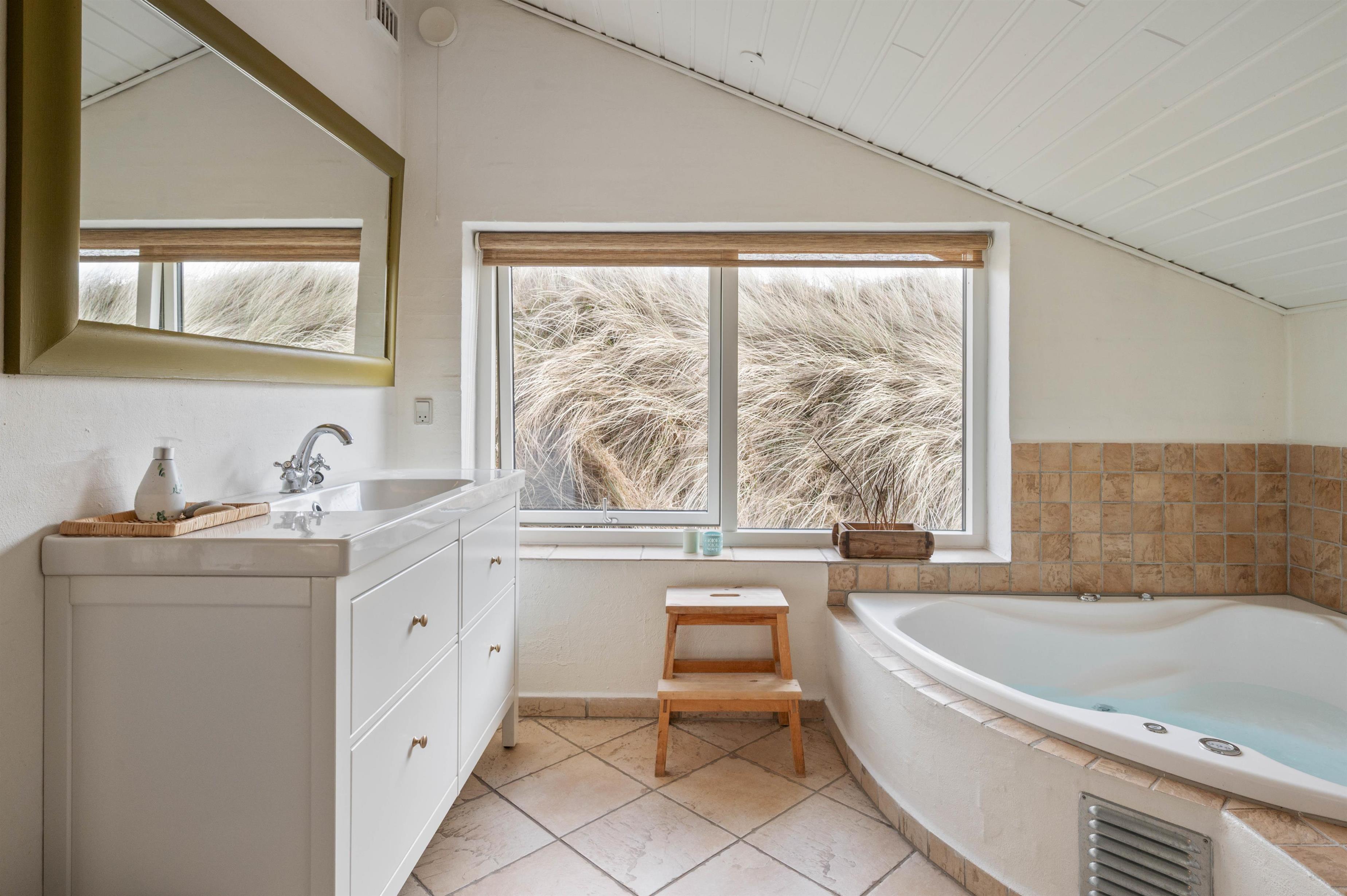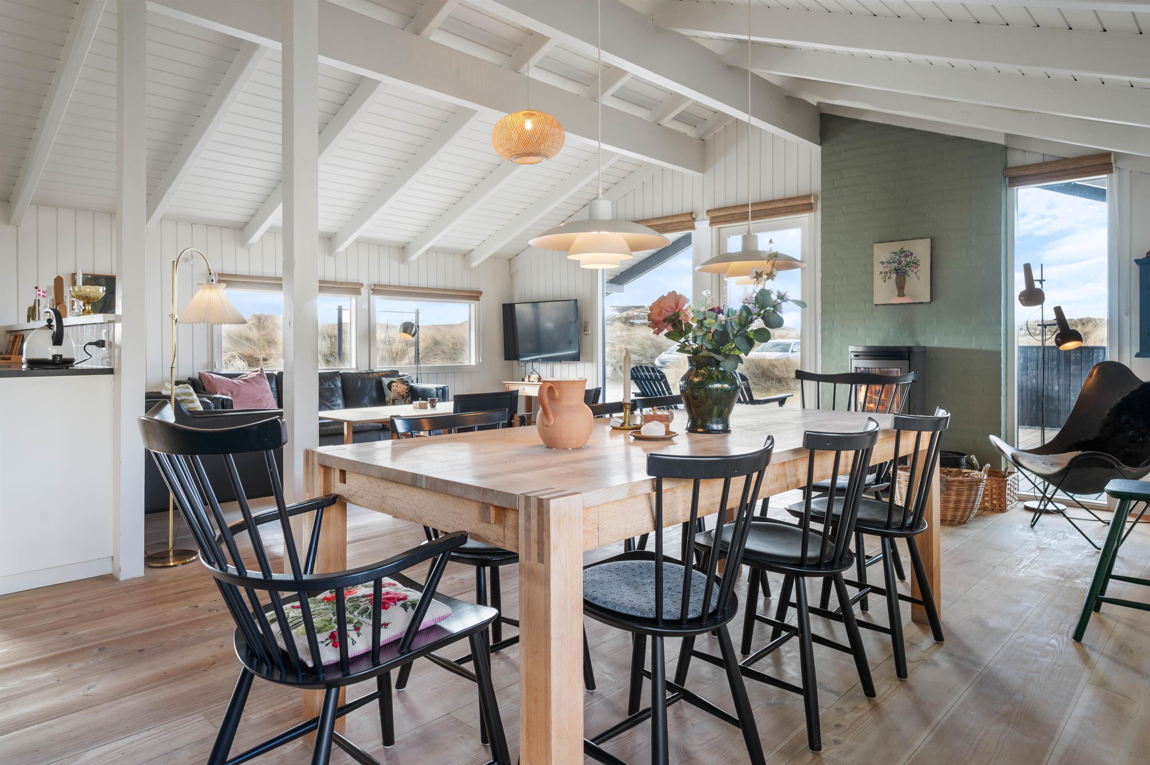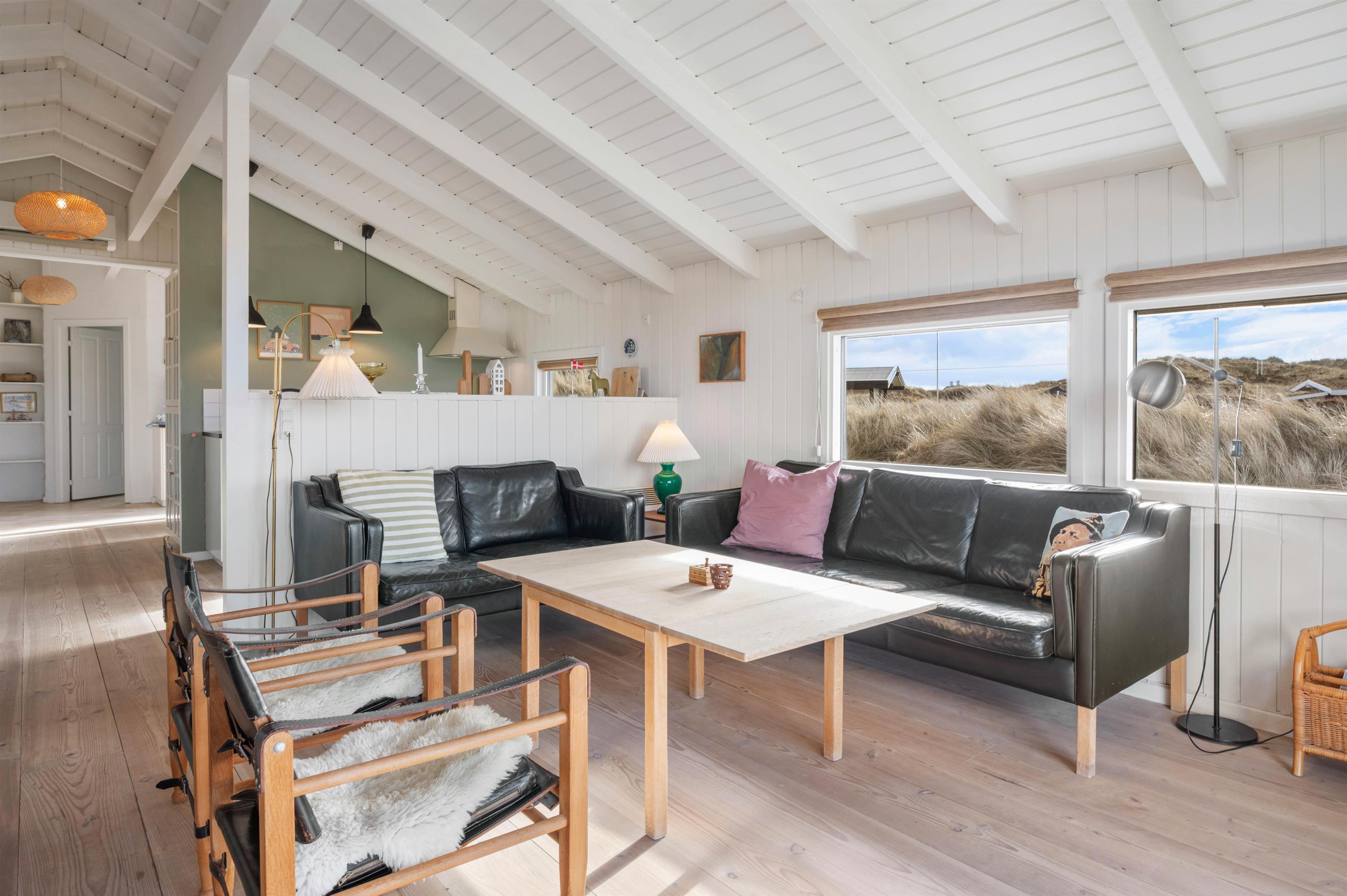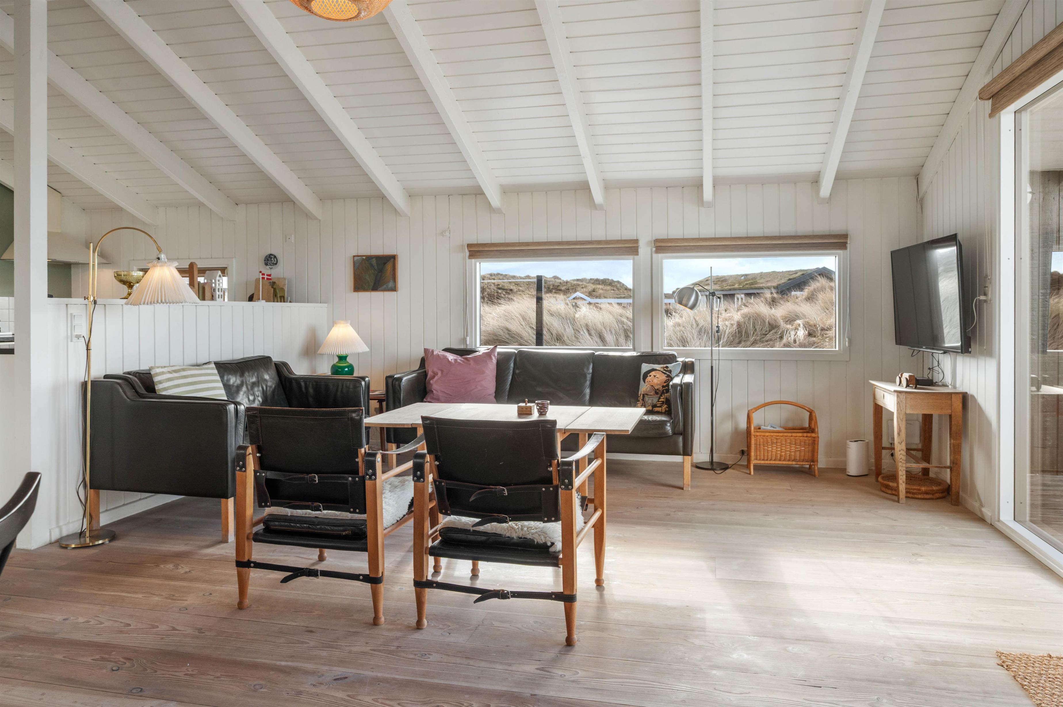 Sommerhuset er indrettet med fokus på afslapning, komfort og velvære. Har I været ude i den friske luft hele dagen, er det dejligt at kunne lade kroppen op i varmen fra saunaen eller vandet i spabadet. Ligesom huset falder i ét med naturen udenfor, så har man også i husets indretning inviteret naturen indenfor. Indretningen er holdt helt enkelt med lyse vægge, lofter og gulve samt flotte, enkle møbler. Det gør, at naturen kommer til sin ret, og den får en central placering både ude og inde.