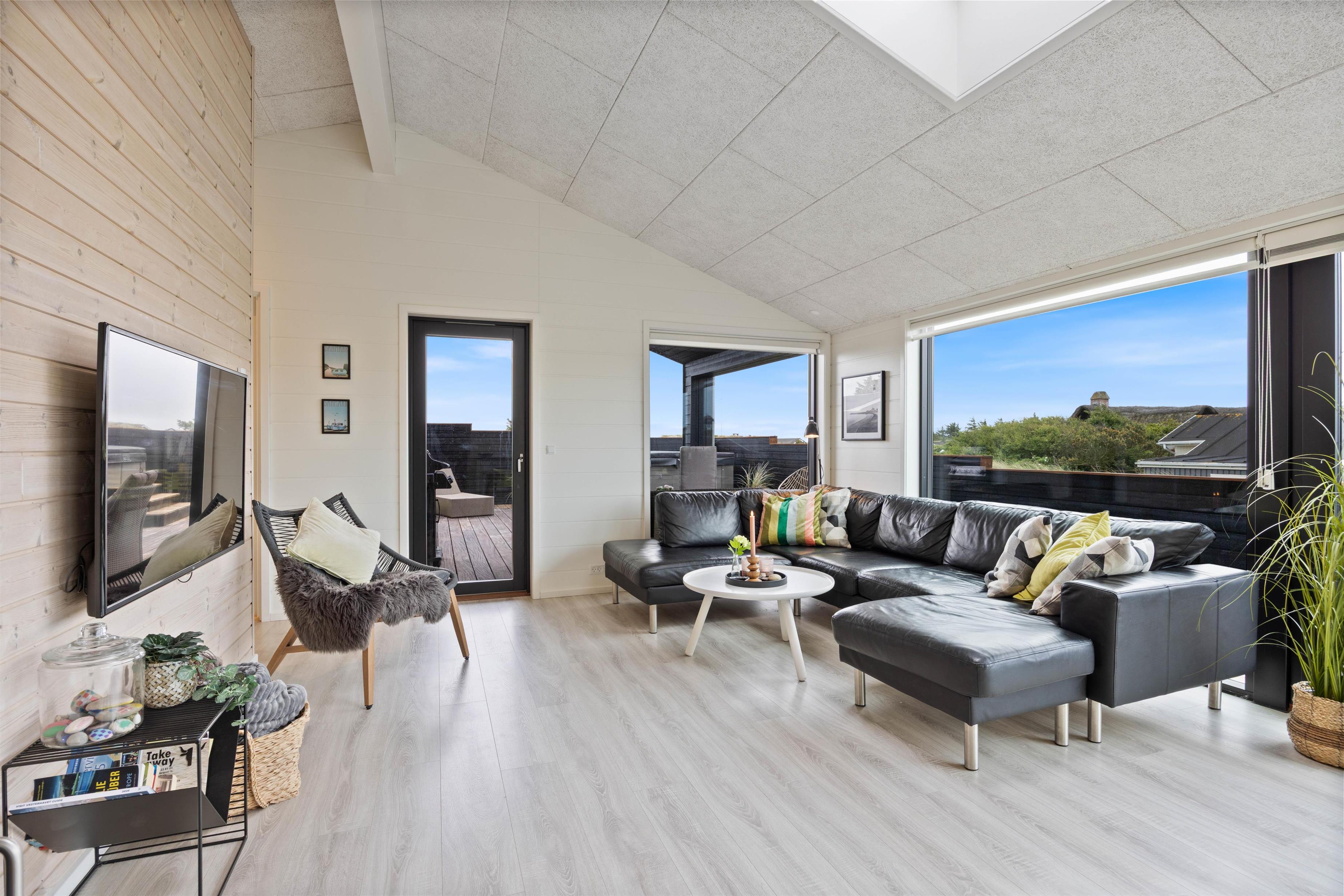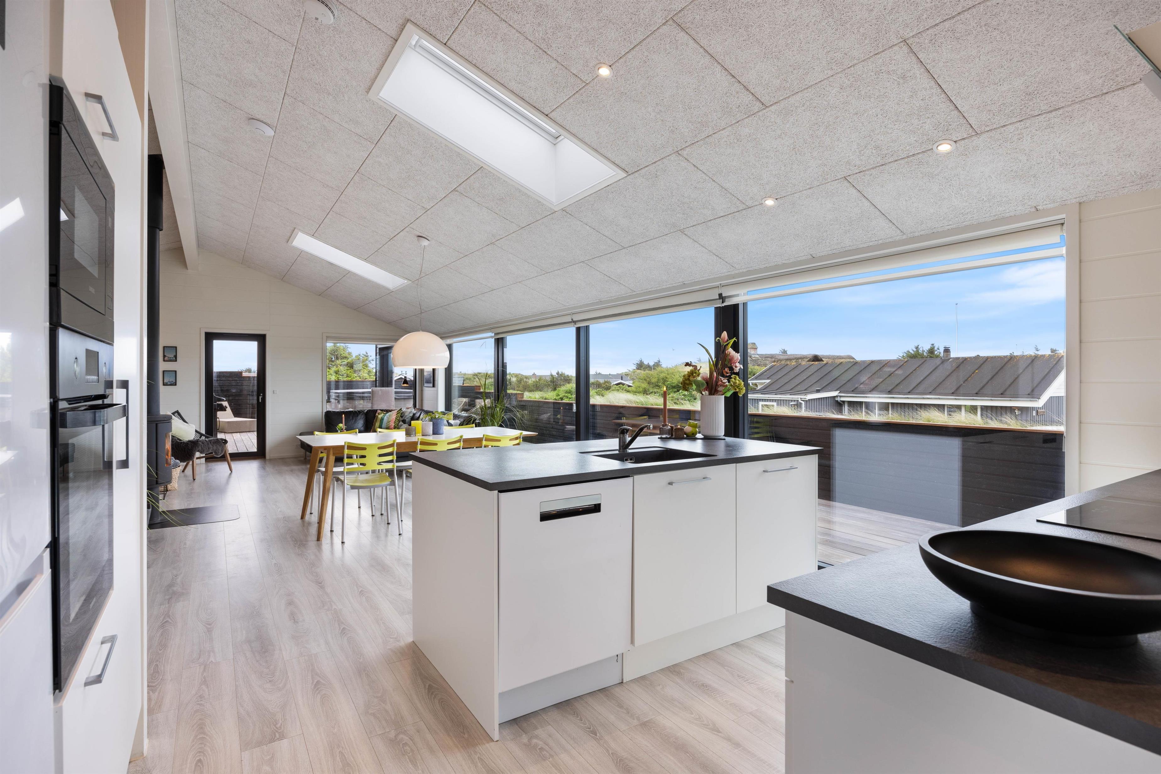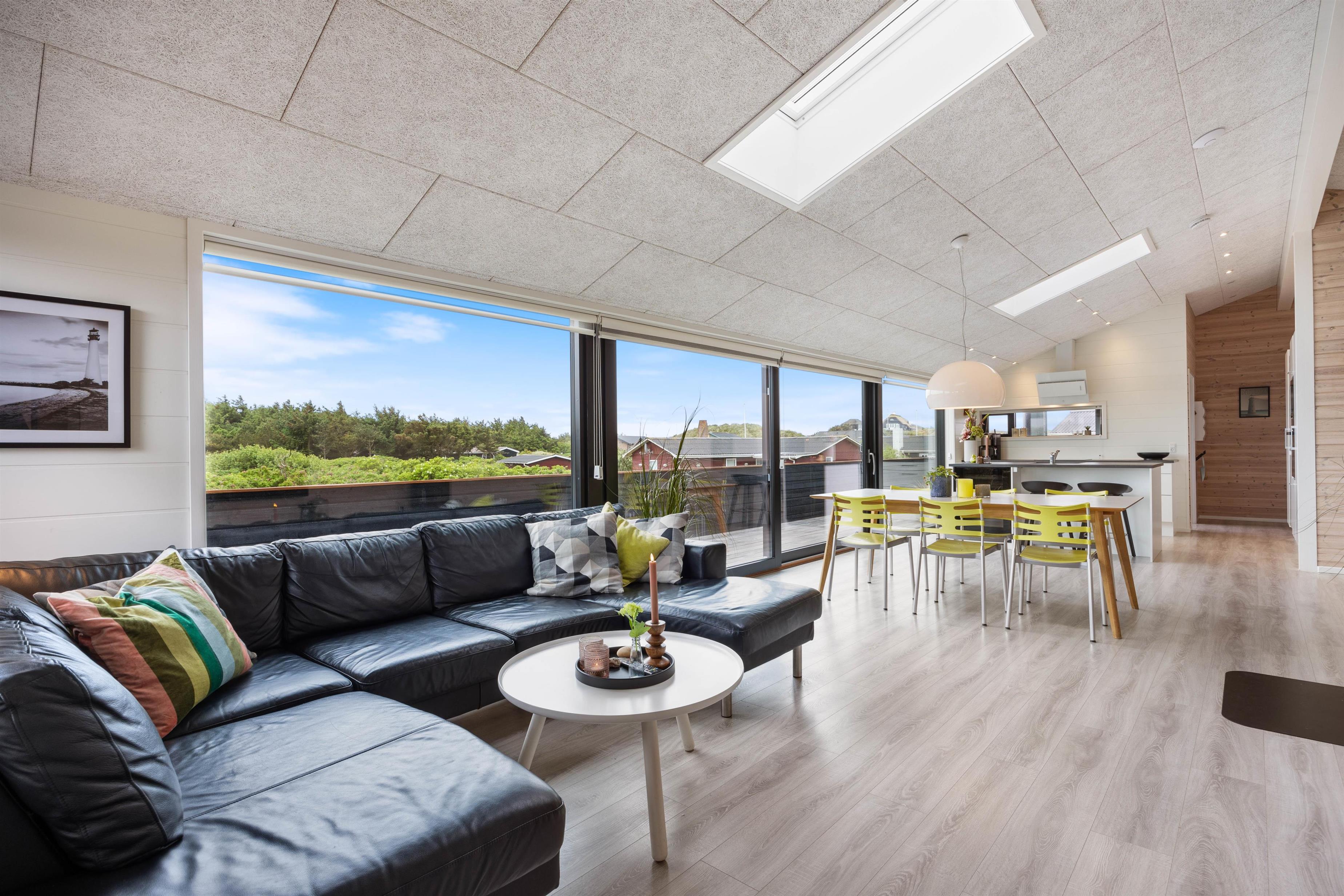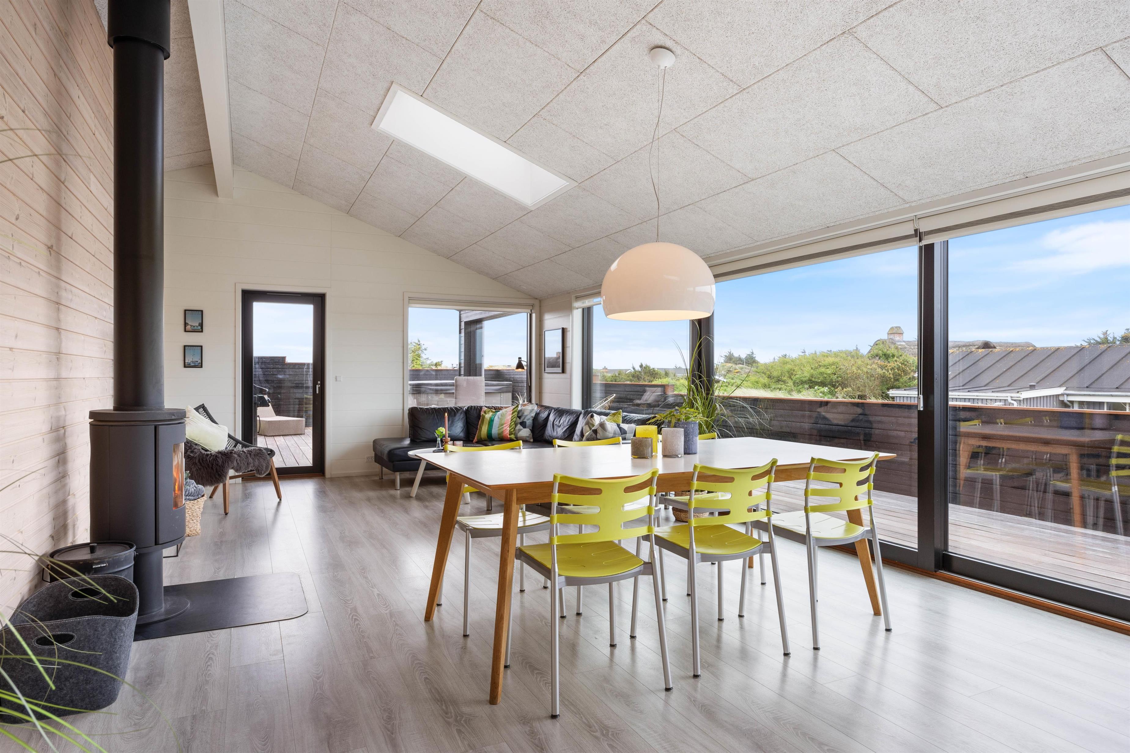 Hele sommerhuset er dejligt lyst, og det er takket være de mange gode vinduespartier, som sørger for et dejligt lysindfald og byder hele den omkringliggende natur hele vejen indenfor. Generelt i hele huset, er der gode betingelser for afslapning og velvære. Brændeovnen i det rummelige alrum tilfører den klassiske feriestemning, og fra det største af sommerhusets 2 badeværelser er der indgang til saunaen, hvor I kan blive varmet godt igennem efter en dag i den friske havluft.