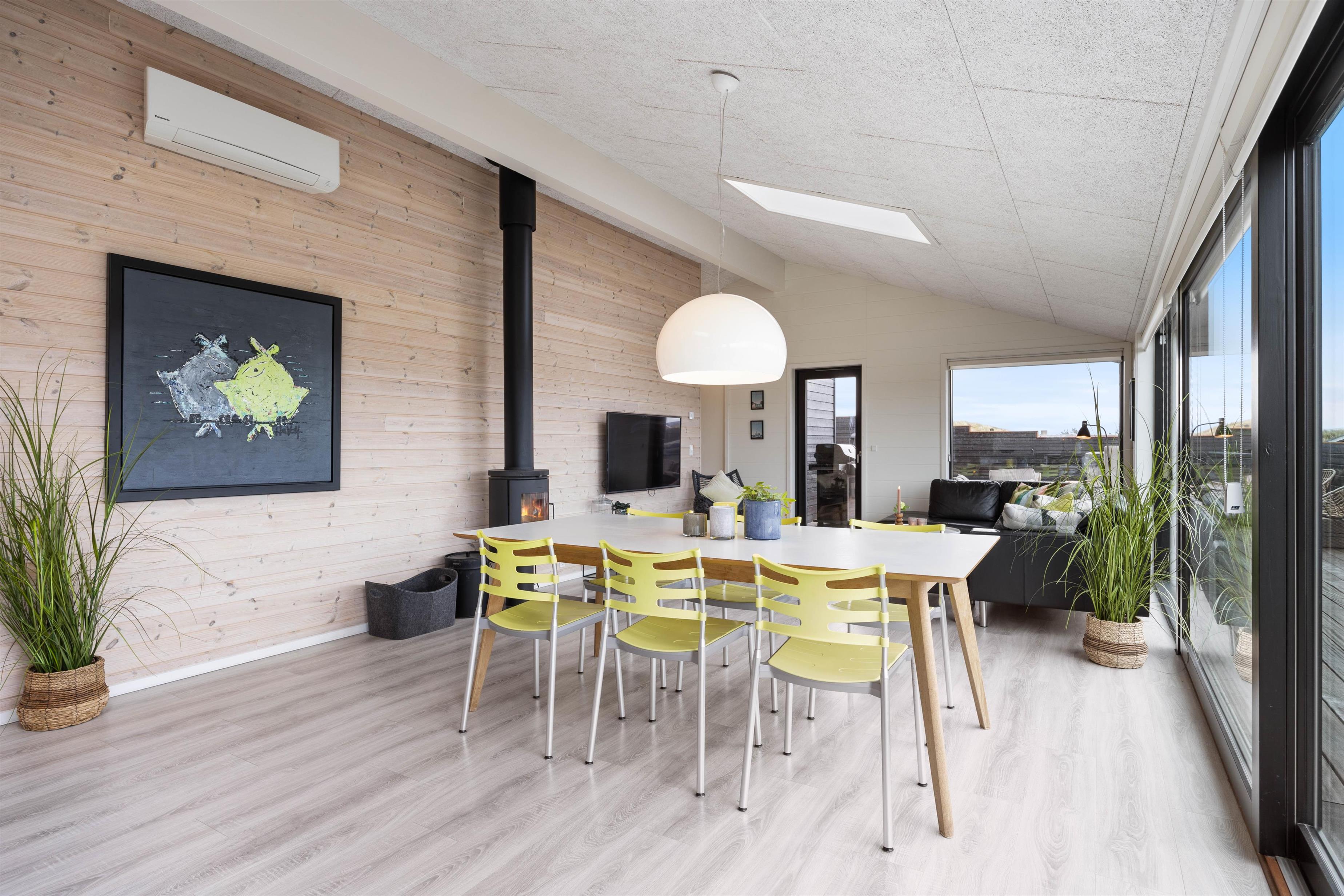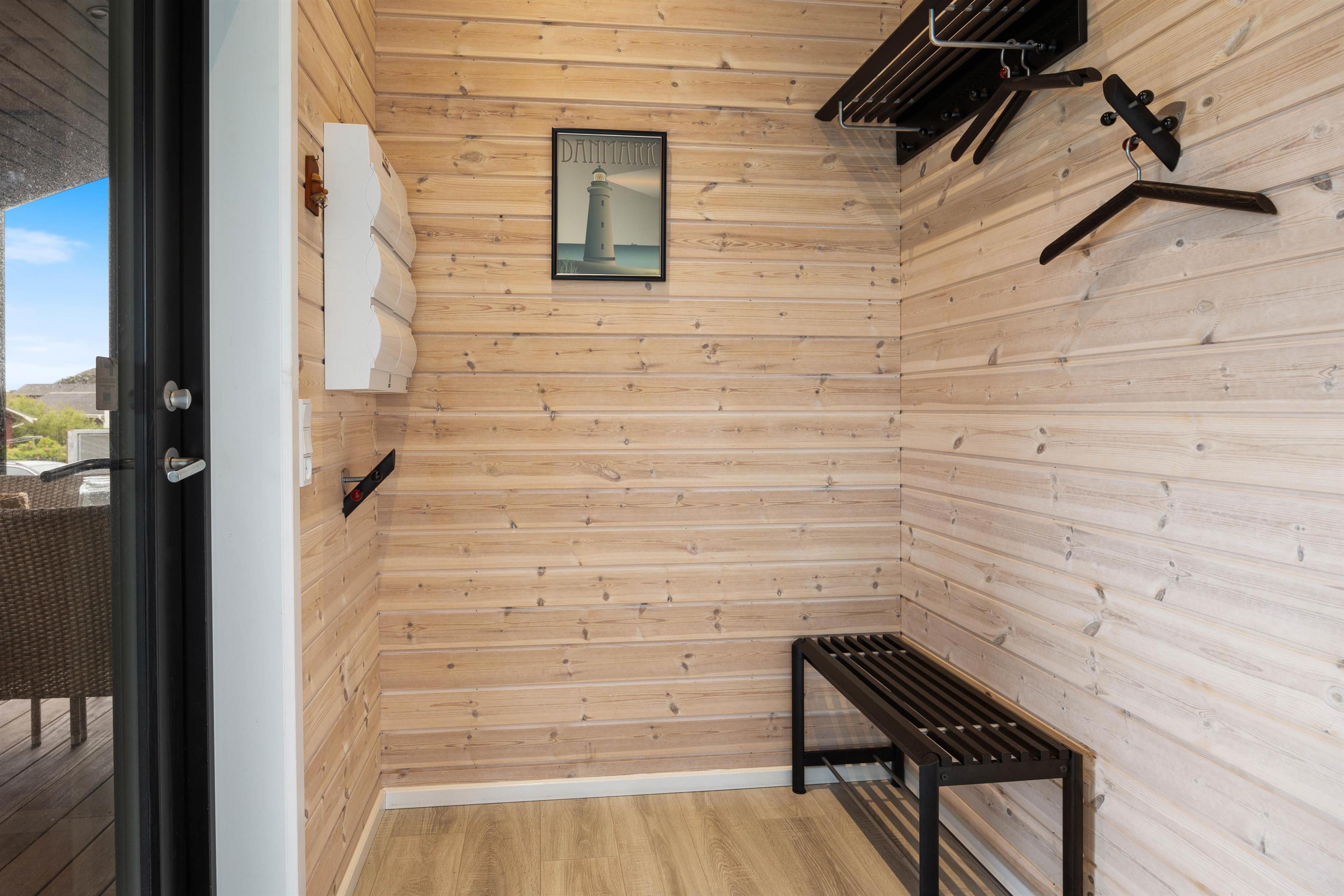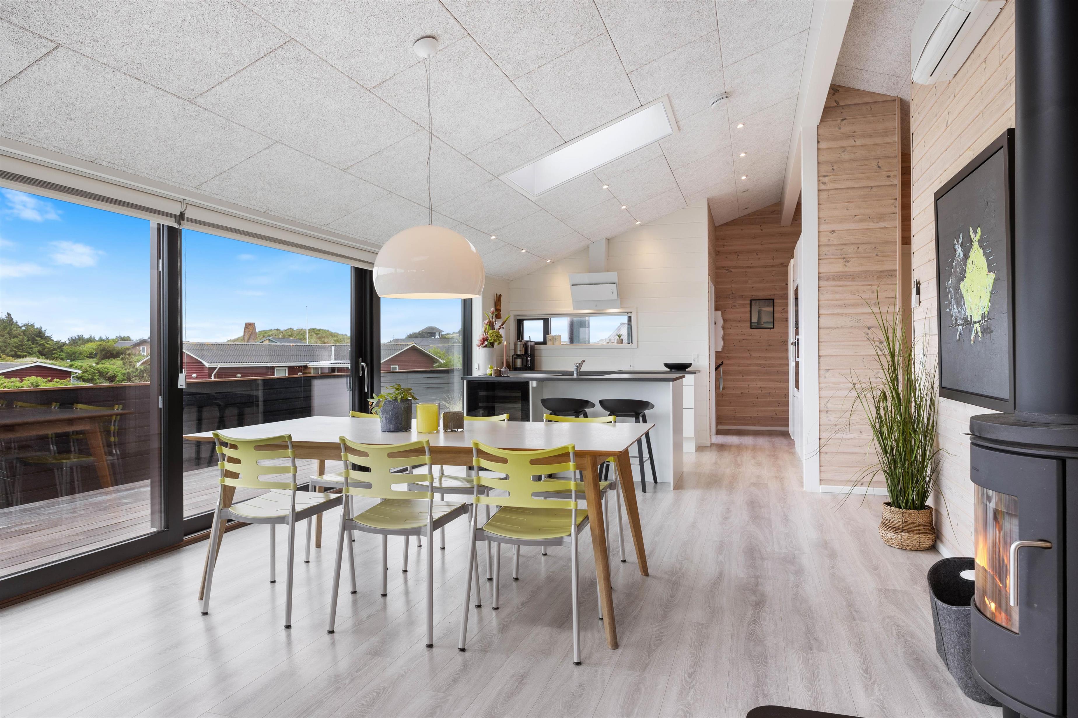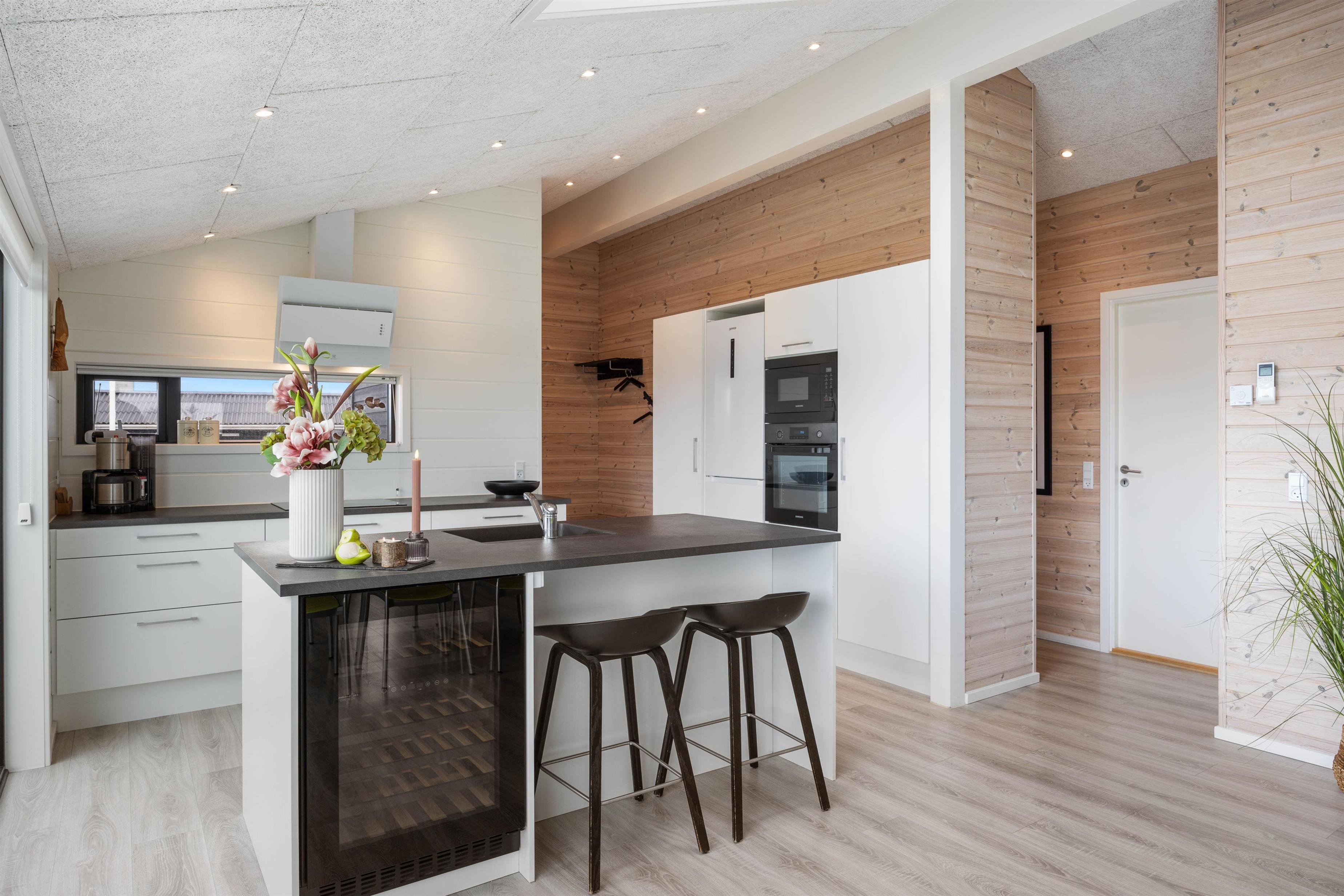 Hele sommerhuset er dejligt lyst, og det er takket være de mange gode vinduespartier, som sørger for et dejligt lysindfald og byder hele den omkringliggende natur hele vejen indenfor. Generelt i hele huset, er der gode betingelser for afslapning og velvære. Brændeovnen i det rummelige alrum tilfører den klassiske feriestemning, og fra det største af sommerhusets 2 badeværelser er der indgang til saunaen, hvor I kan blive varmet godt igennem efter en dag i den friske havluft.