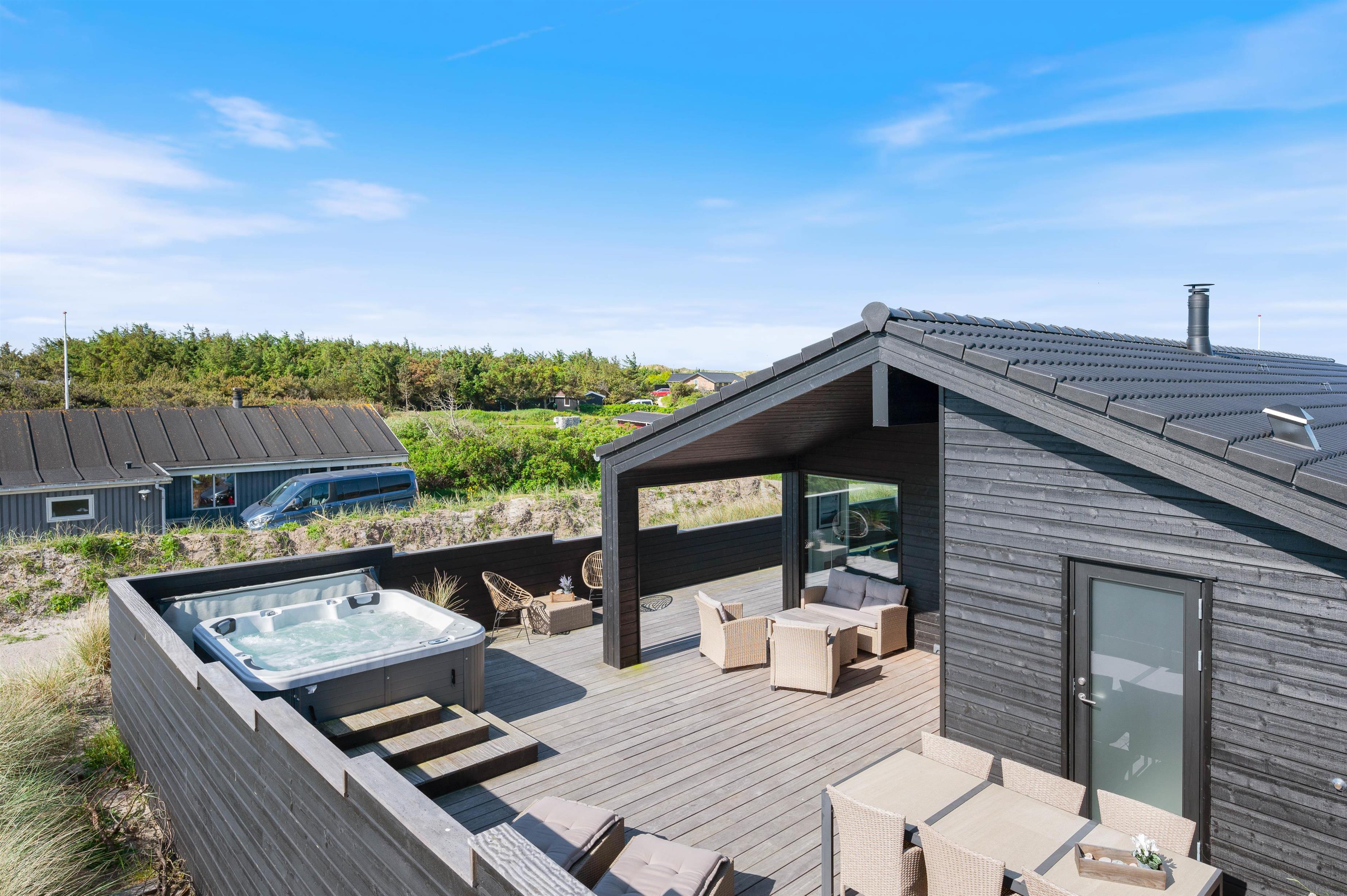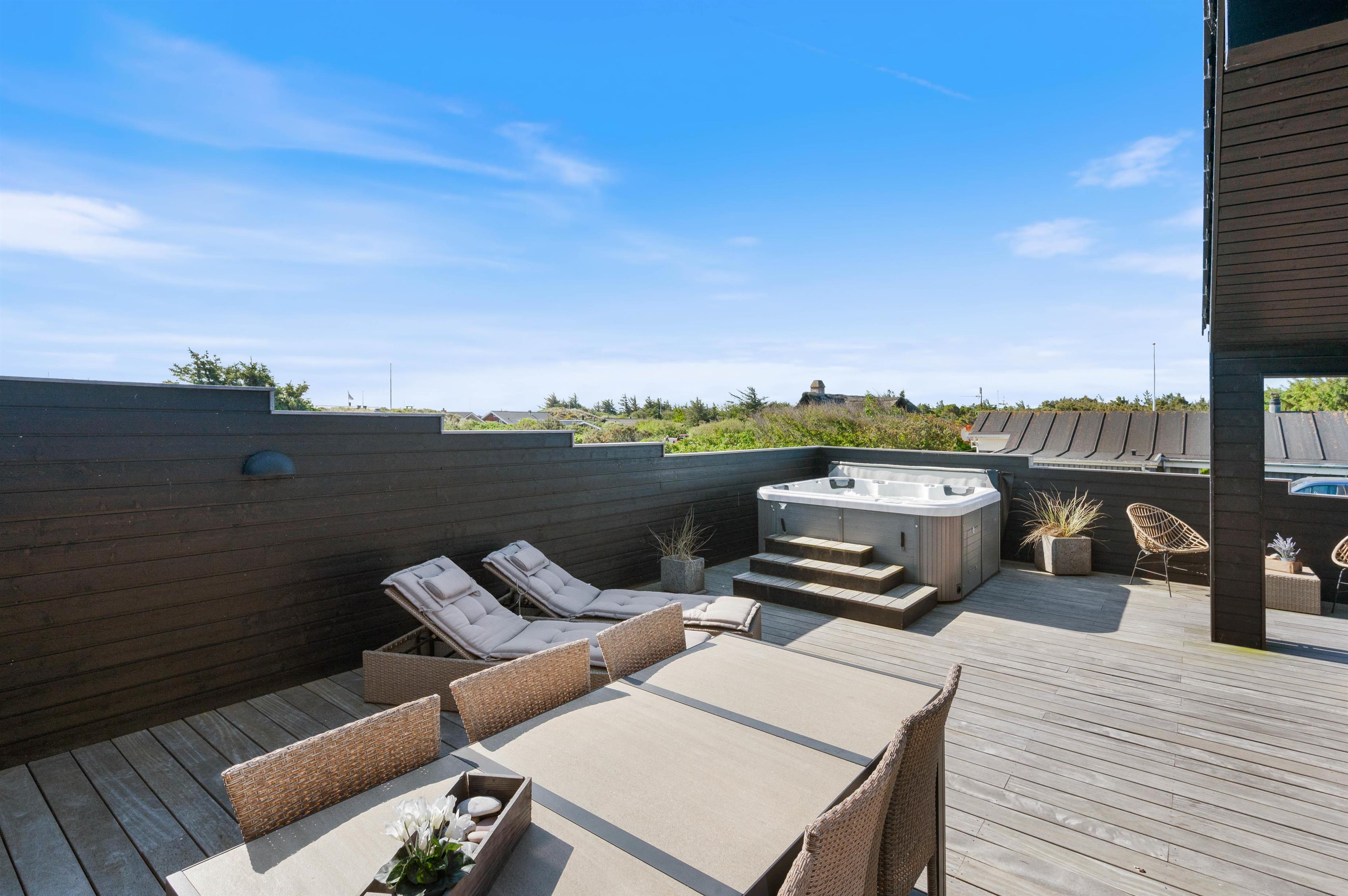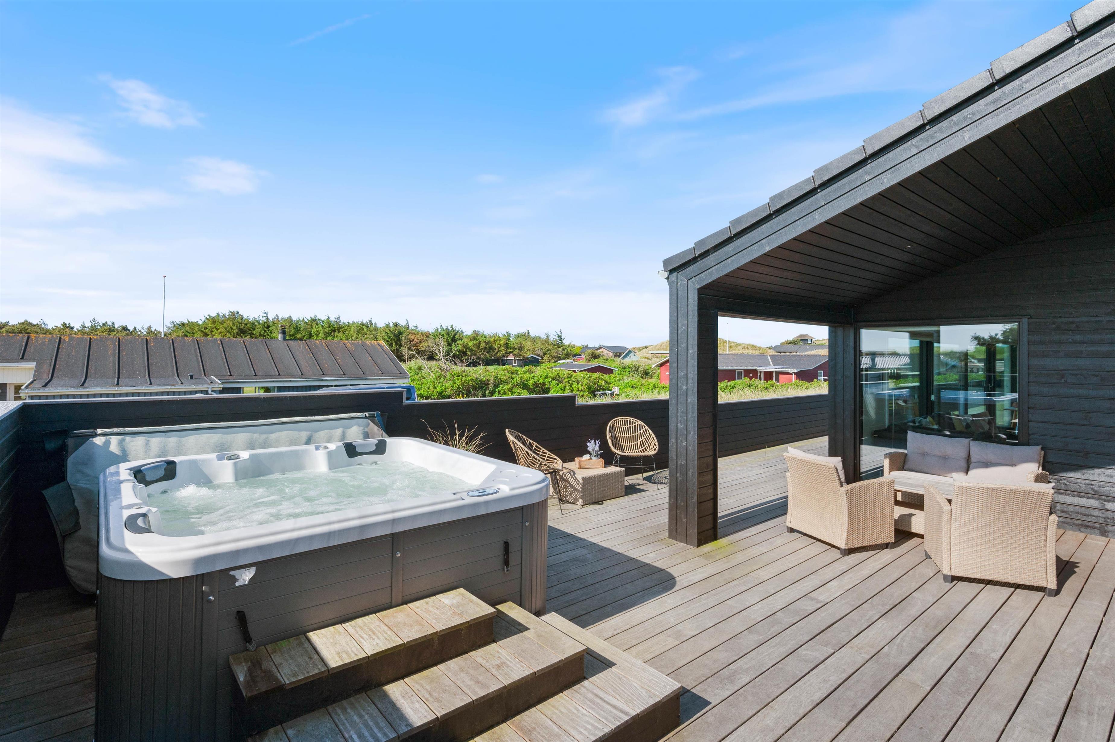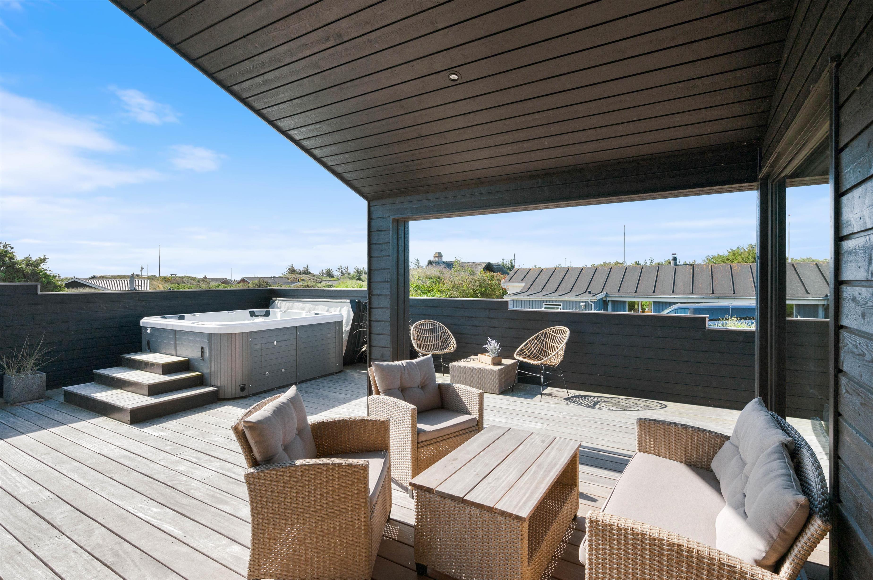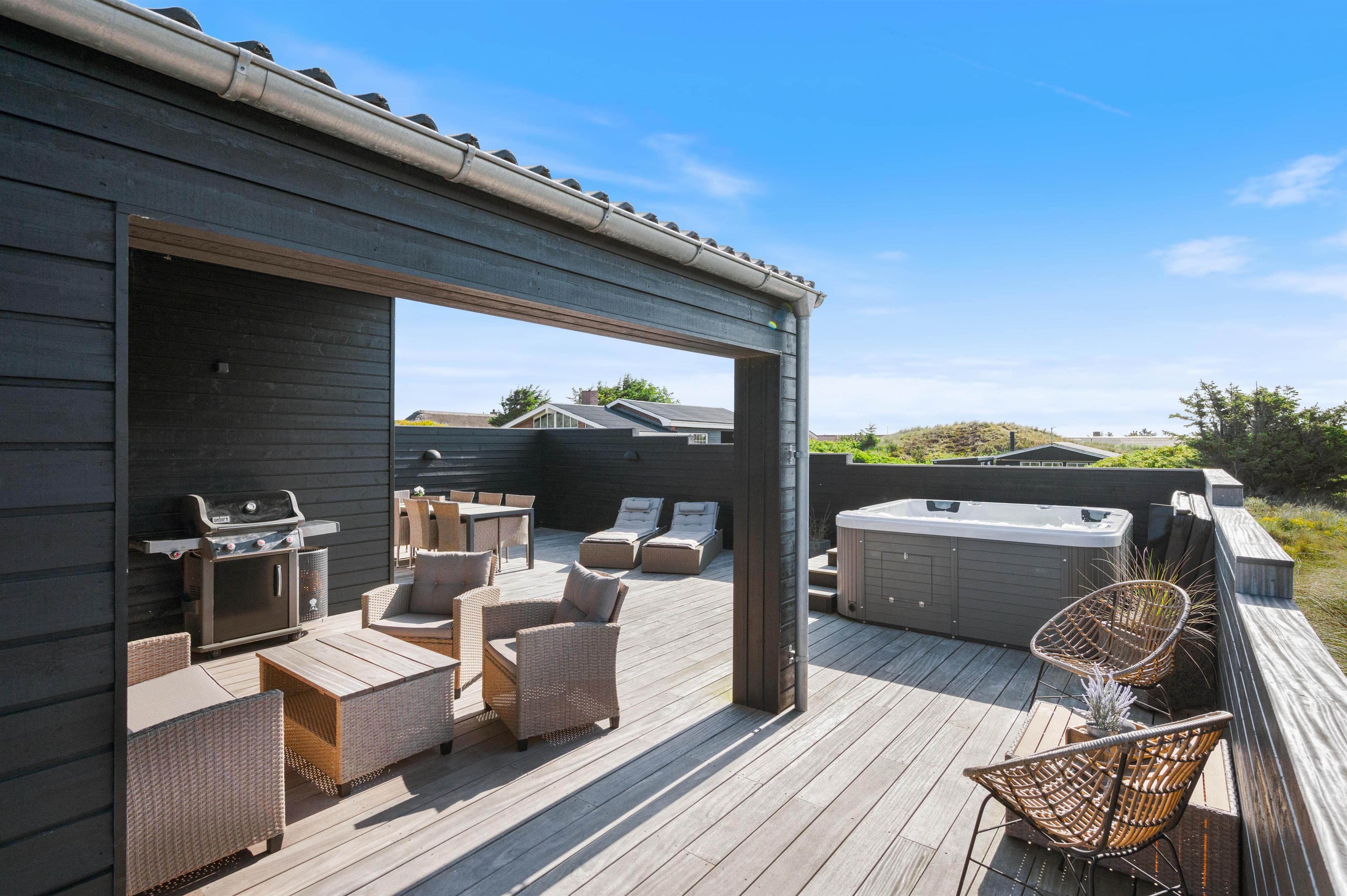 Rundt om feriehuset løber en stor, lukket terrasse med delvis overdækning og afskærmning. Her kan I rigtigt nyde de naturskønne omgivelser, og skal der skrues ekstra op for wellness-fornemmelsen, kan I tænde op i det lækre udendørs spabad. Den afslappende session i udespaen kan passende nydes med et koldt glas rosévin ved siden af, takket være feriehusets vinkøleskab.