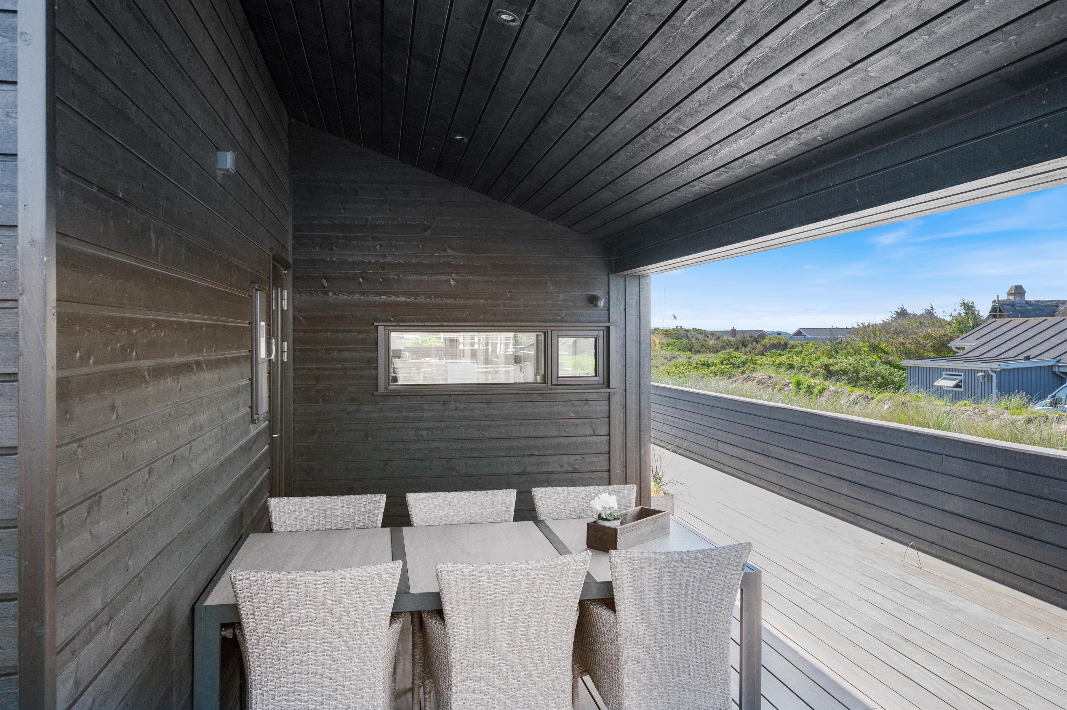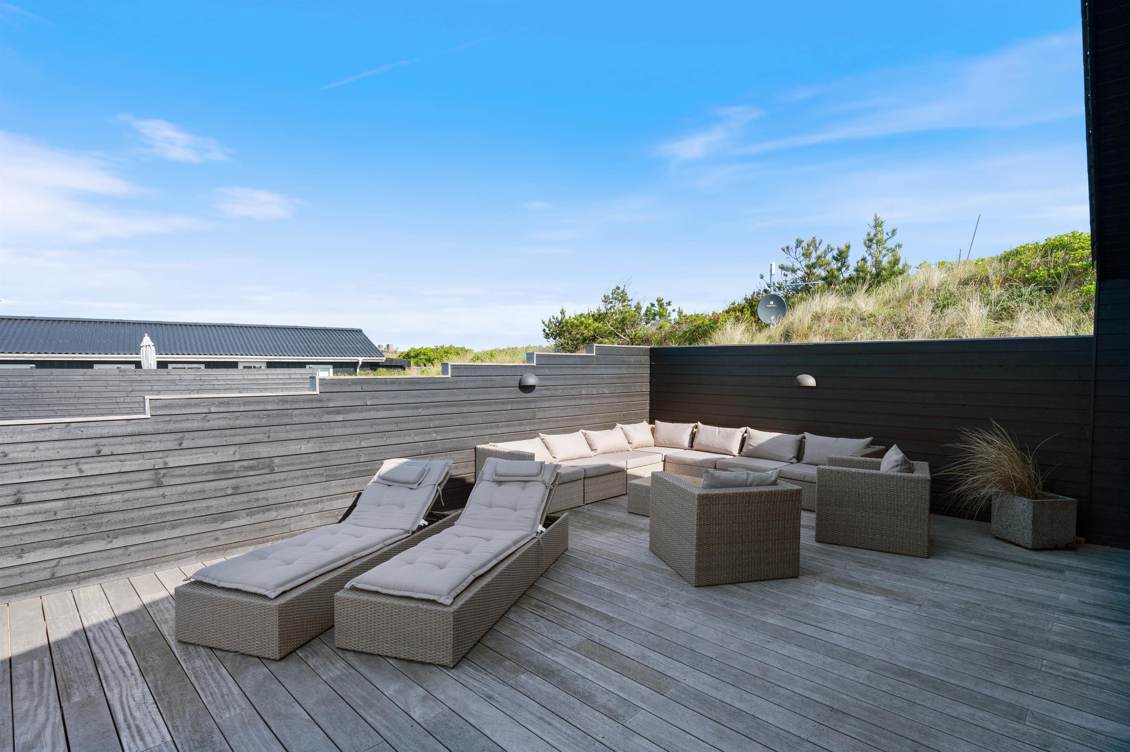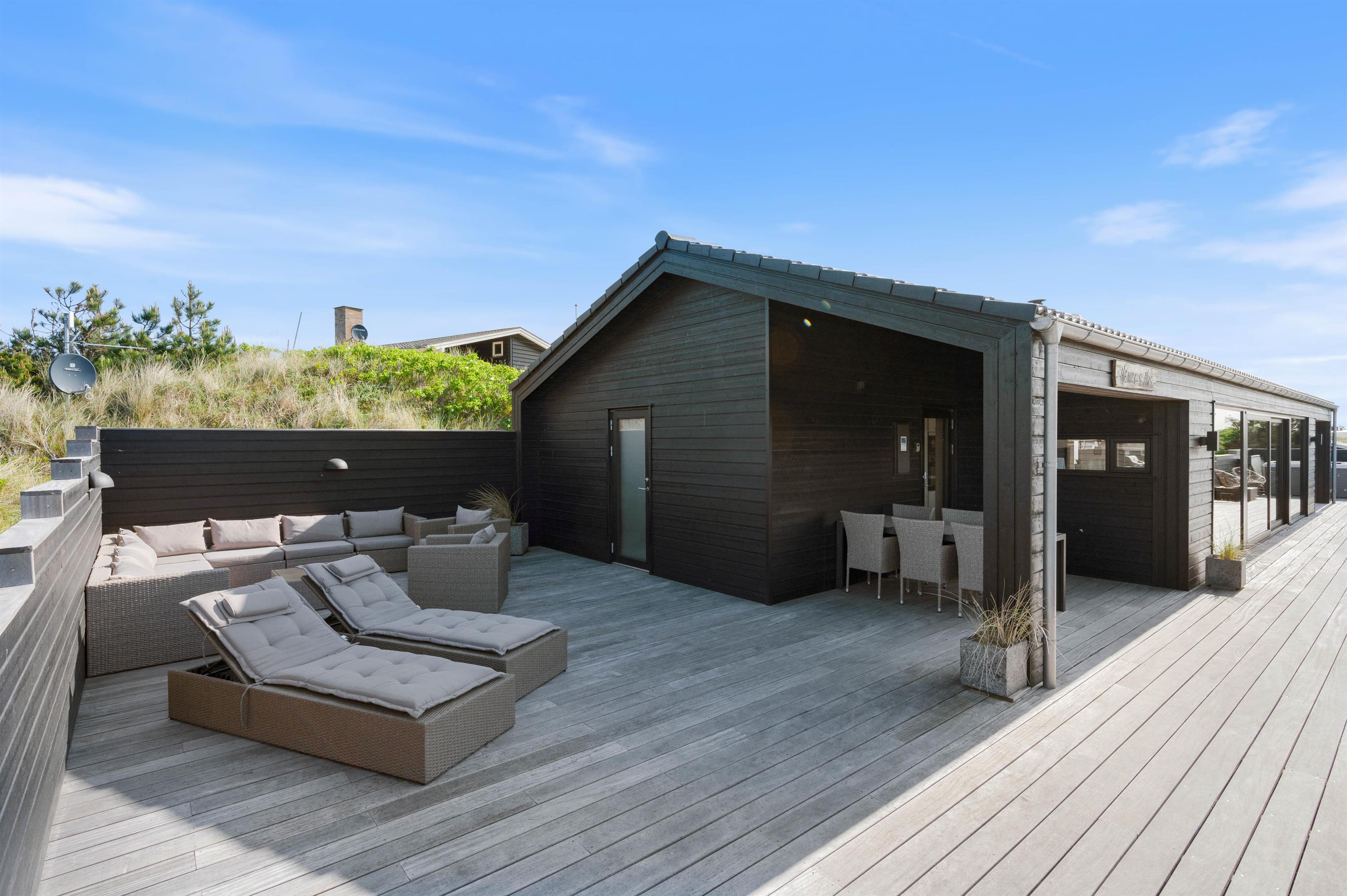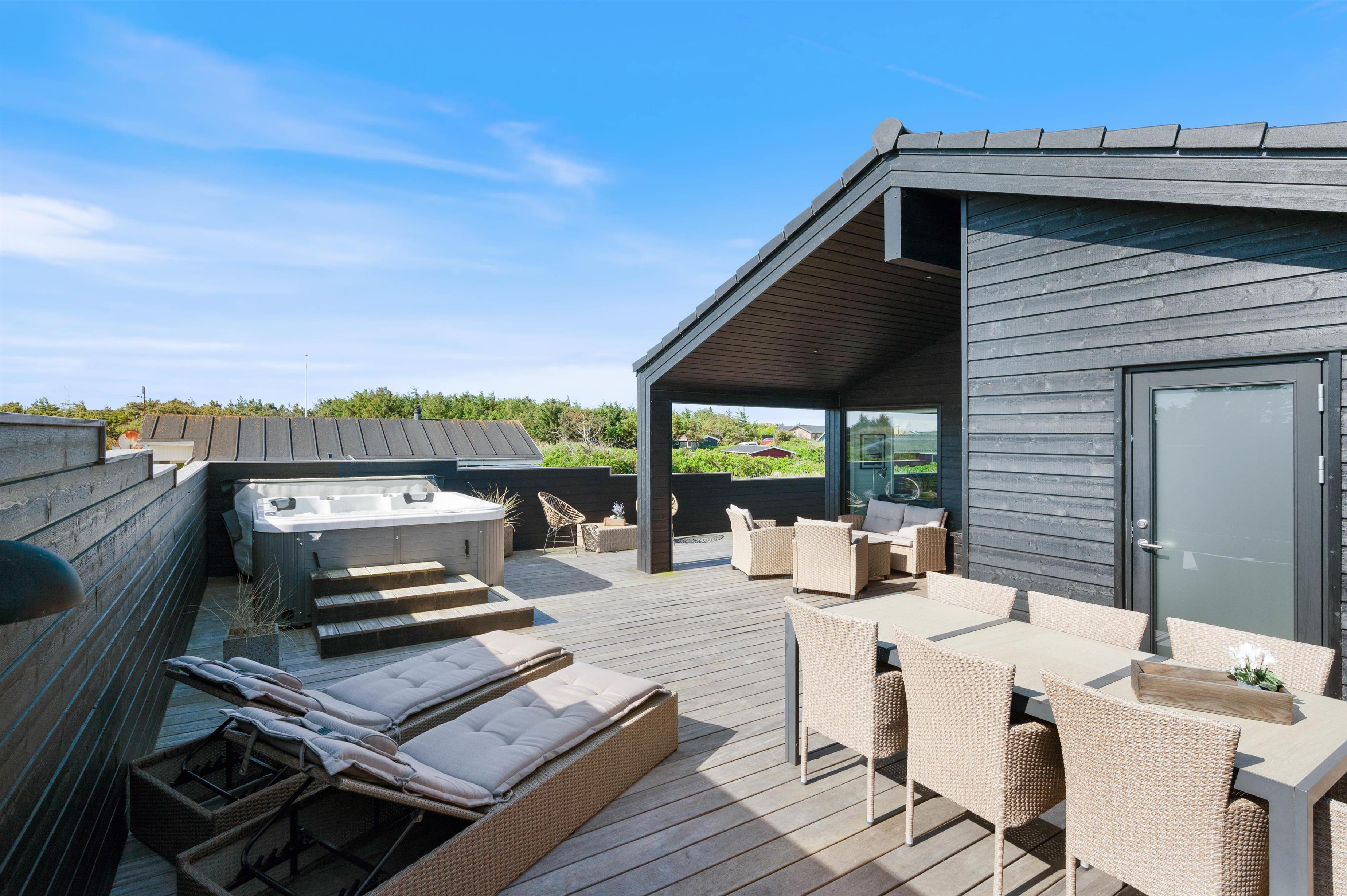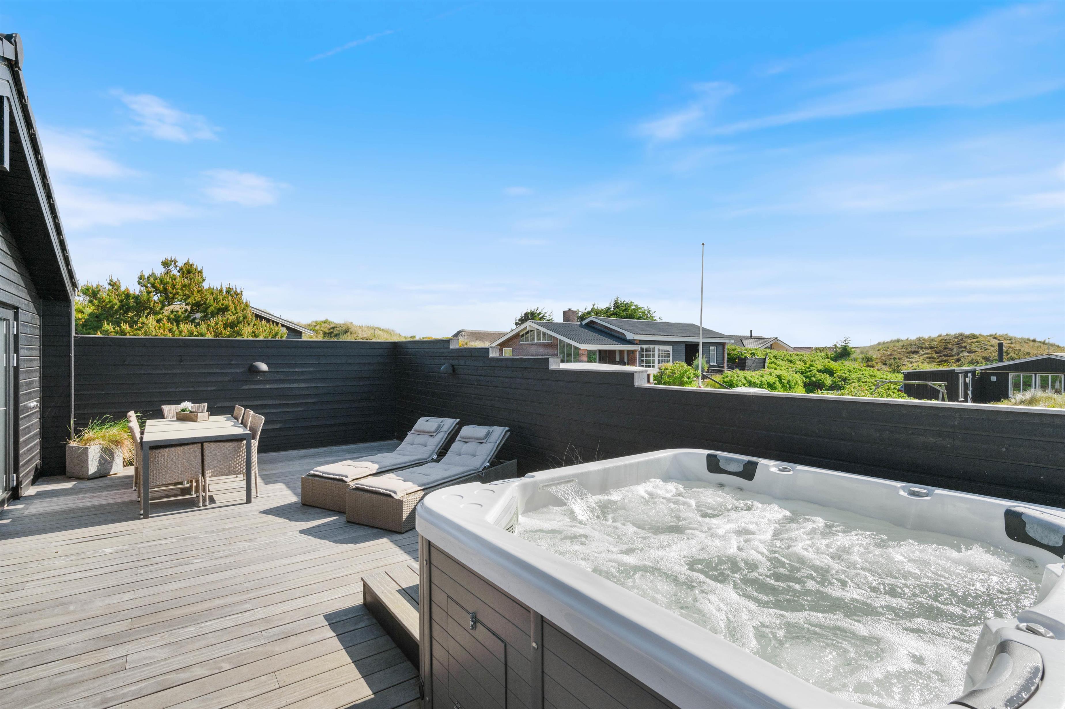 Rundt om feriehuset løber en stor, lukket terrasse med delvis overdækning og afskærmning. Her kan I rigtigt nyde de naturskønne omgivelser, og skal der skrues ekstra op for wellness-fornemmelsen, kan I tænde op i det lækre udendørs spabad. Den afslappende session i udespaen kan passende nydes med et koldt glas rosévin ved siden af, takket være feriehusets vinkøleskab.