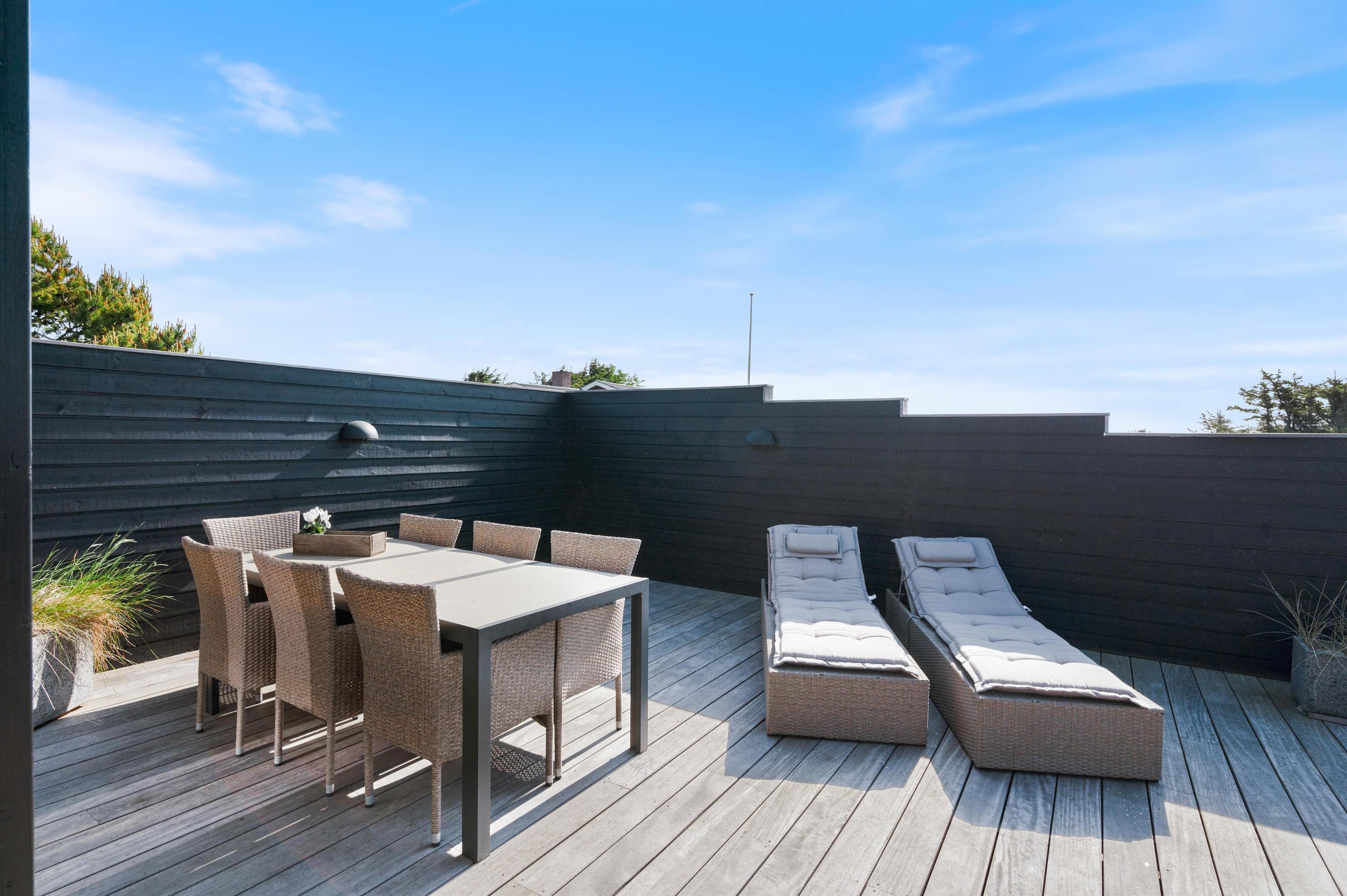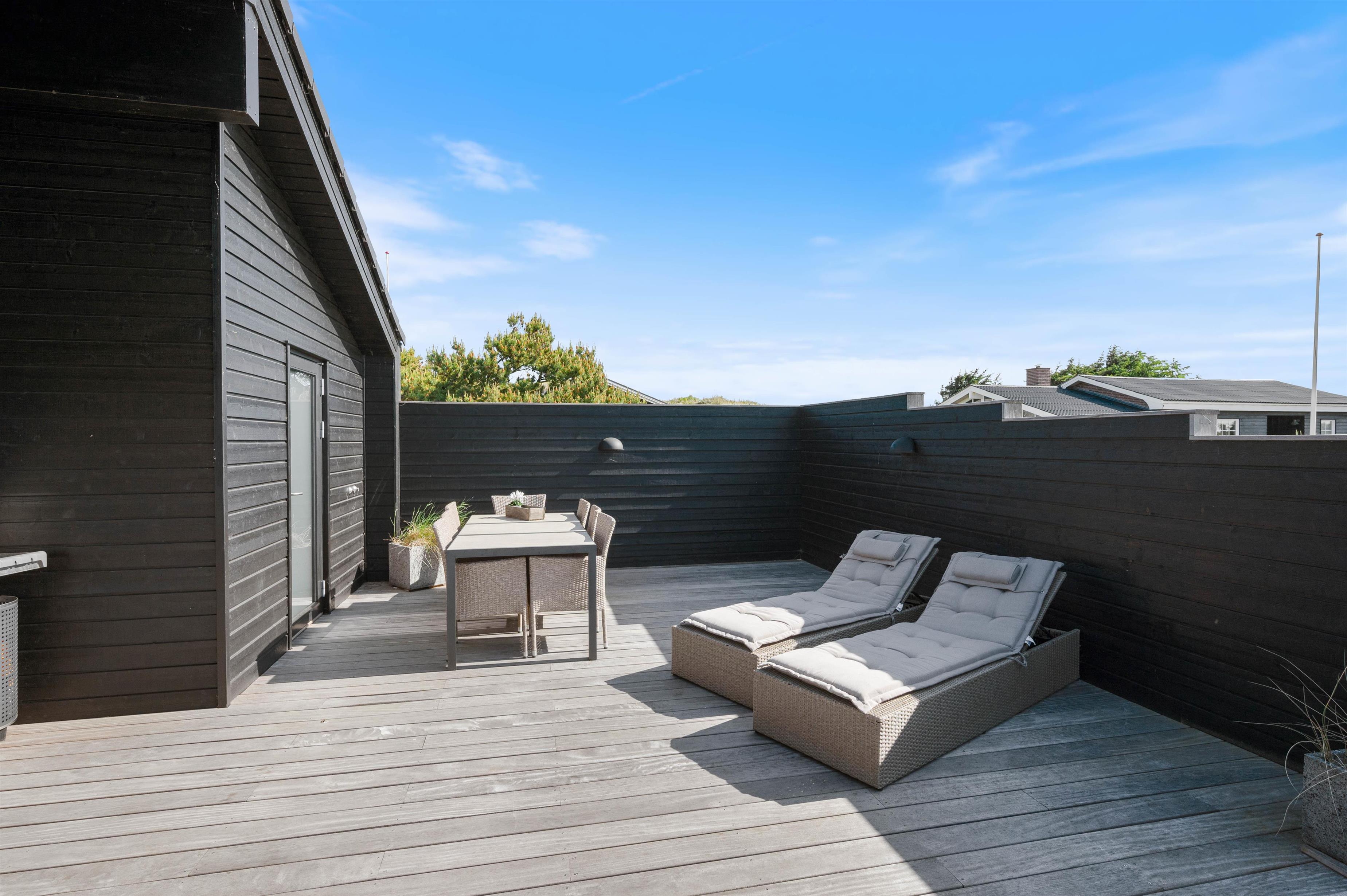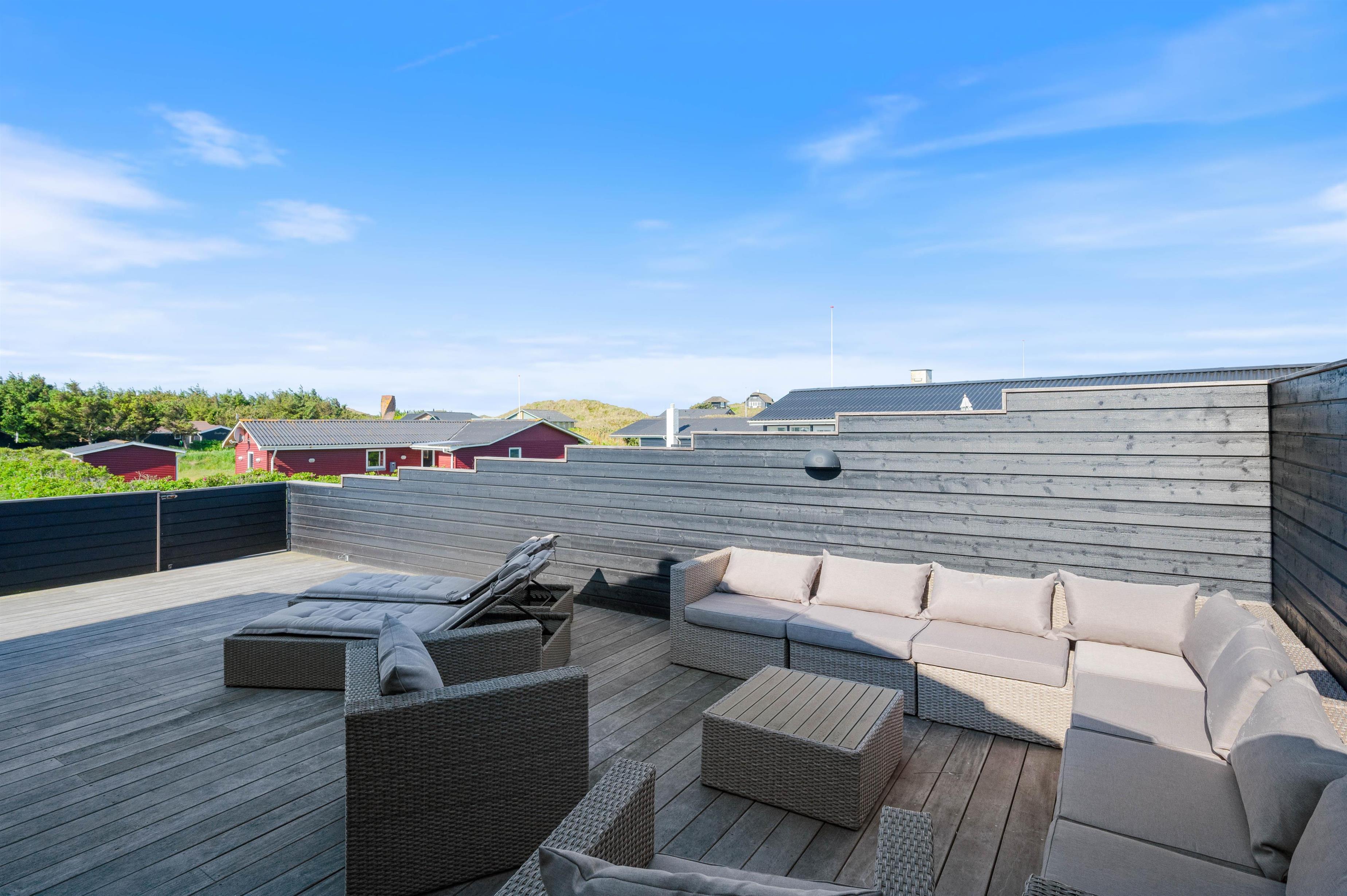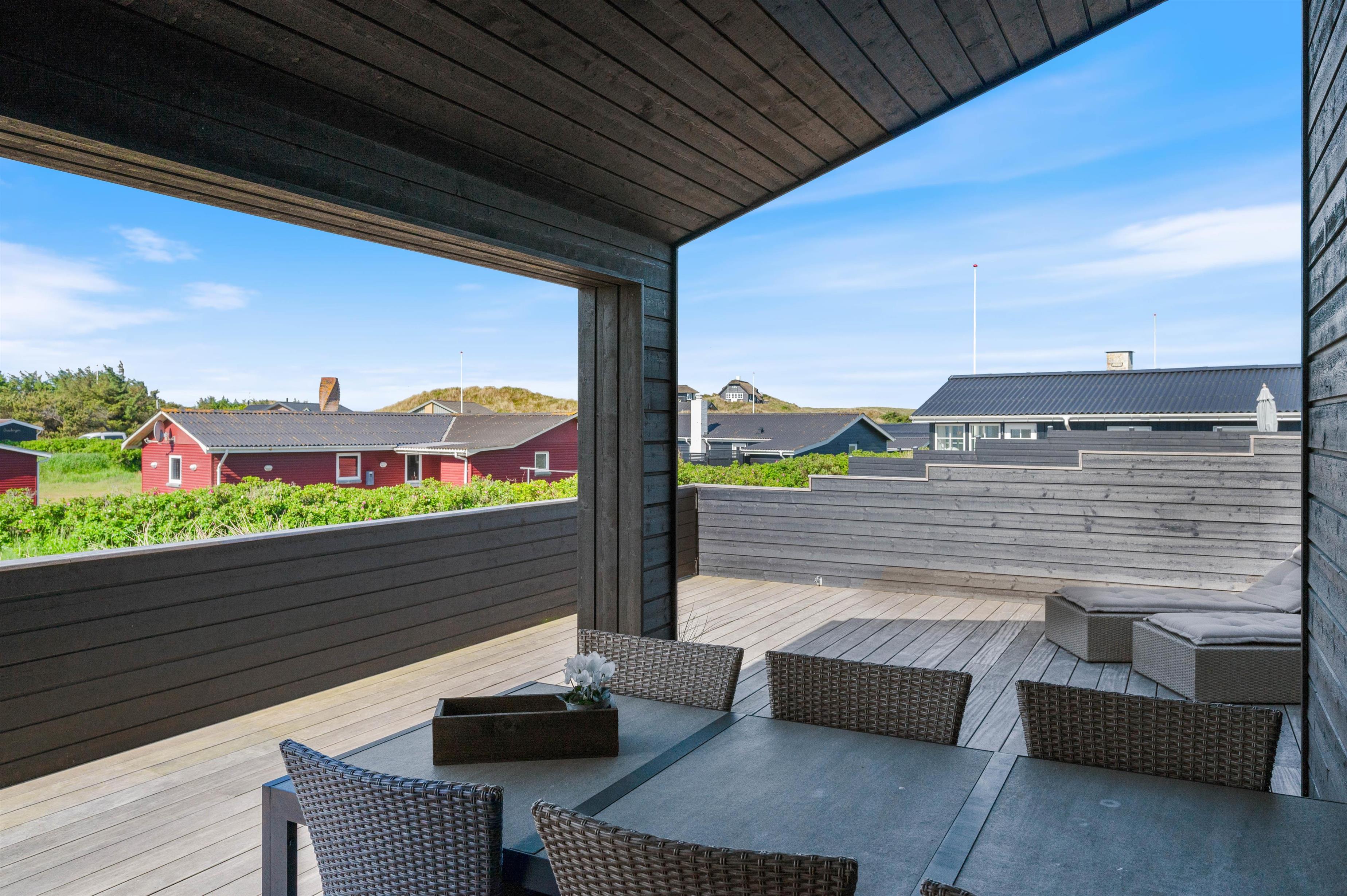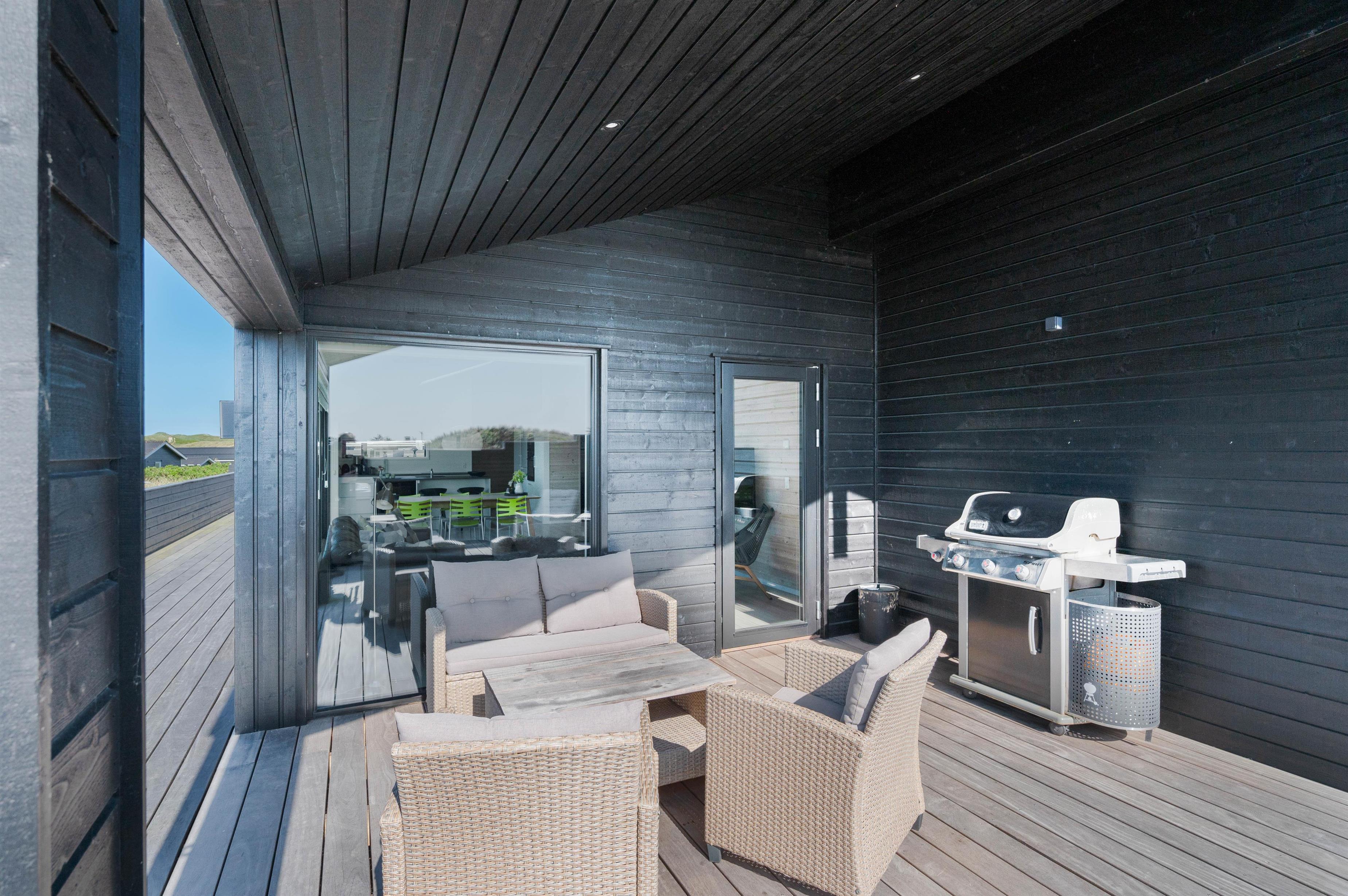 Rundt om feriehuset løber en stor, lukket terrasse med delvis overdækning og afskærmning. Her kan I rigtigt nyde de naturskønne omgivelser, og skal der skrues ekstra op for wellness-fornemmelsen, kan I tænde op i det lækre udendørs spabad. Den afslappende session i udespaen kan passende nydes med et koldt glas rosévin ved siden af, takket være feriehusets vinkøleskab.