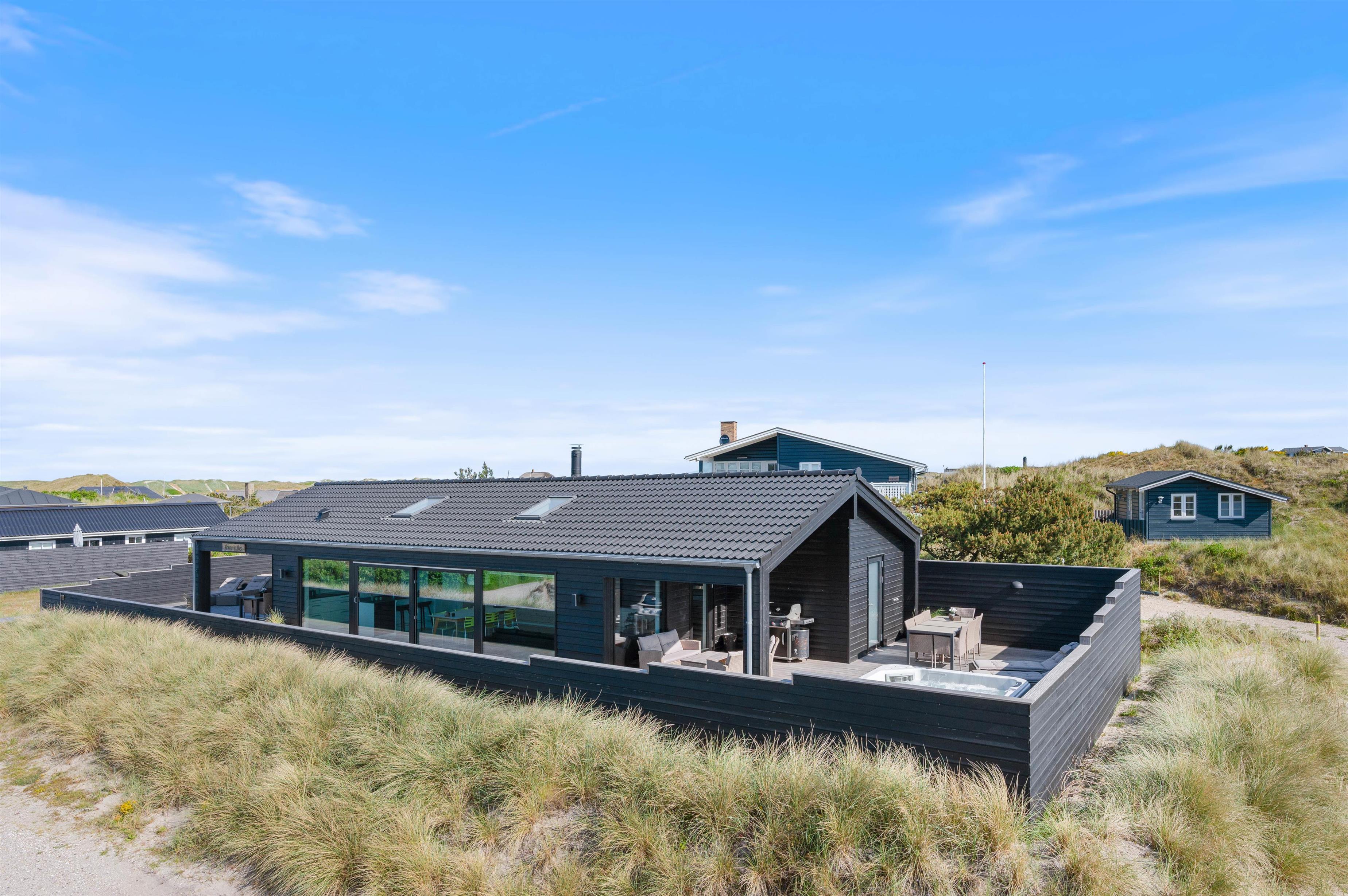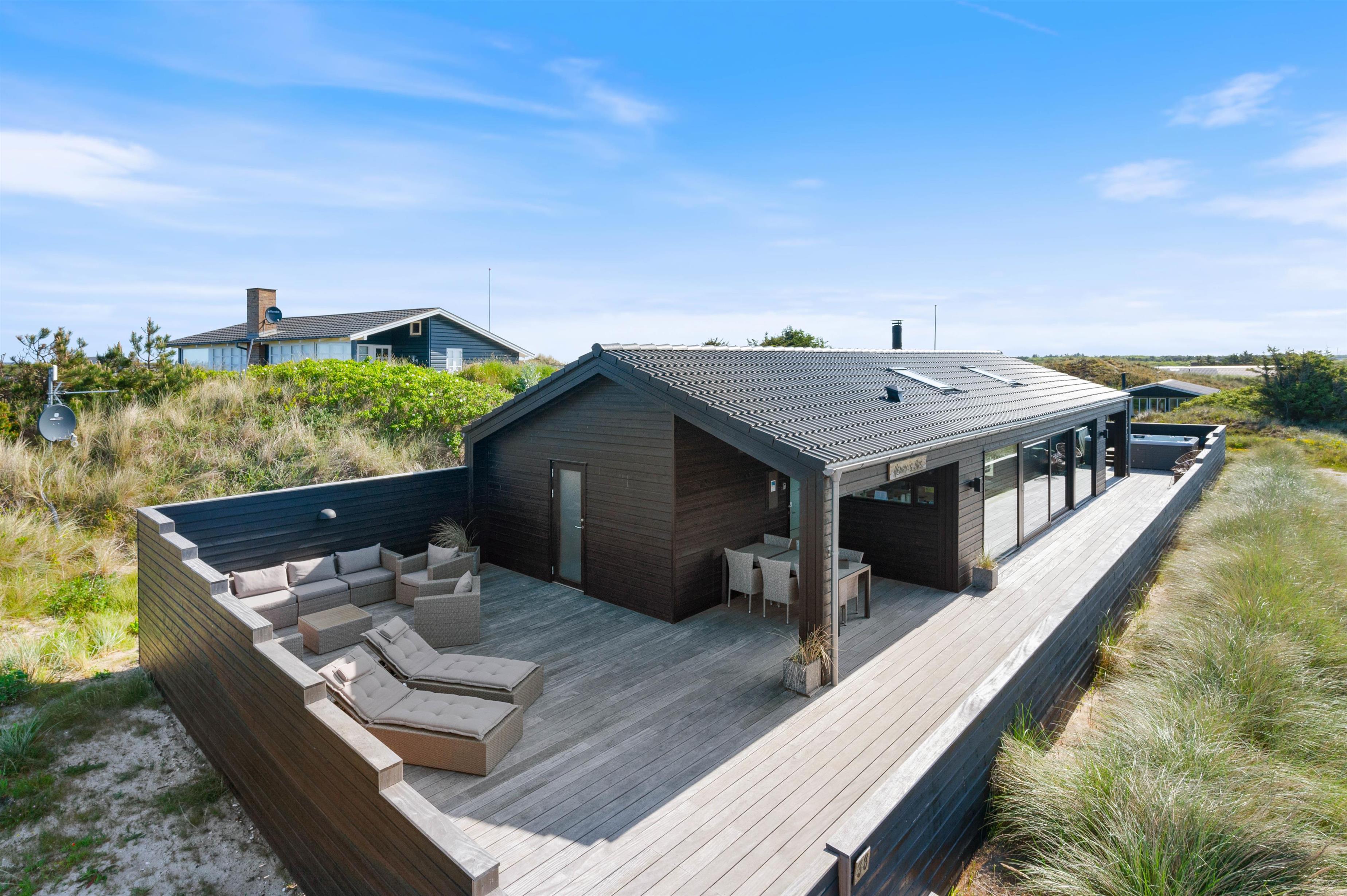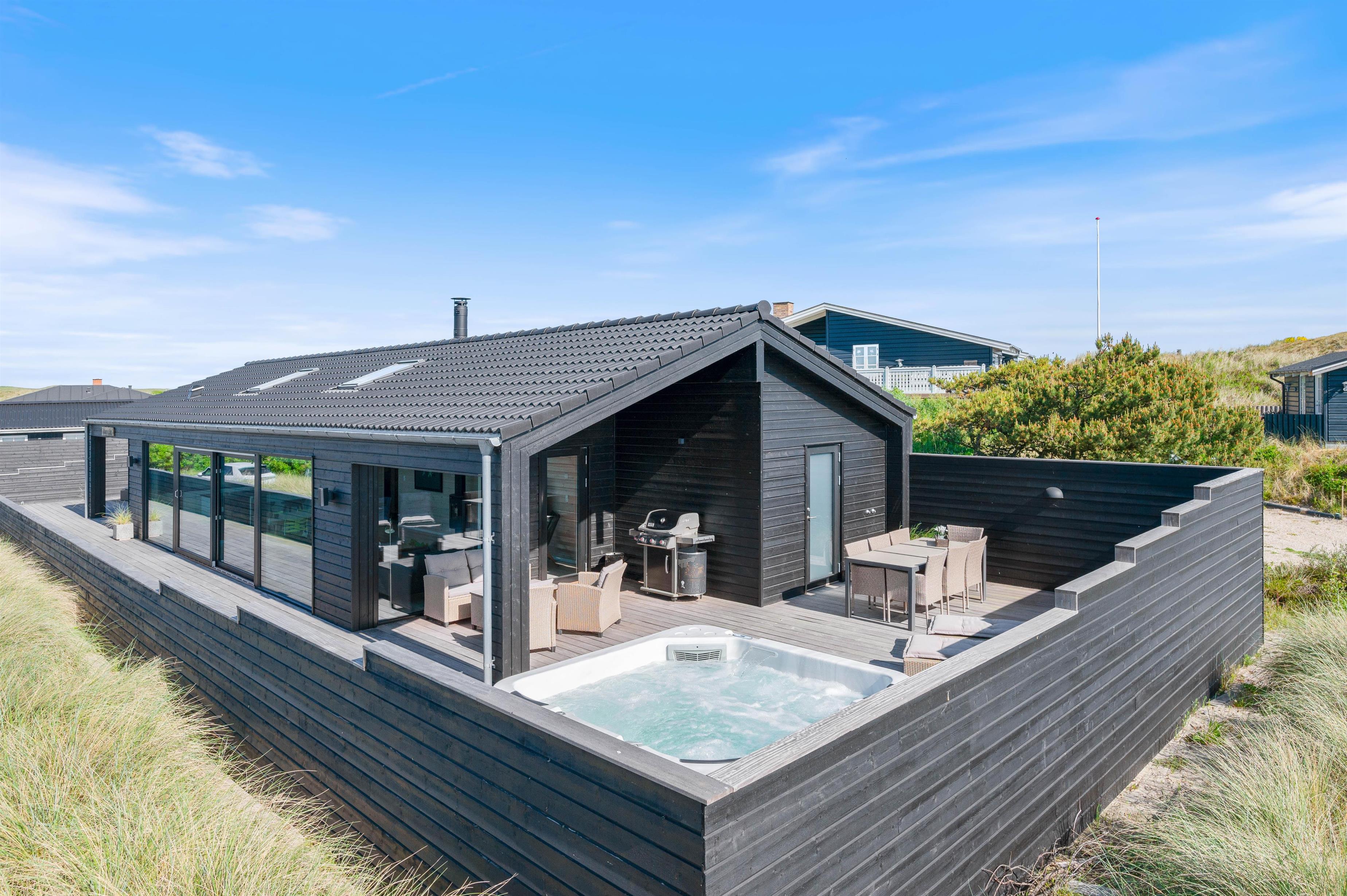 Længes I efter bred sandstrand og lyngklædt klitlandskab, og kan I også godt lide at holde ferie i ekstra skønne omgivelser? Så er dette sommerhus i Houvig på Lærkedalen 38, kun 400 meter fra Vesterhavet, det perfekte match til jer! Det feriehus der er lidt ud over det sædvanlige kan rumme op til 6 personer og har flere fantastiske highlights – blandt andet sauna, vinkøleskab og en lækker 150m2 stor terrasse med udendørs spa.