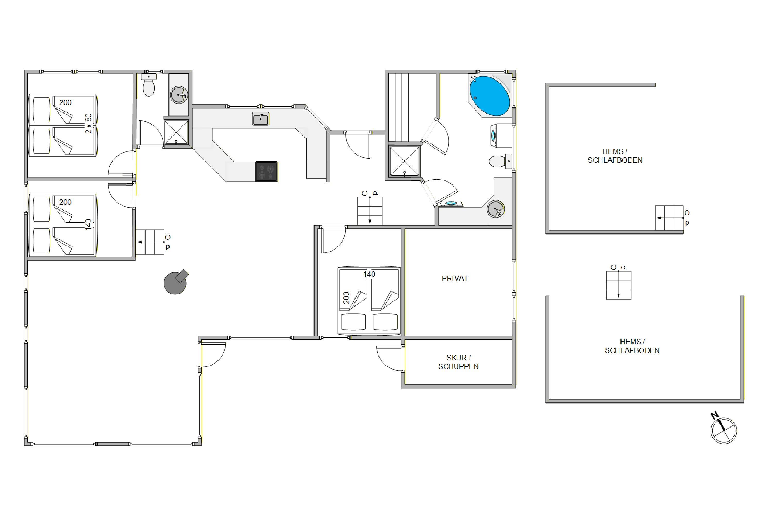 Her finder I tre hyggelige soveværelser med plads til i alt 6 personer, hvor I kan nyde en god nats søvn. Med to badeværelser er der også god plads til at gøre jer klar til dagens eventyr. Efter en dag fyldt med oplevelser kan I hygge jer sammen i stuen, hvor brændeovnen skaber en dejlig varm stemning. Sommerhusets køkken er fuldt udstyret, så I kan lave lækre måltider uden besvær – og med opvaskemaskinen ordnes opvasken nemt.