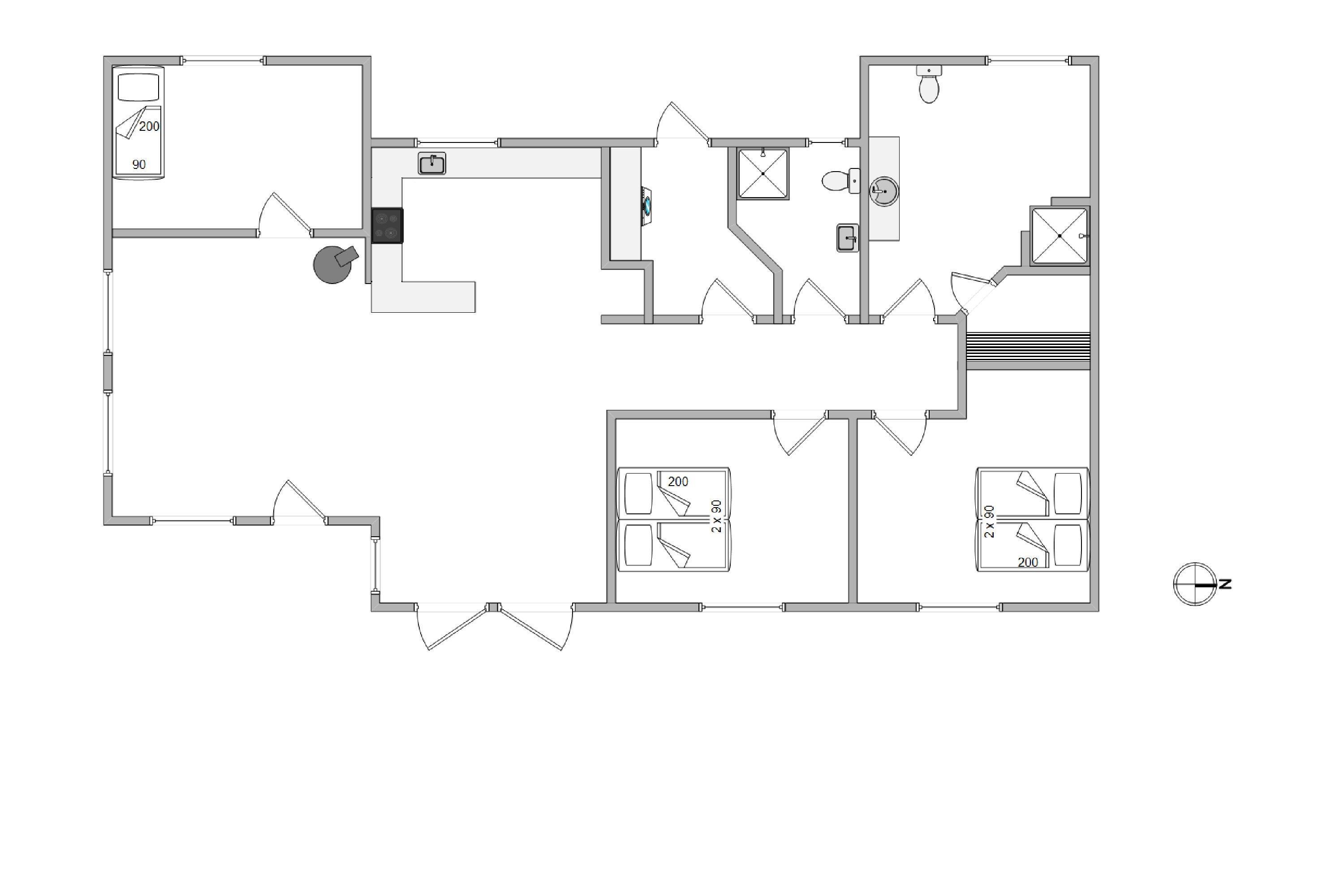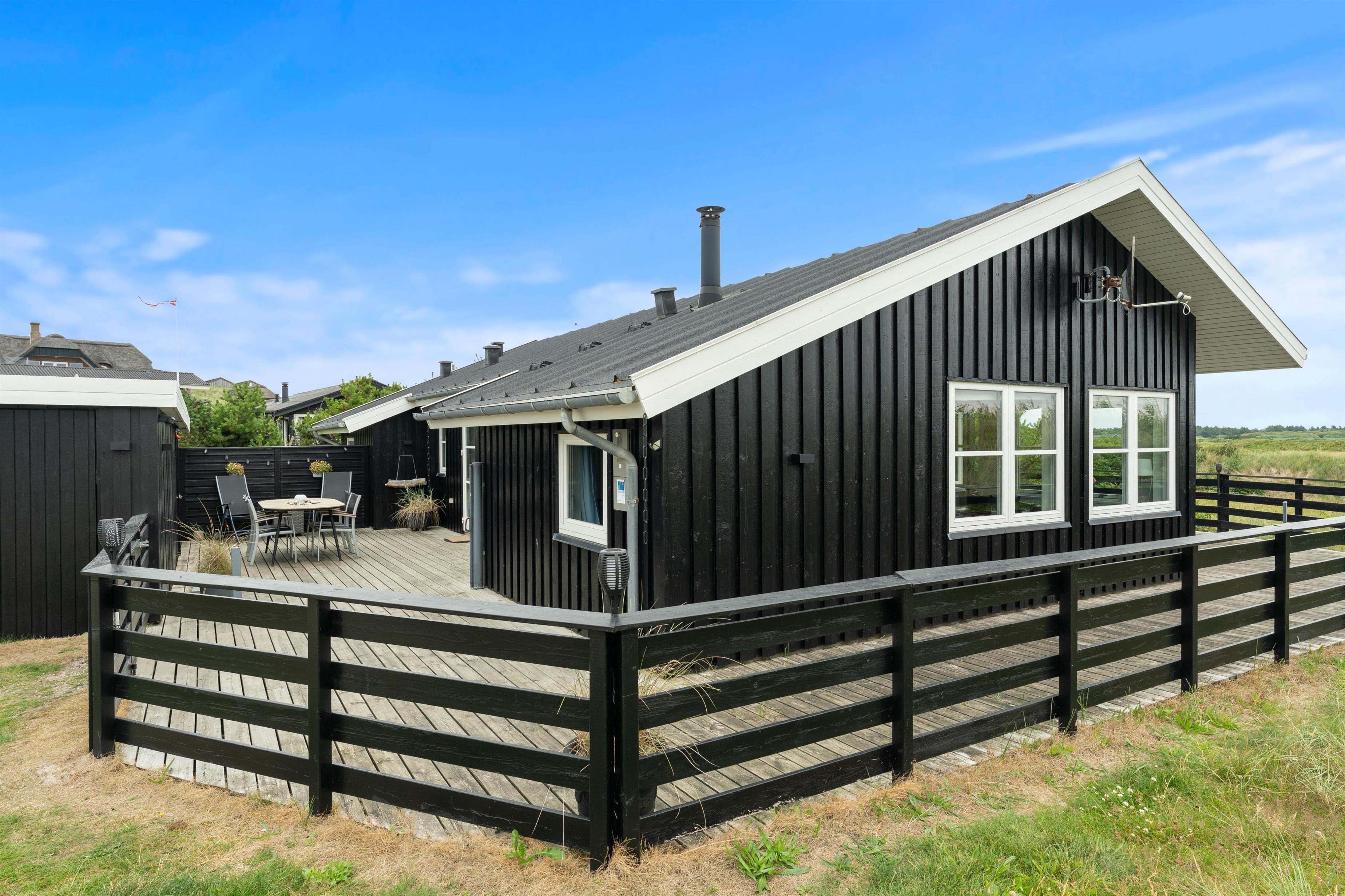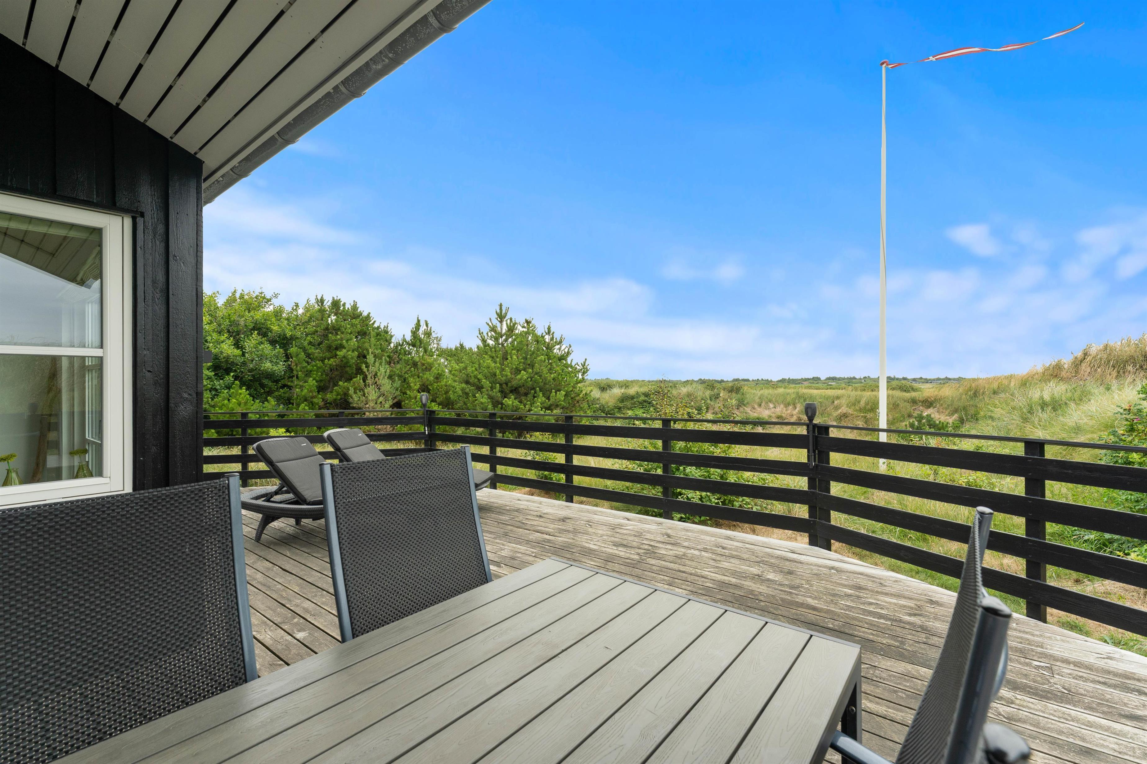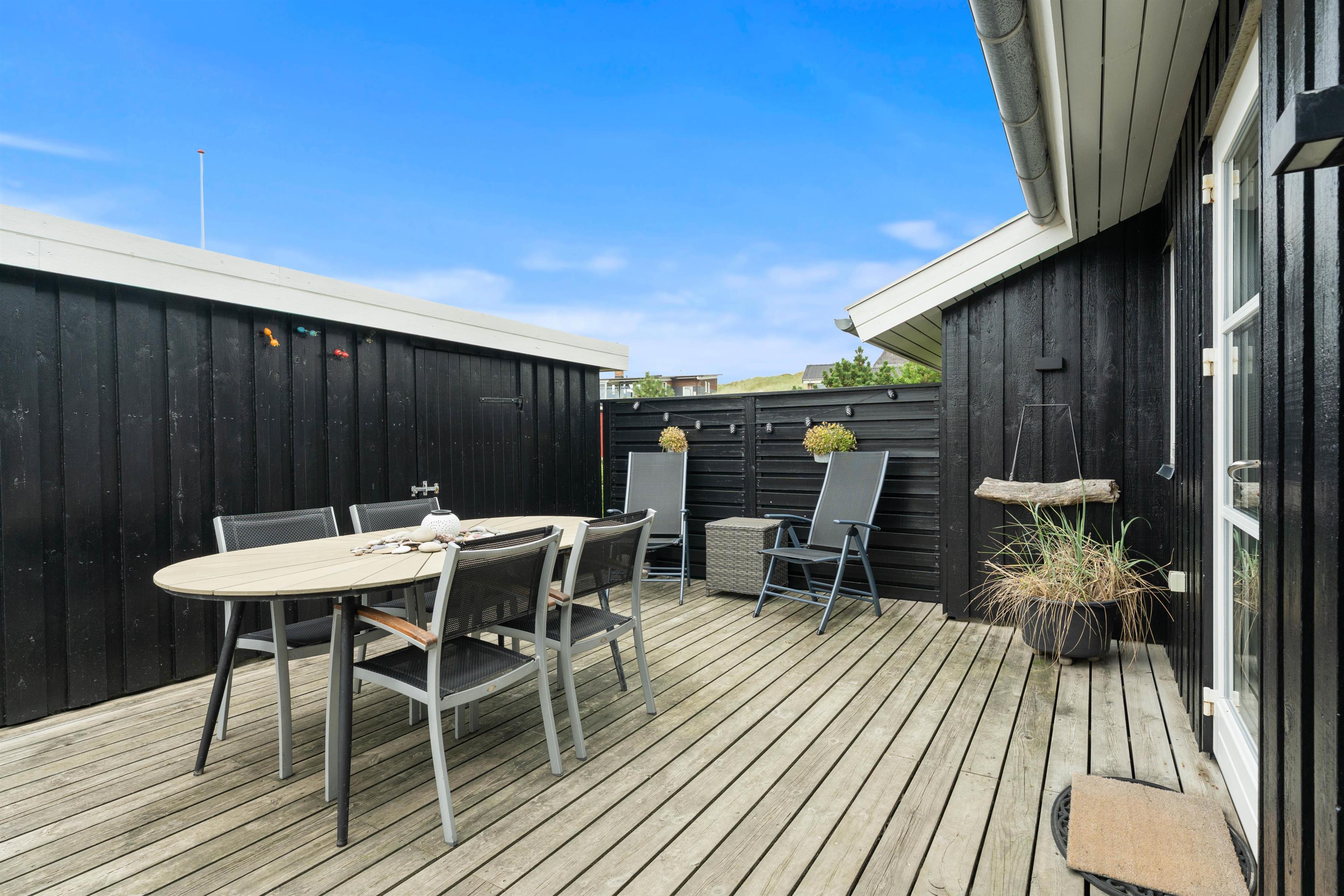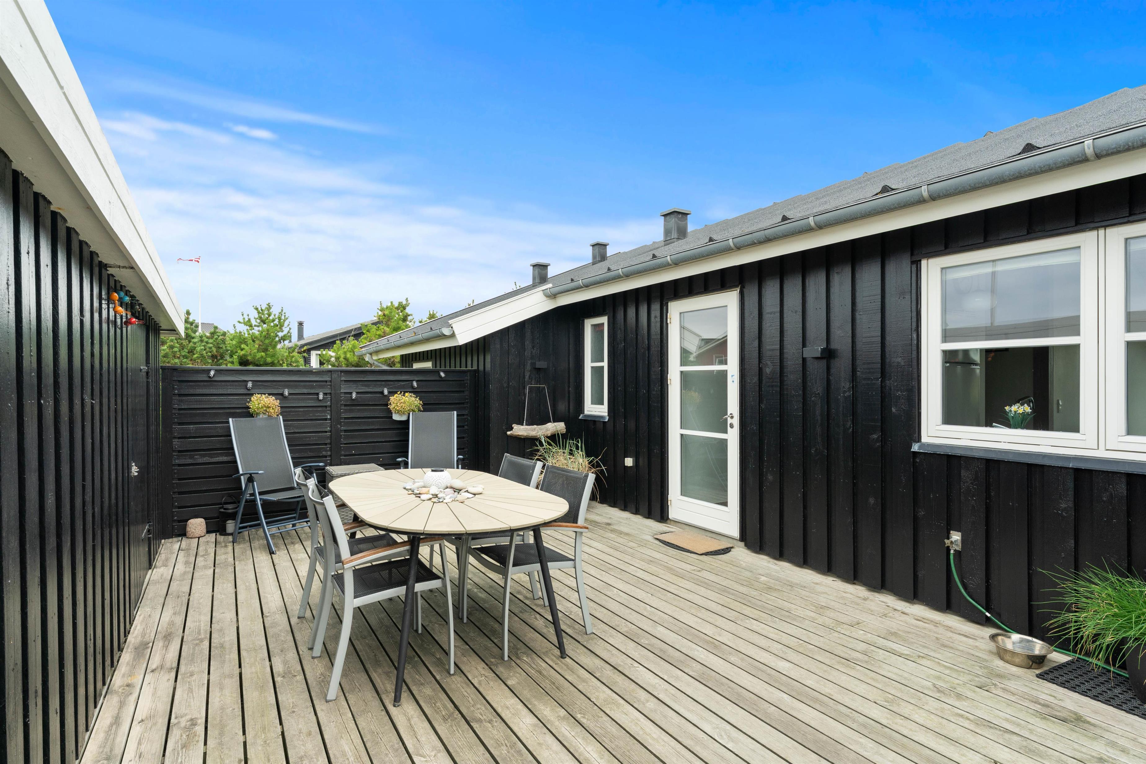 Der er en skøn træterrasse på tre sider af huset. Mod øst er den helt lukket og mod vest er den delvist afskærmet, beliggende mellem huset og redskabsrummet. her kan I rigtig slappa af og lade batterierne op i liggestolene på terrassen. I kan dog uden bekymringer lade børn lege her på terrassen, da den er helt lukket
