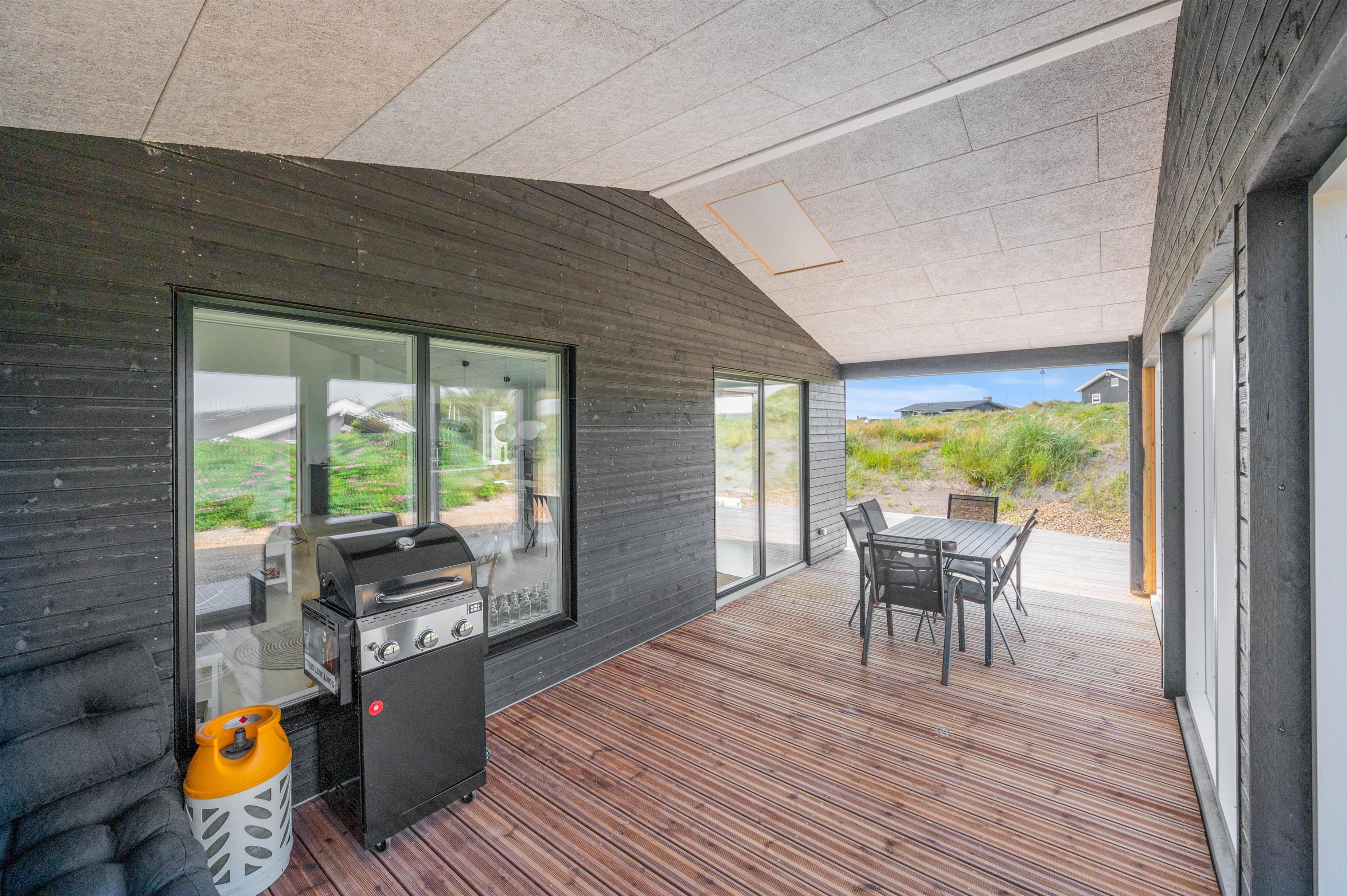 Sommerhuset er omgivet af en skøn træterrasse, hvor der er både havemøbler og grill til fri afbenyttelse. Den overdækkede del af terrassen gør, at man er afskærmet fra vind og vejr og kan sidde og nyde solens stråler i en liggestol, mens man læser en god bog eller drikker en kop kaffe.