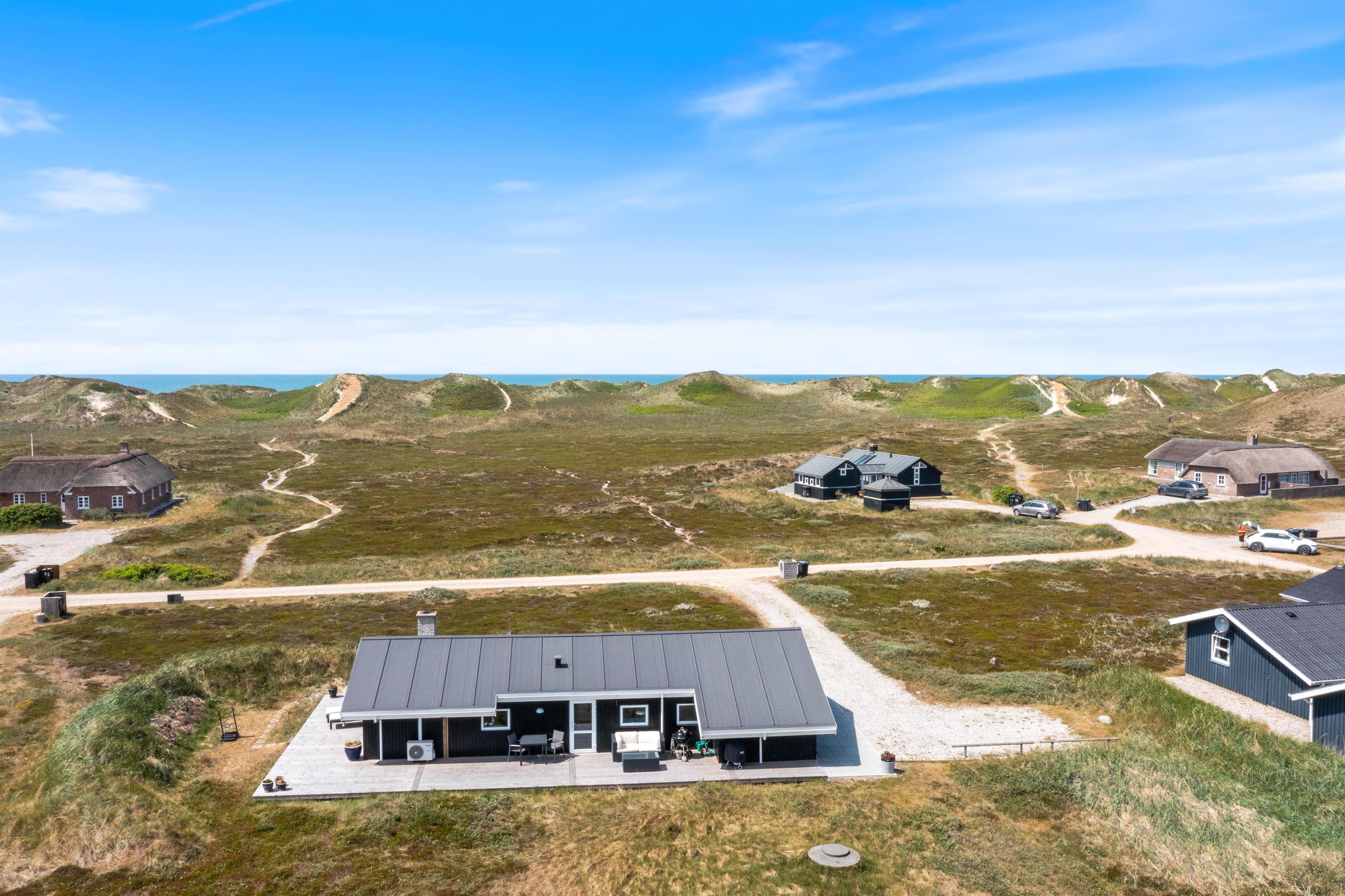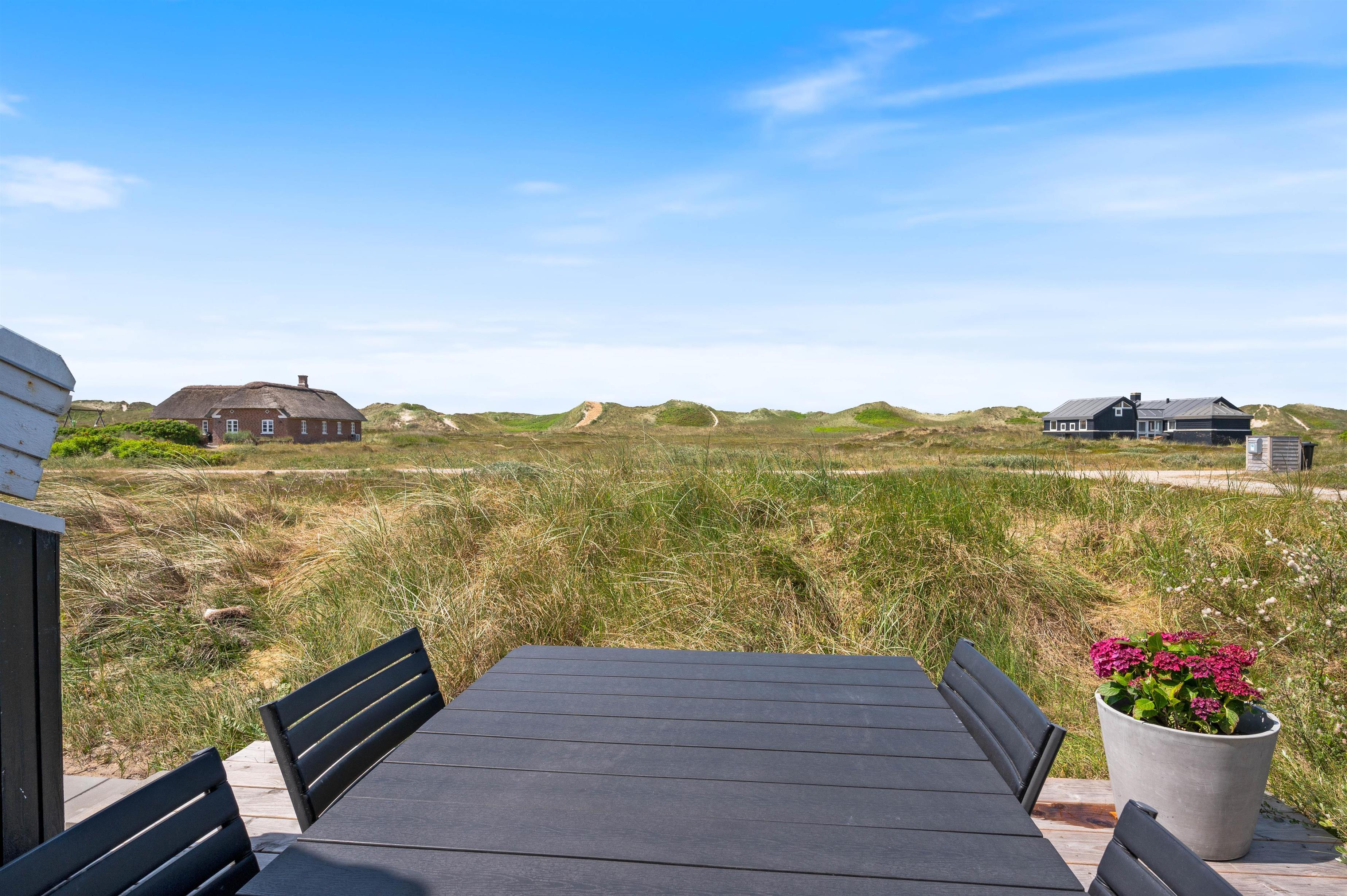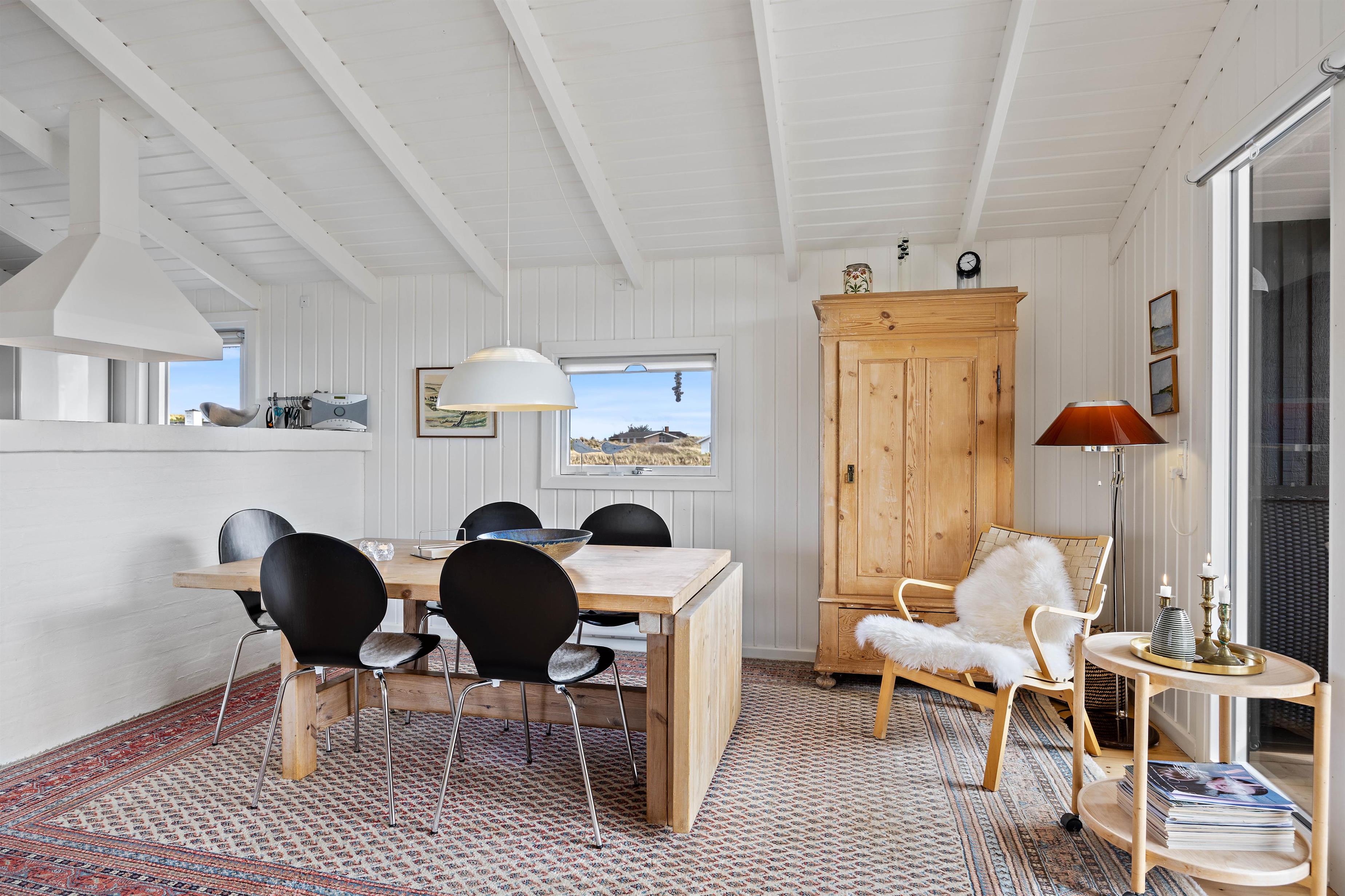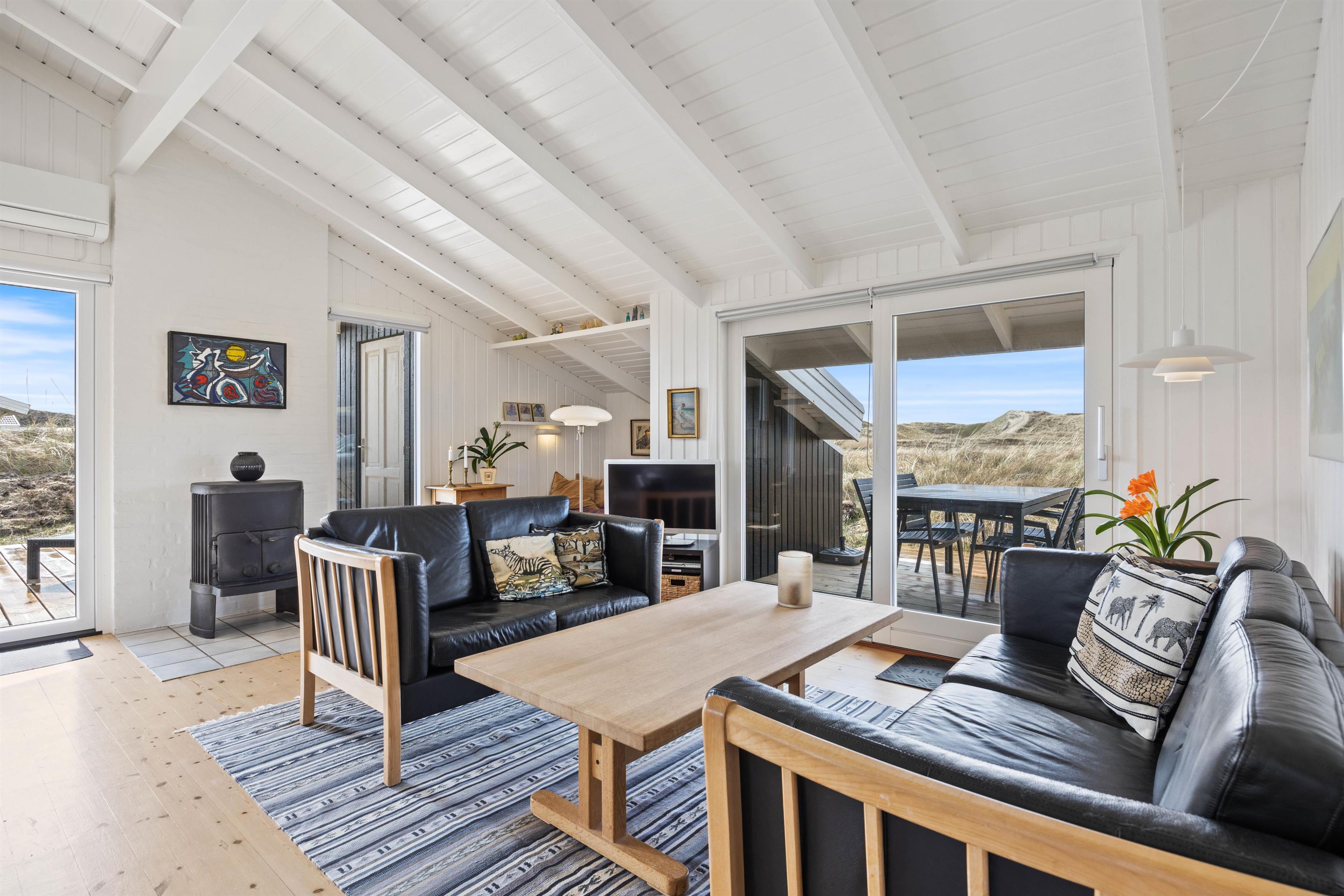 Et særligt højdepunkt i stuen er alkoven, hvor du kan sætte dig til rette og fordybe dig i en spændende bog, mens du lytter til den knitrende ild i brændeovnen. Brændeovnen i feriehuset giver hyggelig varme og skaber samtidig den typiske feriehusstemning. Ud over brændeovnen sørger den energivenlige luft/luft-varmepumpe for et behageligt indeklima. Vinduerne i stuen lukker ikke kun masser af dagslys ind, men giver dig også en panoramaudsigt over klitlandskabet i Houvig.
