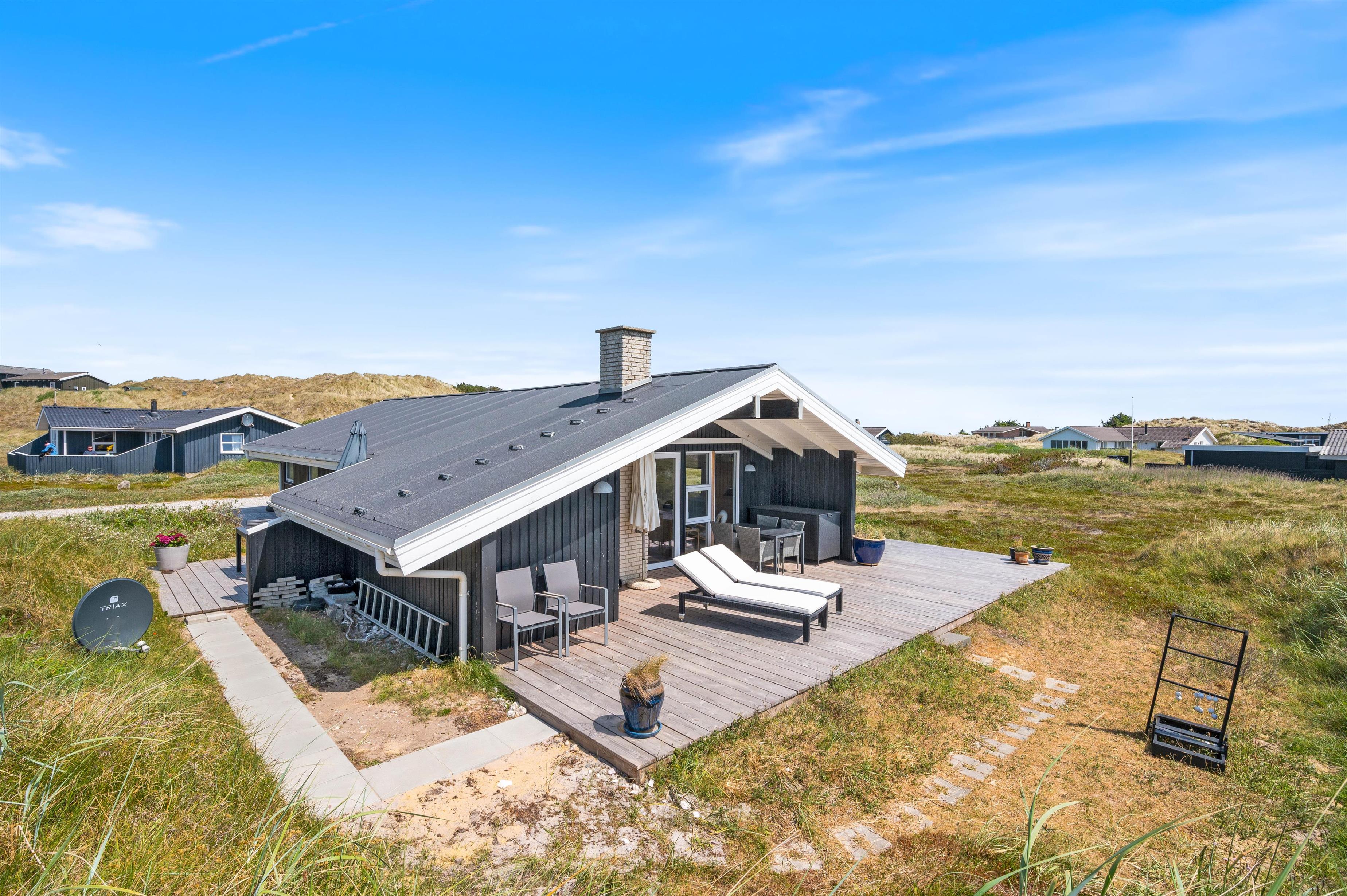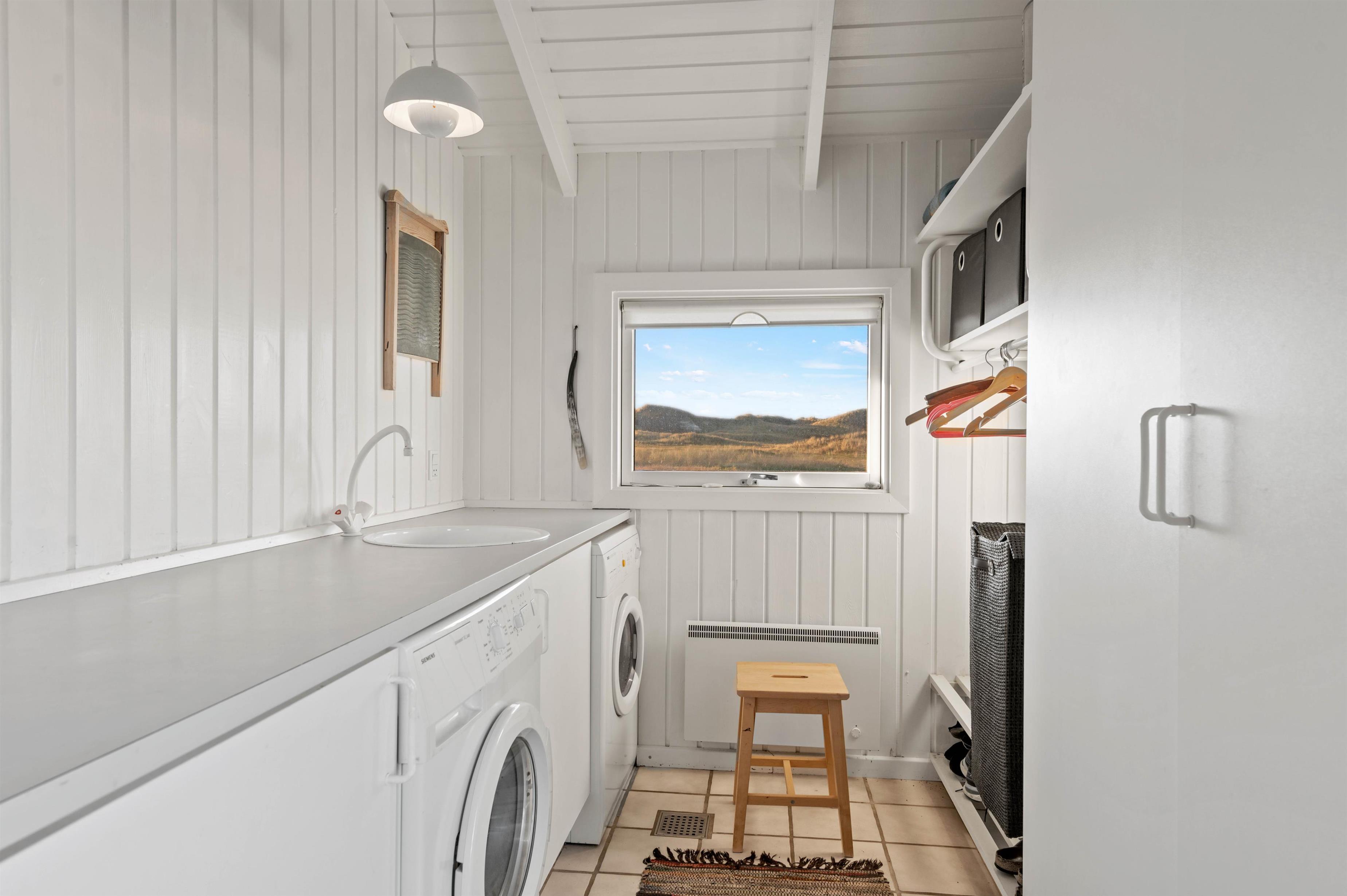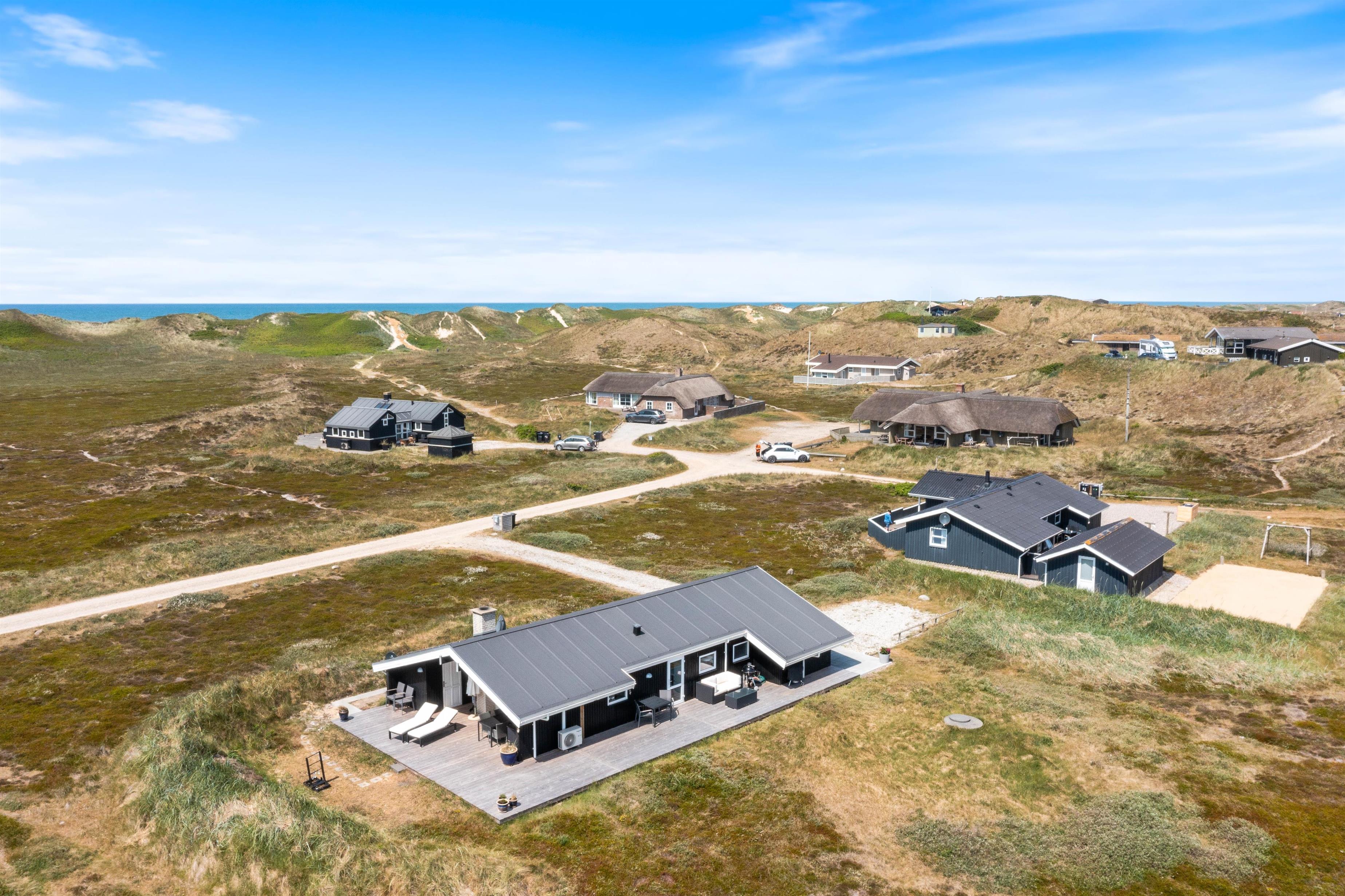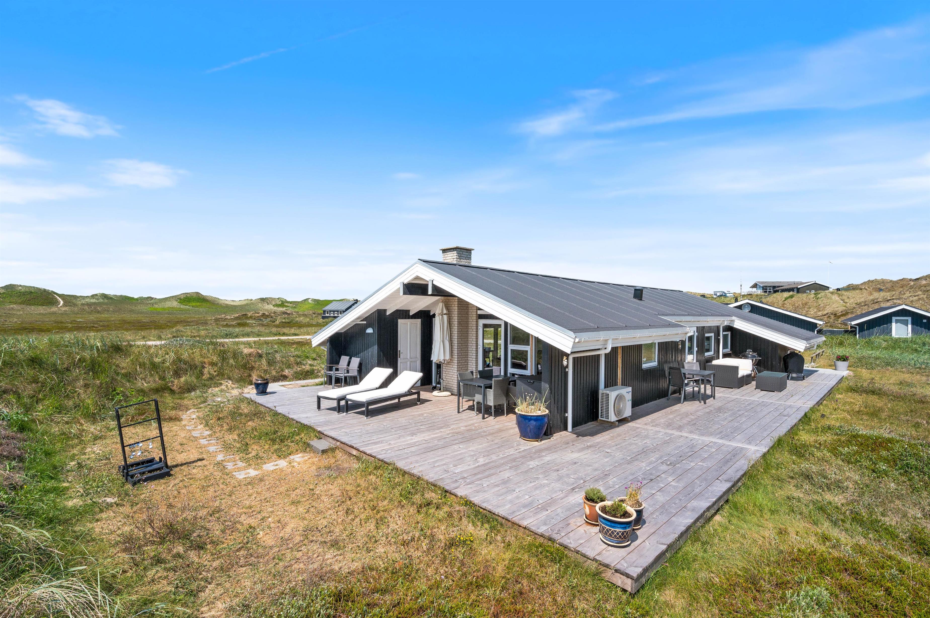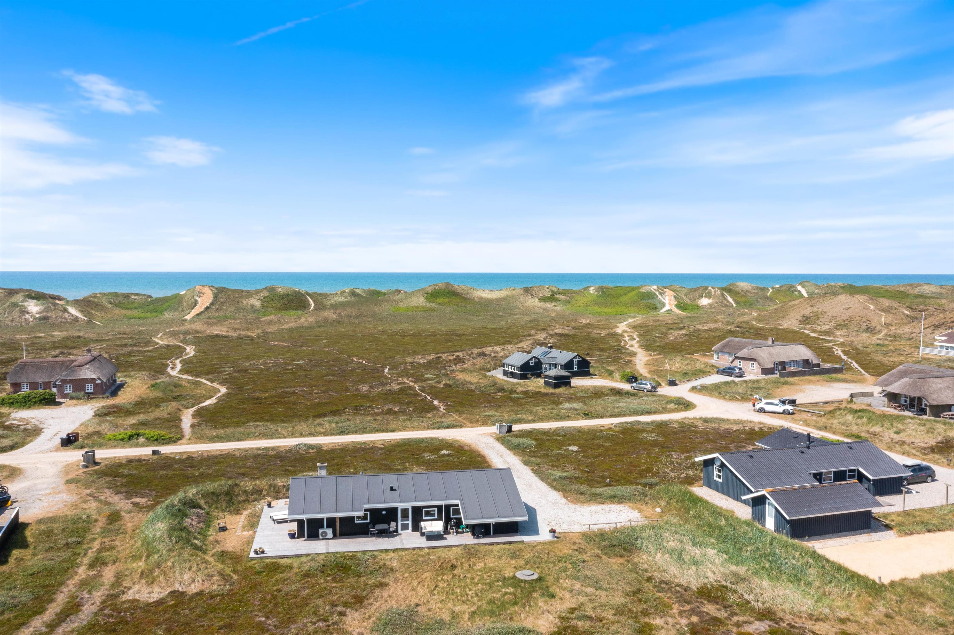 Et særligt højdepunkt i stuen er alkoven, hvor du kan sætte dig til rette og fordybe dig i en spændende bog, mens du lytter til den knitrende ild i brændeovnen. Brændeovnen i feriehuset giver hyggelig varme og skaber samtidig den typiske feriehusstemning. Ud over brændeovnen sørger den energivenlige luft/luft-varmepumpe for et behageligt indeklima. Vinduerne i stuen lukker ikke kun masser af dagslys ind, men giver dig også en panoramaudsigt over klitlandskabet i Houvig.