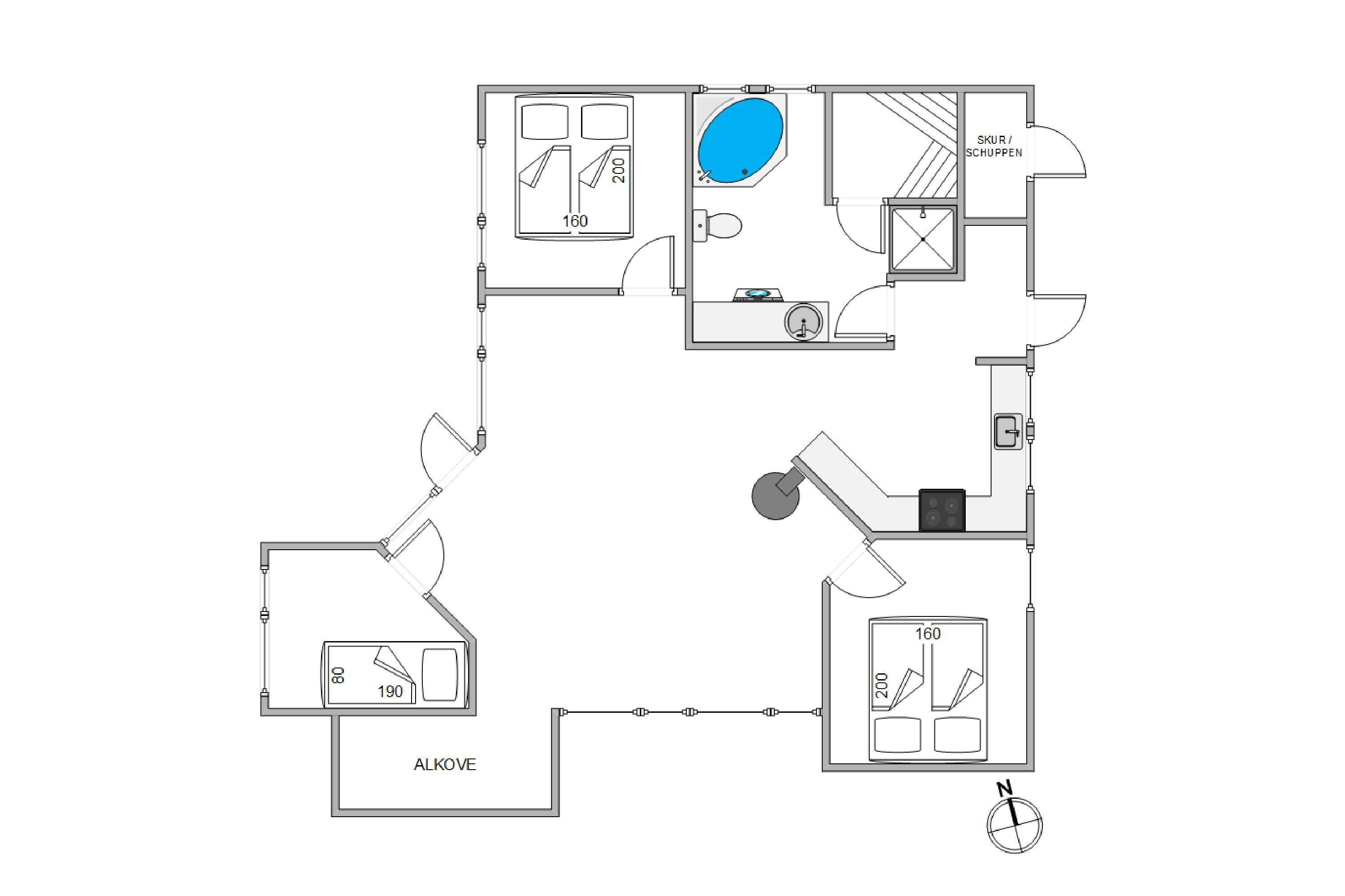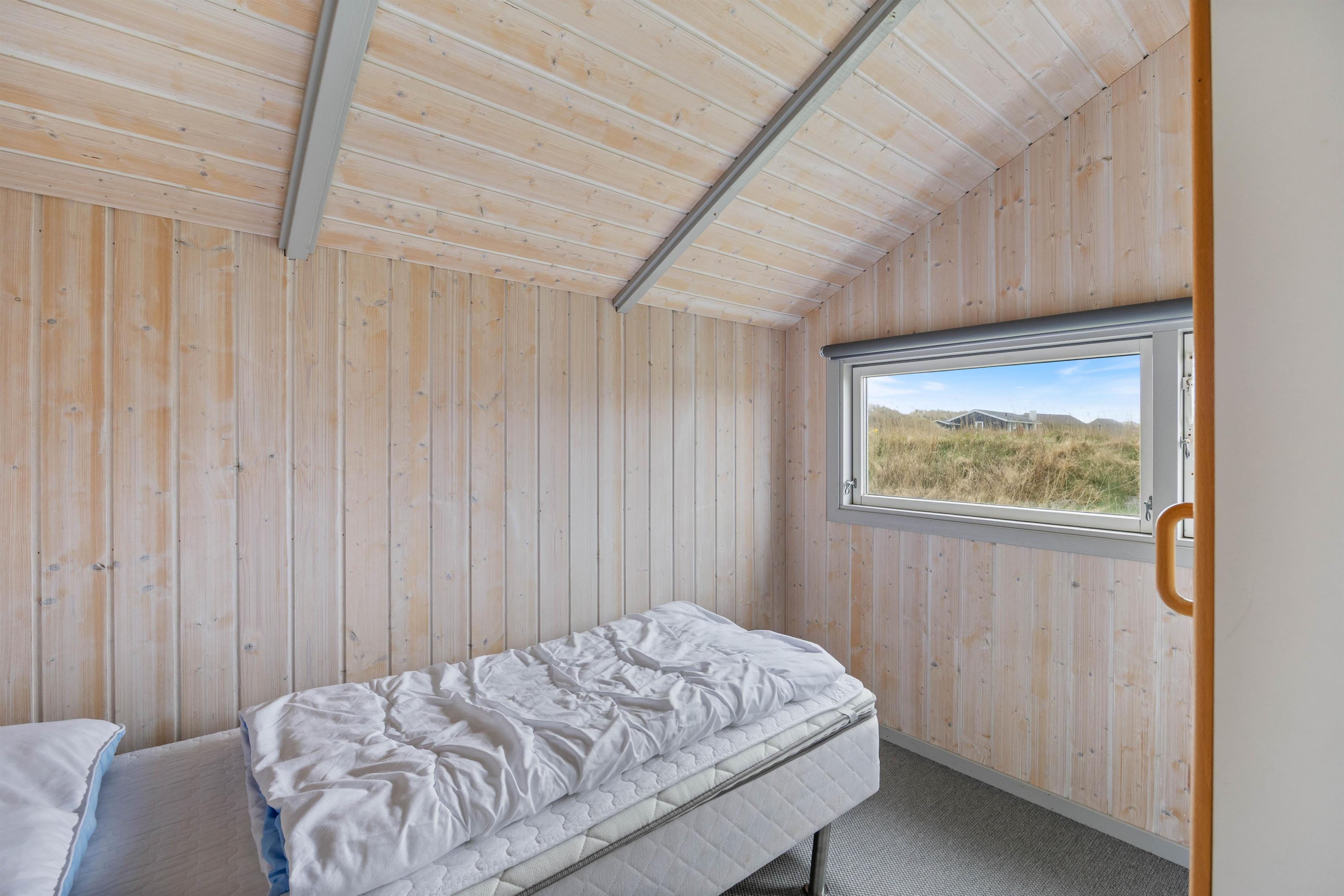 I soveværelserne er der to dobbeltsenge og en enkeltseng samt store skaber til ferietøjet. Skal der vaskes noget under ferien, er der en vaskemaskine i badeværelset. Her findes desuden det dejlige spabad og der er tilgang til husets sauna, som byder på dejlig varme efter en lang tur på stranden.