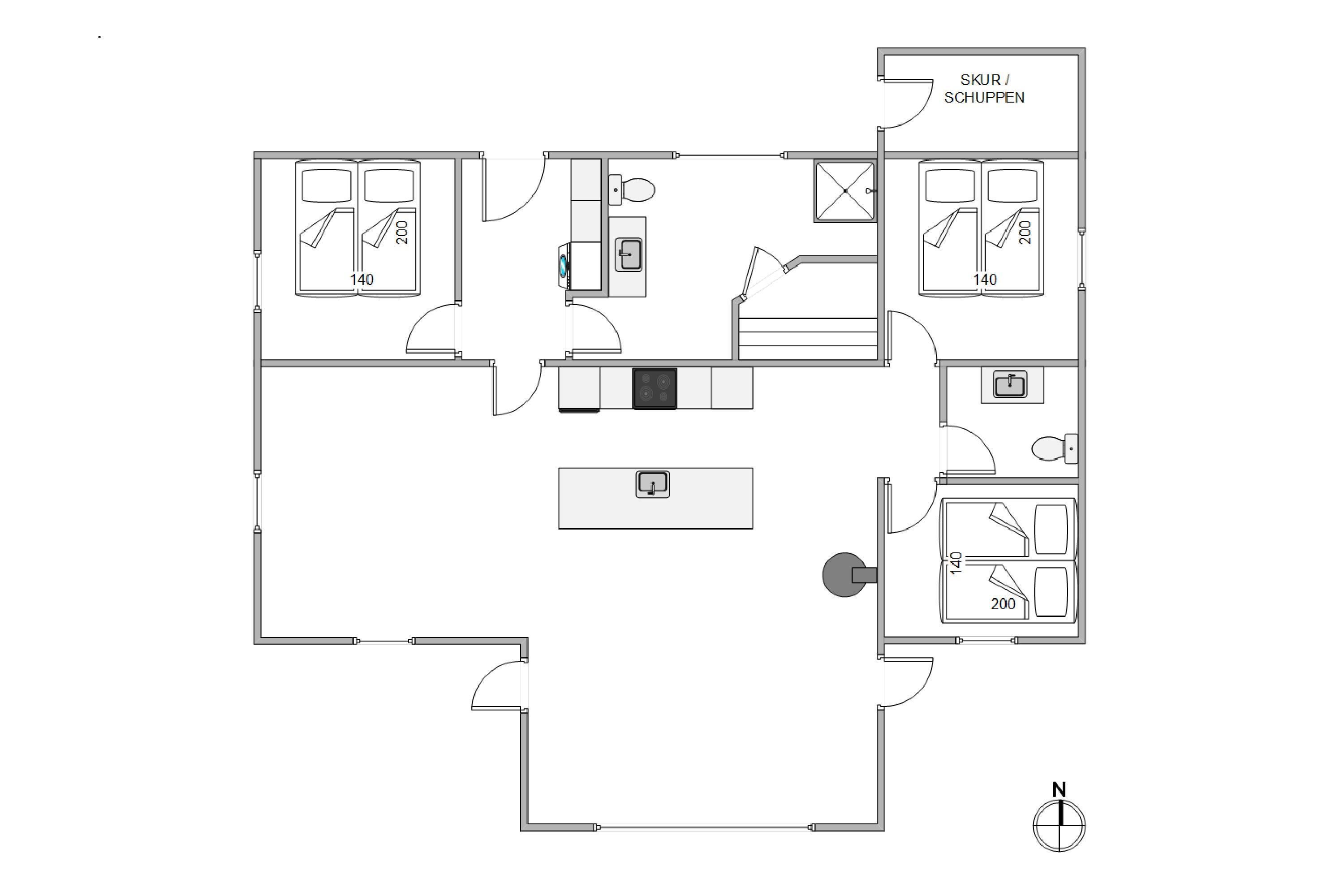 Sommerhuset er indrettet med 3 gode værelser, der alle er udstyret med behagelige dobbeltsenge. Herudover er der to toiletter, hvoraf det ene er udstyret med bruseniche. Det er også i dette badeværelse, at feriehusets dejlige sauna befinder sig. Her kan I læne jer tilbage og nyde den velgørende varme oven på en tur i Vesterhavet.