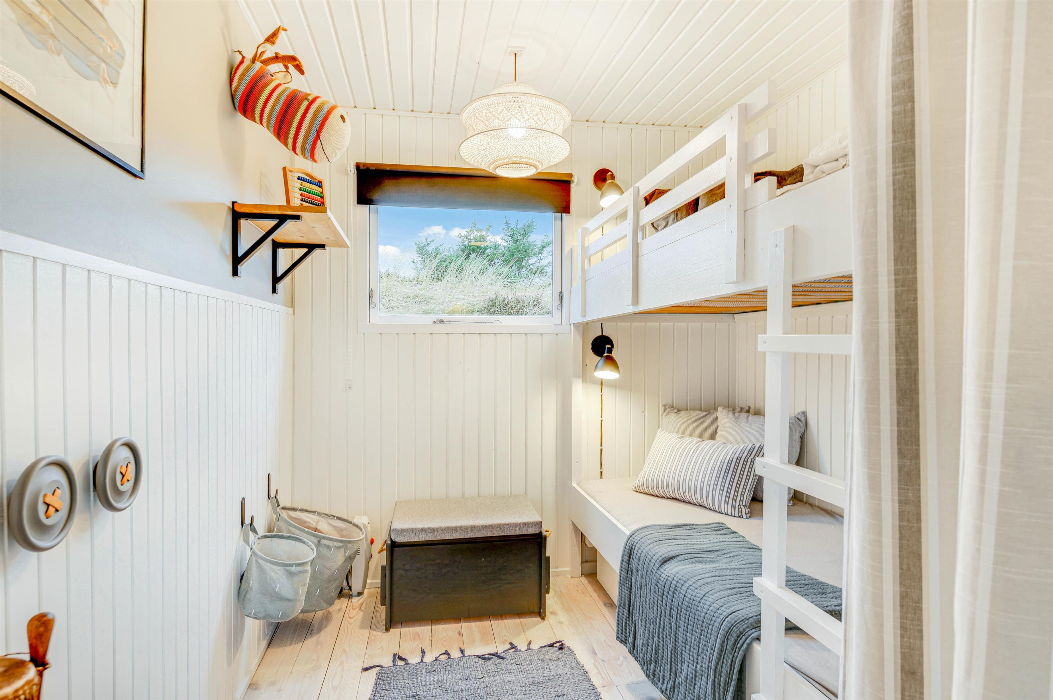 Køkkenet ligger separat fra stuen, og her kan I tilberede en dejlig middag, hvorefter I kan hygge jer på sofaen. Sovemulighederne i sommerhuset fordeler sig på 3 soverum, hvoraf det ene har køjeseng, og de 2 andre har dobbeltsenge. Sommerhuset har en fin, lille træterrasse, hvor I kan sidde og hygge med en god kop kaffe. Der er også en fliseterrasse.