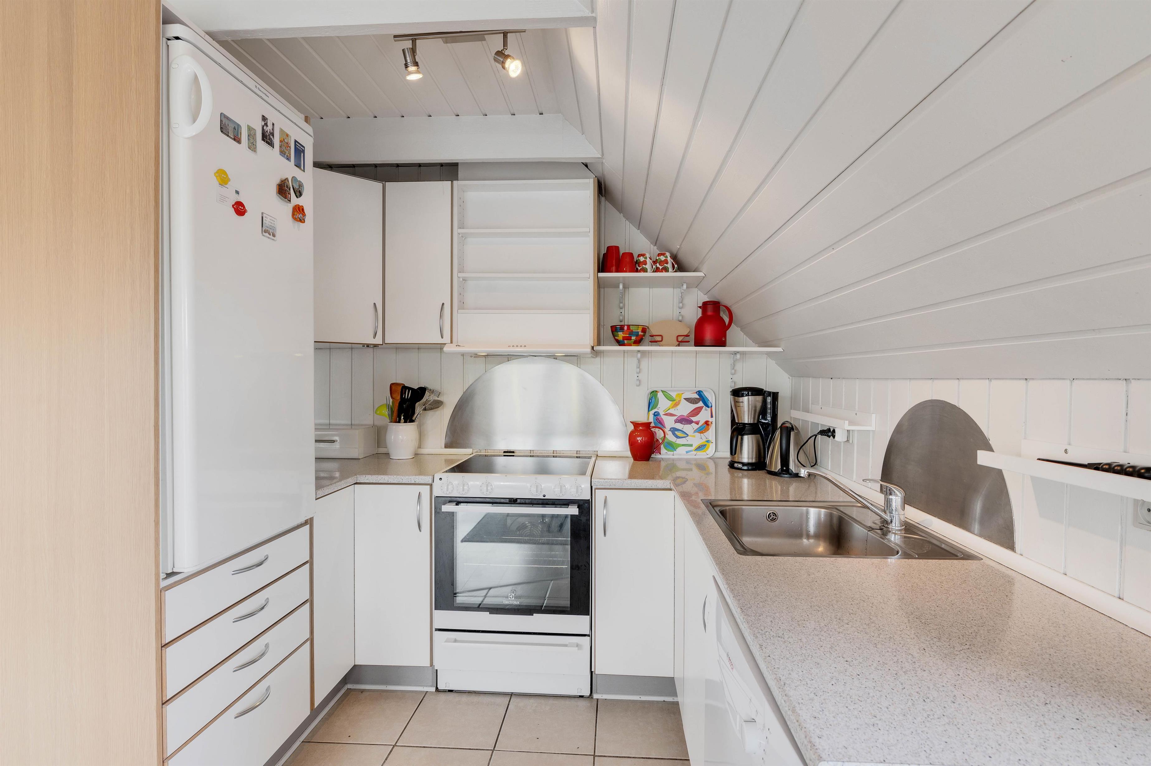 Den hyggelige stue er kombineret med køkkenet og er veludstyret med flotte møbler, bløde tekstiler, fladskærms-tv, DVD, radio og CD-afspiller. Her er selvfølgelig også en lun brændeovn, som sørger for at skrue hyggestemningen endnu højere op med sin afslappende knitren. I den velindrettede køkkenafdeling finder I blandt andet køleskab med 80 liters frysekapacitet, mikroovn og opvaskemaskine.