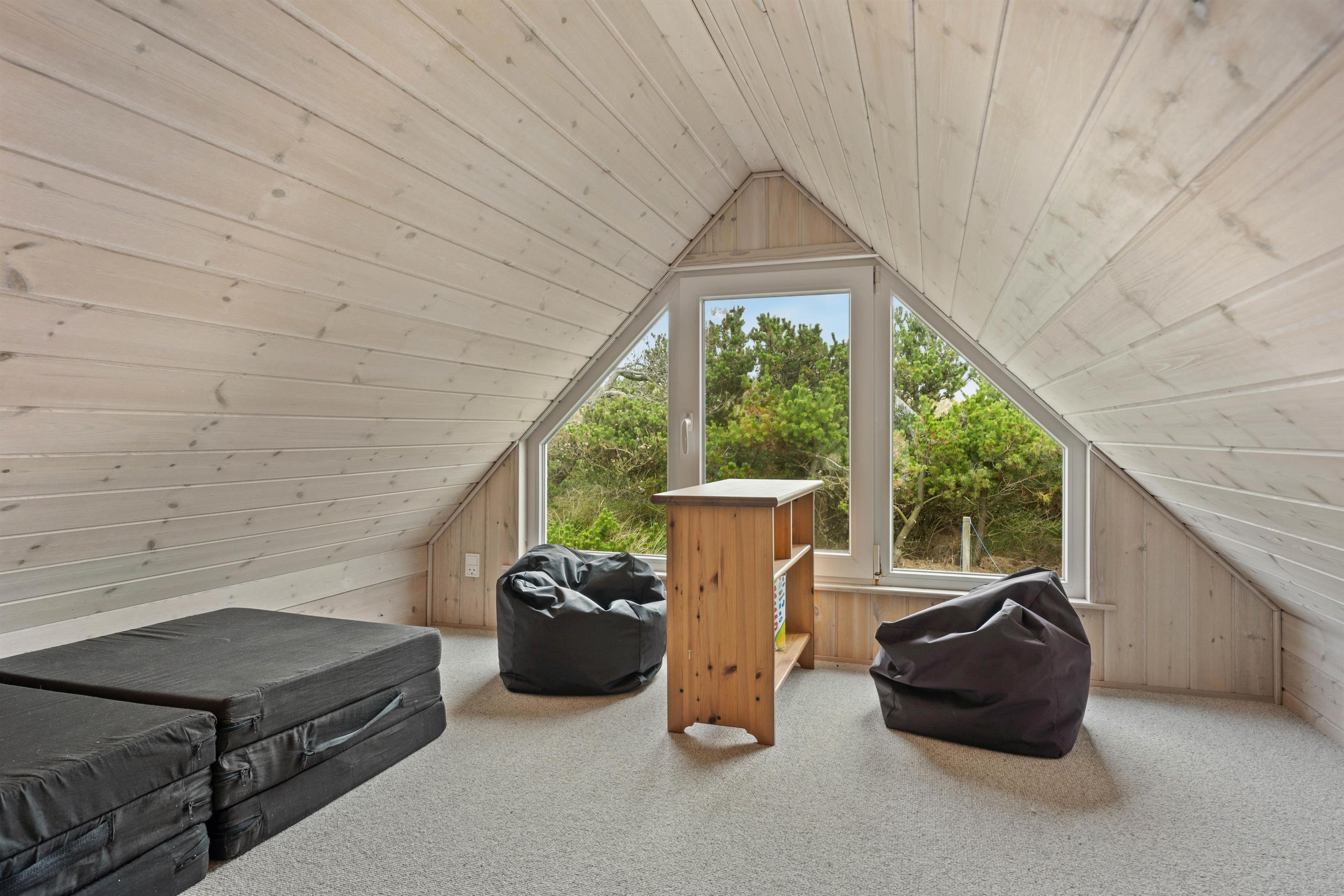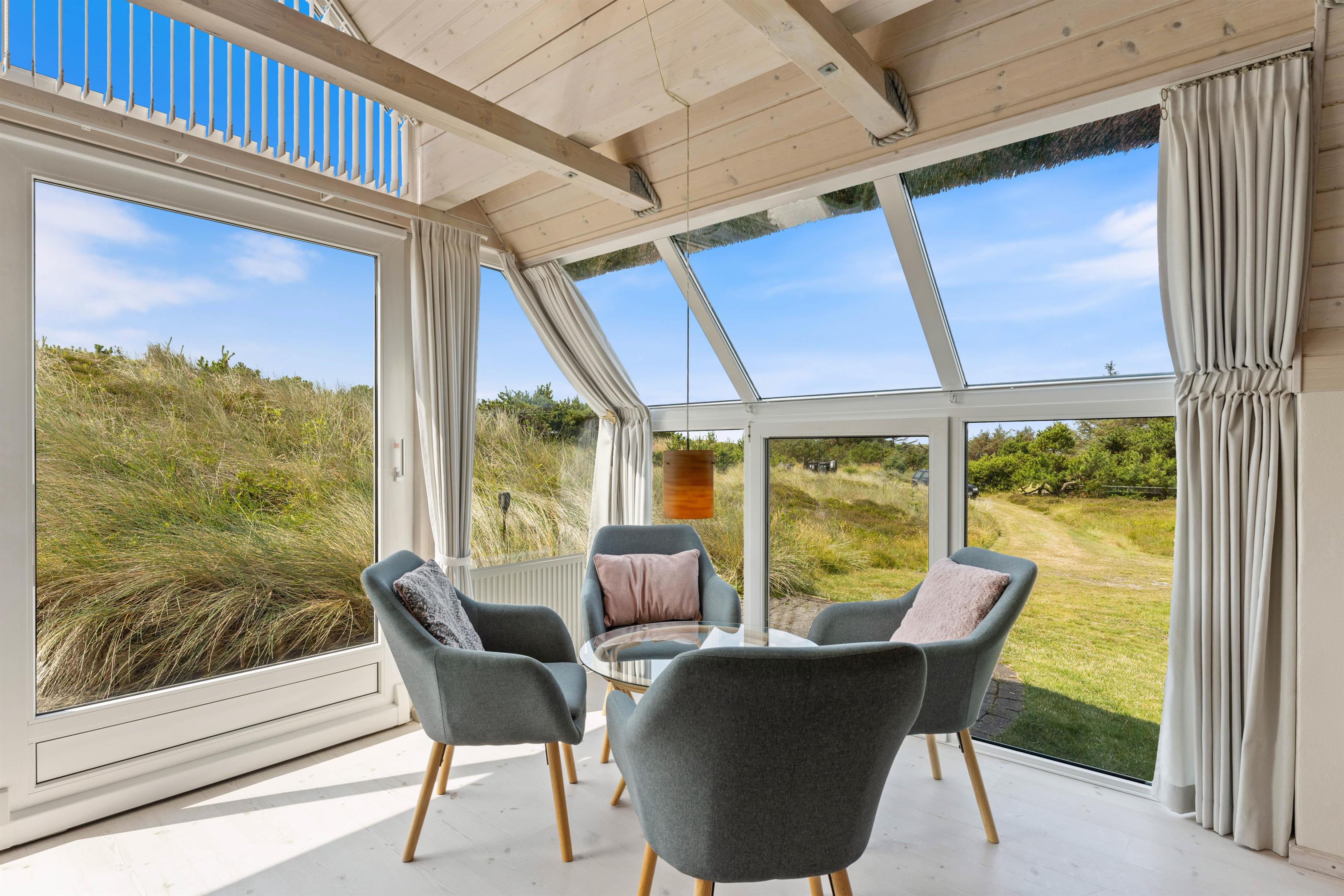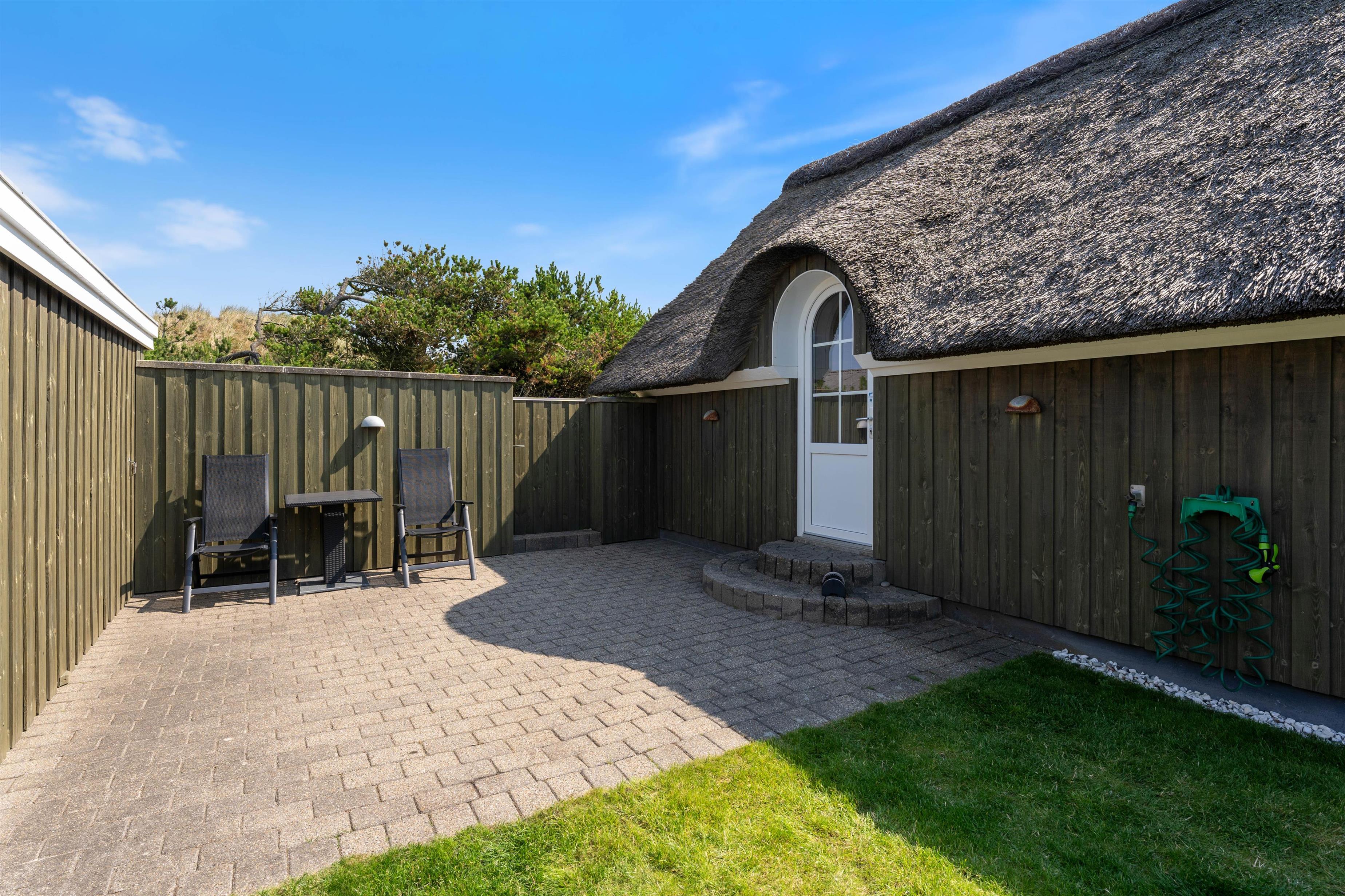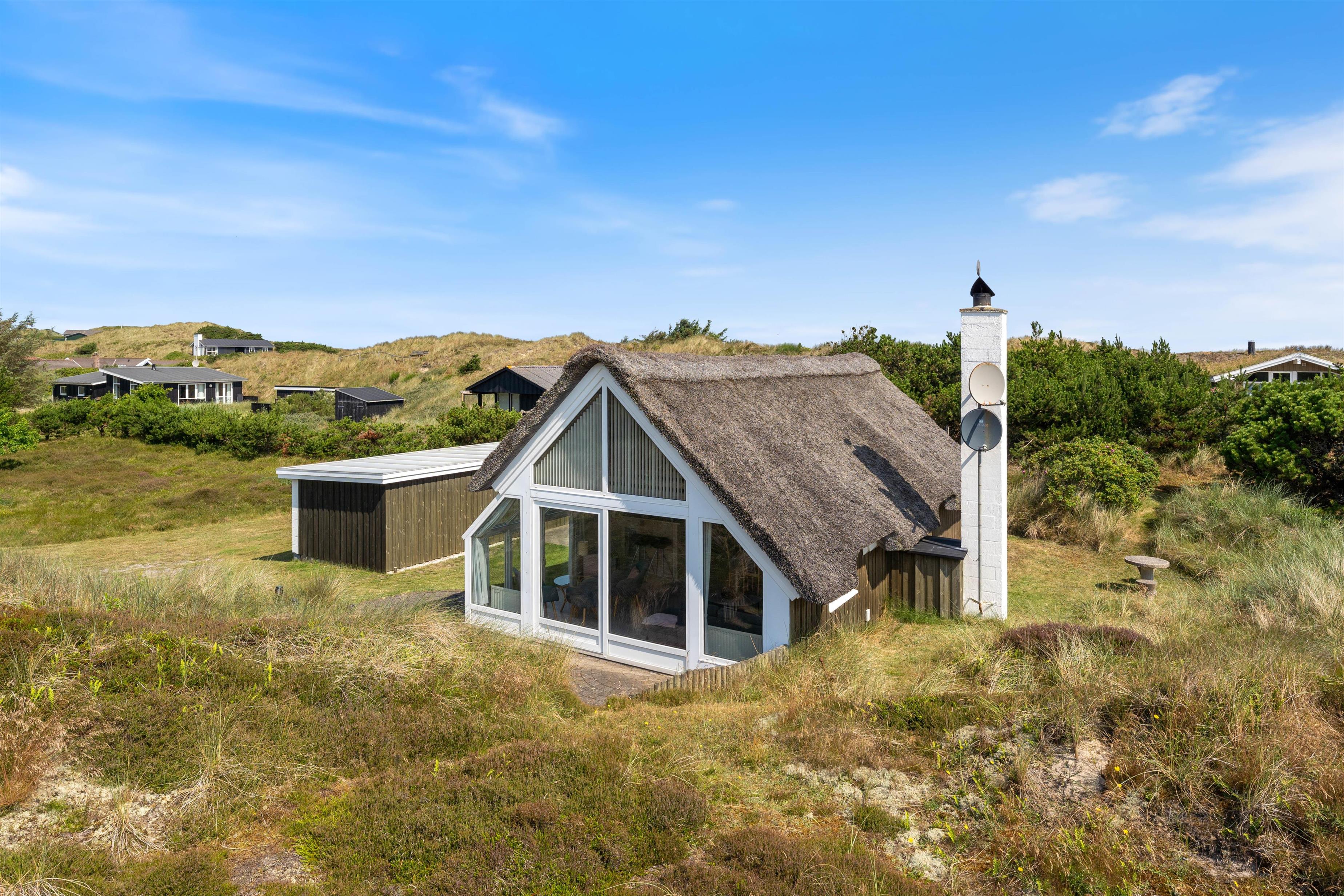 Sommerhuset er beliggende på en dejlig og kuperet naturgrund, hvor der uden for huset er små, lyngklædte bakker. Mellem sommerhuset og den oprindelige garage, som i dag er en skøn overdækket terrasse, er der en skøn og læfyldt terrasse. Den overdækkede terrasse er ideel til hyggelige grillaftener, hvor vinden aldrig bliver en faktor. Er vejret skønt, kan den store skydedør stå helt åbent, så den skønne havluft trænger ind. Der er kun 350 m til Vesterhavet fra huset, og området er dejligt og kuperet, og ideel for lange vandreture. Søndervig ligger 4 km mod syd, hvor der er gode restauranter og indkøbsmuligheder.
