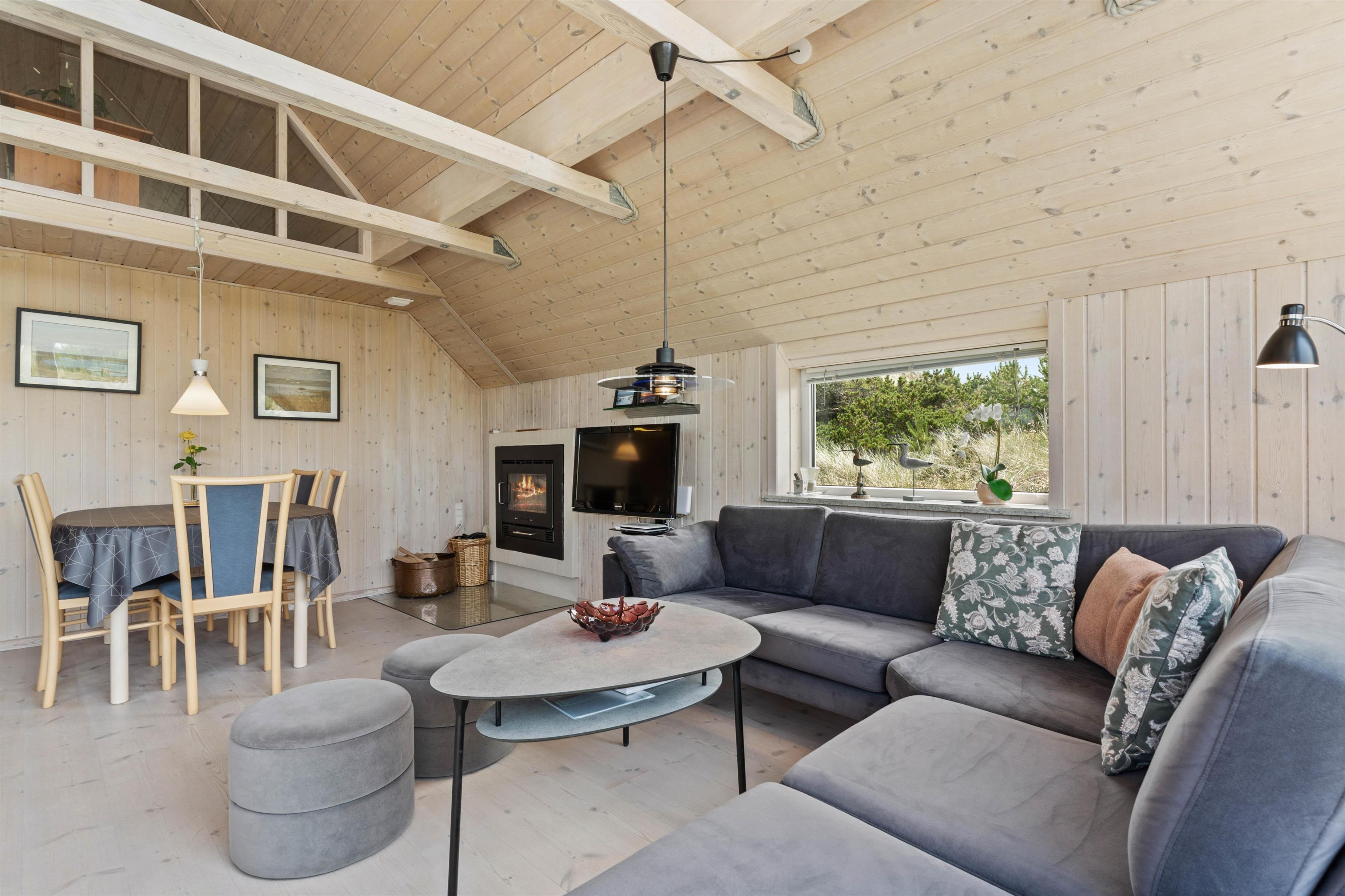 Køkkenet er veludstyret og her finder I bl.a. opvaskemaskine, mikroovn og en fryser på 50 L. Stuen er superhyggeligt indrettet, og der er et dejligt lysindfald og især det smukke udsyn igennem vinduespartiet mod syd, som også strækker sig omkring hushjørnet mod vest, er helt unikt. Her er naturen virkelig inviteret hele vejen indenfor, og der er et skønt lysindfald. Det åbne opholdsrum giver jer mulighed for nyde masser af samvær med hinanden, og uanset årstiden er her hyggeligt. Her er der en brændeovn, der med sin varme og knitren kan tilføje masser af hygge og varme. For hyggens skyld er der et fladskærms-TV, DVD-afspiller og gratis trådløst internet i sommerhuset, så I også kan læne jer tilbage og nyde en god film eller scrolle på de sociale medier