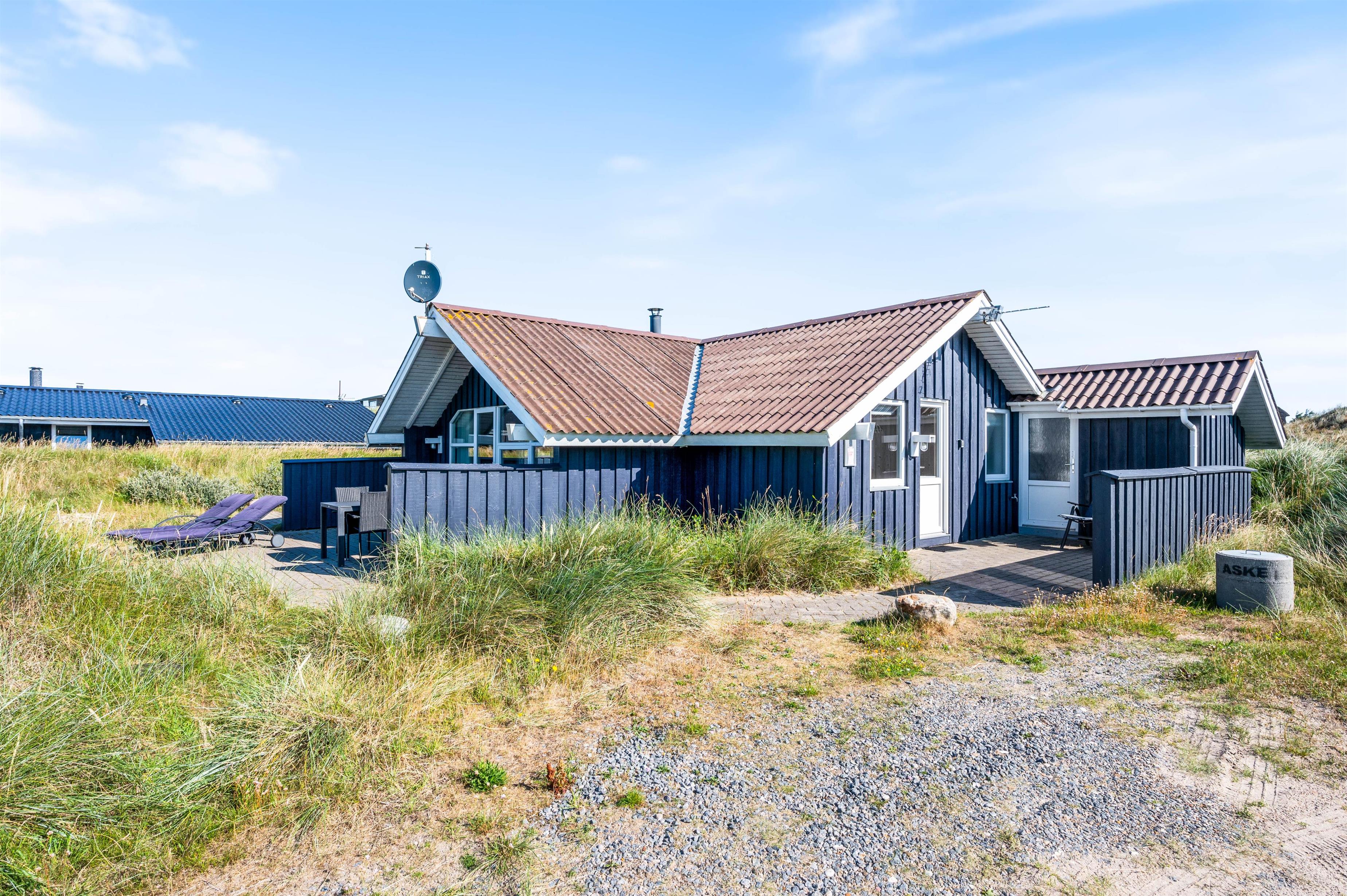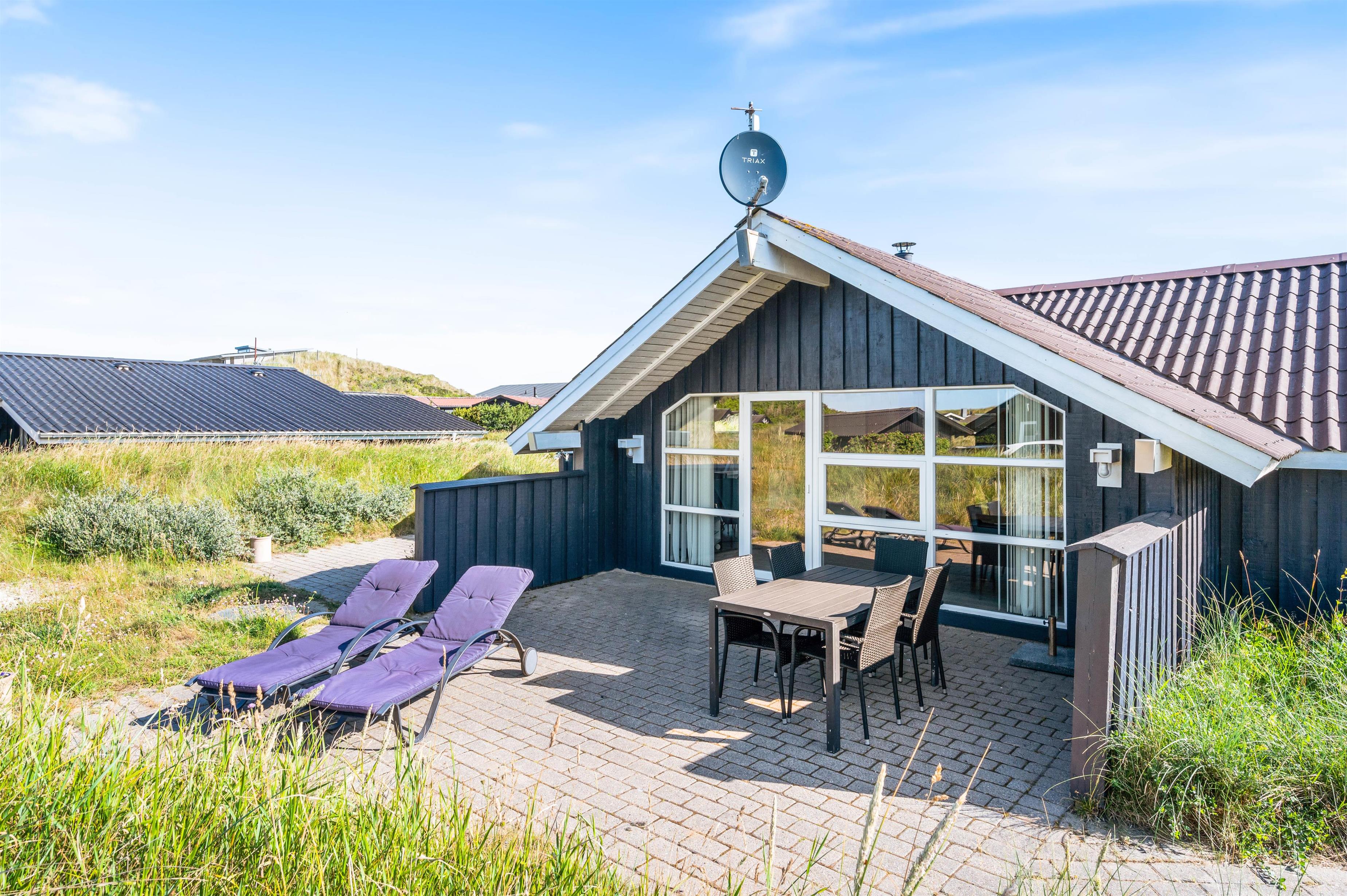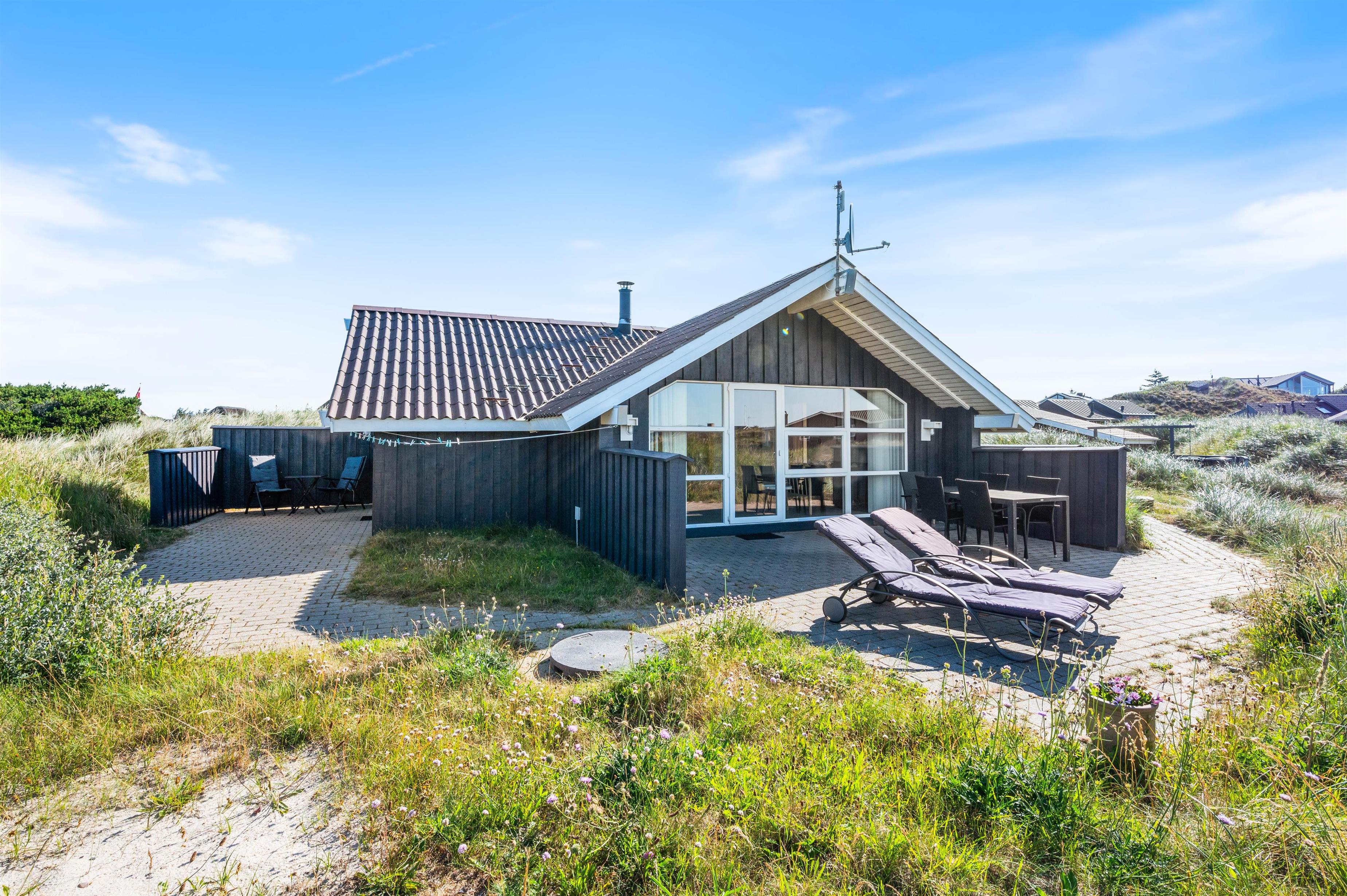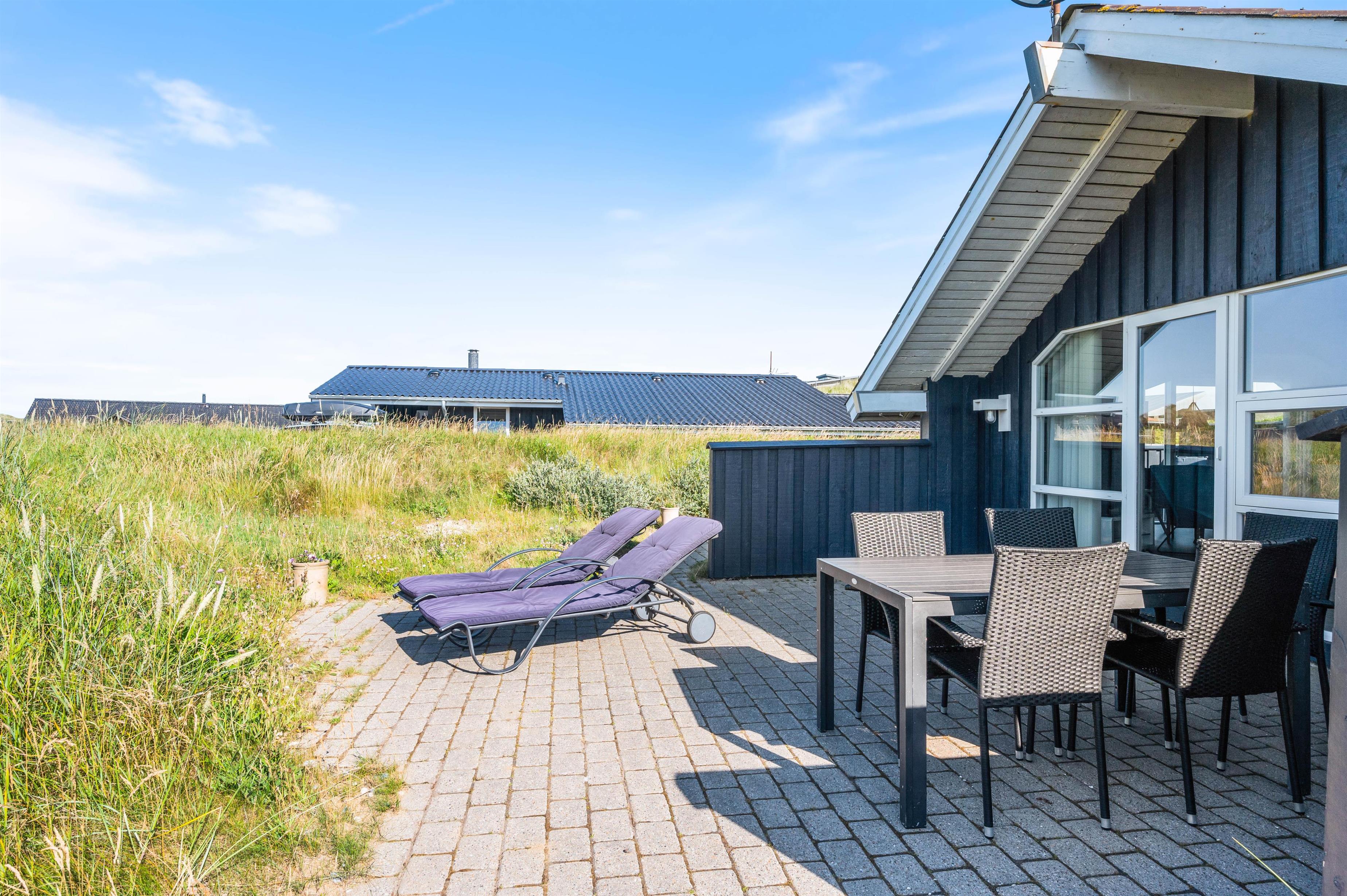 Feriehuset på Mågedalen 42A råder over et stort flisebelagt udeområde. Her har I mulighed for at nyde solens stråler, imens I gør jer det behageligt i havemøblerne, som I også har til rådighed. Derudover råder sommerhuset over en gasgrill, hvorpå I kan tilberede et lækkert aftensmåltid, imens andre nyder et glas koldt at drikke. Efter en frisk dukkert på de lunere sommerdage, vil I igen kunne få varmen i sommerhusets tilhørende sauna.