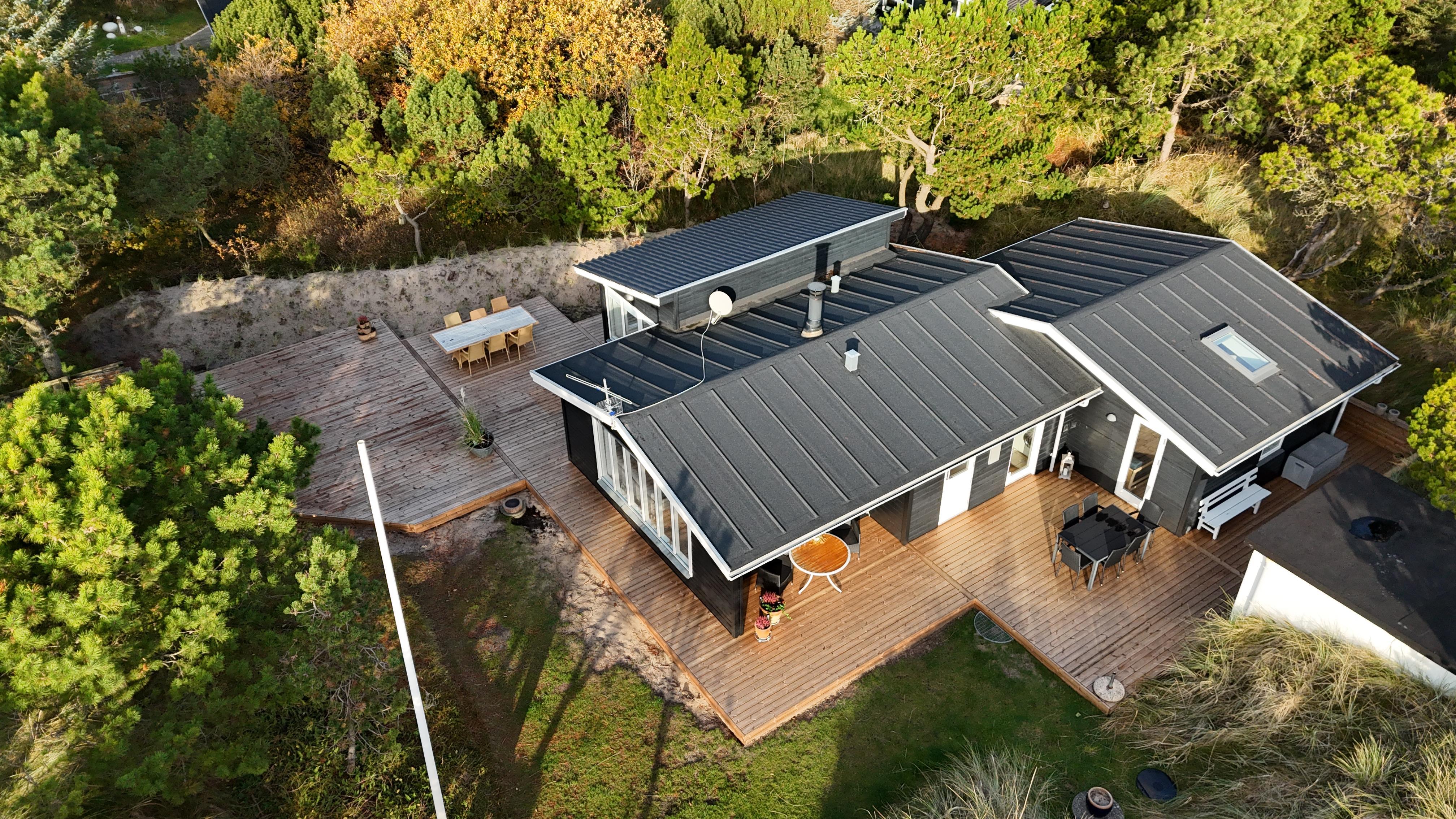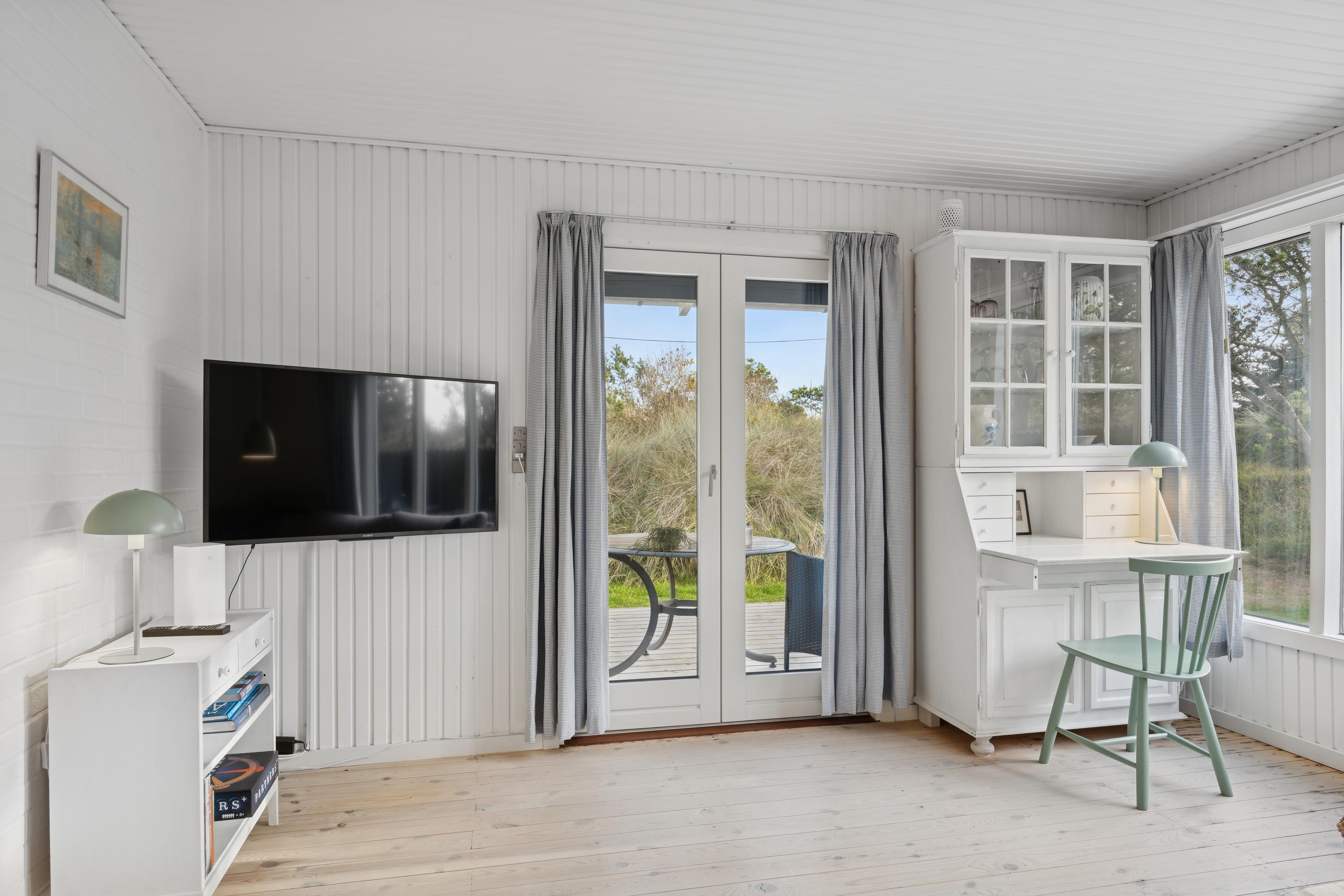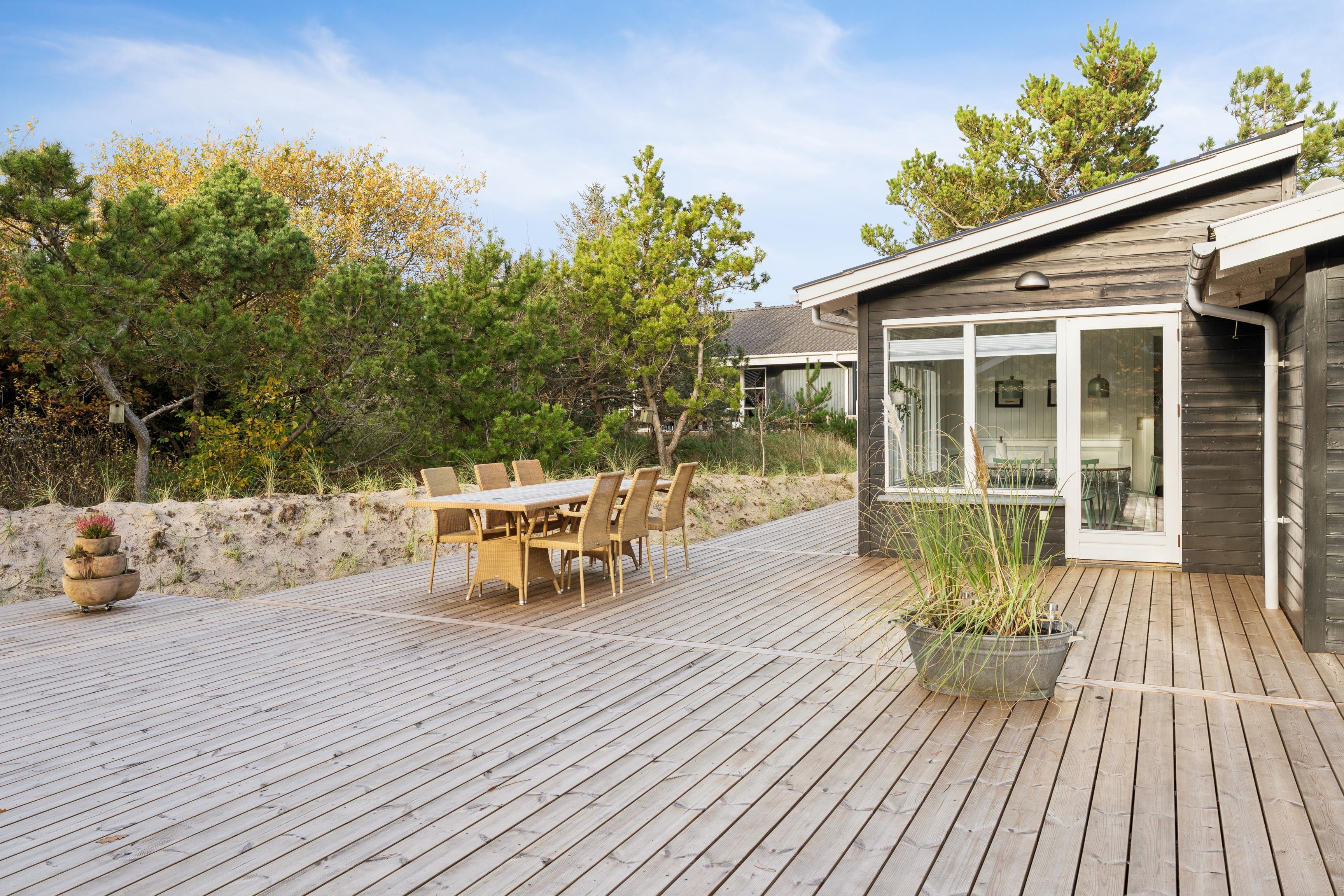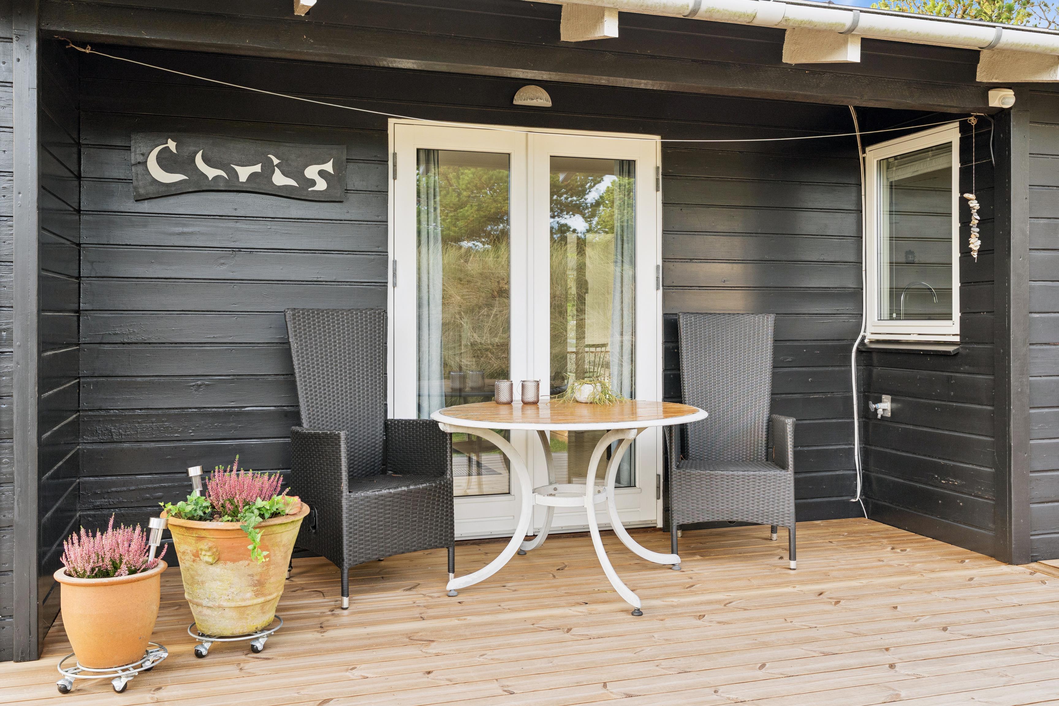 Fra stuen er der direkte udgang til en dejlig terrasse, hvor du kan nyde solen dagen lang. Her kan du sidde i læ af træerne, læne dig tilbage i liggestolen eller tænde op i grillen til en hyggelig sommeraften. Terrassen er indrettet med både havemøbler og liggestole – alt, hvad du behøver for at slappe helt af i ferien.