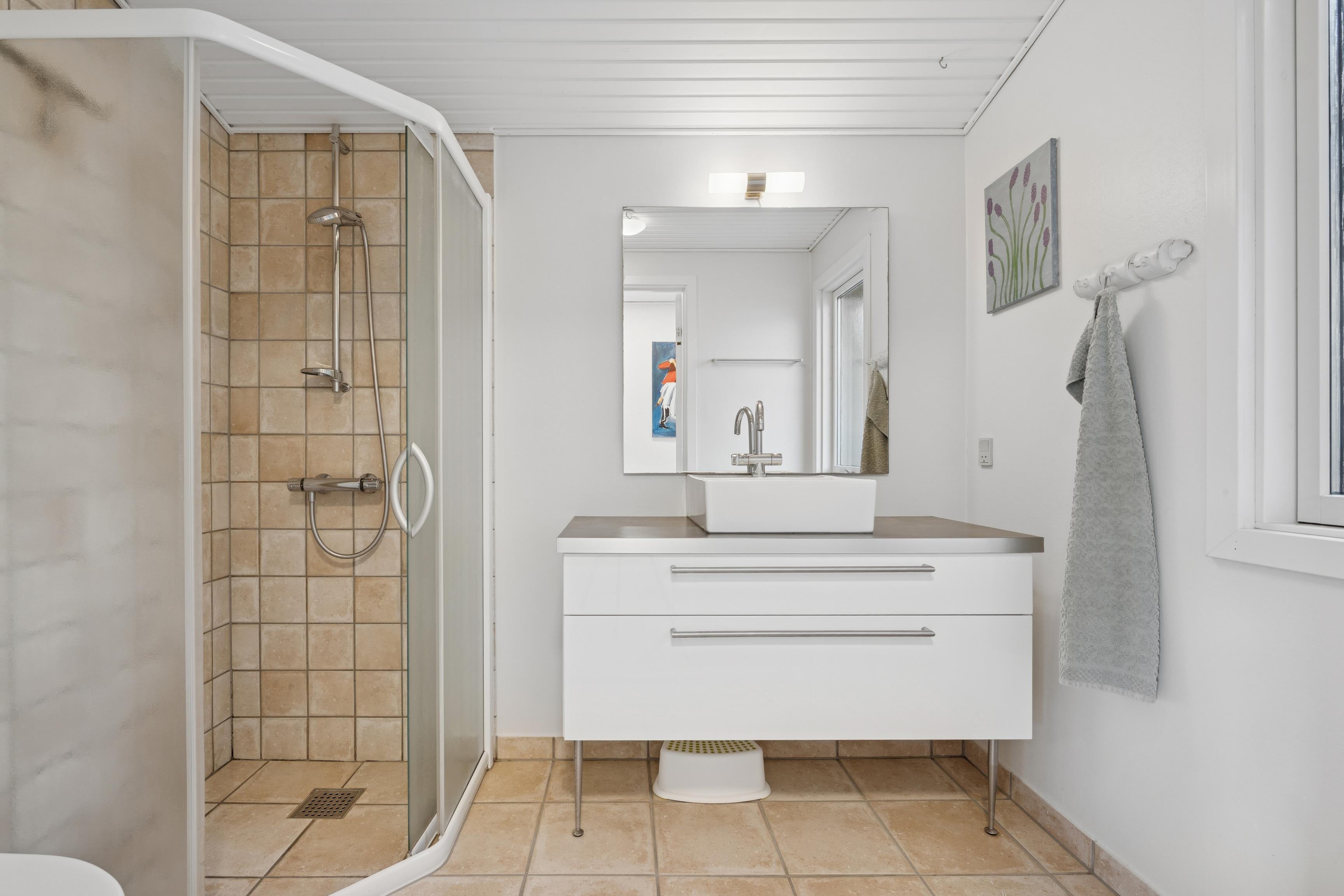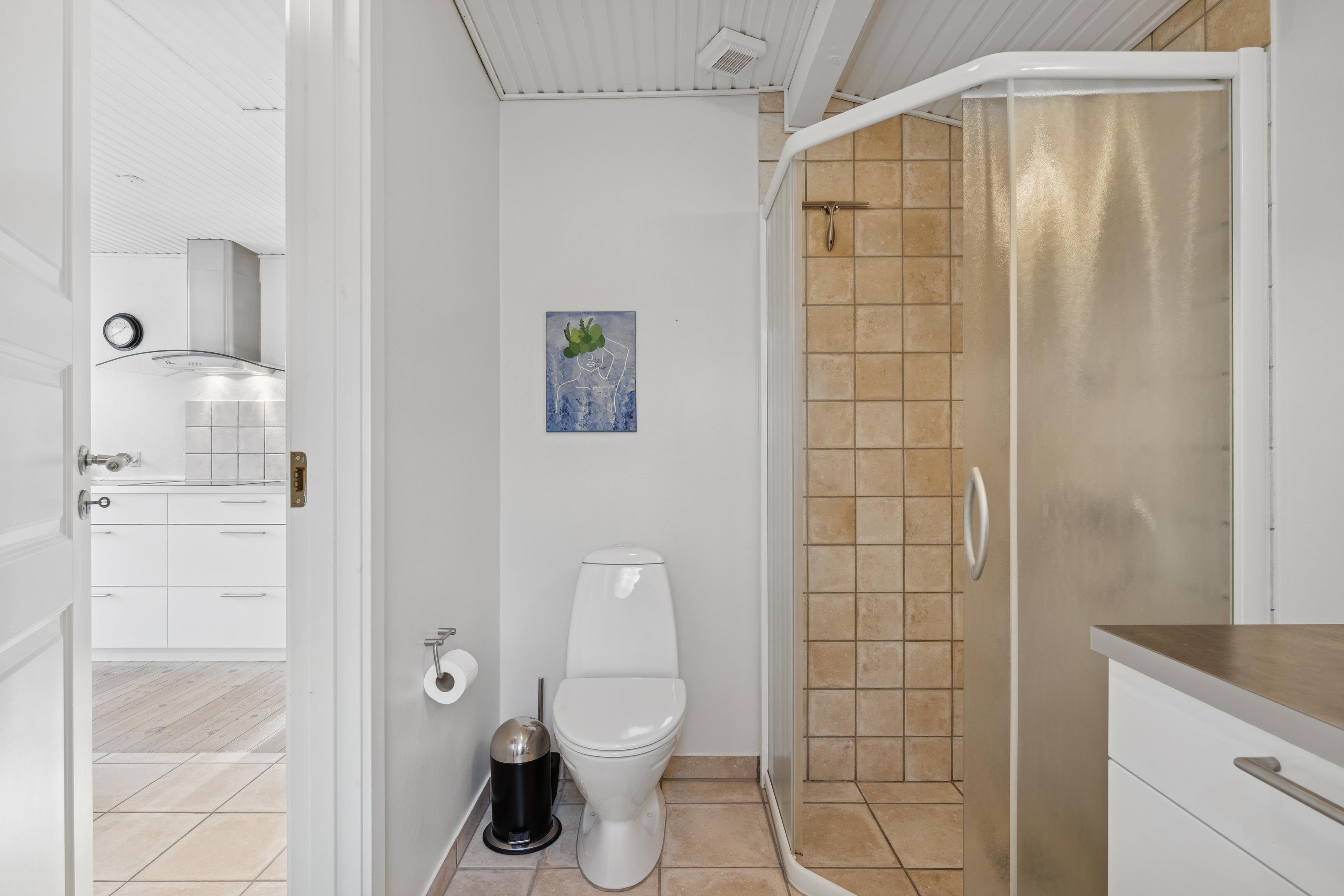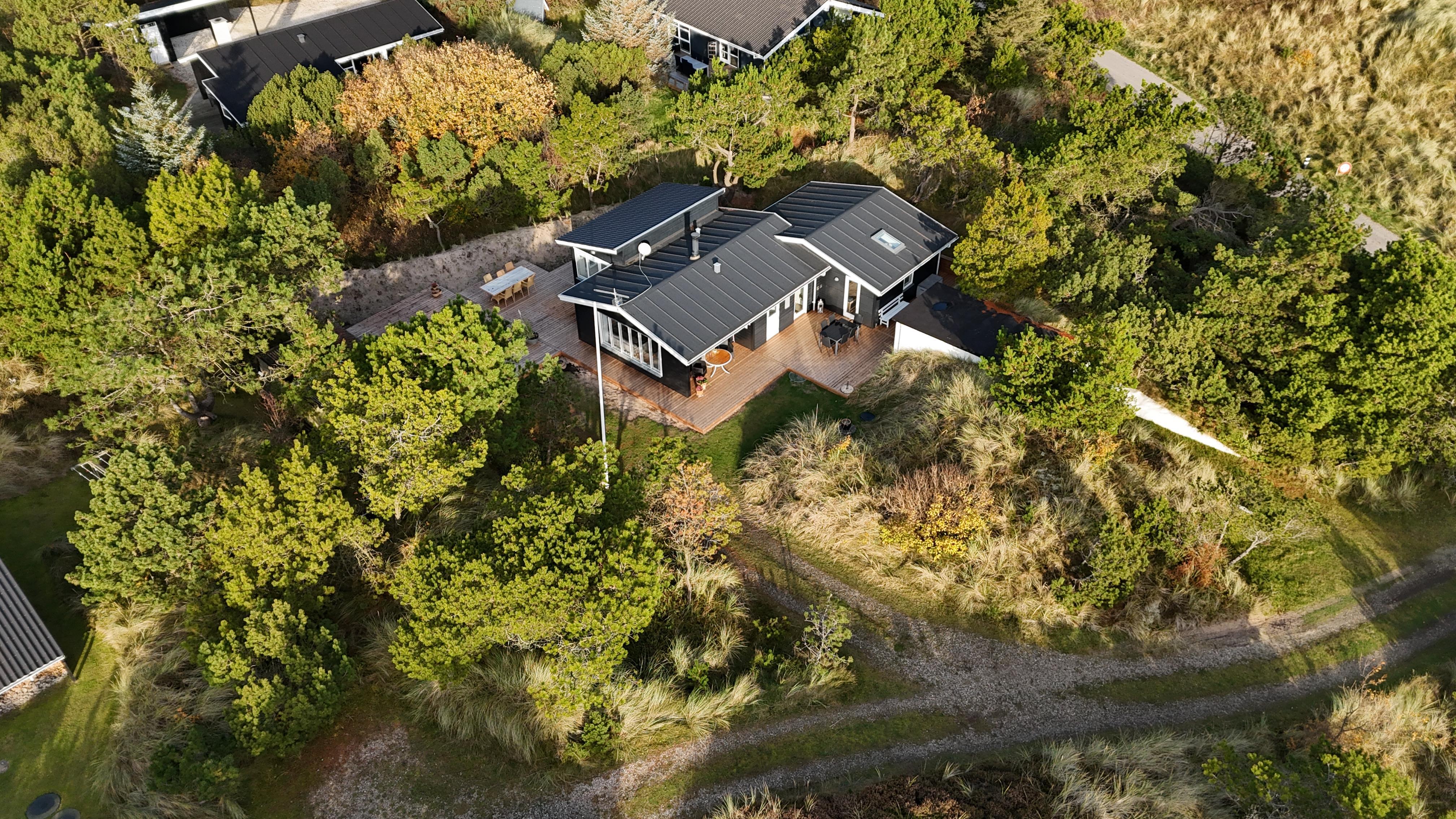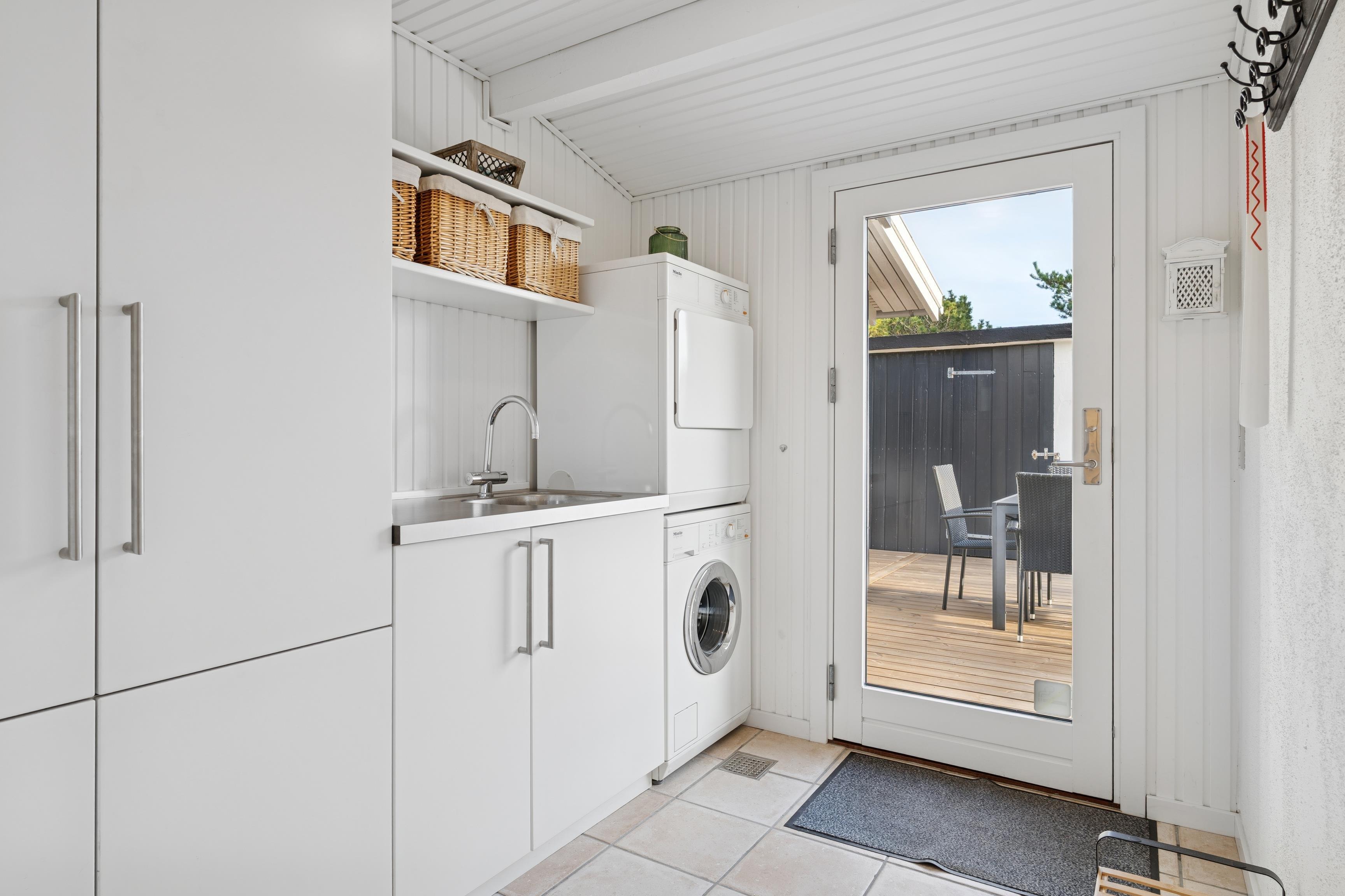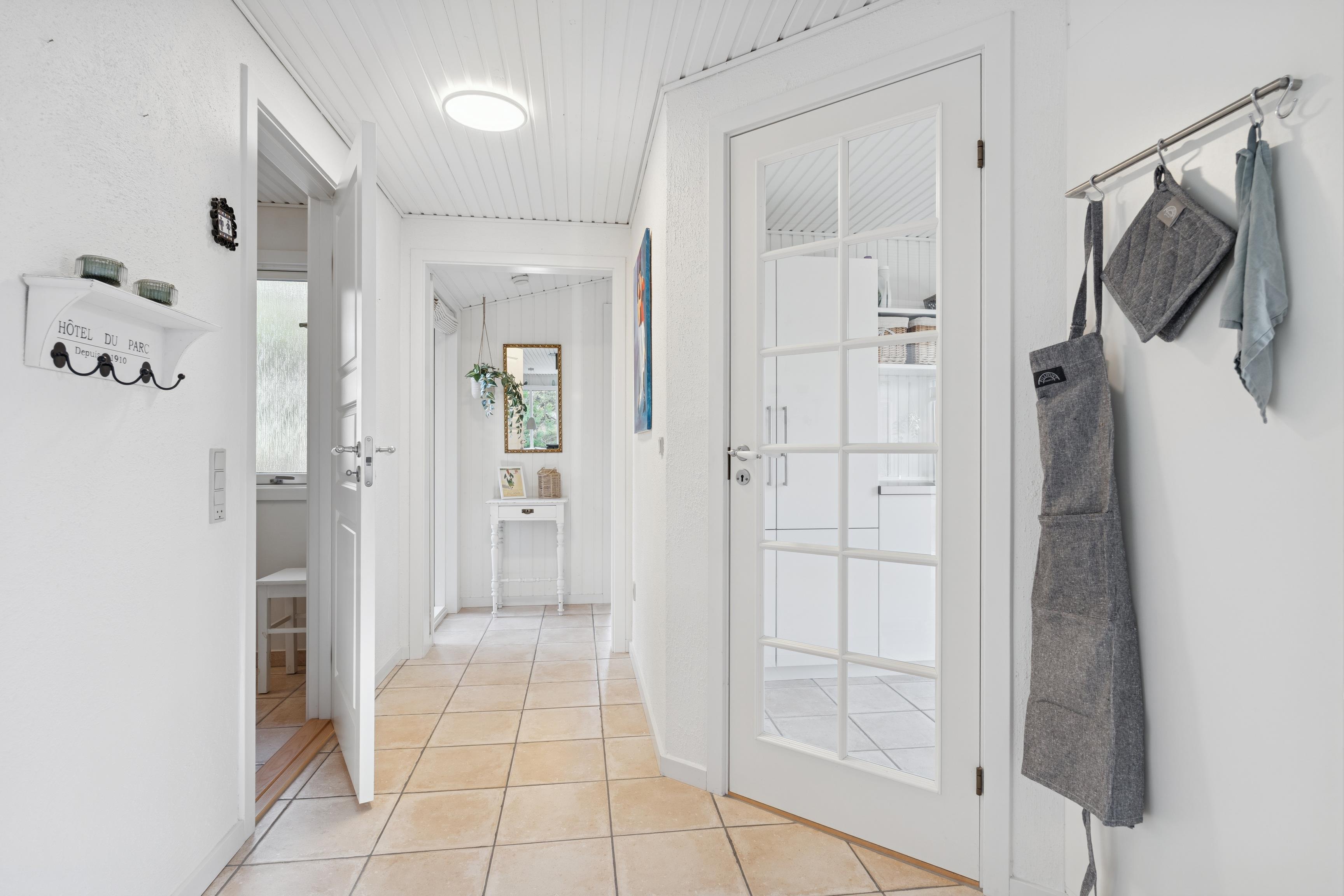 Fra stuen er der direkte udgang til en dejlig terrasse, hvor du kan nyde solen dagen lang. Her kan du sidde i læ af træerne, læne dig tilbage i liggestolen eller tænde op i grillen til en hyggelig sommeraften. Terrassen er indrettet med både havemøbler og liggestole – alt, hvad du behøver for at slappe helt af i ferien.