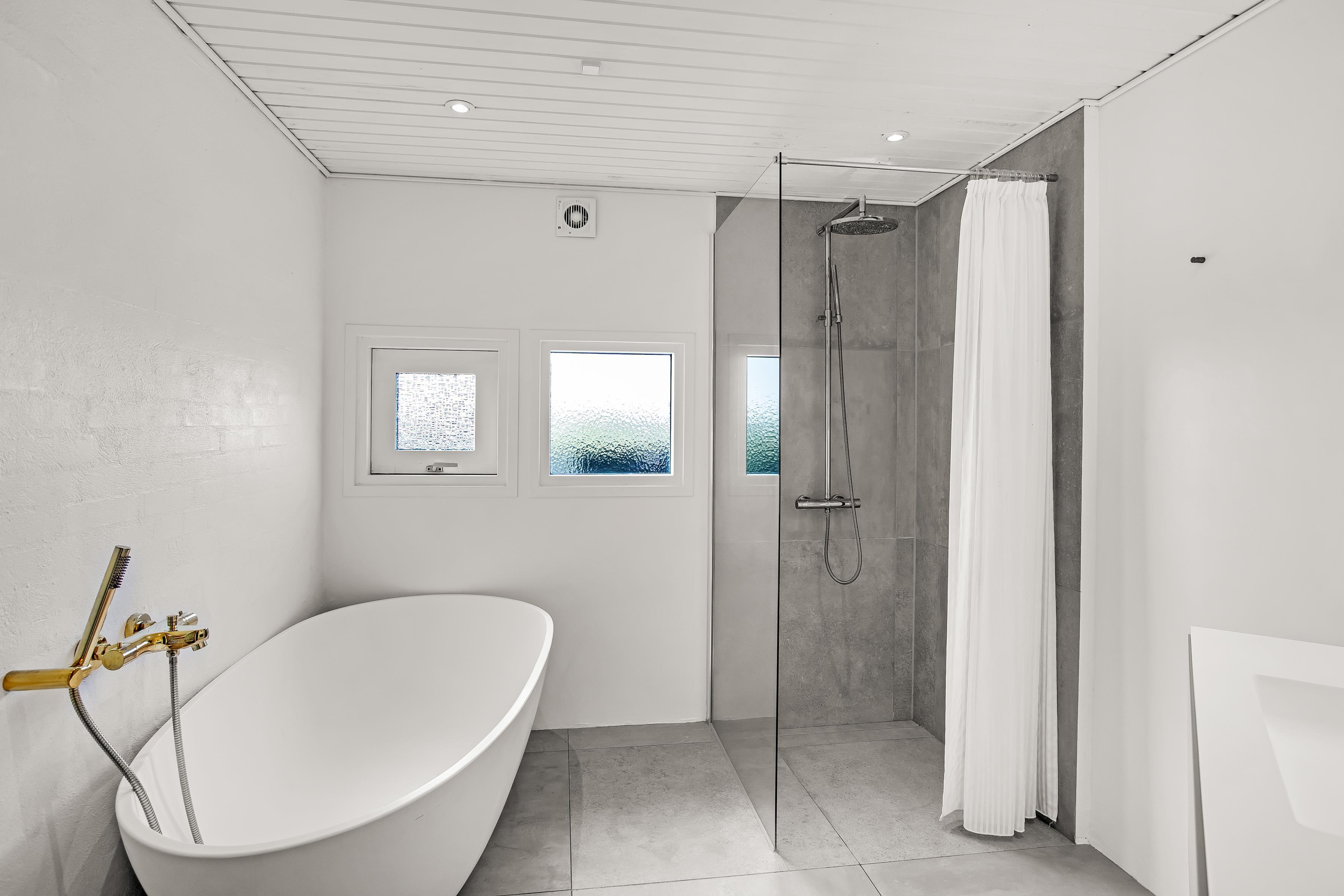 Når I træder ind i huset, mødes I af en indbydende gaspejs, der let styres med en fjernbetjening. Soveværelserne ligger i den ene ende af huset, hvoraf det ene er et master bedroom med eget badeværelse, samt et ekstra badeværelse med både bruser og et luksuriøst badekar.