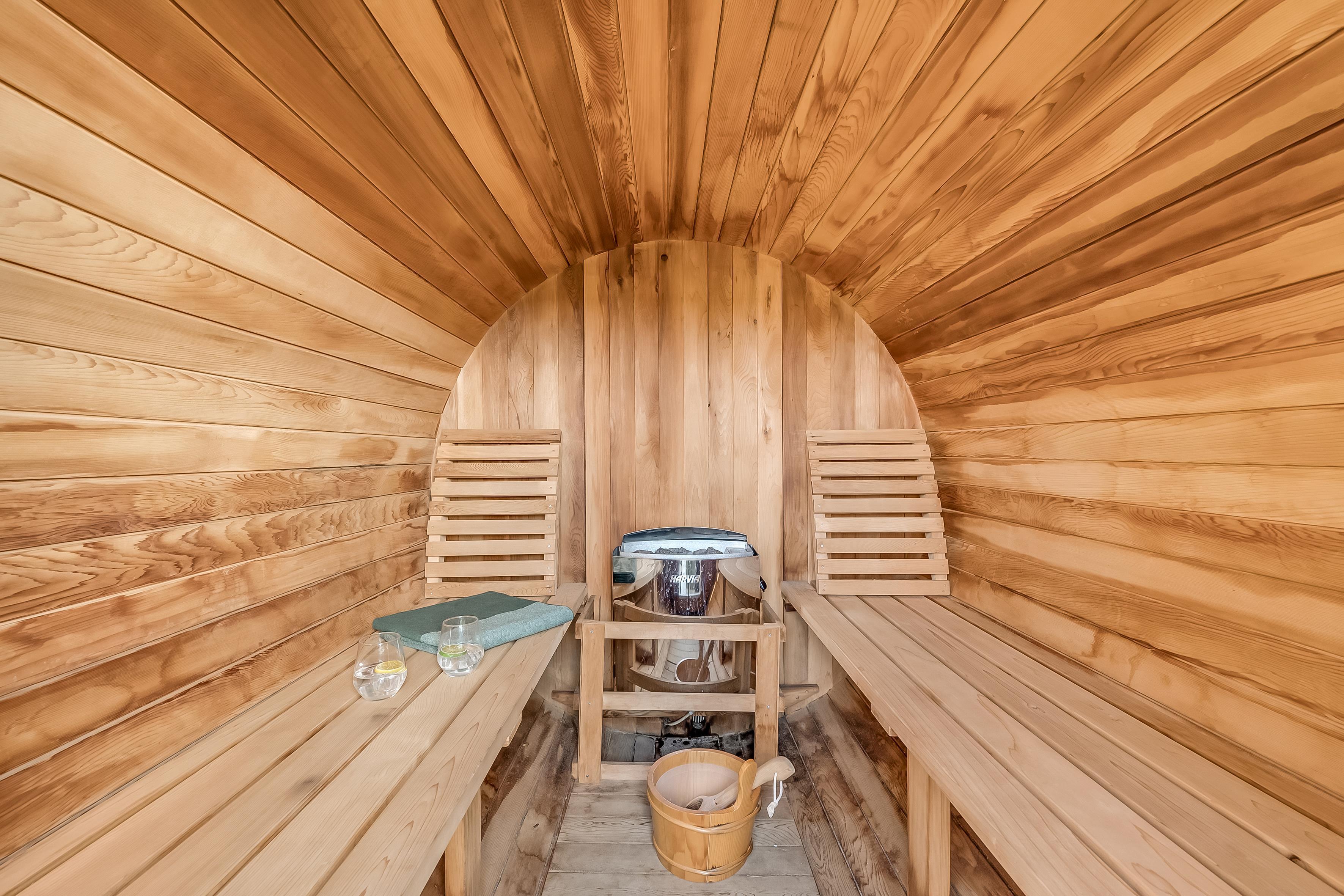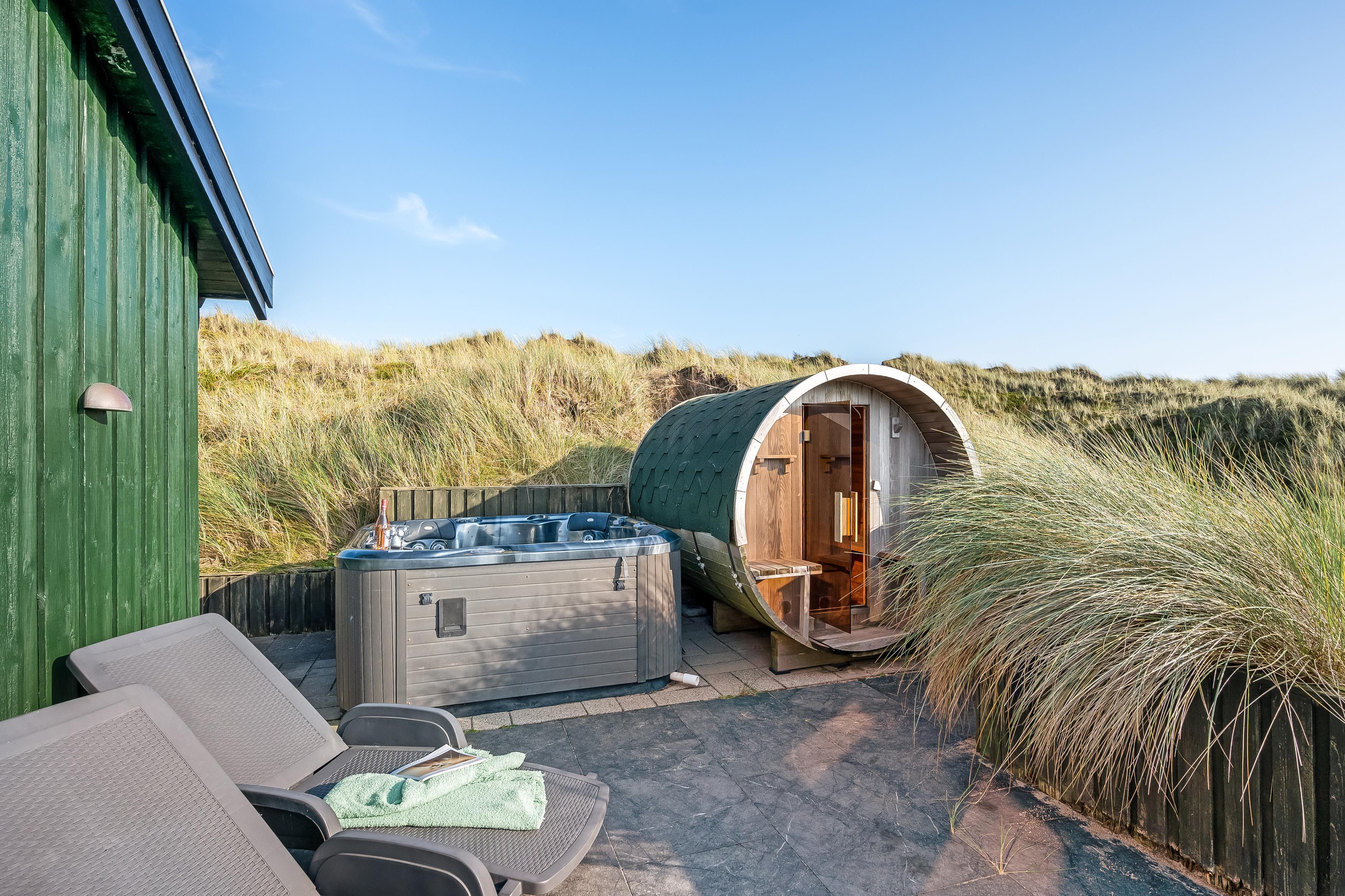 Den overdækkede terrasse er et ideelt sted at nyde morgenkaffen eller en lækker middag under stjernerne. Her finder du også en grill, så du kan tilberede lækre måltider udendørs. For dem, der ønsker at forkæle sig selv, er der et udendørsspa, der kan rumme op til 4 personer, samt en udesauna, hvor du kan slappe af og nyde den friske luft.